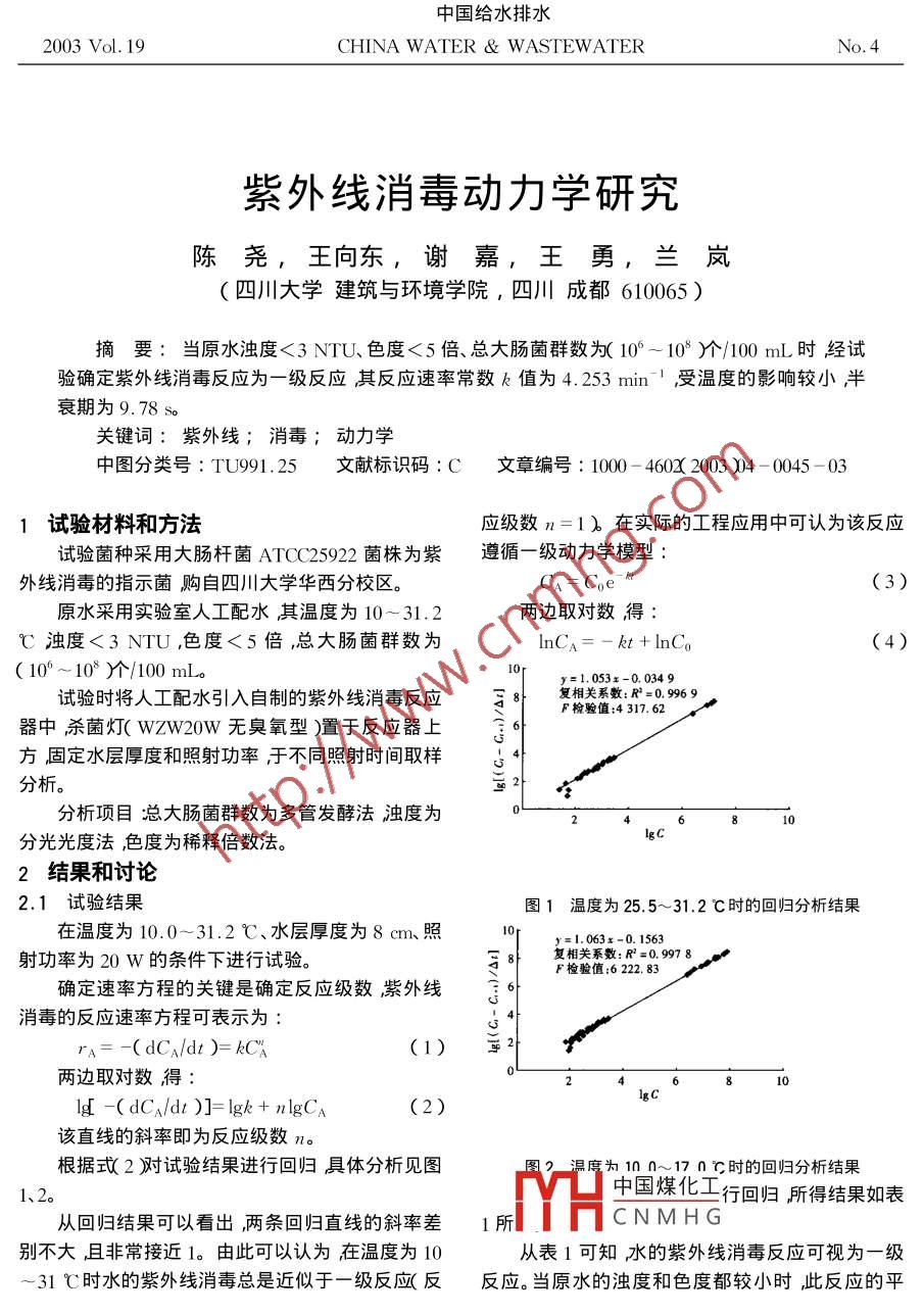 中國給水排水2003Vol.19CHINA WATER WaStewaterNo 4紫外線消毒動力學(xué)研究陳堯,王向東,謝嘉,王勇,蘭嵐〔四川大學(xué)建筑與環(huán)境學(xué)院,四川成都610065)摘要:當(dāng)原水濁度<3NTU色度<5倍、總大腸菌群數(shù)為10-10外個(gè)/100mL時(shí)經(jīng)試驗(yàn)確定紫外線消毒反應(yīng)為一級反應(yīng)其反應(yīng)速率常數(shù)k值為4.253min受溫度的影響較小半衰期為9.78s0關(guān)鍵詞:紫外線;消毒;動力學(xué)中圖分類號:TU991.25文獻(xiàn)標(biāo)識碼:C文章編號:1000-460x(2003)4-0045-03試驗(yàn)材料和方法應(yīng)級數(shù)n=1)在實(shí)際的工程應(yīng)用中可認(rèn)為該反應(yīng)試驗(yàn)菌種采用大腸杄菌ATCC25922菌株為紫遵循一級動力學(xué)模型外線消毒的指示菌購自四川大學(xué)華西分校區(qū)。(3)原水采用實(shí)驗(yàn)室人工配水其溫度為10-31.2兩邊取對數(shù)得℃濁度<3NTU,色度<5倍,總大腸菌群數(shù)為kt+ Inc(4)(10°~105)個(gè)/100m試驗(yàn)時(shí)將人工配水引入自制的紫外線消毒反應(yīng)復(fù)相關(guān)系數(shù):R2=0.9969F檢驗(yàn)值:4317.62器中殺菌燈(WZW20W無臭氧型)置于反應(yīng)器上方固定水層厚度和照射功率于不同照射時(shí)間取樣分析分析項(xiàng)目總大腸菌群數(shù)為多管發(fā)酵法濁度為分光光度法色度為稀釋倍數(shù)法。2結(jié)果和討論2.1試驗(yàn)結(jié)果圖1溫度為25.5~31.2℃時(shí)的回歸分析結(jié)果在溫度為10.0~31.2℃、水層厚度為8cm、照射功率為20W的條件下進(jìn)行試驗(yàn)復(fù)相關(guān)系數(shù):R2=0.9978檢驗(yàn)值:6222.83確定速率方程的關(guān)鍵是確定反應(yīng)級數(shù)紫外線消毒的反應(yīng)速率方程可表示為ra=-(dCA/dt )=kCa(1)兩邊取對數(shù)得lg-( d Caldt )]=lgk nIgC(2)該直線的斜率即為反應(yīng)級數(shù)n根據(jù)式2對試驗(yàn)結(jié)果進(jìn)行回歸具體分析見圖inn~17n℃時(shí)的回歸分析結(jié)果中國煤化工行回歸所得結(jié)果如表從回歸結(jié)果可以看出兩條回歸直線的斜率差1所CNMHG別不大且非常接近1。由此可以認(rèn)為在溫度為10從表1可知水的紫外線消毒反應(yīng)可視為一級31℃時(shí)水的紫外線消毒總是近似于一級反應(yīng)反反應(yīng)。當(dāng)原水的濁度和色度都較小時(shí)此反應(yīng)的平2003Vol.19中國給水排水No 4均速率常數(shù)k為4253min,且k值受溫度的影溫度的影響較小,多數(shù)光化學(xué)反應(yīng)的溫度系數(shù)接近響較小。該反應(yīng)的半衰期于1,因此溫度的升高對反應(yīng)速度的影響不大。而t::=ln2/k=0.1630min≈9.78s復(fù)活反應(yīng)受復(fù)活酶的控制,因而受溫度的影響較大該反應(yīng)的速率方程為試驗(yàn)時(shí),當(dāng)照射時(shí)間為0.5mn時(shí),低溫下的剩余菌(5)體濃度低于高溫下的剩余菌體濃度。這表明在較高表1紫外線消毒動力學(xué)方程的溫度下,酶的活性也較高,復(fù)活的微生物細(xì)胞較反應(yīng)溫度曲線國歸方程相關(guān)系下檢著反應(yīng)速率常多,而隨著照射時(shí)間的增加,已形成紫外線對微生物(℃)的永久輻射損傷而不會再發(fā)生復(fù)活反應(yīng)。同樣,溫25.5-hC=-4.13331.2+1.141.809621.4.133度的變化影響了紫外線燈管的有效輻射量輸出,也就影響到紫外線照射劑量的高低,燈管表面溫度越775149.674.37接近40℃,其紫外線有效輻射量越高,紫外線照射注:**表示該回歸方程高度顯著,*表示平均反應(yīng)劑量也越高,反應(yīng)速度也越快。這也可以解釋為什速率常數(shù)(min)么低溫下的k值反而略高于高溫下的k值。在照射功率不變的條件下將試驗(yàn)結(jié)果與理論計(jì)從已求得的反應(yīng)速率常數(shù)k值的結(jié)果來看,光算結(jié)果進(jìn)行比較(見表2)化學(xué)反應(yīng)占主導(dǎo)地位,其余各步反應(yīng)對殺菌效果也表2試驗(yàn)結(jié)果與理論值的比較有一定影響。因此總的反應(yīng)物系的溫度對反應(yīng)速率水層照射照射初始菌理論計(jì)常數(shù)k值的影響不大,最終可以確定該反應(yīng)屬于厚度時(shí)間功剌體濃度算結(jié)果級反應(yīng)(cm)min)(w)(個(gè)/00mL)(個(gè)/100mn)(個(gè)/100ml國外的相關(guān)研究表明,紫外線殺菌符合一級43:2303.5×10反應(yīng)動力學(xué)模型6201.8×103式中N—經(jīng)紫外線照射后菌體濃度,個(gè)/1001.1×10°888201.3×100040Vn—初始的菌體濃度,個(gè)/100m速率常數(shù),cm/(Ww·s)紫外線燈的照射強(qiáng)度,w/cm2從表2可以看出,理論計(jì)算所得結(jié)果與實(shí)際結(jié)照射時(shí)間,s果較接近釆用式(4)計(jì)算所求的速率常數(shù)為4.2532.2分析與討論紫外線殺菌的實(shí)質(zhì)是光化學(xué)反應(yīng)。核酸吸收了in,即為式(6)中k、I二者的乘積。試驗(yàn)條件下紫外線能量在光致二聚作用下化學(xué)鍵和鏈斷裂股以紫外燈的照射強(qiáng)度為454.5-6060Wcm2計(jì)按式(6)換算,k=0.12~0.16cm/(mW·s),該結(jié)果能,從而引起微生物死亡,達(dá)到消毒的目的。紫外與美國EPA設(shè)計(jì)手冊中的k=0.06-0.38cm線殺菌還涉及到微生物的可見光復(fù)活或暗復(fù)活反(mW·s)的推薦值基本吻合??紤]到紫外線殺菌應(yīng)。這一過程屬于生物化學(xué)反應(yīng),在復(fù)活酶的作用機(jī)理的復(fù)雜性,采用經(jīng)驗(yàn)速率方程模型能綜合反應(yīng)下光化學(xué)產(chǎn)物解聚,核酸恢復(fù)正常功能。此外,紫外進(jìn)程,不考慮中間反應(yīng),可避免諸多因素的干擾