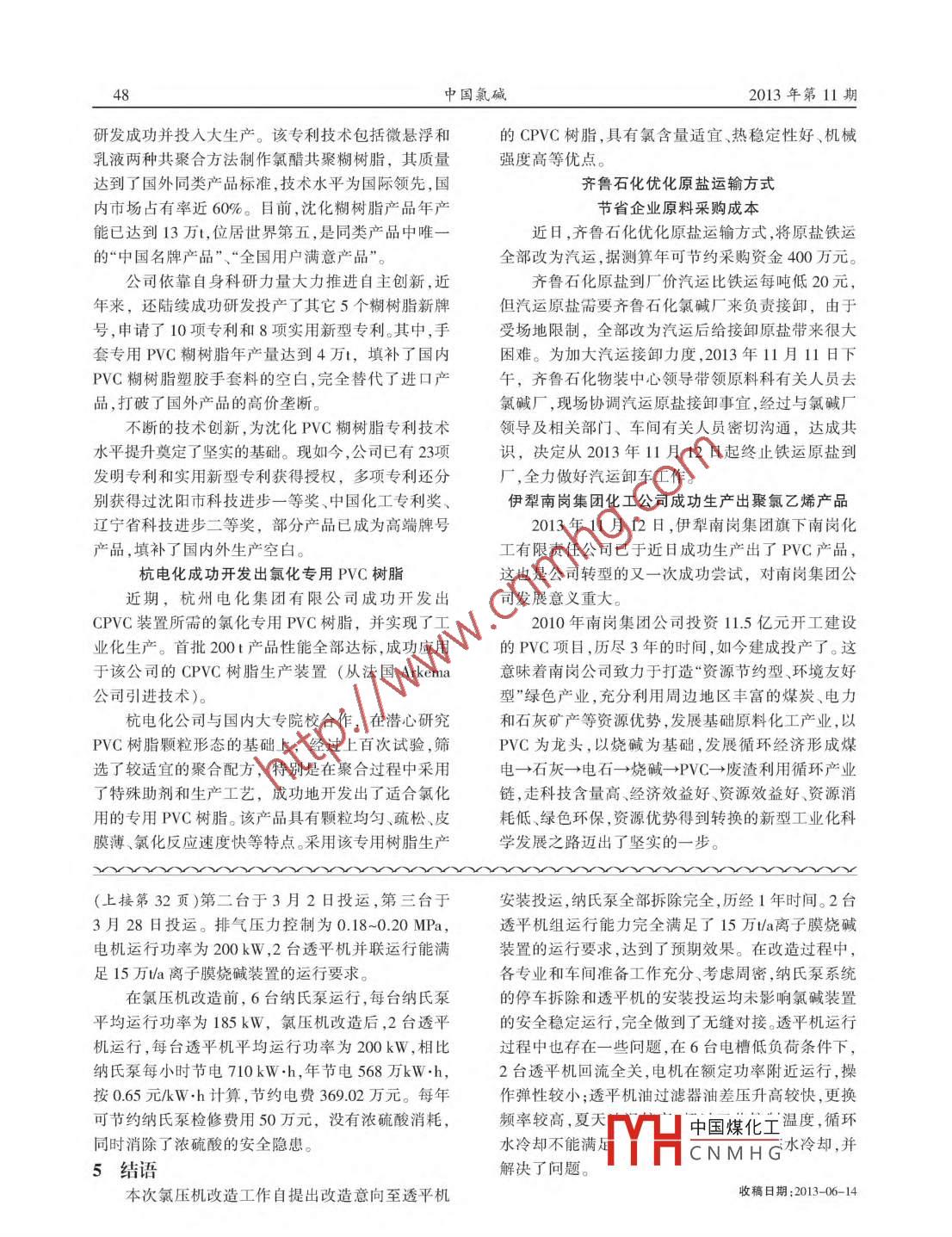 第11期中國氯堿No. 12013年11月China chlor-AlkaliNov.201331氯壓機改造總結(jié)王世周,許義,吳建華(寧波鎮(zhèn)洋化工發(fā)展有限公司,浙江寧波315204)摘要:介紹了在原納氏泵位置對氯壓機實行無縫對接改造的施工過程,改造后,透平機組完全滿足了燒堿裝置的運行要求。關(guān)鍵詞:氯壓機;納氏泵;透平機;設(shè)備布置中圖分類號:TQO51.21文獻標識碼:B文章編號:1009-1785(2013)11-0031-02Transformation summary of chlorine compressorsWANG Shi-zhou, XU Yi, wUJian-hua(Ningbo Ocean Chemical Development Co, Ltd. Ningbo 315204, china)Abstract: Without affecting the stable operation of chlor-alkali plants in the case, the original location of thechlorine compressor and Nessler pump implement seamless transformation. After transformation, the chlorinecompressor fully meet the requirements of operationKey word: chlorine compressor; Nessler pump: turbine; equipment layout寧波鎮(zhèn)洋化工發(fā)展有限公司1套15萬Ua離子負荷較大,在DCS連鎖系統(tǒng)增加了另一臺透平機跳膜燒堿裝置,采用6臺YJ-20003.5型液環(huán)式氯壓停,氯堿裝置連鎖停車。機(納氏泵)壓縮氯氣。納氏泵運行費用高,年耗電約因為要求不影響氯堿裝置的穩(wěn)定運行,只能先888萬kW·h,年檢修費約五十萬元,且需要硫酸密停1臺納氏泵,拆除后,安裝1臺透平機,等透平機封,存在安全隱患。為降低運行費用、消除安全隱患穩(wěn)定運行后,再停2臺納氏泵,拆除后,再安裝1臺在原納氏泵位置將納氏泵改為離心式氯壓機(透平透平機,直至3臺透平機安裝完成,后拆除剩余納氏機)。為了不影響氯堿裝置的穩(wěn)定運行,公司要求大泵。透平機AB/C分別替換納氏泵ACE的位置。修期間留好頭,在氯堿裝置不停車的情況下,實現(xiàn)氯2氯壓機改造施工壓機的改造。2.1氯壓機改造留頭1透平機氯氣壓縮工藝流程和布置大修、停車1周,同時,對氯壓機改造留頭。在大透平機工藝流程示意圖見圖1。修停車前,逐臺檢查納氏泵、納氏泵前硫酸冷卻器和15萬血離子膜燒堿裝置產(chǎn)氣量約為5300Nm沿h。氣液分離器是否能完全交出,如果不行,標記關(guān)不死采用3臺透平機2開1備代替6臺納氏泵,選用國的閥門,大修期間更換。透平機需要循環(huán)冷卻水對壓產(chǎn)的LYJ-32000.28型透平機,采用現(xiàn)場PLC控制,縮后氯氣和潤滑油進行冷卻、需要氮氣密封及儀表并和DCS建立通信。為保證進透平機氯氣的含水量氣控制調(diào)節(jié)閥。在大修期間,在氯處理崗位對氯壓機為200×10以下,且無酸霧,在原氯氣干燥系統(tǒng)出改造留頭。在泡罩塔T-1503出口管氯氣總管留頭,口與透平機進口之間,增加酸霧捕集器1套。因此,作為酸霧捕集器的氯氣進口管留頭;在濃硫酸循環(huán)型號透平機要求氯氣冷卻器的循環(huán)冷卻水為無壓回泵P-1505出口為酸捕隹器的進酸管水,故增加1個80m3砼集水池,收集氯氣冷卻器回留頭;在原酸中國煤化工上開口留水,用泵送至循環(huán)水回水總管。因為1臺透平機所帶頭,作為酸霧捕CNMH塔T-1504[作者簡介]王世周,男,2005年畢業(yè)于合肥工業(yè)大學(xué),現(xiàn)在寧波鎮(zhèn)洋化工發(fā)展有限公司從事工藝技術(shù)相關(guān)的管理工作。中國氯堿2013年第11期至封氮氣進口氯氣排出冷卻水進口冷卻水排出干氯氣進口1-主電動機;2-增速機;3-一級壓縮;4-二級縮壓;5-一級氯氣冷卻器;6-二級氯氣冷卻器;7-酸霧捕集器圖1透平機氯氣壓縮工藝流程進口總管留頭,作為透平機的跑氯管留頭;在氯處理將預(yù)制完畢的管段的內(nèi)部清理干凈,及時將管口封崗位的氮氣總管、儀表總管、循環(huán)水進水、回水總管上閉。所有焊接管道必須采用氬弧焊打底。留頭,作為透平機的氮氣、儀表氣和循環(huán)冷卻水留頭6)由工藝、設(shè)備和氯車間制定施工危險預(yù)知在納氏泵出口氯氣分配臺上留頭,作為透平機的氯氣并組織施工單位和氯車間人員學(xué)習(xí)。出口管留頭,所有留頭設(shè)置閥門。大修后,氯堿裝置通過以上施工安全措施,在整個改造過程中,未影開車,5臺納氏泵運行,1臺交出進行改造。響氯堿裝置的安全穩(wěn)定運行,完全做到了無縫對接22氯壓機改造施工安全措施3透平氯壓機的投用因為是在氯氣處理生產(chǎn)區(qū)內(nèi)將納氏泵更換為小在透平機油系統(tǒng)和空載試車成功的情況下,進透平,施工安裝與生產(chǎn)同時進行,土建和安裝交叉施行納氏泵和透平機的在線對切。工,原管線縱橫交錯,管道里面有劇毒氯氣和強腐蝕(1)首先,確認透平機本機回流閥全開,至事故性濃硫酸。施工空間狹窄,給施工安全、設(shè)備安裝和塔跑氯閥全關(guān),進口閥全關(guān),出口閥全開管線施工以及成品保護帶來了諸多困難。(2)先稍稍打開透平機進口閥門約14,然后,打為了保證施工安全和施工質(zhì)量,采取了以下措施。開至尾氣吸收塔跑氯閥門,使系統(tǒng)中的氯氣濃度逐(1)設(shè)備停用后,各管線至總管的隔斷閥關(guān)閉并漸升高,同時,調(diào)節(jié)回流閥,使吸入壓力在規(guī)定值范掛禁動牌。圍內(nèi)。隨著機內(nèi)氯氣純度的升高,排出壓力也慢慢升(2)各管線拆除后,在隔斷閥后加盲板并掛盲板高,當(dāng)達到出口總管壓力時,氯氣沖出出口止逆閥,牌隔離。并入總管,同時,關(guān)閉透平機至尾氣吸收塔閥門,慢(3)施工區(qū)域由氯車間指定,由施工單位用彩鋼慢打開透平機進口閥,同時,慢慢關(guān)閉納氏泵進口閥板對生產(chǎn)區(qū)域和施