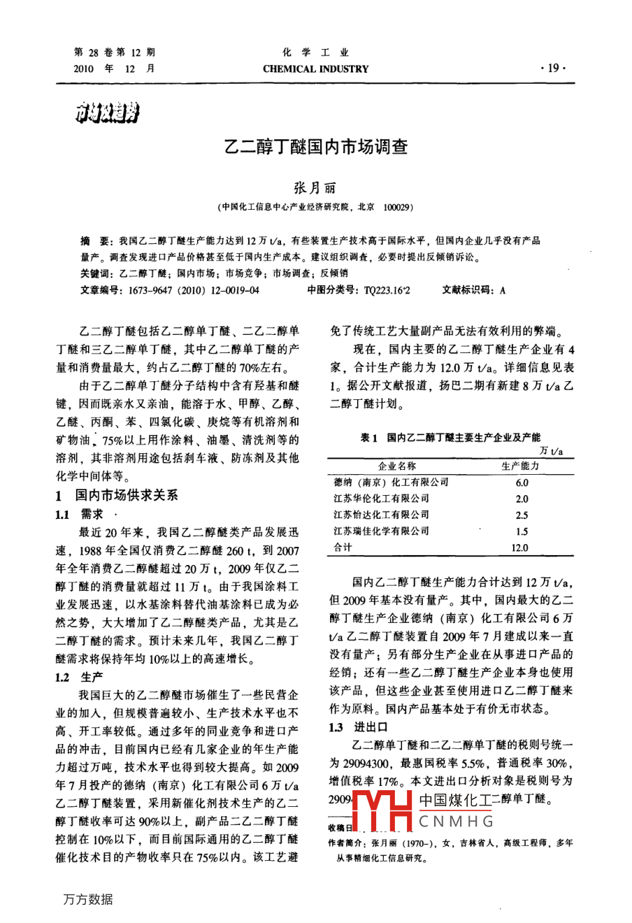 第28卷第12期化學(xué)工2010年12月CHEMICAL INDUSTRY19乙二醇丁醚國(guó)內(nèi)市場(chǎng)調(diào)查張?jiān)蔓?中國(guó)化工信息中心產(chǎn)業(yè)經(jīng)濟(jì)研究院,北京1009)摘要:我國(guó)乙二醇丁醚生產(chǎn)能力達(dá)到12萬(wàn)U/a,有些裝置生產(chǎn)技術(shù)高于國(guó)際水平,但國(guó)內(nèi)企業(yè)幾乎沒(méi)有產(chǎn)品量產(chǎn)。調(diào)查發(fā)現(xiàn)進(jìn)口產(chǎn)品價(jià)格甚至低于國(guó)內(nèi)生產(chǎn)成本。建議組織調(diào)查,必要時(shí)提出反傾銷(xiāo)訴訟關(guān)鍵詞:乙二醇丁醚;國(guó)內(nèi)市場(chǎng);市場(chǎng)竟?fàn)?市場(chǎng)調(diào)查;反傾銷(xiāo)文章編號(hào):1673-9647(2010)12-0019-04中圖分類(lèi)號(hào):TQ22362文獻(xiàn)標(biāo)識(shí)碼:A乙二醇丁醚包括乙二醇單丁醚、二乙二醇單免了傳統(tǒng)工藝大量副產(chǎn)品無(wú)法有效利用的弊端丁醚和三乙二醇單丁醚,其中乙二醇單丁醚的產(chǎn)現(xiàn)在,國(guó)內(nèi)主要的乙二醇丁醚生產(chǎn)企業(yè)有4量和消費(fèi)量最大,約占乙二醇丁醚的70%左右。家,合計(jì)生產(chǎn)能力為120萬(wàn)ta。詳細(xì)信息見(jiàn)表由于乙二醇單丁醚分子結(jié)構(gòu)中含有羥基和醚1。據(jù)公開(kāi)文獻(xiàn)報(bào)道,揚(yáng)巴二期有新建8萬(wàn)t/a乙鍵,因而既親水又親油,能溶于水、甲醇、乙醇、二醇丁醚計(jì)劃。乙醚、丙酮、苯、四氯化碳、庚烷等有機(jī)溶劑和礦物油,75%以上用作涂料、油墨、清洗劑等的表1國(guó)內(nèi)乙二醇丁醚主要生產(chǎn)企業(yè)及產(chǎn)能溶劑,其非溶劑用途包括剎車(chē)液、防凍劑及其他企業(yè)名稱(chēng)生產(chǎn)能力化學(xué)中間體等。德納(南京)化工有限公司1國(guó)內(nèi)市場(chǎng)供求關(guān)系江蘇華倫化工有限公司2.011需求江蘇怡達(dá)化工有限公司最近20年來(lái),我國(guó)乙二醇醚類(lèi)產(chǎn)品發(fā)展迅江蘇瑞佳化學(xué)有限公司速,1988年全國(guó)僅消費(fèi)乙二醇醚260t,到2007合計(jì)12.0年全年消費(fèi)乙二醇醚超過(guò)20萬(wàn)t,200年僅乙醇丁醚的消費(fèi)量就超過(guò)1萬(wàn)t。由于我國(guó)涂料工國(guó)內(nèi)乙二醇丁醚生產(chǎn)能力合計(jì)達(dá)到12萬(wàn)va,業(yè)發(fā)展迅速,以水基涂料替代油基涂料已成為必但2009年基本沒(méi)有量產(chǎn)。其中,國(guó)內(nèi)最大的乙二然之勢(shì),大大增加了乙二醇醚類(lèi)產(chǎn)品,尤其是乙醇丁醚生產(chǎn)企業(yè)德納(南京)化工有限公司6萬(wàn)二醇丁醚的需求。預(yù)計(jì)未來(lái)幾年,我國(guó)乙二醇丁Ma乙二醇丁醚裝置自2000年17月建成以來(lái)一直醚需求將保持年均10%以上的高速增長(zhǎng)。沒(méi)有量產(chǎn);另有部分生產(chǎn)企業(yè)在從事進(jìn)口產(chǎn)品的12生產(chǎn)經(jīng)銷(xiāo);還有一些乙二醇丁醚生產(chǎn)企業(yè)本身也使用我國(guó)巨大的乙二醇醚市場(chǎng)催生了一些民營(yíng)企該產(chǎn)品,但這些企業(yè)甚至使用進(jìn)口乙二醇丁醚來(lái)業(yè)的加入,但規(guī)模普遍較小、生產(chǎn)技術(shù)水平也不作為原料。國(guó)內(nèi)產(chǎn)品基本處于有價(jià)無(wú)市狀態(tài)。高、開(kāi)工率較低。通過(guò)多年的同業(yè)競(jìng)爭(zhēng)和進(jìn)口產(chǎn)13進(jìn)出口品的沖擊,目前國(guó)內(nèi)已經(jīng)有幾家企業(yè)的年生產(chǎn)能乙二醇單丁醚和二乙二醇單丁醚的稅則號(hào)統(tǒng)力超過(guò)萬(wàn)噸,技術(shù)水平也得到較大提高。如200為29094300最惠國(guó)稅率55%,普通稅率30%,年7月投產(chǎn)的德納(南京)化工有限公司6萬(wàn)ta增值稅率17%。本文進(jìn)出口分析對(duì)象是稅則號(hào)為乙二醇丁醚裝置,采用新催化劑技術(shù)生產(chǎn)的乙二2909中國(guó)煤化工二醇單丁醚。醇丁醚收率可達(dá)90%以上,副產(chǎn)品二乙二醇丁醚收稿日CNMHG控制在10%以下,而目前國(guó)際通用的乙二醇丁醚作者藺介:張?jiān)蔓?190),女,吉林省人,高級(jí)工程師,多年催化技術(shù)目的產(chǎn)物收率只在75%以?xún)?nèi)。該工藝避從事精細(xì)化工信息研究化學(xué)工業(yè)CHEMICAL INDUSTRY2010年第28卷131進(jìn)出口量及價(jià)格醚進(jìn)出口情況見(jiàn)表22002-2010年乙二醇單丁醚和二乙二醇單丁從表2可以看出,自2002年以來(lái),我國(guó)乙二表22002-2010年乙二醇單丁醚和二乙二醇單丁醚進(jìn)出口情況分析進(jìn)口年份數(shù)量萬(wàn)t金額/美元平均價(jià)/(美元t)數(shù)量/萬(wàn)t金額/美元平均價(jià)/(美元)483858500.483823430612665440917154949835128511.021468126021331133010911419434600385044158133812231977363761616200819790.17331674191511.1313889593212480.11162601015072010-011.191341001313592010020719644102135400057053154321050014201004198650612010-051870427500l11③20100609014247953158219022010年16月合計(jì)6479386643014508613181544醇單丁醚和二乙二醇單丁醚的進(jìn)口量持續(xù)增加,出口國(guó)。2006年,美國(guó)消費(fèi)乙二醇醚占全球的到2007年進(jìn)口量超過(guò)12萬(wàn)t,2010年1-6月的30%,西歐占23%,我國(guó)占14%。2006年國(guó)外乙進(jìn)口量為647萬(wàn)t,估計(jì)全年將會(huì)超過(guò)12萬(wàn)t。二醇醚供求情況見(jiàn)表4而從2008年開(kāi)始至今則出現(xiàn)了量增價(jià)跌的局面。相對(duì)于進(jìn)口量來(lái)說(shuō),出口量很少,并呈逐年減少表42006年國(guó)外乙二醇醍供求情況趨勢