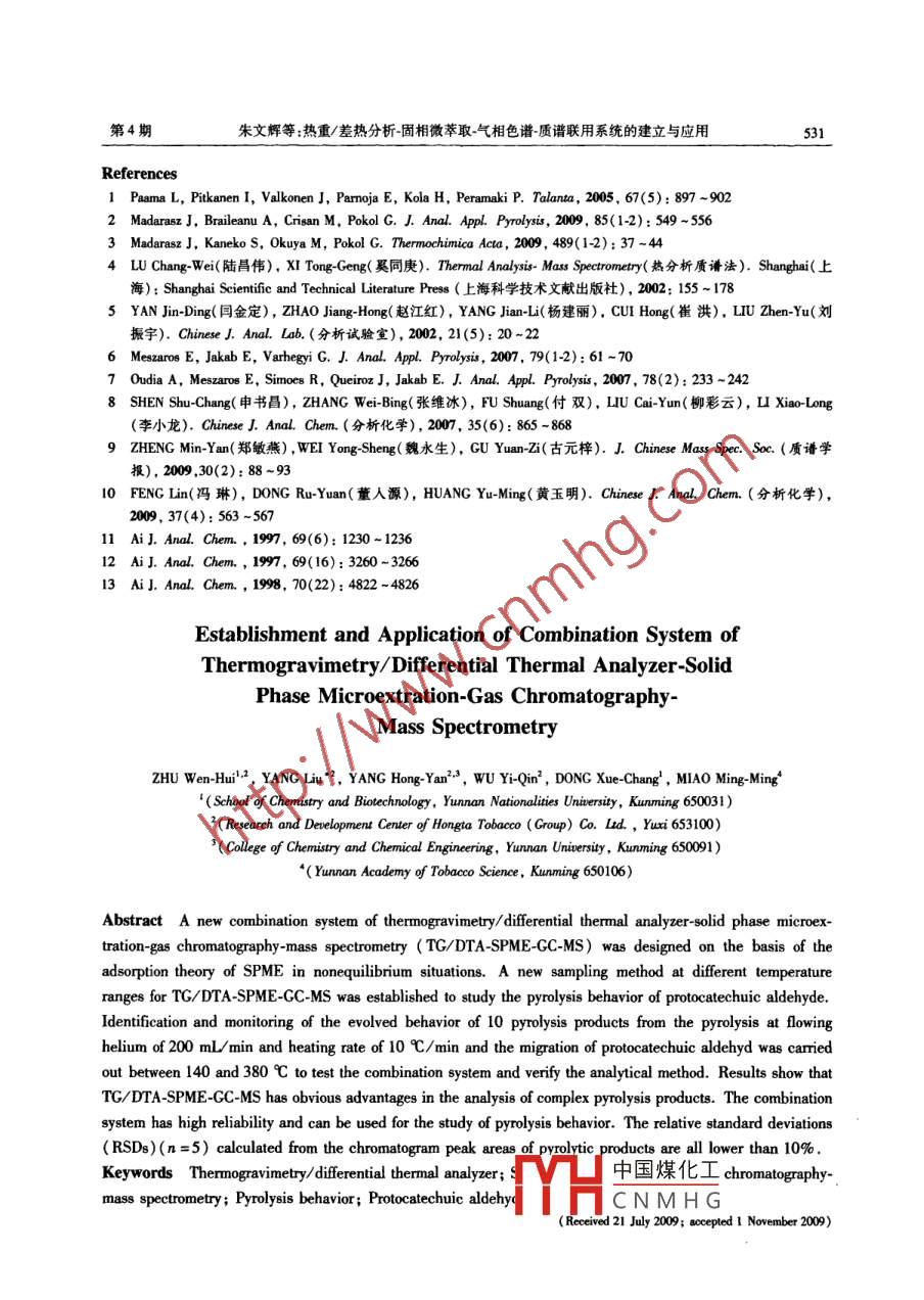 第38卷分析化學(xué)( FENXI HUAXUE)研究報告42010年4月Chinese Journal of Analytical Chemistry527~531DoI:10.3724/SP,J1096.2010.00527熱重/差熱分析-固相微萃取…氣相色譜質(zhì)譜聯(lián)用系統(tǒng)的建立與應(yīng)用朱文輝2楊柳”2楊紅燕23吳億勤2董學(xué)暢繆明明(云南民族大學(xué)化學(xué)與生物技術(shù)學(xué)院,昆明65031)2(紅塔煙草(集團(tuán))有限責(zé)任公司技術(shù)中心,玉溪653100)3(云南大學(xué)化學(xué)科學(xué)與工程學(xué)院昆明650091)‘(云南煙草科學(xué)研究院昆明650106)摘要根據(jù)非平衡態(tài)固相微萃取理論建立了熱重/差熱分析固相微萃取氣相色譜質(zhì)譜聯(lián)用系統(tǒng)并按照劃分溫度段取樣的方法將其應(yīng)用于原兒茶醛熱解行為的研究,以驗證聯(lián)用系統(tǒng)的可靠性和分析方法的可行性。采用此系統(tǒng),在10℃/mn升溫速率、200mL/min氮?dú)饬魉贄l件下,在140-380℃溫度范圍內(nèi)監(jiān)測并分析了原兒茶醛的10種熱解逸出產(chǎn)物的含量變化和原兒茶醛本體的遷移情況。結(jié)果表明此聯(lián)用系統(tǒng)在分析復(fù)雜組分逸出行為方面有明顯優(yōu)勢;根據(jù)熱解產(chǎn)物色譜峰面積計算得到的聯(lián)用系統(tǒng)相對標(biāo)準(zhǔn)偏差(n=5)小于10%,證明此聯(lián)用系統(tǒng)具有較高的可靠性能夠用于熱解行為的研究關(guān)鍵詞熱重/差熱分析;固相微萃取;氣相色譜質(zhì)譜;熱解行為;原兒茶醛1引言熱重/差熱分析法(TG/DTA)是應(yīng)用熱天平在程序控制溫度下測量物質(zhì)質(zhì)量與溫度關(guān)系的熱分析技術(shù),已廣泛應(yīng)用于諸多領(lǐng)域。將熱分析儀與其它檢測系統(tǒng)聯(lián)用結(jié)合各自的特點(diǎn)和功能,擴(kuò)大分析內(nèi)容是熱分析儀器的發(fā)展趨勢。目前普遍使用熱重傅立葉變換紅外聯(lián)用( TG-FTIR)和熱重質(zhì)譜聯(lián)用(TGMS),主要用于熱分析儀的逸出組分分析。但 TG-FTIR不適用于鑒定具有相同官能團(tuán)特征的復(fù)雜有機(jī)物-3:而TGMS尚未完全解決樣品在熱分解過程中同時逸出復(fù)雜組分的重疊質(zhì)譜峰解析“。上述問題制約了熱分析聯(lián)用技術(shù)的發(fā)展與應(yīng)用,需組建立一種能夠分析復(fù)雜逸出組分的聯(lián)用裝置,以彌補(bǔ)現(xiàn)有熱分析技術(shù)的不足。固相微萃取(SPME)是一種集萃取濃縮、解吸、進(jìn)樣于一體的樣品前處理技術(shù)已在環(huán)保、醫(yī)藥食品香料等領(lǐng)域得到廣泛應(yīng)用。將SPME應(yīng)用于熱分析儀逸出組分分析的研究尚未見報道。本研究基于SPME非平衡態(tài)吸附理論1-3),設(shè)計了可吸附熱分析儀逸出組分的聯(lián)結(jié)裝置結(jié)合氣相色譜質(zhì)譜法,建立了熱重/差熱分析固相微萃取氣相色譜質(zhì)譜(TG/ DTA-SPME-GC-MS)聯(lián)用系統(tǒng)。采用劃分溫度段取樣的方法,分析原兒茶醛(丹參等中草藥中的活性成分)的熱解行為,以驗證此聯(lián)用系統(tǒng)的可靠性和分析方法的可行性,為熱分析儀逸出組分分析提供了新的研究手段和方法。2實驗部分2.1儀器與試劑Pyris Diamond T/DTA型熱重/差熱綜合熱分析儀,外部溫度控制單元(日本SI公司)XL型氣相色譜 TurboMass Gold MS型質(zhì)譜聯(lián)用儀(美國 Perkin Elmer公司);100μm聚二甲基硅氧烷( Polydimethylsiloxane,PDMs)商用萃取頭,固相微萃取手柄(美國 Supelco公司)。原兒茶醛( Protocate-chui aldehyde,純度≥99.5%,華寶公司)。22TG/ DTA-SPME-GC-MS聯(lián)用系統(tǒng)的建立SPME-GC-MS聯(lián)用技術(shù)發(fā)展至今已經(jīng)比較成熟,而中國煤化工系統(tǒng)的關(guān)鍵在于熱分析儀與固相微萃取裝置的聯(lián)結(jié)。THCNMHG20090721收稿2009-11-12接受9@126.c0m528分析化學(xué)第38卷自行設(shè)計的聯(lián)結(jié)裝置如圖1所示,出口加熱帶固相微萃取裝置溫度由熱分析儀自帶的外部溫度控制單元調(diào)節(jié),溫度控在室溫至300℃范圍內(nèi);將爐體出口通過金屬不銹鋼管轉(zhuǎn)接頭與內(nèi)徑3mm的不銹鋼管連接;不銹鋼管外部m如體加熱帶加套保溫層,其上端出口帶有螺紋并能與手動固相Heat insulationOutlet heater band樣品架微萃取裝置緊密契合。在靠近不銹鋼管末端位置設(shè)天平榨有排氣孔;調(diào)節(jié)固相微萃取裝置的高度,使其萃取頭Balance beam伸出后全部位于不銹鋼管保溫層中,不與管壁接觸。報頭在爐體未加熱、出口加熱帶保持300℃,測得萃取頭位置的溫度為31℃,爐內(nèi)樣品架的溫度為45℃(室溫由空調(diào)控制恒定23℃);在爐體出口未圖1熱分析儀與固相微萃取的聯(lián)結(jié)裝置示意圖Fig 1 Schematic diagram of device coupling thermal an加熱、爐體于1000℃保持lh的條件下,測得萃取頭alyzer with solid phase microextration( SPME)位置的溫度為室溫。在出口加熱帶保持300℃的條件下,萃取溫度恒定為31℃,而不會受到爐體升溫的影響,保證了萃取條件的穩(wěn)定性。2.3儀器分析條件23.1熱分析儀(TG/DTA)條件熱天平靈敏度1μg;爐體溫度控制范圍為室溫至1000℃;載氣為高純氮?dú)?參比物a氧化鋁6.054mg;載氣流速200mL/min;出口加熱帶溫度控制范圍為室溫至300℃。232固相微萃取(SPME)條件100μm聚二甲基硅氧烷萃取頭;吸附溫度31℃;吸附時間2min233氣相色譜(GC)條件HP5Ms毛細(xì)管色譜柱(30mx0.25mm,0.25μm);進(jìn)樣口溫度250℃;載氣He(純度為99%9),載氣流速lmL/min;升溫程序50℃250℃,保持5min;不分流進(jìn)樣。234質(zhì)譜(MS)條件