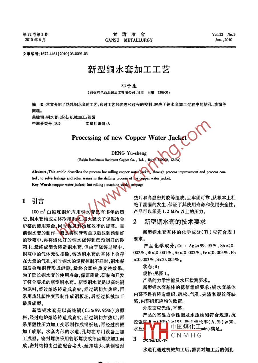 第32卷第3期甘肅冶金Vol 32 No. 32010年6月GANSU METALLURGYJun.,2010文章編號:1672461(2010)0340091403新型銅水套加工工藝鄧予生(白銀有色西北鋼加工有限公司,甘肅白銀73090摘要:本文介紹了熱軋銅水套的工藝,通過工藝的改進和過程的控制解決了銅水套加工過程中的鉆孔、滲漏等問題。關鍵詞:銅水套;熱軋;機械加工;滲漏中圖分類號:T5文獻標識碼:AProcessing of new Copper Water JacketDENG Yu-shengBaiyin Nonferrous Northwest Copper Co, Ltd, Baiyin 730900, China)Abstract: This article describes the process hot rolling copper water jacket, through process improvement and process con-trol, to solve leakage and other issues in the drilling process of the copper water jacket.Key Words: copper water jacket; hot rolling: machine work; seepage1引言墊片和高溫密封膠等組成,且牢固可靠,從根本上杜絕了泄漏的發(fā)生,保證了其使用壽命和使用安全性。100m2白銀煉銅爐應用銅水套已有多年的歷產品可以承受12MPa以上的壓力。史銅水套構成立體冷卻系統(tǒng)極大延長了保溫冶金2新型銅水套的技術要求爐窯的使用壽命,同時促進料冶煉效率的提高。目前銅水套的制作一般是將銅管彎曲以后放到預制好新型銅水套基體的化學成分(T)應符合表1的砂箱中再將熔化好的銅水澆鑄到已預制好的砂要求:箱中,最終成型為鑄造銅水套,但由于澆鑄過程中產品化學成分:Cu+Ag≥9.95%、$b≤0銅液中的氣體無法排除,鑄造銅水套的基體上會存02%、Bi≤0.001%、A≤0.00%、Fe≤0.00%、P在大量的氣孔,有時銅水的溫度控制不好時,銅水凝≤0.00%、5≤0.00%固后會和銅管形成縫隙,最終會影響熱交換效果。狀態(tài):R;為了延長銅水套的使用壽命,保證質量研制和開發(fā)規(guī)格:見圖1了符合要求的新型銅水套。新型銅水套是以高純銅產品的力學性能及水壓檢測要求為原料,經過熔煉鑄造成扁錠,經過鋸切加熱后,再新型銅水套基體的低倍組織要求:銅水套基體采用熱軋塑性變形制作成銅板坯,后經過機械加工內部不得有鑄造組織、疏松氣孔、夾渣和裂紋等缺最后成型。陷,內部組織應均勻致密。新型銅水套是以高純銅(Cu≥9.95%)為原外表面應光潔,平整。料,經過電爐熔煉鑄造成扁錠,經過鋸切加熱后,再產品的室溫力學性能及水壓檢測符合規(guī)定:抗采用塑性壓力加工變形制作成銅板壞再經過機械拉強度中和長率(A%)≥30加工成形。水套內部的水道孔均在專用設備上加水壓min)滿足工成型。密封螺紋采用管形螺紋或細齒螺紋加工而3CNMHG成,密封結構由過盈配合堵頭、絲扣堵頭、紫銅密封水道孔通過機械加工后,需要對加工后的側孔藍野濫理E- mail: GSLYJIA126cmTelo93-85546甘肅冶金第32卷A-A2004-27圖1銅水套示意圖進行封堵,關鍵是要保證水道側孔封堵后絕對無滲003%含磷量計算加入磷銅合金)靜止5~10min,鑄漏。安裝使用后應保證安全可靠。最終以提高錠的澆鑄口采用煤氣保護,有芯工頻感應電爐電壓100m2白銀爐的使用壽命為目的。因此在銅水套側控制到保溫電壓,開始鑄造。鑄錠規(guī)格為820×160孔封堵上釆取有效的技術措施,封堵后保證絕對安XLmm。全無滲漏。53鑄錠鋸切檢查4工藝方案的制定鑄錠經分析成分合格后,檢查工進行初檢后用龍門鋸進行鋸切,經檢查工檢查合格做好標記,扁錠原料→工頻感應爐加熱熔化→爐前分析→半連轉入熱軋。續(xù)立式鑄造→扁錠坯→檢查→鋸切→鑄錠→環(huán)型加5.4鑄錠加熱及熱軋工序熱爐加熱→熱軋→酸洗→校平→無損探傷→檢查→扁鑄錠在環(huán)形加熱爐開始點爐升溫,爐溫達到鋸切→坯料成型→檢查→劃線→鉆孔→測量→進出800℃后開始裝爐,鑄錠裝爐升溫當料溫達到860連接口螺紋加工→銅管連接→堵側孔打入鋼球(過℃時保溫60min開始熱軋道次分配加工率應控制盈配合)→涂密封膠→裝配二次銅墊和螺栓→壓力在15%~30%之間。試驗→檢查驗收。5.5酸洗工序5工序要求將熱軋制品進行酸洗清除擠制品表面的氧化皮。要求酸洗徹底干凈;酸洗后的表面不能有殘酸、5.1工藝配料及原料要求水跡、花印及殘留氧化皮。軋制法生產軋制銅水套坯料使用的原料采用電酸洗濃度H2SO415%~20%+余量H2O。解陰極銅;執(zhí)行的標準為陰極銅(GB/T467-1997)。酸洗時間洗凈為止,一般在30~50min嚴格按照爐料管理制度進行裝料陰極銅配料坯料經酸洗后:用高壓水沖凈表面的殘酸為100%,確保鑄錠的化學成分符合標準GBT2315.6銅水套軋制板坯的無損探傷和成型鋸切2001《加工銅及銅合金化學成分和產品形狀》中對板坯進行無損探傷,按圖紙要求進行鋸切加的T1牌號。工,主要部分給機械加工留有余量5.2熔煉鑄造5.7中國煤化工原料由配料工段進行配料,將配好的原料加入CNMHO外觀尺寸需要采用1.5t的有芯工頻感應電爐內用鍛燒木炭覆蓋,送電插床刨床、鉆床等進行機械加工成型,使其成為軋加熱到1160~1180℃,加入脫氧劑(銅水中按0.制銅水套本體的基準尺寸并達到圖紙要求。第3期鄧予生:新型銅水套加工工藝先根據銅水套圖紙要求冷卻水的管路在銅水套工螺栓銅堵頭如圖3所示,涂抹高溫密封膠進行二本體上進行預鉆孔劃線。次封堵處理,螺栓堵頭臺階處加紫銅墊(紫銅墊密根據通水孔要求,選擇合適直徑鉆頭進行橫向、封墊加工完畢后,加熱到650℃保溫5min,迅速水豎向鉆孔,在無高精度深孔鉆的情況下,有的孔須進冷,除去表面氧化皮)進行三次密封。檢查側孔堵行兩頭對鉆貫通的工藝進行鉆孔。頭與軋制銅水套本體