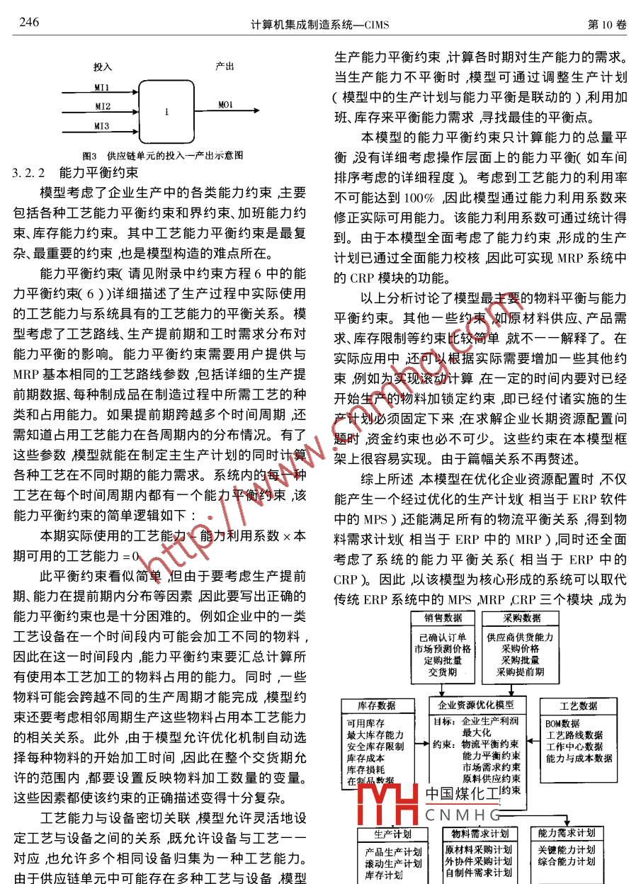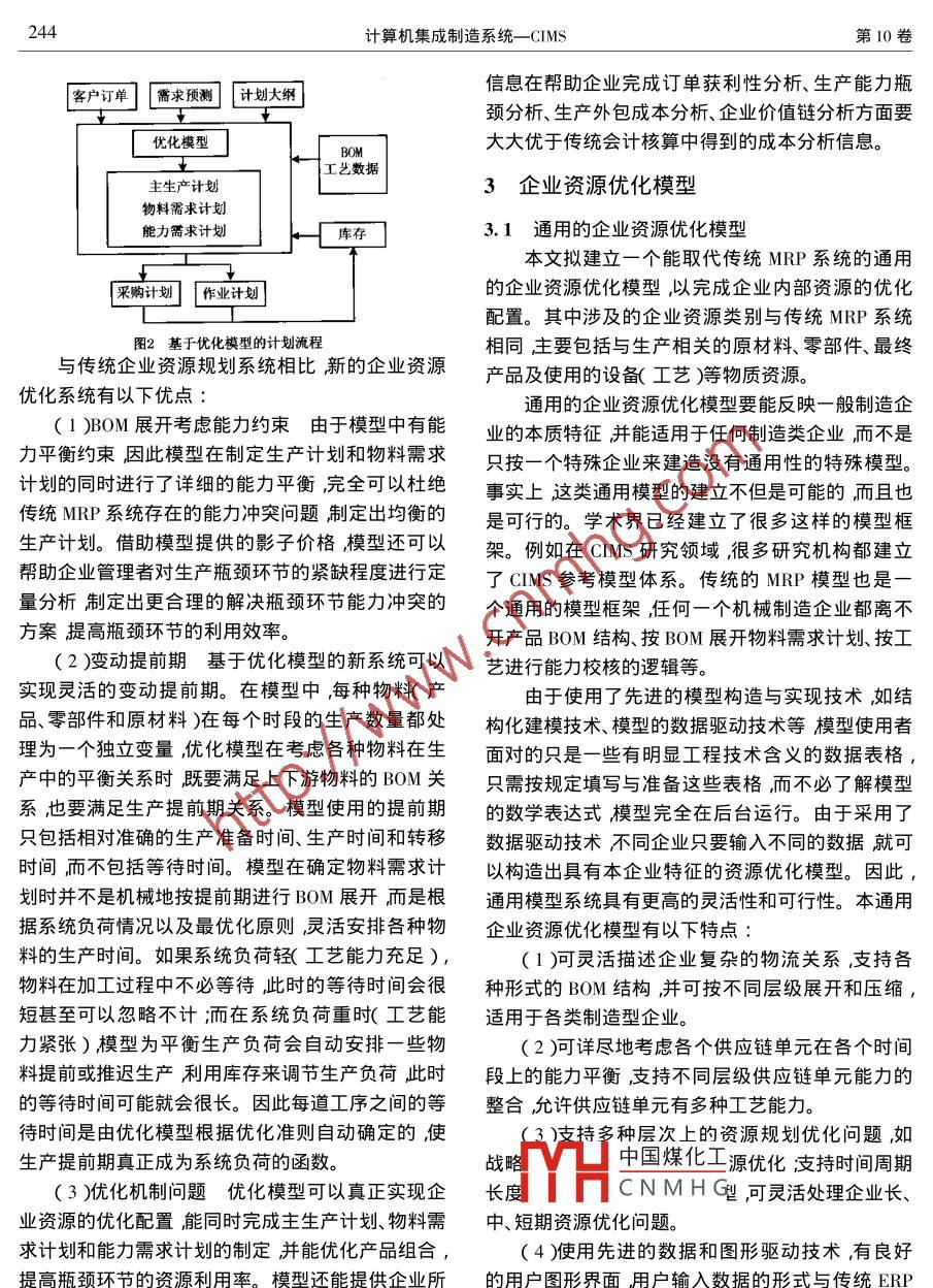 第10卷第3期計(jì)算機(jī)集成制造系統(tǒng)一-CIMSVol. 10 No. 32004年3月Computer Integrated Manufacturing SystemsMar.2004文章編號(hào):1006 -5911( 2004 )03 -0241 -11企業(yè)資源優(yōu)化與優(yōu)化模型藍(lán)伯雄(清華大學(xué)經(jīng)濟(jì)管理學(xué)院北京100084 )摘要討論了企業(yè)資源優(yōu)化問(wèn)題的基本概念和特性綜述了學(xué)術(shù)界為實(shí)現(xiàn)企業(yè)資源優(yōu)化所做的努力提出了-個(gè)基于供應(yīng)鏈結(jié)構(gòu)、能夠?qū)崿F(xiàn)制造類企業(yè)資源優(yōu)化的企業(yè)資源優(yōu)化模型。該模型能描述制造企業(yè)復(fù)雜的物料清單關(guān)系進(jìn)行詳細(xì)的物流與能力平衡,可對(duì)產(chǎn)品組合、庫(kù)存控制、外協(xié)加工等進(jìn)行優(yōu)化。模型可以取代傳統(tǒng)企業(yè)資源計(jì)劃系統(tǒng)中的主生產(chǎn)計(jì)劃、物料需求計(jì)劃和能力需求計(jì)劃模塊成為企業(yè)資源優(yōu)化系統(tǒng)的核心模塊。關(guān)鍵詞企業(yè)資源規(guī)劃企業(yè)資源優(yōu)化供應(yīng)鏈管理;優(yōu)化模型企業(yè)集成模型中圖分類號(hào):P270. 7文獻(xiàn)標(biāo)識(shí)碼:A業(yè)資源計(jì)劃ERP)精良生產(chǎn)(LP)敏捷制造(AM)1企業(yè)資源優(yōu)化問(wèn)題簡(jiǎn)介和虛擬制造(VM)等。上述先進(jìn)生產(chǎn)管理模式的引如何有效地利用稀缺資源實(shí)現(xiàn)資源的最優(yōu)配置入極大地改變了企業(yè)經(jīng)營(yíng)管理的面貌。是經(jīng)濟(jì)學(xué)和管理學(xué)永恒的話題。一個(gè)企業(yè)所擁有的實(shí)現(xiàn)企業(yè)資源優(yōu)化的關(guān)鍵是建立包括企業(yè)產(chǎn)、資源主要是人、財(cái)、物等有形資產(chǎn)以及技術(shù)、專利、品供、銷等整個(gè)企業(yè)的內(nèi)部供應(yīng)鏈具有優(yōu)化功能的企牌、市場(chǎng)等無(wú)形資產(chǎn)。本文所述的企業(yè)資源優(yōu)化問(wèn)業(yè)管理系統(tǒng)。該系統(tǒng)除能完成傳統(tǒng)的管理信息系統(tǒng)題主要是指企業(yè)有形資產(chǎn)資源的優(yōu)化問(wèn)題。(MIS)和ERP系統(tǒng)的企業(yè)資源管理功能外還能在由于企業(yè)是一個(gè)復(fù)雜的社會(huì)大系統(tǒng)影響企業(yè)信息系統(tǒng)的支持下完成企業(yè)資源的優(yōu)化配置,實(shí)現(xiàn)經(jīng)營(yíng)的因素成千上萬(wàn),利用傳統(tǒng)的管理模式與管理更高級(jí)的決策支持功能。由于企業(yè)系統(tǒng)的復(fù)雜性和方法很難使企業(yè)供應(yīng)鏈協(xié)調(diào)運(yùn)轉(zhuǎn)。以功能劃分部門(mén)方法、工具的局限性人們對(duì)企業(yè)資源優(yōu)化的認(rèn)識(shí)是的管理模式只在本部門(mén)內(nèi)考慮資源配置問(wèn)題而無(wú)-個(gè)逐步深化的過(guò)程實(shí)現(xiàn)企業(yè)資源優(yōu)化的途徑也法兼顧其他部門(mén)]和企業(yè)的整體利益。在-個(gè)部門(mén)看因此而呈多樣性。學(xué)術(shù)界的研究主要集中在以IT似最優(yōu)的決策從企業(yè)整體看則可能是不優(yōu)的甚技術(shù)為基礎(chǔ)的CIM和以運(yùn)籌學(xué)/管理科學(xué)(OR/MS)至是低劣的。因此,在企業(yè)管理中必須引入系統(tǒng)概方法為核心的優(yōu)化模型兩個(gè)領(lǐng)域。念和集成化管理的新模式。管理人員在考慮任何一實(shí)現(xiàn)企業(yè)資源優(yōu)化的前提之-是建立集成化的個(gè)部門(mén)]的管理決策問(wèn)題時(shí)都要站在整個(gè)企業(yè)的角管理體系CIM是實(shí)現(xiàn)集成化管理的重要基礎(chǔ)只有度,全面、系統(tǒng)地考慮該決策對(duì)企業(yè)整體的影響。在信息集成的環(huán)境下才有可能把產(chǎn)品開(kāi)發(fā)、生產(chǎn)制信息、通訊等現(xiàn)代科學(xué)技術(shù)的發(fā)展為企業(yè)創(chuàng)造造、物料供應(yīng)、市場(chǎng)營(yíng)銷等各項(xiàng)管理職能緊密地銜接新的集成化管理模式提供了新的手段。近十幾年來(lái)起來(lái)形成相互協(xié)調(diào)一致的統(tǒng)一體。20 世紀(jì)80年相繼問(wèn)世的先進(jìn)生產(chǎn)管理模式有計(jì)算機(jī)集成制造代中中國(guó)煤化工系統(tǒng)CIMS )逐漸成為( CIM )準(zhǔn)時(shí)生產(chǎn)( JIT )制造資源計(jì)劃MRPII )企制造YHCNMHGis結(jié)伴而生的ERP系收稿日期2003 -06-27修訂日期:2003 -12 -19?;痦?xiàng)目國(guó)家自然科學(xué)基金重點(diǎn)資助項(xiàng)目( 70071013 )。作者簡(jiǎn)介藍(lán)伯雄男黑龍江齊齊哈爾人清華大學(xué)經(jīng)濟(jì)管理學(xué)院管理科學(xué)與工程系教授博士生導(dǎo)師加拿大滑鐵盧大學(xué)博士主要從事大系統(tǒng)優(yōu)化理論與算法、供應(yīng)鏈優(yōu)化模型、復(fù)雜制造系統(tǒng)優(yōu)化模型等方面的研究。E - mail :lanbx@ em. tsinghua. edu. cn。242計(jì)算機(jī)集成制造系統(tǒng)一-CIMS第10卷統(tǒng)可以說(shuō)是實(shí)現(xiàn)企業(yè)資源優(yōu)化目標(biāo)的產(chǎn)物。但無(wú)論1.2計(jì)算機(jī)集成 制造是CIMS還是ERP都只是為實(shí)現(xiàn)企業(yè)資源優(yōu)化打計(jì)算機(jī)集成制造雖然完成了企業(yè)資源的集成,-個(gè)良好的基礎(chǔ)其自身還缺乏優(yōu)化的工具。但由于它缺少描述企業(yè)整體目標(biāo)的模型和優(yōu)化手企業(yè)資源優(yōu)化可借助OR/MS提供的各種方法段因此還不是-個(gè)完善的企業(yè)資源優(yōu)化系統(tǒng)。為和手段如