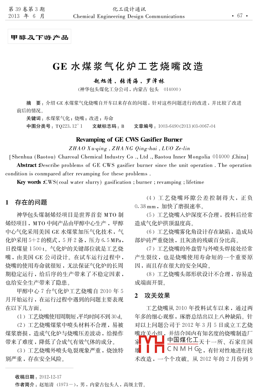 第39卷第3期化工設(shè)計通訊2013年6月Chemical engineering design communications甲醇及下游產(chǎn)品GE水煤漿氣化爐工藝燒嘴改造趙旭清,張清海,羅澤林(神華包頭煤化工分公司,內(nèi)蒙古包頭014000)摘要:介紹GE水煤漿氣化燒嘴自開車以來存在的問題,針對這些問題進行的改進,并比較了改進前后的情況關(guān)鍵詞:水煤漿氣化;燒嘴;改進;壽命中圖分類號:TQ223.121文獻標志碼:B文章編號:1003-6490(2013)03-067-04Revamping of Ge CWS Gasifier BurnerZHAO Xu-ging, ZHANG Qing-hai, LUo Ze-lin[ Shenhua(Baotou)Charcoal Chemical Industry Co., Ltd . Baotou Inner Mongolia 014000 ChinaAbstract Describe problems of GE CWS gasifier burner since the unit operation. The operationcondition is compared after revamping for these problemsKey words C WS(coal water slurry)gasification; burner revamping; lifetime1存在的問題(4)工藝燒嘴環(huán)隙公差控制得大,正負0.38mm,加快了磨損速率。神華包頭煤制烯烴項目是世界首套MTO制(5)工藝燒嘴入爐深度不合理,投料后經(jīng)常烯烴項目,MTO中間產(chǎn)品由甲醇中心生產(chǎn),甲醇造成氣化爐拱頂溫度高中心氣化采用美國GE水煤漿加壓氣化技術(shù),氣(6)工藝燒嘴霧化角設(shè)計存在缺陷,造成局化爐采用5十2的模式,5開2備,壓力6.5MPa,部爐磚嚴重燒蝕,且灰渣的殘?zhí)及俜直雀?。日投煤?500t。氣化爐的關(guān)鍵部位就是工藝燒(7)工藝燒嘴的外盤管與外噴頭焊接處經(jīng)常嘴,由美國GE公司設(shè)計。在試車運行過程中,產(chǎn)生裂紋,也是燒嘴使用壽命短的一個重要原燒嘴的使用壽命就很短,無法保證氣化爐的長周因,而且存在很大的安全風險期穩(wěn)定運行,給后序的生產(chǎn)帶來了不穩(wěn)定因素(8)工藝燒嘴頭部形狀設(shè)計不合理,容易造也給安全生產(chǎn)帶來了隱患成端面開裂甲醇中心7臺氣化爐工藝燒嘴自2010年月開始運行,在運行過程中遇到的問題主要表現(xiàn)2攻關(guān)效果在以下幾方面工藝燒嘴從2010年投料試車以來,通過兩(1)工藝燒嘴使用周期短,平均時間不到30d。年多的細心觀察,琢磨總結(jié)岀以上八種缺陷。針(2)工藝燒嘴煤漿中噴頭材料不合理,易被對以上冋題公司于2012年3月5日成立工藝燒煤漿磨損,造成氣化爐與燒嘴壓差波動,給操作嘴攻關(guān)小紺、并結(jié)合國內(nèi)有知名度的燒嘴制造廠帶來了難度,降低了合成氣有效氣體的成分中國煤化工天十一所、石家莊國(3)工藝燒嘴外噴頭龜裂現(xiàn)象嚴重,燒蝕特雄CNMHG論,有針對性地進行技別嚴重,存在安全風險術(shù)改造,一個個攻破。從2012年的2月份到9收稿日期:2012-12-17作者簡介:趙旭清(1973-),男,內(nèi)蒙古包頭人,高級主管化工設(shè)計通訊第39卷月份燒嘴的平均使用壽命不到5σ0h(表1),從明我們攻關(guān)取得了階段性成果,也說明了我們攻10月份到年底又一次統(tǒng)計,已經(jīng)超過了900h關(guān)方向是正確的,思路是清晰的,為下一步攻關(guān)(表2),而且都不是因為燒嘴原因更換下來,說取得更好的成績奠定了基礎(chǔ)。表1改造前氣化爐燒嘴使用記錄開始時間結(jié)束時間燒嘴壽命/h停用原因2011-12-182012-01-15657燒嘴冷卻水流量差波動,流量差髙高跳車,盤管與夾套焊縫漏2012-08-142012-08-26X701(GE2)288燒嘴冷卻水流量差波動,盤管與夾套焊縫漏.停車更換燒嘴201208-262012-10-02X101-06889燒嘴冷卻水流量差波動,盤管與夾套焊縫漏,停車更換燒嘴2012-06-042012-06-21X101-08燒嘴冷卻水流量差波動,CO報警,進口盤管焊縫漏,停車更換燒嘴2012.08-01201208-13X10104289燒嘴冷卻水流量差波動,CO報警,盤管焊縫漏,停車更換燒嘴2012-08-132012-08-27X1o1(GE7)329燒嘴冷卻水流量差波動,CO報警,盤管焊縫漏,停車更換燒嘴2012-05-112012-06-06122X101-01617燒嘴冷卻水流量差波動,停車更換燒嘴2012-07-25122X101-03燒嘴冷卻水流量差波動,燒嘴夾套焊縫岀現(xiàn)橫向裂紋,停車更換燒嘴201204-192012-05-02122X101314燒嘴冷卻水CO高,盤管漏,手動停車更換燒嘴2012-05-022012-05-18X501(GE3)燒嘴冷卻水CO報警,手動停車,更換燒嘴201205-182012-06-04122X701燒嘴冷卻水CO報警,燒嘴夾套焊縫半圓橫向開裂,停車更換燒嘴2012-06-042012-06-28X601(GE5)燒嘴冷卻水CO報警,燒嘴夾套進水焊縫漏,停車更換燒嘴2011-08-192011-0908X101(GE7燒嘴冷卻水流差高,氣化爐跳車,更換燒嘴平均值173表22012年11~12月氣化爐燒嘴使用記錄(改造后)始時間結(jié)束時間壽命/h停用原因2012-10-292012-12-15X1010511312012-11-062012-12-15X201(GE4)9382012-11-162012-12-15X101082012-10-292012-1204X101-01處理中心氧閥,一起更換平均值9123對各問題的處理改進情況車,甚至有可能發(fā)生爆炸。攻關(guān)后微裂紋只有13mm,這一難題由陜西鑫立攻破,鑫立采用下面用圖片的形式就改造前后進行對比國際上最為先進的材料,改變材料的性能.而且問題1上面的兩個表格已經(jīng)能夠充分說明能夠重復(fù)利用一次,雖然材料進口,成本高,但在使用周期上有了大的飛躍。能夠重復(fù)利用一次,也就降低了制造成本。問題2攻關(guān)前煤漿中噴頭磨損特別厲害問題4外環(huán)氧的氣流通道環(huán)隙是燒嘴最為容易造成氣化爐與燒嘴的壓差波動,給操作帶來關(guān)鍵的尺寸,GE公司圖紙給定的尺寸公差為正困難,攻關(guān)后一個周期下來磨損量只有0.3mm負0.38mm,其一,對燒嘴的壓差有著一定的影左右,航天十一所采用國際最先進的金屬陶瓷襯響,其二,影響煤漿在頭部的流速,影響霧化的套,耐磨效果特別好,而陜西鑫立采用堆焊耐磨角度。改造后嚴格了公
