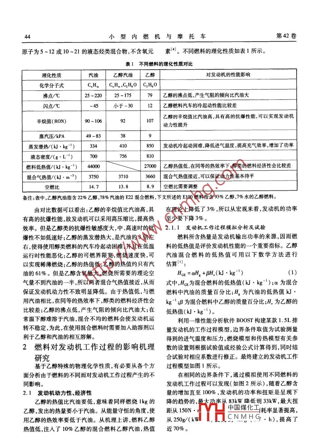第42卷第4期小型內(nèi)燃機(jī)與摩托車Vol 42 No 42013年8月SMALL INTERNAL COMBUSTION ENGINE AND MOTORCYCLEAug.2013乙醇-汽油燃料車用發(fā)動機(jī)設(shè)計開發(fā)錢德猛錢多德(安徽江淮汽車股份有限公司技術(shù)中心動力總成研究院安徽合肥230601)摘要:靈活燃料發(fā)動機(jī)即可以使用任意配比的乙醇和汽油的發(fā)動機(jī)。本文首先對乙醇和汽油的理化性質(zhì)進(jìn)行了深入的分析,然后通過計算機(jī)模擬和試驗(yàn)的方法研究了不同熱值的燃料對發(fā)動機(jī)機(jī)械性能、電控系統(tǒng)及排放特性的影響。闡述了使用任意配比的乙醇和汽油的靈活燃料發(fā)動機(jī)的開發(fā)思路,并結(jié)合具體的案例闡明了靈活燃料發(fā)動機(jī)的工程可行性和廣闊的應(yīng)用前景。關(guān)鍵詞:靈活燃料乙醇汽油發(fā)動機(jī)機(jī)械性能排放特性中圖分類號:TK411.71文獻(xiàn)標(biāo)識碼:A文章編號:1671-0630(2013)04-0043-04Engine Design for Ethanol-Gasoline VehicleQian Demeng, Qian DuodePowertrain Academy, Technology Center, Anhui Jianghuai AutomobileCo, Ltd.( Hefei, Anhui, 230601, ChinaAbstract: Flexible fuel engine can use free ratio mixed fuel of ethanol and gasoline. This paper first deeplyanalyzes the physics and chemistry character of ethanol and gasoline. Then the influences of the fuel of differentrmal values to the mechanism performance, electronic control system and emission are studied through themethod of simulation and experiment. Based on this, the development route of the flexible fuel engine usingfree ratio mixed fuel is illuminated Finally, the detailed engine projectole proves the feasibility of flexible fuel engine and wide application foregroundKeywords: Flexible fuel, Ethanol gasoline, Engine, Mechanism performance, Emission performance引言燃料汽車在巴西市場很受歡迎。在中國,奇瑞公司從乙醇是一種極具潛力的替代燃料,使用乙醇不但2008年5月開始開發(fā)靈活燃料汽車,其他企業(yè)200可以改善能源結(jié)構(gòu)減少對石油的依賴,同時可以降低年開始涉足靈活燃料汽車的研發(fā)。汽車的有害排放,緩解能源緊張和環(huán)境污染所帶來的本文通過仿真和試驗(yàn)的方法研究分析了不同燃料壓力。近些年我們國家也開始在部分省份和地區(qū)推對發(fā)動機(jī)性能的影響研究了車用靈活燃料發(fā)動機(jī)的廣使用含乙醇10%的乙醇汽油燃料。工程可行性和設(shè)計思路。世界范圍內(nèi),巴西是世界上最大的燃料乙醇生產(chǎn)1乙醇-汽油的物理化學(xué)特性分析和消費(fèi)國,巴西從2003年開始推廣應(yīng)用靈活燃料汽乙醇是一種無色透明、易揮發(fā)、易燃的液體。汽油車,目前靈活燃料汽車占國內(nèi)總銷量的90%以上。綜是烴類燃料,而醇類是烴基和羥基組成的化合物這也合燃油成本方面,乙醇比汽油低約30%,若是在產(chǎn)糖從化學(xué)性質(zhì)上說明了醇類可以作為內(nèi)燃機(jī)的代用燃的夏季或產(chǎn)糖區(qū),成本差異更大;此外,消費(fèi)者的環(huán)保料。從分子組中國煤化式為C2H4O,含有意識不斷增強(qiáng);再加上政府的稅收補(bǔ)貼導(dǎo)向使得靈活2個碳原子HCNMHG,而汽油則是碳作者簡介:錢德猛(1976-),男,工學(xué)博士,主要研究方向?yàn)檎?、發(fā)動機(jī)設(shè)計及CAE模擬仿真分析。44小型內(nèi)燃機(jī)與摩托車第42卷原子為5~12或10~21的液態(tài)烴類混合物,不含氧元素4。不同燃料的理化性質(zhì)如表1所示。表1不同燃料的理化性質(zhì)對比理化性質(zhì)汽油乙醇汽油乙醇對發(fā)動機(jī)的性能影響化學(xué)分子式C,Hn C,H, C2H,0 C2H,O沸點(diǎn)25-22025~17579乙醇的沸點(diǎn)低產(chǎn)生氣阻的傾向比汽油大閃點(diǎn)小于-3012乙醇燃料汽車的冷起動性能比較差辛烷值(RON90~106107乙醇的辛烷值比汽油高,具有高的抗爆性能可以實(shí)現(xiàn)發(fā)動機(jī)動力性提升蒸汽壓/kPA38蒸發(fā)潛熱/(k·kg-)334850發(fā)動機(jī)冷起動困難降低進(jìn)氣溫度提高充氣效率增加了功率液態(tài)密度/(g…·L-1)700756810燃料低熱值/(kJ·kg-)4002700乙醇熱值低,在同等的熱效率下醇類的燃料經(jīng)濟(jì)性會比較差混合氣熱值/(kJ·m-3)37503710366混合氣熱值接近,可以保證動力性基本持平空燃比14.713.8空燃比需要調(diào)整備注:表中,乙醇汽油指含2%乙醇,78%汽油的E2混合燃料,下文所述的E00燃料指含93%乙醇7%水的乙醇燃料。由對比數(shù)據(jù)可以看出:乙醇的辛烷值比汽油高,具在理論上降低了3%,所以從宏觀來看,發(fā)動機(jī)的功率有高的抗爆性能,故發(fā)動機(jī)可以采用高壓縮比,提高熱至少要下降3%。效率。但是乙醇類的抗爆性敏感度大,中高速時的抗2.1.1發(fā)動機(jī)工作過程模擬分析及試驗(yàn)爆性不如低速好;乙醇的蒸發(fā)潛熱大,是汽油的3倍左燃料所含熱量是發(fā)動機(jī)輸出功率的來源,因而燃右,使得使用醇類燃料的汽車?yán)淦饎永щy,并且在低溫料的低熱值是評價發(fā)動機(jī)性能的一個重要指標(biāo)。乙醇運(yùn)行時性能惡化;乙醇的可燃界限寬燃燒速度快,可汽油混合燃料的低熱值可用以下數(shù)學(xué)方法進(jìn)行以實(shí)現(xiàn)稀薄燃燒;乙醇的熱值低,乙醇的熱值約只有汽估算油的61%。但是乙醇含氧量大,燃燒所需要的理論空HE=aH+BH(kJ·kg氣量不到汽油的一半所以兩者混合氣熱值接近,從而式中,H為混合燃料的低熱值(kJ·kg-);a為混合保證發(fā)動機(jī)動力性不致明顯降低。由于熱值低與燃燃料中汽