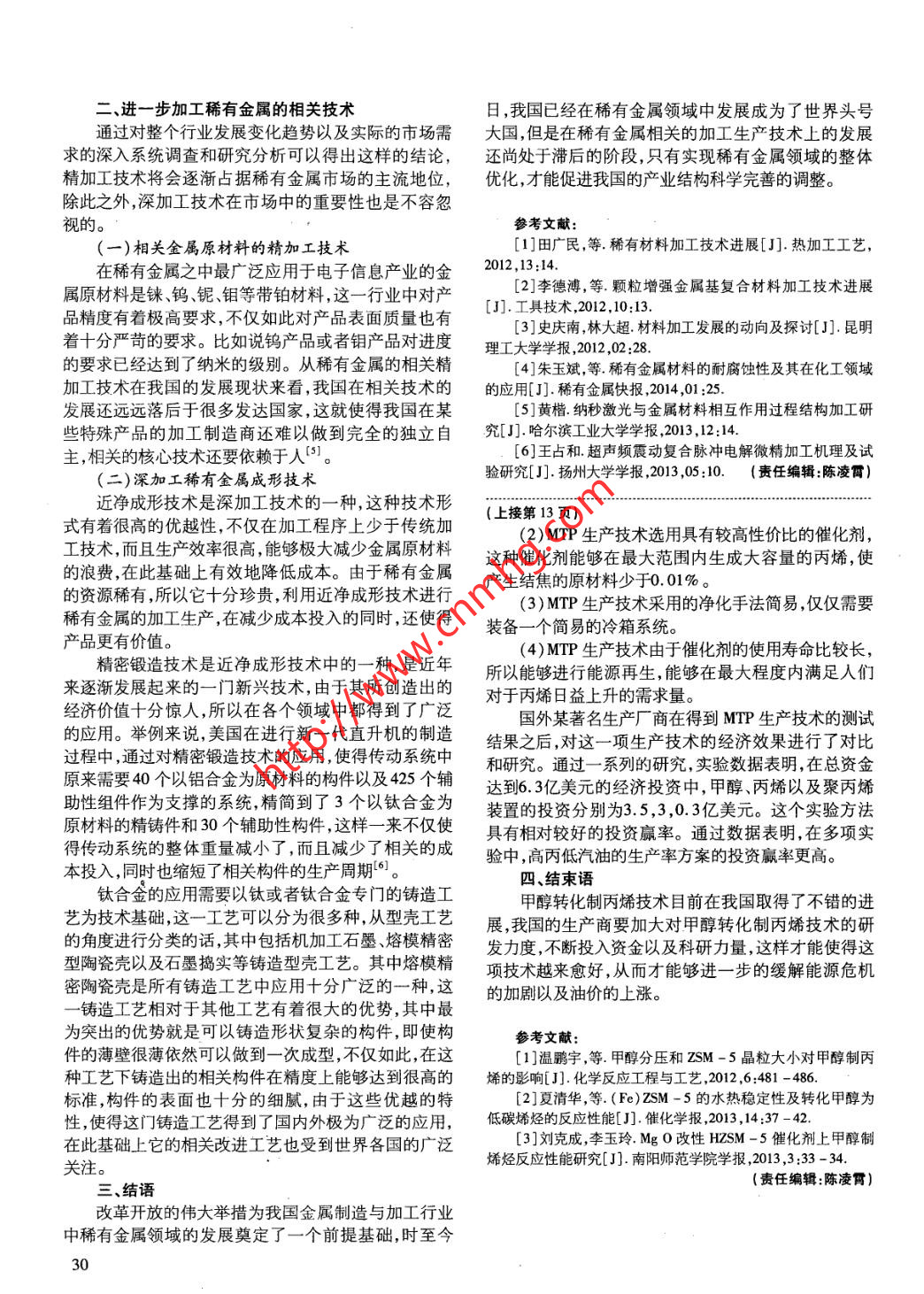 二、進(jìn)一步加工稀有金屬的相關(guān)技術(shù)日,我國(guó)已經(jīng)在稀有金屬領(lǐng)域中發(fā)展成為了世界頭號(hào)通過對(duì)整個(gè)行業(yè)發(fā)展變化趨勢(shì)以及實(shí)際的市場(chǎng)需大國(guó),但是在稀有金屬相關(guān)的加工生產(chǎn)技術(shù)上的發(fā)展求的深入系統(tǒng)調(diào)查和研究分析可以得出這樣的結(jié)論,還尚處于滯后的階段,只有實(shí)現(xiàn)稀有金屬領(lǐng)域的整體精加工技術(shù)將會(huì)逐漸占據(jù)稀有金屬市場(chǎng)的主流地位,優(yōu)化,才能促進(jìn)我國(guó)的產(chǎn)業(yè)結(jié)構(gòu)科學(xué)完善的調(diào)整。除此之外,深加工技術(shù)在市場(chǎng)中的重要性也是不容忽參考文獻(xiàn):視的。[1]田廣民,等.稀有材料加工技術(shù)進(jìn)展[J].熱加工工藝,(一)相關(guān)金屬原材料的精加工技術(shù)在稀有金屬之中最廣泛應(yīng)用于電子信息產(chǎn)業(yè)的金2012,13:14.[2]李德博,等.顆粒增強(qiáng)金屬基復(fù)合材料加工技術(shù)進(jìn)展屬原材料是錸、鎢、鈮鉬等帶鉑材料,這-一行業(yè)中對(duì)產(chǎn)[J].工具技術(shù),2012,10:13.品精度有著極高要求,不僅如此對(duì)產(chǎn)品表面質(zhì)量也有[3]史慶南,林大超.材料加工發(fā)展的動(dòng)向及探討[J].昆明著十分嚴(yán)苛的要求。比如說(shuō)鎢產(chǎn)品或者鉬產(chǎn)品對(duì)進(jìn)度理工大學(xué)學(xué)報(bào),2012 ,02 :28.的要求已經(jīng)達(dá)到了納米的級(jí)別。從稀有金屬的相關(guān)精[4]朱玉斌,等.稀有金屬材料的耐腐蝕性及其在化工領(lǐng)域加工技術(shù)在我國(guó)的發(fā)展現(xiàn)狀來(lái)看,我國(guó)在相關(guān)技術(shù)的的應(yīng)用[J].稀有金屬快報(bào),2014,01 :25.發(fā)展還遠(yuǎn)遠(yuǎn)落后于很多發(fā)達(dá)國(guó)家,這就使得我國(guó)在某[5]黃楷.納秒激光與金屬材料相互作用過程結(jié)構(gòu)加工研些特殊產(chǎn)品的加工制造商還難以做到完全的獨(dú)立自究[J].哈爾濱工業(yè)大學(xué)學(xué)報(bào),2013,12:14.[6]王占和超聲頻震動(dòng)復(fù)合脈沖電解微精加工機(jī)理及試主,相關(guān)的核心技術(shù)還要依賴于人”。驗(yàn)研究[J].揚(yáng)州大學(xué)學(xué)報(bào),2013,05:10. (責(zé)任編輯:陳凌霄)(二)深加工稀有金屬成形技術(shù)近凈成形技術(shù)是深加工技術(shù)的一.種,這種技術(shù)形(上接第13頁(yè))式有著很高的優(yōu)越性,不僅在加工程序上少于傳統(tǒng)加.(2)MTP生產(chǎn)技術(shù)選用具有較高性價(jià)比的催化劑,工技術(shù),而且生產(chǎn)效率很高,能夠極大減少金屬原材料這種催化劑能夠在最大范圍內(nèi)生成大容量的丙烯,使的浪費(fèi),在此基礎(chǔ)上有效地降低成本。由于稀有金屬產(chǎn)生結(jié)焦的原材料少于0.01%。的資源稀有,所以它十分珍貴,利用近凈成形技術(shù)進(jìn)行(3)MTP生產(chǎn)技術(shù)采用的凈化手法簡(jiǎn)易,僅僅需要稀有金屬的加工生產(chǎn),在減少成本投入的同時(shí),還使得裝備一個(gè)簡(jiǎn)易的冷箱系統(tǒng)。產(chǎn)品更有價(jià)值。(4) MTP生產(chǎn)技術(shù)由于催化劑的使用壽命比較長(zhǎng),精密鍛造技術(shù)是近凈成形技術(shù)中的一-種 ,是近年所以能夠進(jìn)行能源再生,能夠在最大程度內(nèi)滿足人們來(lái)逐漸發(fā)展起來(lái)的一門新興技術(shù),由于其所創(chuàng)造出的對(duì)于丙烯日益上升的需求量。經(jīng)濟(jì)價(jià)值十分驚人,所以在各個(gè)領(lǐng)域中都得到了廣泛國(guó)外某著 名生產(chǎn)廠商在得到MTP生產(chǎn)技術(shù)的測(cè)試的應(yīng)用。舉例來(lái)說(shuō),美國(guó)在進(jìn)行新一代直升機(jī)的制造結(jié)果之后,對(duì)這一-項(xiàng)生產(chǎn)技術(shù)的經(jīng)濟(jì)效果進(jìn)行了對(duì)比過程中,通過對(duì)精密鍛造技術(shù)的應(yīng)用,使得傳動(dòng)系統(tǒng)中和研究。通過一系列的研究, 實(shí)驗(yàn)數(shù)據(jù)表明,在總資金原來(lái)需要40個(gè)以鋁合金為原材料的構(gòu)件以及425個(gè)輔達(dá)到6.3億美元的經(jīng)濟(jì)投資中,甲醇、丙烯以及聚丙烯助性組件作為支撐的系統(tǒng),精簡(jiǎn)到了3個(gè)以鈦合金為裝置的投資分別為3.5,3 ,0.3億美元。這個(gè)實(shí)驗(yàn)方法原材料的精鑄件和30個(gè)輔助性構(gòu)件,這樣- -來(lái)不僅使具有相對(duì)較好的投資贏率。通過數(shù)據(jù)表明,在多項(xiàng)實(shí)得傳動(dòng)系統(tǒng)的整體重量減小了,而且減少了相關(guān)的成驗(yàn)中,高丙低汽油的生產(chǎn)率方案的投資贏率更高。本投入,同時(shí)也縮短了相關(guān)構(gòu)件的生產(chǎn)周期‘。四、結(jié)束語(yǔ)鈦合金的應(yīng)用需要以鈦或者鈦合金專門的鑄造工甲醇轉(zhuǎn)化制丙烯技術(shù)目前在我國(guó)取得了不錯(cuò)的進(jìn)藝為技術(shù)基礎(chǔ),這一-工藝可以分為很多種,從型殼工藝展,我國(guó)的生產(chǎn)商要加大對(duì)甲醇轉(zhuǎn)化制丙烯技術(shù)的研的角度進(jìn)行分類的話,其中包括機(jī)加工石墨、熔模精密發(fā)力度,不斷投入資金以及科研力量,這樣才能使得這型陶瓷殼以及石墨搗實(shí)等鑄造型殼工藝。其中熔模精項(xiàng)技術(shù)越來(lái)愈好,從而才能夠進(jìn)-步 的緩解能源危機(jī)密陶瓷殼是所有鑄造工藝中應(yīng)用十分廣泛的