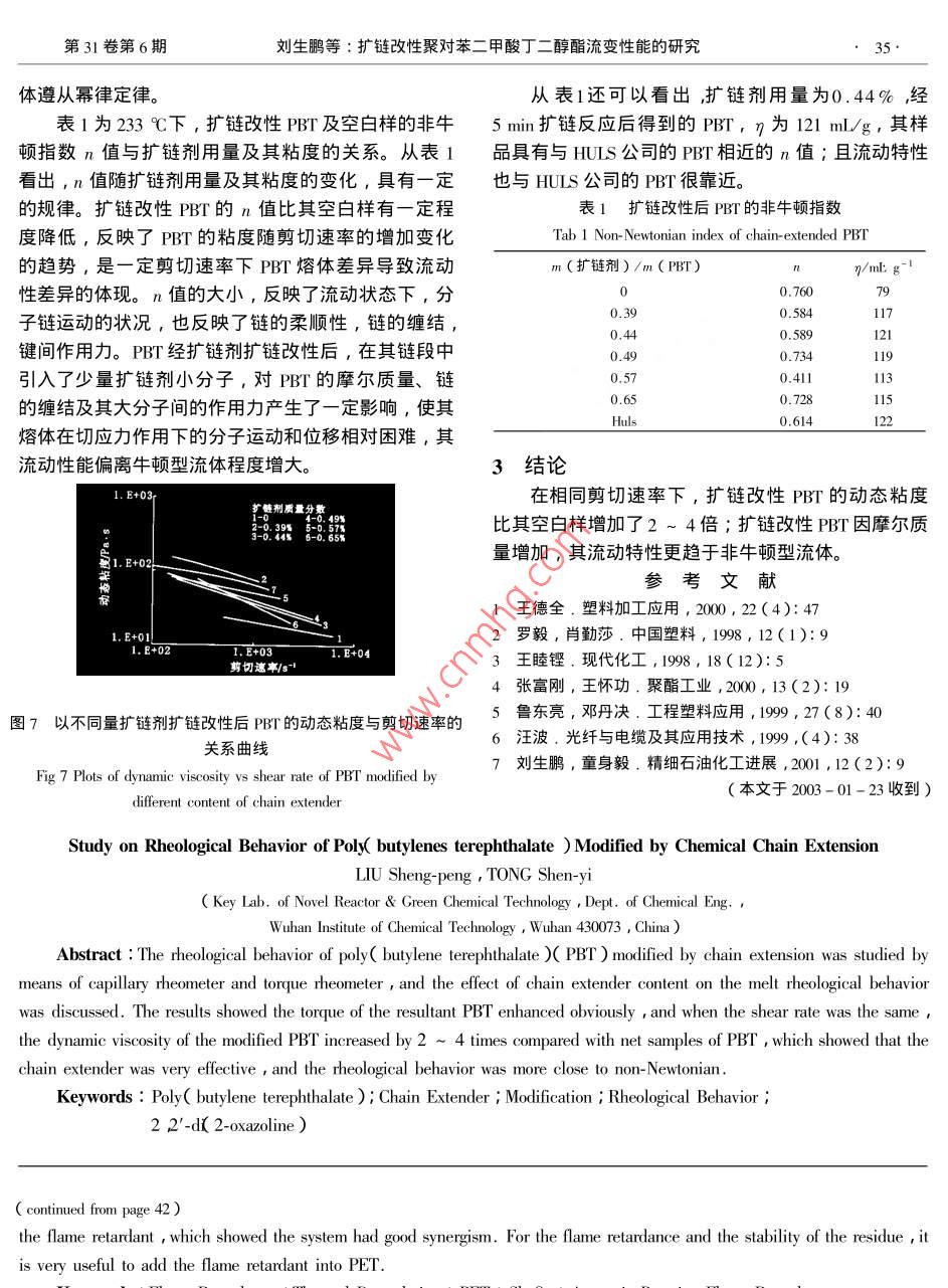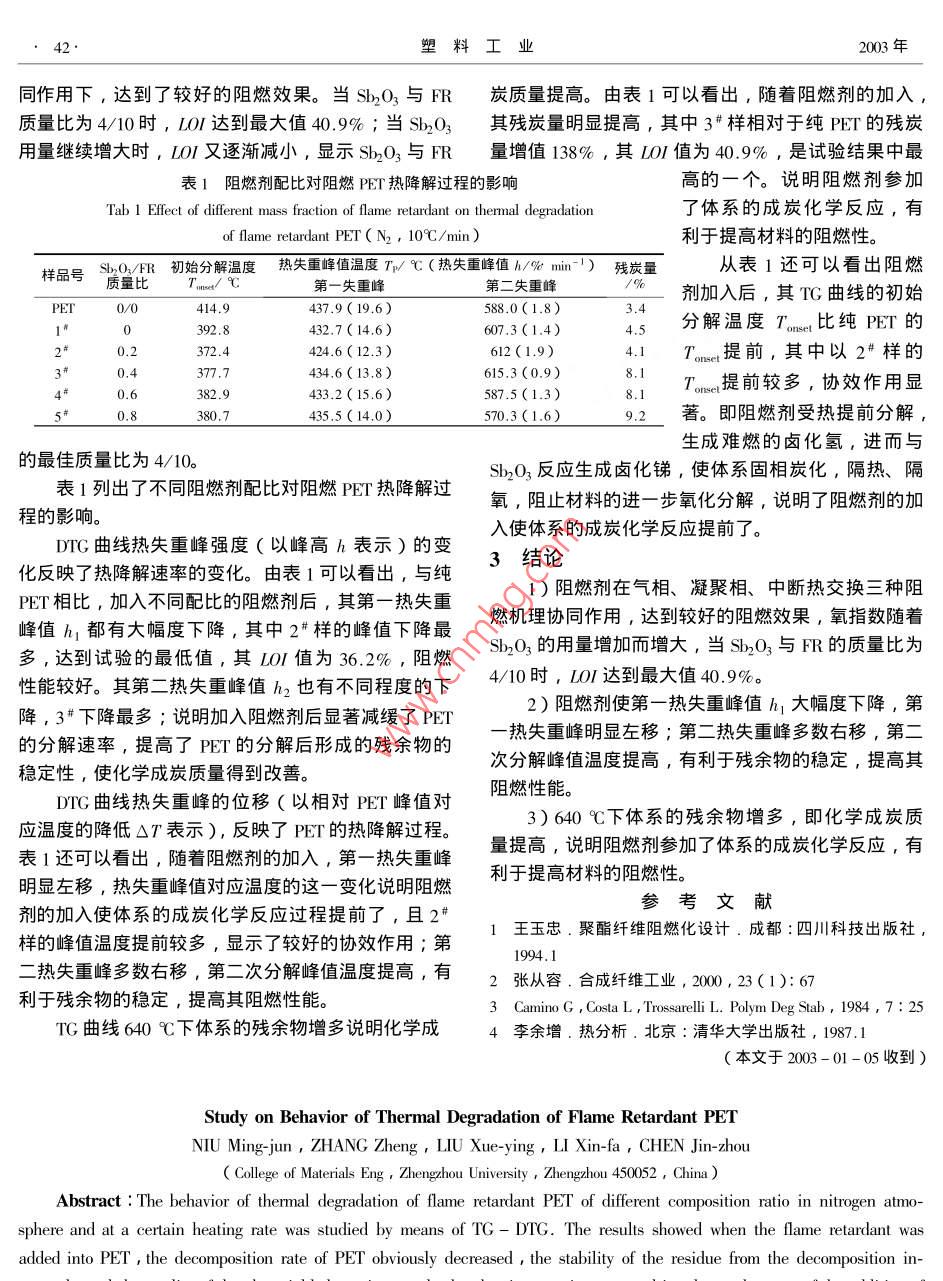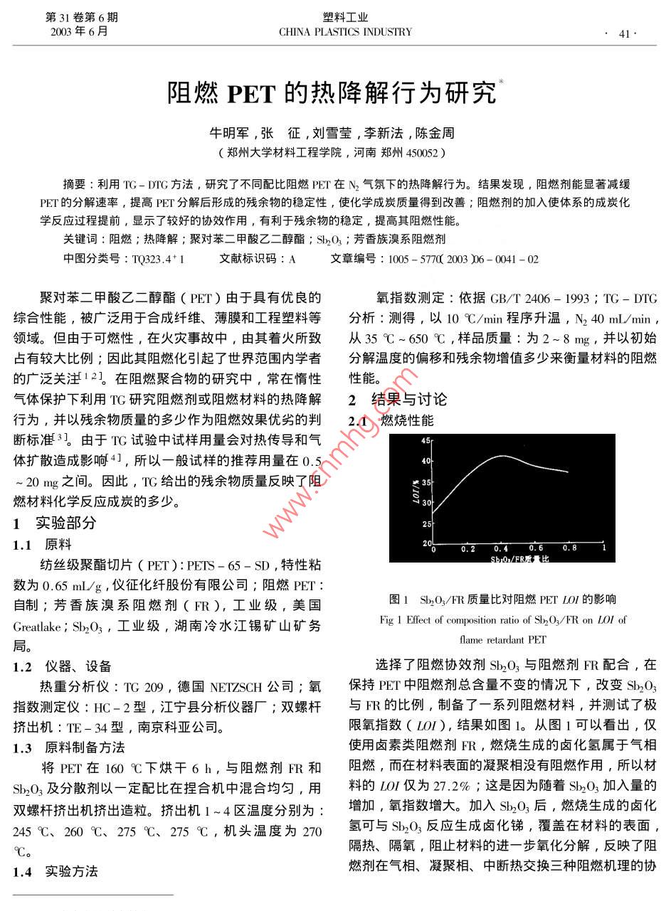 第31卷第6期塑料工業(yè)2003年6月CHINA PLASTICS INDUSTRY阻燃PET的熱降解行為研究牛明軍,張征,劉雪瑩,李新法,陳金周鄭州大學(xué)材料工程學(xué)院,河南鄭州450052)摘要∶利用τG-rG方法,研究了不同配比阻燃P在№2氣氛下的熱降解行為。結(jié)果發(fā)現(xiàn),阻燃劑能顯著減緩PET的分解速率,提高PET分解后形成的殘余物的穩(wěn)定性,使化學(xué)成炭質(zhì)量得到改善;阻燃劑的加入使體系的成炭化學(xué)反應(yīng)過程提前,顯示了較好的協(xié)效作用,有利于殘余物的穩(wěn)定,提高其阻燃性能。關(guān)鍵詞∶阻燃冫熱降解;聚對苯二甲酸乙二醇酯冫SO3;芳香族溴系阻燃劑中圖分類號:T0323.4+1文獻(xiàn)標(biāo)識碼:A文章編號:1005-577(2003)6-0041-02聚對苯二甲酸乙二醇酯(PET)由于具有優(yōu)良的氧指數(shù)測定:依據(jù)GBT2406-1993;TG-DI綜合性能,被廣泛用于合成纖維、薄膜和工程塑料等分析:測得,以10℃/min程序升溫,N’40m/min,領(lǐng)域。但由于可燃性,在火災(zāi)事故中,由其著火所致從35℃~650℃,樣品質(zhì)量:為2~8mg,并以初始占有較大比例;因此其阻燃化引起了世界范圍內(nèi)學(xué)者分解溫度的偏移和殘余物增值多少來衡量材料的阻燃的廣泛關(guān)注12J。在阻燃聚合物的研究中,常在惰性性能。氣體保護(hù)下利用TG研究阻燃劑或阻燃材料的熱降解2結(jié)果與討論行為,并以殘余物質(zhì)量的多少作為阻燃效果優(yōu)劣的判2,1燃燒性能斷標(biāo)準(zhǔn)3。由于TG試驗中試樣用量會對熱傳導(dǎo)和氣體擴(kuò)散造成影呵4],所以一般試樣的推薦用量在0.5~20mg之間。因此,TG給出的殘余物質(zhì)量反映了阻燃材料化學(xué)反應(yīng)成炭的多少實驗部分11原料紡絲級聚酯切片(PET):PEIN-65-SD,特性粘數(shù)為0.65mL/g,儀征化纖股份有限公司:阻燃PET自制;芳香族溴系阻燃劑(FR),工業(yè)級,美國圖1Sb2O3/FR質(zhì)量比對阻燃 PET LO的影響Greatlake;SbO3,工業(yè)級,湖南冷水江錫礦山礦務(wù)Fig 1 Effect of composition ratio of Sb O,/FR on LOl of局flame retardant PET1.2儀器、設(shè)備選擇了阻燃協(xié)效劑Sh2O3與阻燃劑FR配合,在熱重分析儀:TG209,德國 NETZSCH公司;氧保持PT中阻燃劑總含量不變的情況下,改變S2O3指數(shù)測定儀:HC-2型,江寧縣分析儀器廠;雙螺桿與H的比例,制備了一系列阻燃材料,并測試了極擠出機(jī):T-34型,南京科亞公司限氧指數(shù)(DO),結(jié)果如圖1。從圖1可以看出,僅13原料制備方法使用鹵素類阻燃劑FR,燃燒生成的鹵化氫屬于氣相將PE在160℃下烘干6h,與阻燃劑FR和阻燃,而在材料表面的凝聚相沒有阻燃作用,所以材Sh2O3及分散劑以一定配比在捏合機(jī)中混合均勻,用料的O僅為27.2%;這是因為隨著Sh2O3加入量的雙螺桿擠岀機(jī)擠岀造粒。擠岀機(jī)1~4區(qū)溫度分別為增加,氧指數(shù)增大。加入S2O3后,燃燒生成的鹵化245℃、260℃、275℃、275℃,機(jī)頭溫度為270氫可與S2O3反應(yīng)生成鹵化銻,覆蓋在材料的表面,隔熱、隔氧,阻止材料的進(jìn)一步氧化分解,反映了阻1.4實驗方法燃劑在氣相、凝聚相、中斷熱交換三種阻燃機(jī)理的協(xié)塑料工業(yè)2003年同作用下,達(dá)到了較好的阻燃效果。當(dāng)Sh2O3與FR炭質(zhì)量提高。由表1可以看出,隨著阻燃劑的加入,質(zhì)量比為4/10時,JO達(dá)到最大值40.9%;當(dāng)Sh2O3其殘?zhí)苛棵黠@提高,其中3樣相對于純PE的殘?zhí)坑昧坷^續(xù)增大時,LOⅠ又逐漸減小,顯示SbO3與F量增值138%,其LO/值為40.9%,是試驗結(jié)果中最表1阻燃劑配比對阻燃PET熱降解過程的影響高的一個。說明阻燃劑參加Tab 1 Effect of different mass fraction of flame retardant on thermal degradation了體系的成炭化學(xué)反應(yīng),有of flame retardant PET( N,, 10%C/min利于提高材料的阻燃性。樣品號S2O/H初始分解溫度熱失重峰值溫度Ty/℃(熱失重峰值h/%min-)殘?zhí)苛繌谋?還可以看出阻燃第一失重峰第二失重峰劑加入后,其TG曲線的初始414.9432.7(14.6)607.3(1.4)分解溫度T比純PET的424.6(12.3)612(1.9)4.1T提前,其中以2#樣的382.9433.2(15.6)587.5(1.3)T灬提前較多,協(xié)效作用顯380.7435.5(14.0)570.3(1.6)9.2著。即阻燃劑受熱提前分解,生成難燃的鹵化氫,進(jìn)而與的最佳質(zhì)量比為4/10。表1列出了不同阻燃劑配比對阻燃PE熱降解過S2O3反應(yīng)生成鹵化銻,使體系固相炭化,隔熱、隔氧,阻止材料的進(jìn)一步氧化分解,說明了阻燃劑的加入使體系的成炭化學(xué)反應(yīng)提前了。DG曲線熱失重峰強(qiáng)度(以峰高h(yuǎn)表示)的變3結(jié)論P(yáng)ET相比,加入不同配比的阻燃劑后,其第一熱失重1)阻燃劑在氣相、凝聚相、中斷熱交換三種阻峰值h1都有大幅度下降,其中2“樣的峰值下降最燃機(jī)理協(xié)同作用,達(dá)到較好的阻燃效果,氧指數(shù)隨著多,達(dá)到試驗的最低值,其LO/值為36.2%,阻燃b2O3的用量增加而增大,當(dāng)Sh2O3與HR的質(zhì)量比為性能較好。其第二熱失重峰值h2也有不同程度的下4/10時,LO達(dá)到最大值40.9%。降,3*下降最多;說明加入阻燃劑后顯著減緩了PET2)阻燃劑使第一熱失重峰值h大幅度下降,第的分解速率,提高了PET的分解后形成的殘余物的穩(wěn)定性,使化學(xué)成炭質(zhì)量得到改善。的次分解峰值溫度提高,有利于殘余物的穩(wěn)定,提高其DG曲線熱失重峰的位移(以相對PE峰值對阻燃性能。應(yīng)溫度的降低ΔT表示),反映了PET的熱降解過程3)640℃下體系的殘余物增多,即化學(xué)成炭質(zhì)表1還可以看出,隨著