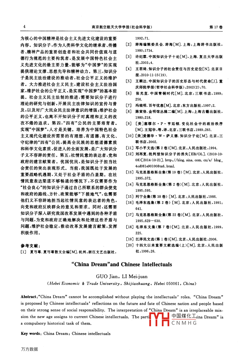 第17卷第1期南京航空航天大學(xué)學(xué)報(bào)(社會(huì)科學(xué)版)Vol 17 No, 12015年3月Journal of Nanjing University of Aeronautics and Astronautics(Social Sciences)Mar 2015DOI:10.16297/j. maass.201501001“中國(guó)夢(mèng)”與中國(guó)知識(shí)分子郭建,李美娟(河北經(jīng)貿(mào)大學(xué)馬克思主義學(xué)院,河北石家莊050061)摘要:實(shí)現(xiàn)“中國(guó)夢(mèng)”,離不開(kāi)知識(shí)分子作用的發(fā)揮?!爸袊?guó)夢(mèng)”的提出,是中國(guó)知識(shí)分子基于強(qiáng)烈的社會(huì)責(zé)任感對(duì)國(guó)家、民族前途和命運(yùn)進(jìn)行的思考,為“中國(guó)夢(mèng)”作解,是時(shí)代賦予當(dāng)代中國(guó)知識(shí)分子無(wú)可替代的歷史角色,共筑“中國(guó)夢(mèng)”,是當(dāng)代中國(guó)知識(shí)分子義不容辭的歷史擔(dān)當(dāng)。關(guān)鍵詞:中國(guó)夢(mèng);中國(guó)知識(shí)分子中圖分類(lèi)號(hào):D663.5文獻(xiàn)標(biāo)識(shí)碼:A文章編號(hào):1671-2129(2015)01-0001-04自2012年11月29日習(xí)近平總書(shū)記參觀《復(fù)興年,以被稱(chēng)為“知識(shí)分子宜言”的法國(guó)著名作家左拉之路》展覽時(shí)首提“中國(guó)夢(mèng)”以來(lái),“中國(guó)夢(mèng)”引起了國(guó)寫(xiě)給總統(tǒng)的《我控訴》公開(kāi)信的發(fā)表為標(biāo)志,一批政內(nèi)外的廣泛關(guān)注。2013年1月30日,中共中央政治上激進(jìn)、經(jīng)常直陳時(shí)弊的文化人也被稱(chēng)為知識(shí)分治局常委、中央書(shū)記處書(shū)記劉云山在看望國(guó)家最高子”。1987年,在美國(guó)哲學(xué)家拉塞爾·雅各比提出科技獎(jiǎng)獲得者吳良鏞、師昌緒兩位院士時(shí)指出:“實(shí)“公共知識(shí)分子”概念后,現(xiàn)代知識(shí)分子就成為“以獨(dú)現(xiàn)中國(guó)夢(mèng)是中華兒女的美好夙愿,是廣大知識(shí)分立的身份、借助知識(shí)和精神的力量,對(duì)社會(huì)表現(xiàn)出強(qiáng)子的理想追求?!崩硐胱非蟮膶?shí)現(xiàn),既需要知識(shí)分子烈的公共關(guān)懷,體現(xiàn)出一種公共良知、有社會(huì)參與意有強(qiáng)烈的使命意識(shí)更需要知識(shí)分子有舍我其誰(shuí)的識(shí)的一群文化人。叫據(jù)此,有學(xué)者將知識(shí)分子的特歷史擔(dān)當(dāng)。征概括為三個(gè)方面:一是要擁有某一專(zhuān)業(yè)(或某一方面)的理論或比較系統(tǒng)的知識(shí);二是要關(guān)心社會(huì),具、知識(shí)分子:概念、特征與功能有強(qiáng)烈的參與意識(shí)和社會(huì)責(zé)任感;三是還必須要有批評(píng)精神。也有學(xué)者將“除了自己的知識(shí)外,沒(méi)有實(shí)現(xiàn)“中國(guó)夢(mèng)”,離不開(kāi)知識(shí)分子作用的發(fā)揮。其他的謀生手段和資本”5也作為知識(shí)分子的特征發(fā)揮知識(shí)分子的作用,需要對(duì)知識(shí)分子在實(shí)現(xiàn)“中國(guó)之一。與廣義上將腦力勞動(dòng)者等同于知識(shí)分子過(guò)于夢(mèng)”進(jìn)程中角色、使命與作用的清醒認(rèn)識(shí)寬泛的界定相比,狹義的知識(shí)分子,囿于職業(yè)和過(guò)分知識(shí)分子”概念,有廣義和狹義之分。廣義的強(qiáng)調(diào)批判性忽視建設(shè)性,也顯得不夠客觀。因此,我知識(shí)分子,泛指一切掌握了一定知識(shí),從事腦力勞動(dòng)們認(rèn)為,將知識(shí)分子界定為“具有較高文化知識(shí),主的人。1928年,夏丐尊在《知識(shí)階級(jí)的運(yùn)命》一文中要以創(chuàng)造、積累、傳播、管理及應(yīng)用文化知識(shí)為職業(yè)指出,知識(shí)分子就是“曾受相當(dāng)教育較一般俗人有的腦力勞動(dòng)者,他們是關(guān)心社會(huì),具有強(qiáng)烈的參與意學(xué)識(shí)趣味與一藝之長(zhǎng)的人們。學(xué)校教員、牧師、畫(huà)識(shí)和社會(huì)責(zé)任感,富有建設(shè)性和批判精神的一個(gè)群家、醫(yī)師新聞?dòng)浾?、公署人員、文士、工場(chǎng)技師,都是體”較為妥當(dāng)。這一界定內(nèi)在地包含了知識(shí)分子的這類(lèi)的人物?!掇o海》的定義是“有一定文化科學(xué)四大特征:一是從勞動(dòng)形式上講,與體力勞動(dòng)者相區(qū)知識(shí)的腦力勞動(dòng)者?!?狹義的“知識(shí)分子”概念最早別屬于腦力勞動(dòng)者;二是與非知識(shí)分子相比較,往源于西方。按照《簡(jiǎn)明不列顛百科全書(shū)》的解釋,知往接受過(guò)一定的教育,掌握了某一方面系統(tǒng)的文化識(shí)分子,最初是指19世紀(jì)在俄國(guó)出現(xiàn)的一個(gè)不滿(mǎn)社知識(shí)或者說(shuō)專(zhuān)業(yè)知識(shí);三是在對(duì)待社會(huì)的態(tài)度上,關(guān)會(huì)現(xiàn)狀,滿(mǎn)懷烏托邦理想,致力于維護(hù)與實(shí)現(xiàn)人類(lèi)基心社會(huì),具有強(qiáng)烈的社會(huì)責(zé)任感,堪稱(chēng)社會(huì)的良心;本價(jià)值,對(duì)社會(huì)有著強(qiáng)烈批判意識(shí)的群體。1898四是在知識(shí)分子的社會(huì)功能上,既強(qiáng)調(diào)了知識(shí)分子中國(guó)煤化工收稿日期:2014-11-08CNMHG作者簡(jiǎn)介:郭建(1965-),男,河北宣化人,河北經(jīng)貿(mào)大學(xué)馬克思主義學(xué)院教孜,唄士生導(dǎo)卿,王要魷死方向?yàn)轳R克思主義中國(guó)化。南京航空航天大學(xué)學(xué)報(bào)(社會(huì)科學(xué)版)第17卷要具有批判精神,又突出了