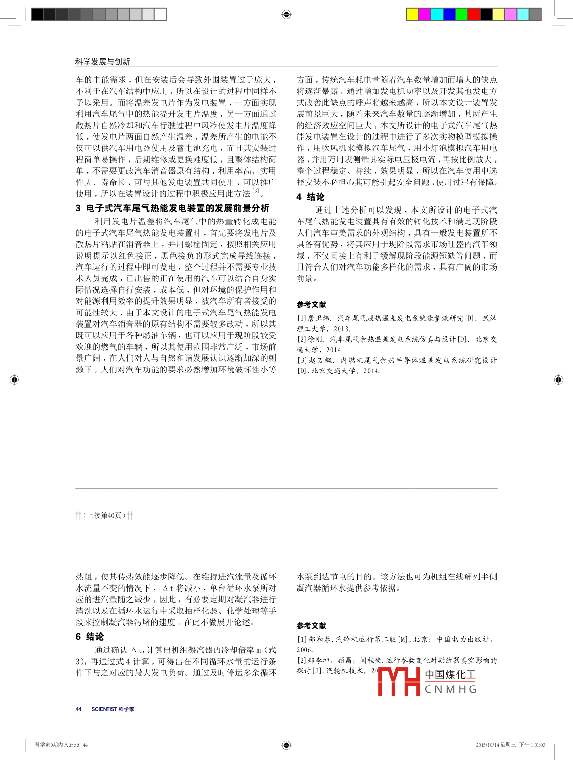 科學(xué)發(fā)展與創(chuàng)新25MW汽輪機(jī)組凝汽器循環(huán)水泵的合理啟停秦洋,陳波,楊運(yùn)輝寧波鋼鐵有限公司能源環(huán)保部,浙江寧波315807摘要本文通過(guò)理論計(jì)算并結(jié)合現(xiàn)場(chǎng)實(shí)際情況, 得出了一臺(tái)循環(huán)水泵運(yùn)行時(shí)對(duì)應(yīng)的最佳發(fā)電負(fù)荷。可以使未配備變頻調(diào)節(jié)的循環(huán)水泵,在發(fā)電負(fù)荷降低到一定值時(shí),通過(guò)停運(yùn)多余的循環(huán)水泵,在不影響機(jī)組安全運(yùn)行的前提下,達(dá)到降低附屬設(shè)備電耗的目的。關(guān)鍵詞25MW 汽輪機(jī)組;凝汽器;循環(huán)水泵中圖分類(lèi)號(hào)TM文獻(xiàn)標(biāo)識(shí)碼A文章編號(hào)2095-6363 (2015) 09-0040-01寧波鋼鐵有限公司焦化廠(chǎng)CDQ余熱鍋爐配有一臺(tái).循環(huán)水比熱,kJ/ (kg . C);一般情況下,汽輪機(jī)排25MW抽凝式汽輪發(fā)電機(jī)組(型號(hào)為C25-8.83/0.98),汽干度X為90%~ 95%,則X(h,_-hi )=2140 ~ 2220kJ/該汽輪發(fā)電機(jī)組于2010年3月投產(chǎn),在投產(chǎn)初期為純kg, 取中間值2180kJ/kg;循環(huán)水比熱c=4. 187kJ/冷凝工況運(yùn)行,該機(jī)組配有3臺(tái)(2用1備或1用2備)(kg.C),則有:功率為280KW的循環(huán)水泵(額定流量2020m/h,最大流2180q. =4.187q.. ,Ar或N(2)4.1879m量為2340m/h),在實(shí)際運(yùn)行中,流量計(jì)顯示單臺(tái)循環(huán)水泵流量為2400m*/h左右,兩臺(tái)泵運(yùn)行流量為4000m/h令9m=mm就是循環(huán)水量與排汽量的比值,稱(chēng)為左右。冷卻倍率。它表示冷凝器每凝結(jié)1kg蒸汽所需要的循環(huán)1現(xiàn)狀及問(wèn)題水量,所以有:由于該汽輪發(fā)電機(jī)組所配備的鍋爐為干熄焦余熱Ot≈:(3)鍋爐,余熱鍋爐負(fù)荷的不穩(wěn)定導(dǎo)致了發(fā)電負(fù)荷的不穩(wěn)3單臺(tái)循環(huán)水泵對(duì)應(yīng)發(fā)電負(fù)荷的確定6定。該機(jī)組投產(chǎn)初期規(guī)定發(fā)電負(fù)荷10MW 以上,保持兩在多流程的凝汽器中,中、小機(jī)組可取臺(tái)循環(huán)水泵運(yùn)行,10MW以下保持一臺(tái)循環(huán)水泵運(yùn)行,Ot=7.5~12°C,大機(jī)組可取△t=5~6°C。本機(jī)組凝汽以10MW為界線(xiàn)只是投產(chǎn)初期為保證機(jī)組安全運(yùn)行而定,器為二流道四流程,額定真空值為9kpa (a), 運(yùn)行并無(wú)過(guò)多理論和實(shí)踐依據(jù),而循環(huán)水泵是汽輪發(fā)電機(jī)組中Ot=11'C時(shí),不會(huì)對(duì)機(jī)組真空造成影響,故取值功率最大的附屬設(shè)備,所以合理的啟、停循環(huán)泵可以給△t=11C,則該機(jī)組凝汽器冷卻倍率為:機(jī)組節(jié)能降耗方面帶來(lái)-定的經(jīng)濟(jì)效益。2凝汽器的熱力特性分析m=L = 47.3凝汽:器循環(huán)水量的多少將直接影響機(jī)組經(jīng)濟(jì)、安單臺(tái)循環(huán)水泵運(yùn)行最大流量為2400m3/h,其對(duì)應(yīng)全運(yùn)行。循環(huán)水量qmw與循環(huán)水溫升Ot (冷凝器循環(huán)排汽量為:水進(jìn)、出口溫差)有著密切的關(guān)系:循環(huán)水量過(guò)少會(huì)使9m=m= 472400= 50.7(4得循環(huán)水溫升提高從而使得排汽溫度升高,直接影響凝汽器真空,導(dǎo)致真空下降,從而使機(jī)組效率降低;而真純冷凝工況下,該機(jī)組50.7t的進(jìn)汽流量對(duì)應(yīng)的空進(jìn)一步惡化還會(huì)使機(jī)組被迫停機(jī);而水量過(guò)多則使得發(fā)電負(fù)荷為14MW左右,即單臺(tái)循環(huán)水泵運(yùn)行的情況下循環(huán)水溫升過(guò)低,浪費(fèi)循環(huán)水泵耗電量。電廠(chǎng)凝汽器一可維持14MW發(fā)電負(fù)荷。般運(yùn)行經(jīng)驗(yàn)表明,凝汽器真空下降1kPa,機(jī)組的熱耗將4實(shí)際應(yīng)用增加1.5%~2. 5%。因此,控制凝汽器循環(huán)水量必須在不通過(guò)理論計(jì)算,我們將以往以10MW為界啟、停一影響凝汽器真空的前提下進(jìn)行。汽輪機(jī)的排汽在凝汽器中放出的熱量,由循環(huán)水臺(tái)循環(huán)水泵的規(guī)定提高到以14MW為界,僅從2010年11全部吸收。在凝汽中排汽放出的總熱量應(yīng)等于循環(huán)水所月份來(lái)看,該機(jī)組發(fā)電負(fù)荷在10MIW~14MW 之間的運(yùn)行時(shí)間為440h左右,在此期間運(yùn)行一臺(tái)循環(huán)水泵,機(jī)組真吸收的熱量,其熱平衡方程式為:空值及汽耗均正常。按一臺(tái)循環(huán)水泵正常負(fù)荷250KW計(jì)Xqmm(n, - hin)= 9mm.Stc(1)算, 當(dāng)月節(jié)約用電約11萬(wàn)度。式中:X-排汽干度,%;qm-凝汽器排汽量,kg/h ;5凝汽器換熱效能降低的影響h.-排汽焓,kJ/kg;hi。- 凝結(jié)水焓,kJ/kg; 0t-凝隨著機(jī)組運(yùn)行時(shí)間的增加,凝汽器管壁內(nèi)不可避汽器循環(huán)水進(jìn)、出口溫差,C;q.-循環(huán)水量,kg/h;c-免會(huì)附著鹽垢、污泥及微生物,因此將大幅增加凝汽器中國(guó)煤化工頁(yè))↓↓YHCNMH GSCIENTIST 科學(xué)家科學(xué)家9期內(nèi)文:indd 40由2015/1014星期三 下午10102 |科學(xué)發(fā)展與創(chuàng)新車(chē)的電能需求,但在安裝后會(huì)導(dǎo)致外圍裝置過(guò)于龐大,方面,傳統(tǒng)汽車(chē)耗電量隨著汽車(chē)數(shù)量增加而增大的缺點(diǎn)不利于在汽車(chē)結(jié)構(gòu)中應(yīng)用,所以在設(shè)計(jì)的過(guò)程中同樣不將逐漸暴露,通過(guò)增加發(fā)電機(jī)功率以及開(kāi)發(fā)其他發(fā)電方予以采用。而將溫差發(fā)電片作為發(fā)電裝置,一方面實(shí)
