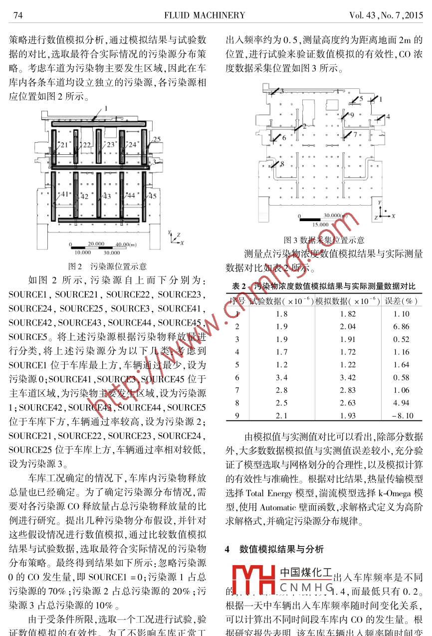 72FLUID MACHINERYVol. 43 ,No. 7 ,2015文章編號: 1005 -0329(2015)07 -0072 -05地下空間通風(fēng)系統(tǒng)的優(yōu)化高超,陳梅珊,吳偉亮(_ 上海交通大學(xué),上海200240)摘要:由于車輛出人車庫的頻率時刻都在變化,車庫內(nèi)單位時間污染物釋放量相應(yīng)發(fā)生變化,針對不同工況采取相同的通風(fēng)量顯然是不合理的。過低的通風(fēng)量將導(dǎo)致車庫內(nèi)空氣品質(zhì)不佳,過高的通風(fēng)量將導(dǎo)致能源的浪費。本文以某車庫為研究對象,進行數(shù)值模擬分析,探索通風(fēng)系統(tǒng)的優(yōu)化控制策略。關(guān)鍵詞:空氣污染;CFD模擬;C0濃度場;地下空間;中圖分類號: TH43;X511文獻標志碼: Adoi:10. 3969/j. issn. 1005 -0329.2015.07.015Optimization of Air Flow Field in the Underground GarageGAO Chao , CHEN Mei- shan , WU WeiHiang( Shanghai Jiaotong University ,Shanghai 200240 ,China)Abstract: Because the frequency that cars enter the garage is changing,so it is unreasonable that applying the same ventilationquantity to different situations. Low ventilation quantity will cause bad air quality , however high ventilation quantity will causewaste of energy. Based on a real underground garage , discussing the optimization of flow field by simulation.Key words: air pollution; underground garage ;CO concentration field; CFD simulation1前言據(jù)研究表明:如果CO濃度指標達到要求,那么其他污染物濃度也一定會滿足要求[3.41。所以在地為解決汽車保有量上升帶來的停車緊張問下停車庫通風(fēng)量的計算與控制中,通常以C0濃題,大型商業(yè)建筑和居住小區(qū)等人口密集區(qū)都配度 為依據(jù),因此本文將主要考察尾氣中的CO。有地下車庫,-般采用定風(fēng)量運行的機械通風(fēng)系根據(jù)相關(guān)文獻[5],由于本車庫位于人口密統(tǒng)來保證空氣品質(zhì)。由于汽車出人車庫的數(shù)量是集區(qū),需要考慮機械通風(fēng)系統(tǒng)排出的污染物對周時刻變化的,車庫內(nèi)單位時間污染物發(fā)生量也是圍環(huán)境的影響,本文CO污染物限值取為25x不斷變化的,定風(fēng)量運行的機械通風(fēng)系統(tǒng)將造成10-°。 地下車庫污染源物放量的計算采用經(jīng)驗公能源的浪費11。式法:本文針對某地下車庫,利用數(shù)值模擬的方法G = mrqt對不同時段地下車庫的污染物濃度場進行研究,式中G一地下空間CO總排放量,mg/s從而為通風(fēng)系統(tǒng)的優(yōu)化控制提供參考意見。m-地下停車場的車位數(shù),輛r- - 汽車出人車庫頻率(1h內(nèi)進出車輛2研究對象描述數(shù)與停車位之比)中國煤化工付間內(nèi)C0排放量,mg/s2.1污染物濃度限值和釋放量的確定1HCN MH G車場平均運行時間,s地下車庫內(nèi)汽車排放的污染物中主要含有一結(jié)合本文研究對象,停車庫容納車位數(shù)為氧化碳、碳氫化合物、氮氧化合物等有害物質(zhì)(21。100 ;地下車庫內(nèi)空氣污染物的排放情況是在不同收稿日期: 2014-12-23 修稿日期: 2015-01 -09基金項目: 863 基金項目(2012AA062703)2015年第43卷第7期流體機械73的時段內(nèi)不斷變化的,汽車出入車庫頻率峰值為換 ,圍護結(jié)構(gòu)絕熱;1.4,平時為0.261 ;假定每輛車在車庫內(nèi)平均運(4)室內(nèi)除汽車排放的廢氣外,無其它熱源。行時間為90s;每輛汽車單位時間內(nèi)CO排放量為由于汽車在車庫內(nèi)的運行主要出于怠速狀態(tài),根200mg/s!",據(jù)相關(guān)文獻[8],尾氣溫度定義為400K;2.2物理模型(5)送排風(fēng)口進出氣流恒定;某地下車庫長為90m,寬為80m,建筑面積(6)車庫送風(fēng)中的有害物濃度為大氣污染濃7200m2 ,層高3. 6m,車庫平面如圖1所示。1個度限值, 取3.0mg/m'。新風(fēng)管道位于遠離進出口的上部,4個排風(fēng)管道為簡化問題,進行濃度場模擬計算時,忽略汽位于圖1中部和下部,大致呈左右對稱布置。車停放的隨機性,將CO視為面污染源釋放,認為污染物發(fā)生率恒定。2.4流體動 力學(xué)控制方程在計算中,車庫內(nèi)氣體流動假設(shè)為定常、粘性不可壓縮流動。需要研究空氣流動的速度場、溫度場、污染物濃度場情況,其流動過程要受物理守恒定律的支配,即:質(zhì)量守恒定律、動量守恒定律能量守恒定律、組分質(zhì)量守恒定律。為了便于對各控制方程進行分析,建立各基本控制方程的圖1 車庫平面示意該地下停車場采用風(fēng)管式機械通風(fēng)系統(tǒng),風(fēng)通用形式(9-15]:機型號為HTF-1No. 10,額定風(fēng)量為45679m'/h。a( p中)+div (ρUφ) =div(Tgdφ) +S9τ送風(fēng)機1臺,排風(fēng)機4臺,即地下車庫的送風(fēng)量為式中φ_ 通用變量, 可以代表u、v、w、T等求45679m’/h,排風(fēng)量為182716 m'/h。解變量送風(fēng)管道位于平面圖上方,有送風(fēng)口8個;4T- -廣義擴散系數(shù).個排風(fēng)管道,其中位于平面圖中間位置的兩個排S--廣義源項風(fēng)管道各有風(fēng)口10個,位于平面圖底部、近車庫式中各項依次為瞬態(tài)項、對流項、擴散項和源出入口的2個排風(fēng)管道各有風(fēng)口12個。送風(fēng)口項。對于特定的方程,φ T和S具有特定的形式,尺寸為800mmx320mm,排風(fēng)口尺寸為630mmx表1中給出了3個符號與各特定方程的對應(yīng)的250mm ,送、排風(fēng)風(fēng)口位置距地面約3m。關(guān)系。車庫新風(fēng)管道的8個送風(fēng)口風(fēng)速分別為表1針對不同方 程各符號對應(yīng)表達式6. 2m/s,中部的排風(fēng)管道的20個排風(fēng)口風(fēng)速為φ8. 1m/s,車庫進出口附近的