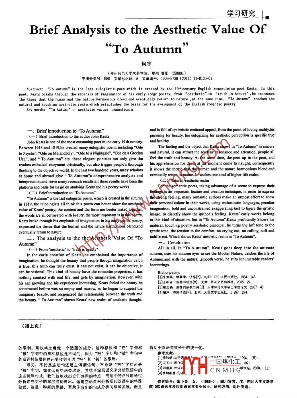 學(xué)習(xí)研究Brief Analysis to the Aesthetic Value Of“To Autumn'”何宇(貴州師范大學(xué)求是學(xué)院,貴州貴陽(yáng)50001)中圖分類號(hào): G80文獻(xiàn)標(biāo)識(shí)碼: A文章編號(hào): 1003-2738 (2011) 11-0105-01Abstract: “To Autumn" is the last eulogistic poem which is created by the 19* century English romanticism poet Keats. In thispoet, Keats breaks through the empahsis of imagination of his early stage poetry, from “ aesthetic" to“truth is beauty" ,he expressesthe theme that the human and the nature harmonious blend, and eventually return to nature ,at the same tine, “To Autumn” reaches theatural and touching aesthetic realm, which establishes the basis for the evelopment of the English ronantic poetry.Key words:“To Autumn”; aesthetic value; romanticsim一、Brief introduction to“To Autumn"and is full of optimistic emtional appeal, from the point o(一) Brief introduction to the author John Keatspursuing for beauty, his eulogizing for aesthetic perception is specifc tueJohn Keats is one of the most outstaning poet in the early 19th century.and healthy.Between 1918 and 1819,he created many eulogistic poem, including "OdeThe feeling and the object that Keats shows in“To Autumn" is sincereto Psyche", "Ode on Melancholy", "Ode to a Nightgale", "Ode o a Grecianand natural, it can attract the readers' resonance and attention, people allUrn", and“To Autumn”etc. these elegant petries not only give thefeel the truth and beauty. At the same time, the pent-up in the peot, andreaders ethetial enoyment qtitscll, but also rigger people's thorough his aprehension for deah at the moment come 0o naught, consequentlythinking to the oiectie worid In the last two hundred years, many scholars it shows the theme that the human and the nature harmonious blend,andat home and abroad give“To Autumn"a comprehensive analysis andeventually return to nature. It reaches one kind of higher life realm.interpretation,and leave many rescarch resuls,all these results have beean the(二) Natural Aesthetic realmplatform and basis for us go on studying Keats and his poetry works.For the romantic poets, taking advantage of a scene to express their(二) Brief introduction to“To Autumn”feelinrtant feature and creation tei technique, in order to express"ToAutumn" is the last eulogistic poem, which is created in the autumn the strong fclig, many romantic authbors make an utmost efort to showin 1819, the teleologists all think this poem can better show the aesthetic their personal colour in their works, using enthusiastic languages, peculiarvalue of Keats' poetry, the content and the form are beeter linked together,imagination, bold and unconstrained exaggcrating tact to figure the qrtisticthe words are all oemneated with beauty, the most important is in this petry,image, to directly show the quthor's feeling. Keats' early works belongKeats broke through his emphasis of imagination in his early period poetry,to this kind of situation, but in "To Autumn’,Keats profoundly Shows hisexpressed the theme that the human and tbe nature harmonious blend,andgentle tone, the tension to the comfort, no crying out, no calling, soft andeventually retum to nature.二、The analysis to the the Aesthetic Value Of“Toindiferent. Which sbows Keats' aesthetic realm in“To Autumn".Autumn"三、ConclusionAll in all, in“To A utumn", Keats goes deep into the animateIn the early creation of Keats ,he emphsised the importance ofautumn, uses his autumn eyes to see the Mother Nature, catches the life ofimagination, he thought the beauty that people though imagination catchAutumn,and with the natural ,smooth verse, he stirs inoumerable readers'is true, this truth can truly exist, it can not exist, it can be objctive,it barsring.can be visional. This kind of beauty have the romantic properties, it hasnothing comtact with real life, and gets by inaginatin. However, with[1]朱炯強(qiáng),姚暨榮.濟(jì)慈[MJ. 沈陽(yáng):遼寧人民出版社,1984. 143.his age growing and his expericnce increasing, Keats feeled the beauty he[2]王昕若,濟(jì)慈書信選[H].天津:百花文藝出版社,2005. 27.constructed before was so empty and narrow, so he began to suspect the. 濟(jì)慧的宗教與詩(shī)[D]. 天津師范大學(xué)碩士學(xué)位論文. 2007. 4[4]屬岸.濟(jì)慈詩(shī)選M].北京:人民文學(xué)出版社, 1 997. 274.imaginary beauty, and recgonized tbe relationship between the truth andthe beauty.“To Autumn”shows Keats' new realm of acsthetic thought,(接上頁(yè))的限制。可以將之看做一一個(gè)話題的成分。這種移位和“把"字句和有助于漢語(yǔ)句式分析的統(tǒng)-化。“被”字句中的那種移位是不同的,因?yàn)椤鞍选弊志浜汀氨? 字句中參考文獻(xiàn):的名詞移位后仍然還要收到介詞“把"和“被" 的限制。[1]徐烈炯.與空語(yǔ)有的“將的中國(guó)之1994, (5) .可見, 不論是連動(dòng)句還是主謂謂語(yǔ)句,不論是“把"字句還是[2]宋玉柱.現(xiàn)代中國(guó)煤化工191“被”字句,如果運(yùn)用空語(yǔ)類理論,并結(jié)合深層語(yǔ)義來分析漢語(yǔ)中的[3]劉道英.漢語(yǔ)YHCNMHG學(xué)報(bào).200 (1)[4]喬姆斯基.句法這些特殊句式,我們就能找出它們共同的特點(diǎn),而這個(gè)特點(diǎn)只能通過分析這些句子的深層結(jié)構(gòu)得出。運(yùn)用空語(yǔ)類來分析現(xiàn)代漢語(yǔ)中的特殊作者簡(jiǎn)介:張小會(huì),女,(1988-) ,四川宜賓,漢,四川大學(xué)文新學(xué)句式,這是一種新的思路, 有助于我們的句式分析向縱深發(fā)展,而且院10級(jí)語(yǔ)言學(xué)及應(yīng)用語(yǔ)言學(xué)專業(yè)碩士,研究方向:對(duì)外漢語(yǔ)。|時(shí)代報(bào)告2011年11月下| 105.