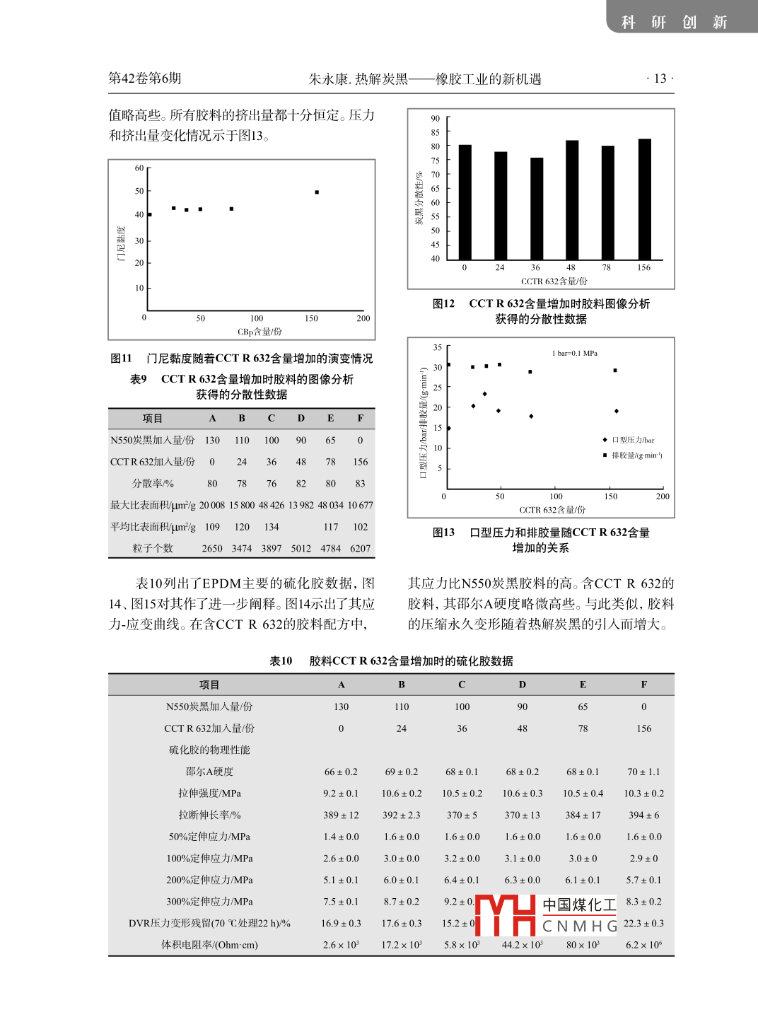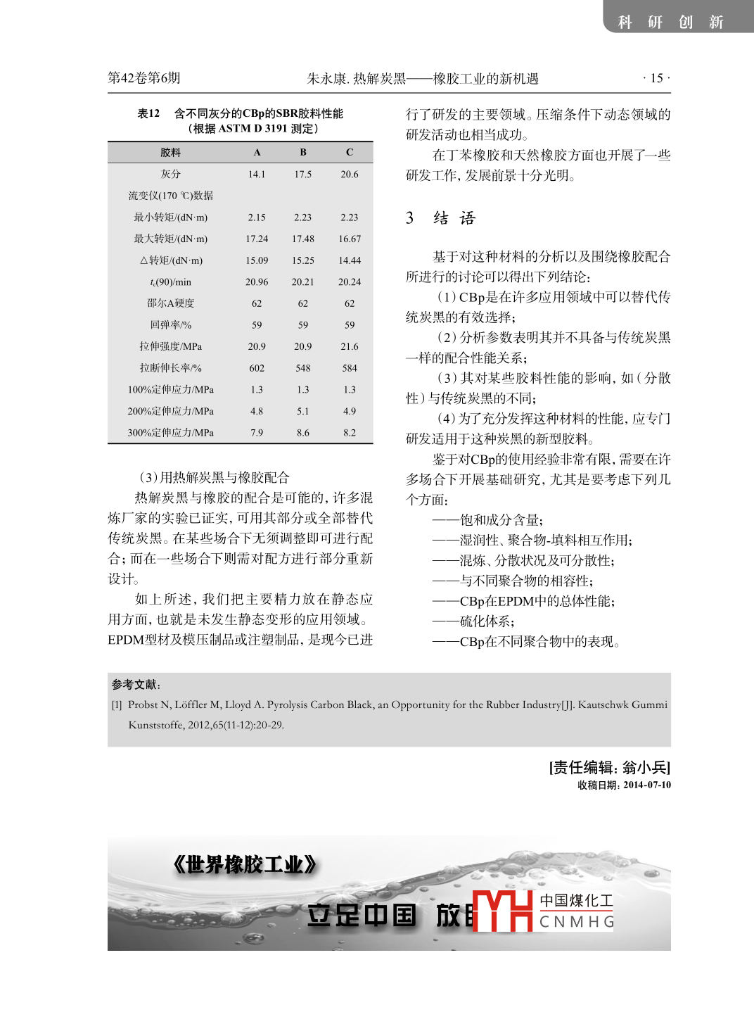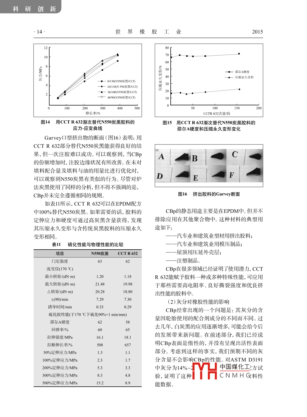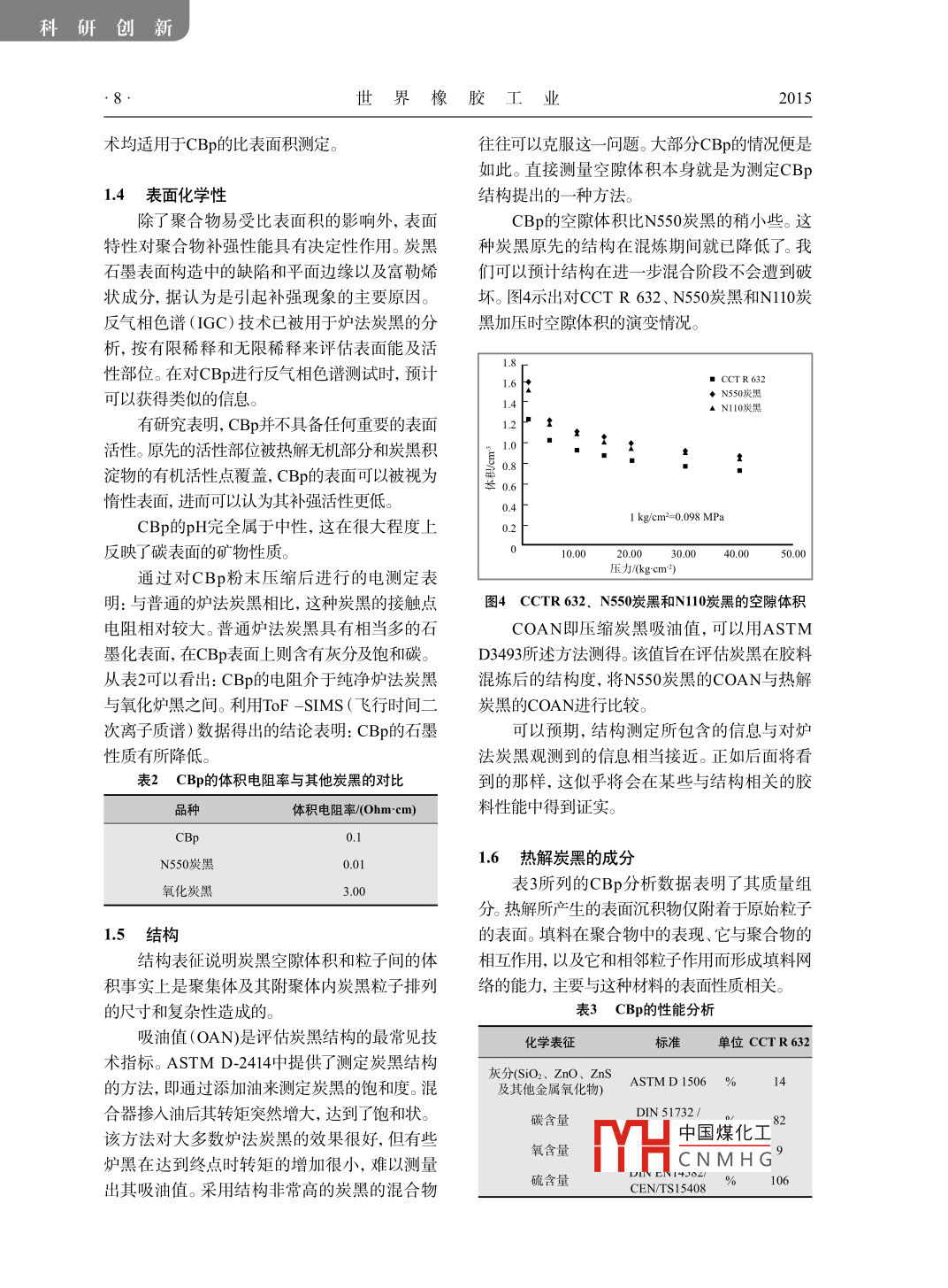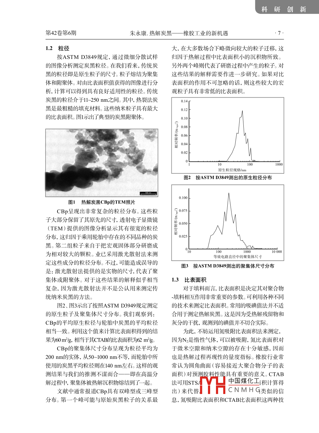 第42卷第6期世界橡膠工業(yè)Vol.42No.6:6~152015年6月World Rubber IndustJun.2015熱解炭黑——橡膠工業(yè)的新機(jī)遇朱永康編譯(中橡集團(tuán)炭黑工業(yè)研究設(shè)計(jì)院,四川自貢643000摘要:熱解炭黑(CBp)最近十年間日益受到重視。通過CBp性能分析綜述,討論對這種材料進(jìn)行各種炭黑性能測試的可行性和意義。此外,還著重討論了CBp在橡膠膠料中的實(shí)際使用情況,橡膠性能與CBp分析參數(shù)間的關(guān)系。最后提出成功利用CBp進(jìn)行配合的訣竅鍵詞:熱解炭黑;比表面積;體積電阻率;橡膠應(yīng)中圖分類號:TQ330.38+1文獻(xiàn)標(biāo)志碼:B文章編號:1671-8232(2015)06-0006-100前言氣相產(chǎn)物大多會冷凝為裂解油,可把該材料與含碳材料分離開來。后者則分別形成粒徑通過烴的不完全燃燒生產(chǎn)炭黑是一項(xiàng)高能32m(CCTR632)和10um(CCTR610)的顆耗的產(chǎn)業(yè)。平均而言,每生產(chǎn)1t炭黑需耗用2t烴粒,并對其進(jìn)行造粒以便于貯存和運(yùn)輸。原料。生產(chǎn)炭黑的同時也產(chǎn)生了二氧化碳。每生產(chǎn)1t炭黑所產(chǎn)生的二氧化碳超過3ta就這點(diǎn)而1熱解炭黑的性能分析言,在全世界排放的8×109t二氧化碳中,有0.4%的量是由炭黑生產(chǎn)所致??紤]到其現(xiàn)有性能與1.1熱解炭黑的形態(tài)學(xué)傳統(tǒng)爐法炭黑的比較,CBp的潛在用量或可達(dá)到CBp必須以跟其他炭黑相同的標(biāo)準(zhǔn)來評10%。在世界范圍內(nèi),以CBp替代10%的爐法炭定,但是所使用的方法必須適合這種新型材料。黑,將對碳減排作出重大貢獻(xiàn)。表列出了CBp最常見的參數(shù)。在全球節(jié)能、碳減排和節(jié)省材料方面,從廢表1CBp的特性舊輪胎回收炭黑是一項(xiàng)重要的活動。CCTR632標(biāo)準(zhǔn)單位數(shù)值和CCTR610牌號的CBp就是通過對廢舊輪胎ASTM D6556 m/進(jìn)行熱解生產(chǎn)的炭黑。該技術(shù)是基于對廢舊輪CTAB比表面積STMD3765mg62胎的高溫分解,由此產(chǎn)生了兩大類產(chǎn)物:其中空隙體積ASTM D6086 9a cm 7g 0.70類為氣相產(chǎn)物,由聚合物的解聚合所收集;另一吸油值OANASTM D2414 ml/100 g 106類為固相產(chǎn)物,包括金屬鋼絲,以及由炭黑、灰分和碳質(zhì)殘?jiān)M成的含碳材料。壓縮吸油值(COTYH史忙編譯者簡介:朱永康(1959—),男,四川省自貢市人,高級工程師,主要從事炭黑技術(shù)信息調(diào)硏和期刊編輯工作??蒲袆?chuàng)新第42卷第6期朱永康.熱解炭黑——橡膠工業(yè)的新機(jī)遇1.2粒徑大,在大多數(shù)場合下略微向較大的粒子遷移,這按 ASTM D3849規(guī)定,通過微細(xì)分散試樣歸因于熱解過程中比表面積小的沉積物所致的圖像分析測定炭黑粒徑。在我們看來,傳統(tǒng)炭另外兩個峰則代表了研磨過程中產(chǎn)生的粒子。對黑的粒徑即是原生粒子的尺寸。粒子熔結(jié)為聚集這些結(jié)果的解釋需要作進(jìn)一步研究。如果對比體和附聚體。對由比表面積值獲得的圖像進(jìn)行分表面積的作用不可忽略的話,則這些較大的宏析,計(jì)算可以得到具有良好適用性的粒徑。傳統(tǒng)觀粒子具有非常低的比表面積。炭黑的粒徑介于11-250mm之間。其中,熱裂法炭黑是最粗糙的填充材料。這些納米粒子具有最大0.1的比表面積。圖1示出了典型的炭黑附聚體。圖2按 ASTM D3849測出的原生粒徑分布圖1熱解炭黑CBp的TEM照片CBp呈現(xiàn)出非常復(fù)雜的粒徑分布。這些粒30.075子大部分保留了其原先的尺寸,透射電子顯微鏡0.050(TEM)提供的圖像分析顯示其有很寬的粒徑分布,這歸因于乘用輪胎中存在的不同品種的炭0.025黑。第二組粒子來自于把宏觀固體部分硏磨成為相對較大的顆粒。業(yè)已采用激光散射法來測等效電路直徑中的聚集體尺寸定這些成分的粒徑分布。不過,可能造成誤導(dǎo)的圖3按 ASTM D3849測出的聚集體尺寸分布是:激光散射法提供的是實(shí)物的尺寸,代表了聚集體或附聚體。對于這些結(jié)果的解釋似乎相當(dāng)1.3比表面積復(fù)雜,因?yàn)榧す馍⑸浞ú⒉皇枪J(rèn)用來測定傳對于填料而言,比表面積是決定其對聚合物統(tǒng)納米炭黑的方法。填料相互作用非常重要的參數(shù)。可利用各種不同圖2、圖3示出了按照 ASTM D3949規(guī)定測定的技術(shù)來測定比表面積。常用的吸碘值法并不適的原生粒子及聚集體尺寸分布。我們觀察到:合用于測定熱解炭黑。這是因?yàn)槭軣峤鈿埩粑锖虲Bp的平均原生粒徑與輪胎中炭黑的平均粒徑灰分的干擾,觀測到的碘值并不切合實(shí)際。相當(dāng)一致。利用這個值來計(jì)算比表面積得到的結(jié)為此,不妨運(yùn)用氮吸附比表面積法來測定果為60m2g,相當(dāng)于其CTAB的比表面積為2mg因?yàn)镹是惰性氣體,可以被吸附,氮比表面積對CBp的聚集體尺寸分布呈現(xiàn)為粒徑平均為于微米空隙和納米空隙的存在十分敏感,因而200nm的實(shí)體,從50~1000nm不等,而輪胎中所也是熱解過程再現(xiàn)性的量度指標(biāo)。橡膠行業(yè)常使用的炭黑平均粒徑則在140nm左右。這樣的觀常認(rèn)為圓角曲面(容易接近大聚合物分子的表測結(jié)果與我們的推測不謀而合—即在高溫分面積)對預(yù)測膠料性能具有重要的意義。CTAB解過程中,聚集體被熱解沉積物熔結(jié)到了一起。法可用STS中國煤化工積計(jì)算得文獻(xiàn)中通常報(bào)道CBp具有雙峰型或三峰型出)來代替CNMHG類似的信分布。第一個峰可能與原