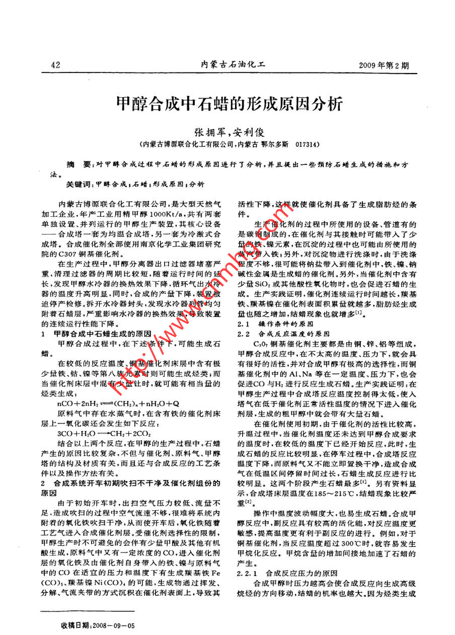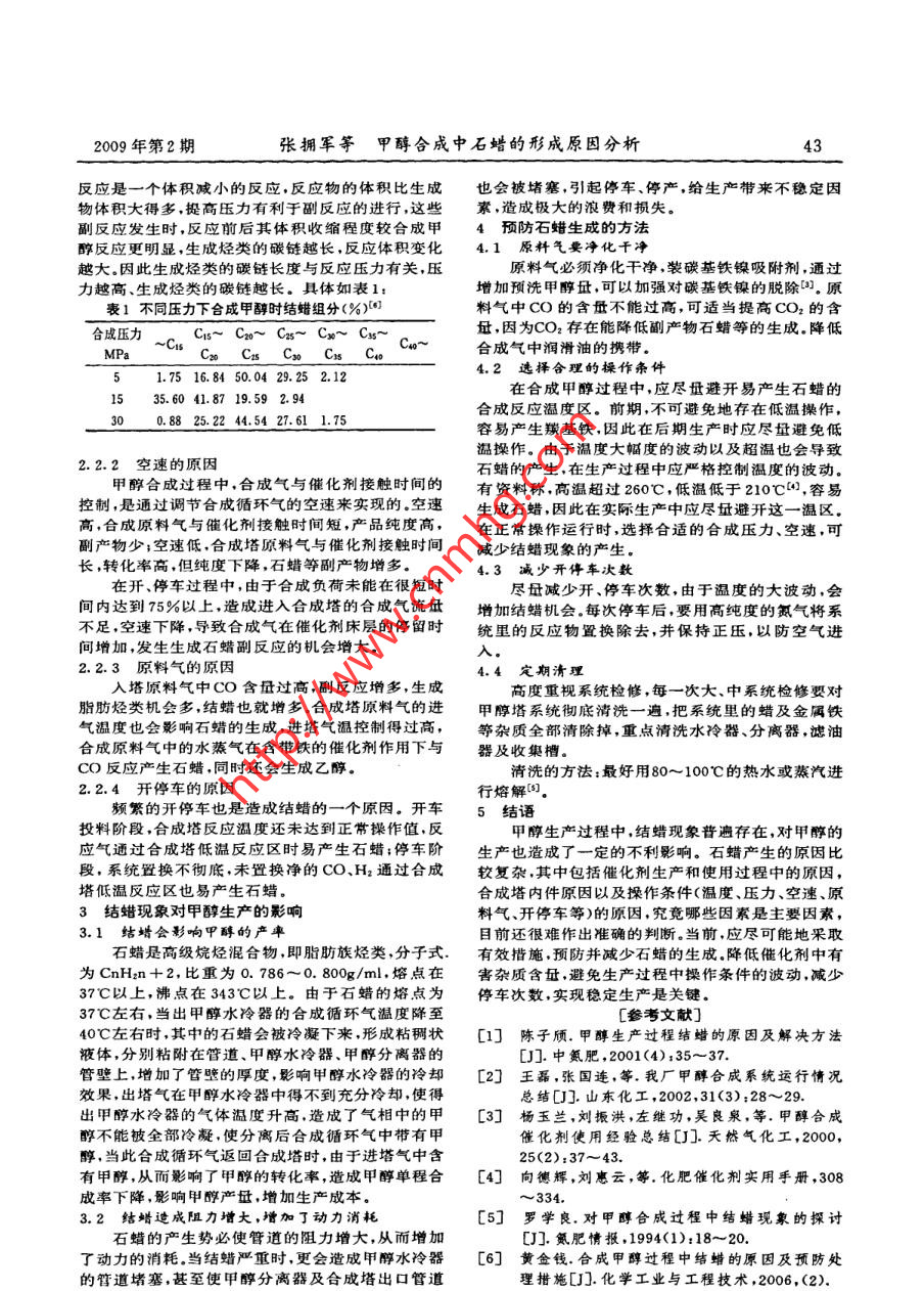 甲醇合成中石蠟的形成原因分析