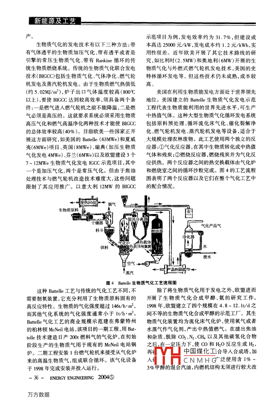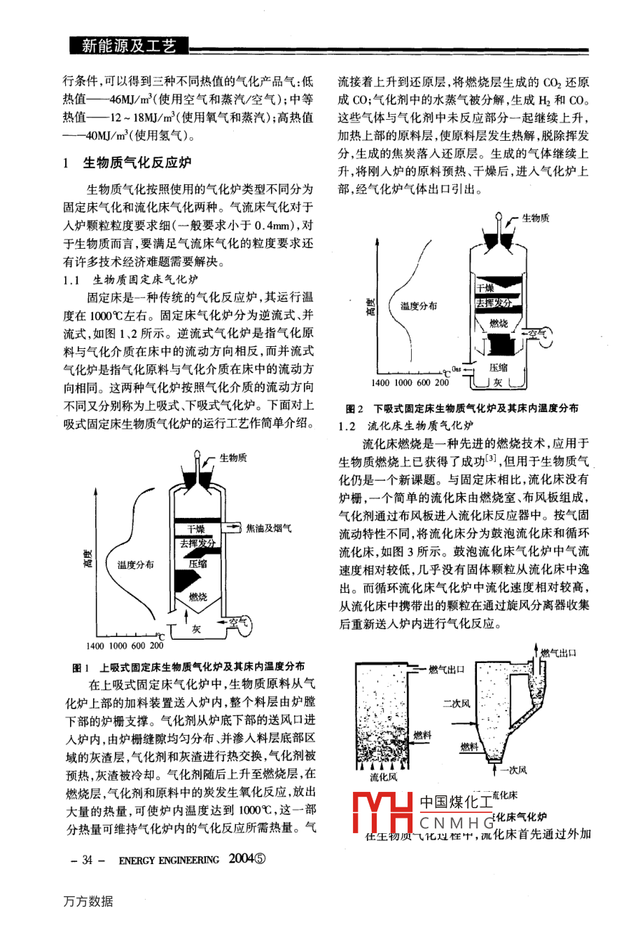 慚能源及工藝生物質(zhì)氣化技術(shù)比較及其氣化發(fā)電技術(shù)研究進(jìn)展米鐵,唐汝江,陳漢平,劉德昌,吳創(chuàng)之2,常杰(1.華中科技大學(xué)煤燃燒國家重點實驗室,湖北武漢430074:2.中國科學(xué)院廣州能源研究所,廣東廣州510640)摘要:生物質(zhì)能是一種理想的可再生能源,由于其在燃燒過程中二氧化碳凈排放量近似于零,可有效地減少溫室效應(yīng),因而越來越受到世界各國的關(guān)注。首先對生物質(zhì)能的概念及其轉(zhuǎn)化方式進(jìn)行了簡單介紹,著重介紹了生物質(zhì)氣化技術(shù)在國內(nèi)外的研究及應(yīng)用發(fā)展現(xiàn)狀,通過對固定床氣化爐和流化床氣化爐的技術(shù)性能的對比提出了研究開發(fā)經(jīng)濟(jì)上可行、效率較高的生物質(zhì)發(fā)電系統(tǒng),是我國今后有效利用生物質(zhì)能的發(fā)展方向。關(guān)鍵詞:生物質(zhì);氣化;固定床;流化床中圖分類號:TK6文獻(xiàn)標(biāo)識碼:A文章編號:1004-3950(2004)05-0033-05Comparison with biomass gasification technology and development ofgasification power generation technologyMI Tie, TANG Ru-jiang, CHEN Han-ping, LIU De-chang, WU Chuang-zhi, CHANG Ji(1. Coal Combustion National Key Lab, Huazhong University of science technology, Wuhan 430074, China;2. Guangzhou Institute of Energy Conversion, Chinese Academy of Sciences, Guangzhou 510640, China)Abstract: Biomass energy is an ideal renewable energy source. More and more countries pay attention on it because its COdischarge colse zero, it can effectively reduce greenhouse effect. This article briefly introduces the conception and transformmode of biomass energy; emphasis introduces the technology at home and abroad and its state of the art. Through the contrastthe eco-ely utilizaKey words: biomass; gasification; fixed bed; fluidized be的轉(zhuǎn)化。生物質(zhì)氣化生成的高品位的燃料氣既可0前言供生產(chǎn)、生活直接燃用,也可通過內(nèi)燃機(jī)或燃?xì)廨喩镔|(zhì)是一種可再生能源,具有以下特點:①機(jī)發(fā)電,進(jìn)行熱電聯(lián)產(chǎn)聯(lián)供。生物質(zhì)氣化反應(yīng)溫可再生性;②低污染性;③廣泛的分布性。利用生度低,可避免生物質(zhì)燃料燃燒過程中發(fā)生灰的結(jié)物質(zhì)作為替代能源,對改善大氣酸雨環(huán)境減少大渣、團(tuán)聚等運(yùn)行難題。氣中二氧化碳含量,從而減少“溫室效應(yīng)”都有著從不同的角度對生物質(zhì)氣化技術(shù)進(jìn)行分積極的意義。類2。根據(jù)燃?xì)馍a(chǎn)機(jī)理可分為熱解氣化和反應(yīng)20世紀(jì)70年代, ghaly et al,首次提出了將性氣化,其中后者又可根據(jù)反應(yīng)氣氛的不同細(xì)分氣化技術(shù)用于生物質(zhì)這種含能密度低的燃料,使為空氣氣化水蒸氣氣化氧氣氣化、氫氣氣化;根氣化技術(shù)成為生物質(zhì)轉(zhuǎn)化過程最新的技術(shù)之一。據(jù)采用的氣化反應(yīng)爐的不同又可分為固定床氣生物質(zhì)原料揮發(fā)分高達(dá)70%以上,生物質(zhì)受熱化、流化床氣化和氣流床氣化。另外,還可以根據(jù)后,在相對較低的溫度下就可使大量的揮發(fā)分物氣化反應(yīng)壓力的不同來對氣化技術(shù)進(jìn)行分類。在質(zhì)析出。因此,氣化技術(shù)非常適用于生物質(zhì)原料氣化過程中使用不同的氣化劑、采取不同過程運(yùn)收稿日期:2004-06-05基金項目:國家高新技術(shù)發(fā)展研究“863項目基金資助(2001-AA-51-40作者簡介:米鐵(1969-),男,博士,江漢大學(xué)化學(xué)與環(huán)境工程學(xué)院講師,H中國煤化工CNMHG教學(xué)與科研?,F(xiàn)在華中科技大學(xué)煤燃燒國家重點實驗室從事博土后研究工作2004⑤能源工程-33新能源及工藝行條件,可以得到三種不同熱值的氣化產(chǎn)品氣:低流接著上升到還原層,將燃燒層生成的CO2還原熱值—46M/m3(使用空氣和蒸汽/空氣);中等成CO;氣化劑中的水蒸氣被分解,生成H和CO熱值—12-18MJ/m3(使用氧氣和蒸汽);高熱值這些氣體與氣化劑中未反應(yīng)部分一起繼續(xù)上升-40M/m3(使用氫氣)。加熱上部的原料層,使原料層發(fā)生熱解,脫除揮發(fā)1生物質(zhì)氣化反應(yīng)爐分,生成的焦炭落入還原層。生成的氣體繼續(xù)上升,將剛?cè)霠t的原料預(yù)熱、干燥后,進(jìn)入氣化爐上生物質(zhì)氣化按照使用的氣化爐類型不同分為部,經(jīng)氣化爐氣體出口引出。固定床氣化和流化床氣化兩種。氣流床氣化對于人爐顆粒粒度要求細(xì)(一般要求小于0.4mm),對生物質(zhì)于生物質(zhì)而言,要滿足氣流床氣化的粒度要求還有許多技術(shù)經(jīng)濟(jì)難題需要解決。1.1生物質(zhì)固定床氣化爐固定床是一種傳統(tǒng)的氣化反應(yīng)爐,其運(yùn)行溫溫度分布居揮發(fā)分度在1000℃左右。固定床氣化爐分為逆流式、并流式,如圖1、2所示。逆流式氣化爐是指氣化原料與氣化介質(zhì)在床中的流動方向相反,而并流式氣化爐是指氣化原料與氣化介質(zhì)在床中的流動方向相同。這兩種氣化爐按照氣化介質(zhì)的流動方向14001000600200灰不同又分別稱為上吸式、下吸式氣化爐。下面對上圖2下吸式固定床生物質(zhì)氣化爐及其床內(nèi)溫度分布吸式固定床生物質(zhì)氣化爐的運(yùn)行工藝作簡單介紹。1.2流化床生物質(zhì)氣化爐流化床燃燒是一種先進(jìn)的燃燒技術(shù),應(yīng)用于生物質(zhì)生物質(zhì)燃燒上已獲得了成功3,但用于生物質(zhì)氣化仍是一個新課題