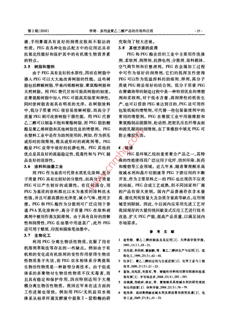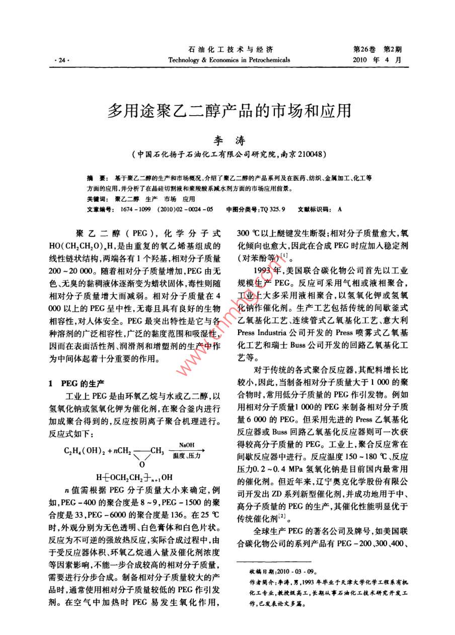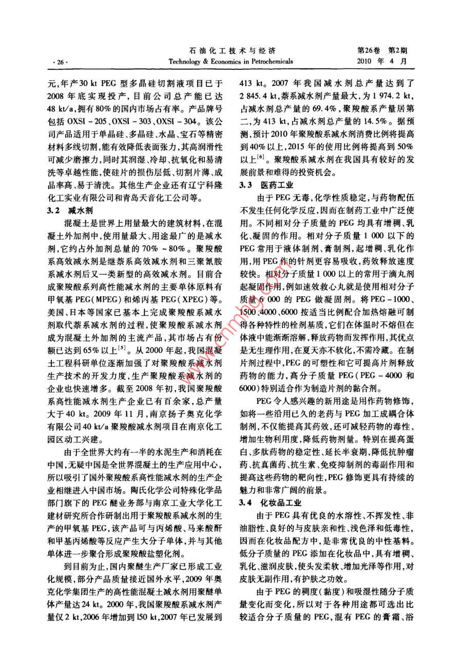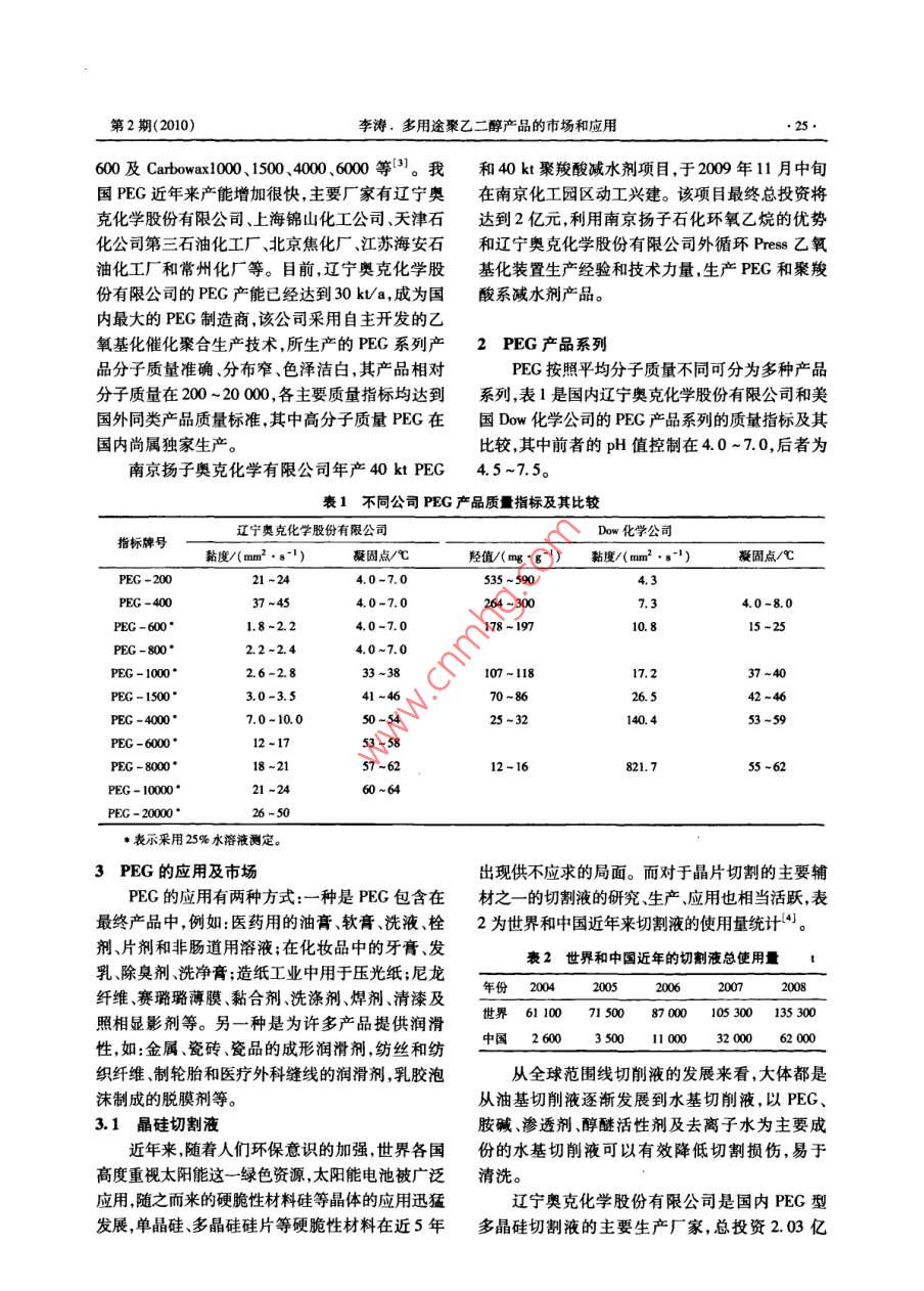 石油化工技術與經(jīng)濟第26卷第2期Technology& Economics in Petrochemicals2010年4月多用途聚乙二醇產(chǎn)品的市場和應用李濤(中國石化揚子石油化工有限公司研究院,南京210048)摘要:基于聚乙二醇的生產(chǎn)和市場概況,介紹了聚乙二醇的產(chǎn)品系列及在醫(yī)藥紡織、金屬加工、化工等方面的應用,并分析了在晶硅切割液和案羧酸系減水劑方面的市場應用前景關鍵詞:聚乙二醇生產(chǎn)市場應用文章編號:1674-1099(2010)02-0024-05中圖分類號:TQ3259文獻標識碼:A聚乙二醇(PEG),化學分子式300℃以上醚鍵發(fā)生斷裂;相對分子質量愈大,氧HO(CH2CH2O)H,是由重復的氧乙烯基組成的化傾向也愈大,因此在合成PEG時應加入穩(wěn)定劑線性鏈狀結構兩端各有1個羥基,相對分子質量(對苯酚等)田。200~20000。隨著相對分子質量增加,PEG由無1993年,美國聯(lián)合碳化物公司首先以工業(yè)色、無臭的黏稠液體逐漸變?yōu)橄灎罟腆w,毒性則隨規(guī)模生產(chǎn)PEC。反應可采用氣相或液相聚合,相對分子質量增大而減弱。相對分子質量在4工業(yè)上大多采用液相聚合,以氫氧化鉀或氫氧000以上的PEG呈中性,無毒且具有良好的生物化鈉作催化劑。生產(chǎn)工藝包括傳統(tǒng)的間歇釜式相容性,對人體安全。PEG最突出特性是它與各乙氧基化工藝、連續(xù)管式乙氧基化工藝、意大利種溶劑的廣泛相容性,廣泛的黏度范圍和吸濕性, Press Industria公司開發(fā)的Pess噴霧式乙氧基因而在表面活性劑潤滑劑和增塑劑的生產(chǎn)中作化工藝和瑞士Bus公司開發(fā)的回路乙氧基化工為中間體起著十分重要的作用。藝等。對于傳統(tǒng)的各式聚合反應器,其配料增長比1PEG的生產(chǎn)較小,因此,當制備相對分子質量大于1000的聚工業(yè)上PEG是由環(huán)氧乙烷與水或乙二醇以合物時,常用低分子質量的PEG作引發(fā)物。例如氫氧化鈉或氫氧化鉀為催化劑,在聚合釜內進行用相對分子質量100的PEG來制備相對分子質加成聚合得到的,反應按陰離子聚合機理進行。量6000的PEG。但采用先進的Prs乙氧基化反應式如下:反應器或Buss回路乙氧基化反應器則可一次獲NaOH得較高分子質量的PEG。工業(yè)上,聚合反應常在C2H.(OH)2+nCH2-CH溫度、壓力間歇反應器中進行。反應溫度150~180℃、反應壓力0.2~04MPa氫氧化鈉是目前國內最常用H-tOCH, CH2+.OH的催化劑。但近年來,遼寧奧克化學股份有限公n值需根據(jù)PG分子質量大小來確定,例司開發(fā)出ZD系列新型催化劑并成功地用于中、如,PECG-40的聚合度是8-9,PEG-1500的聚高分子質量的PEG的生產(chǎn),其催化性能明顯優(yōu)于合度是3PECG-6000.合度是136。在25℃?zhèn)鹘y(tǒng)催化劑2)。時,外觀分別為無色透明、白色膏體和白色片狀。全球生產(chǎn)PEG的著名公司及牌號,如美國聯(lián)反應為不可逆的強放熱反應,實際合成過程中,由合碳化物公司的系列產(chǎn)品有PEC-2000040于受反應器體積、環(huán)氧乙烷通入量及催化劑濃度等因素影響,不能一步合成較高的相對分子質量,需要進行分步合成。制備相對分子質量較大的產(chǎn)收稿日期:2010-0309。品時,通常使用相對分子質量較低的PEG作引發(fā)作者簡介:李濤,男,1993年畢業(yè)于天津大學化學工程系有機化工專業(yè),教授級高工,長期從事石油化工技術研究開發(fā)工劑。在空氣中加熱時PEG易發(fā)生氧化作用,作,已發(fā)表論文多篇。第2期(2010)李濤.多用途聚乙二醇產(chǎn)品的市場和應用00及 Carbowax100、1500、4006000等。我和40kt聚羧酸減水劑項目,于200年11月中旬國PEG近年來產(chǎn)能增加很快,主要廠家有遼寧奧在南京化工園區(qū)動工興建。該項目最終總投資將克化學股份有限公司、上海錦山化工公司、天津石達到2億元,利用南京揚子石化環(huán)氧乙烷的優(yōu)勢化公司第三石油化工廠、北京焦化廠、江蘇海安石和遼寧奧克化學股份有限公司外循環(huán)Pes乙氧油化工廠和常州化廠等。目前,遼寧奧克化學股基化裝置生產(chǎn)經(jīng)驗和技術力量,生產(chǎn)PEG和聚羧份有限公司的PEG產(chǎn)能已經(jīng)達到30k/a,成為國酸系減水劑產(chǎn)品。內最大的PEG制造商,該公司采用自主開發(fā)的乙氧基化催化聚合生產(chǎn)技術,所生產(chǎn)的PEG系列產(chǎn)2PEG產(chǎn)品系列品分子質量準確、分布窄、色澤潔白,其產(chǎn)品相對PEG按照平均分子質量不同可分為多種產(chǎn)品分子質量在200~2000各主要質量指標均達到系列,表1是國內遼寧奧克化學股份有限公司和美國外同類產(chǎn)品質量標準,其中高分子質量PEG在國Dow化學公司的PEG產(chǎn)品系列的質量指標及其國內尚屬獨家生產(chǎn)。比較,其中前者的pH值控制在4.0~7.0,后者為南京揚子奧克化學有限公司年產(chǎn)40 kt PEG4.5~7.5。表1不同公司PEG產(chǎn)品質量指標及其比較遼寧奧克化學股份有限公司Dow化學公司指標牌號黏度/(m2…·")凝固點/℃羥值(m·g)黏度/(mm2·)凝固點4.0-7.0535~590PEG -40037-454.0=7.0264-3008-2.24.0-7.02.2-2.44.0~7.0PEG-10002.6-2.8107-1181723.0-3.526.57.0-10.0140.4PEG -80PEG-10000~64表示采用25%水溶液測定3PEG的應用及市場出現(xiàn)供不應求的局面。而對于晶片切割的主要輔PEC的應用有兩種方式:一種是PEG包含在材之一的切割液的研究、生產(chǎn)應用也相當活躍,表最終產(chǎn)品中例如:醫(yī)藥用的油膏軟膏、洗液、栓2為世界和中國近年來切割液的使用量統(tǒng)計。劑、片劑和非腸道用溶液;在化妝品