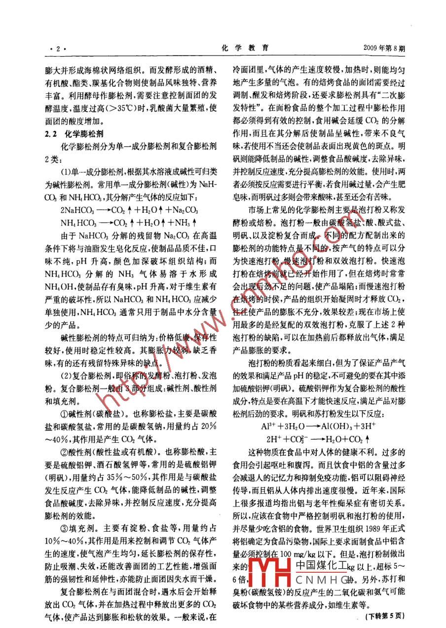 2009年第8期化學(xué)教育生活中的食品添加劑之膨松劑簡(jiǎn)介化孫玉婷林丹(華中師范大學(xué)化學(xué)教育研究所湖北武漢 430079)學(xué)摘要膨松劑是常見(jiàn)的食品添加劑之一,一般分為生物膨松劑和化學(xué)膨松劑,不同膨松劑的.使用原理是一致的。常用的的膨松劑是含鋁的泡打粉,而飲食中鋁的含量過(guò)多會(huì)減退人的記憶力和抑制免疫功能,所以無(wú)鋁膨松劑將是膨松劑新的發(fā)展趨勢(shì)。關(guān)鍵詞膨松劑 食品添加劑碳酸氫鈉明礬《普通高中化學(xué)課程標(biāo)準(zhǔn)(實(shí)驗(yàn))》中選修課程“化加堿來(lái)中和。而在堿性條件下維生素則極易被破學(xué)與生活”的內(nèi)容標(biāo)準(zhǔn)明確指出“知道常見(jiàn)的食品添壞。目前市場(chǎng)上有很多種自發(fā)面粉或是發(fā)酵粉,如加劑的組成、性質(zhì)和作用”心。而膨松劑是常見(jiàn)的食果用“自發(fā)面粉”或“發(fā)酵粉”來(lái)發(fā)面,當(dāng)然會(huì)更加便品添加劑之- -,廣泛地應(yīng)用到人們的日常飲食當(dāng)中。捷 ,但營(yíng)養(yǎng)就損失多了。因?yàn)槠渲懈緵](méi)有酵母菌,所以讓學(xué)生了解更多膨松劑的知識(shí)是有必要的。而是小蘇打等幾種產(chǎn)氣化學(xué)物質(zhì),它們不僅不能提1膨松劑的使用 原理高營(yíng)養(yǎng)價(jià)值,反而會(huì)把面粉中的B族維生素破壞.膨松劑是在以小麥粉為主的焙烤食品中添加,掉。因此對(duì)于這一一點(diǎn)要特別注意。在選擇發(fā)酵面食并在加工過(guò)程中受熱分解產(chǎn)生氣體,使面胚起發(fā),形成品時(shí),也最好不要選擇用“自發(fā)面粉”或“發(fā)酵粉”成致密多孔組織,從而使制品具有膨松、柔軟或酥脆做的,而要盡量選用酵母發(fā)酵而成的。的- -類物質(zhì)凹。2.1.2酵母發(fā)酵膨松劑也稱膨脹劑、疏松劑或發(fā)粉。它不僅可酵母是面制品中一種十分重要的膨松劑。它不提高食品的感官質(zhì)量,而且也有利于食品的消化吸僅能使制品體積膨大,組織呈海棉狀,而且能提高面收,這在今天大力發(fā)展方便食品并強(qiáng)調(diào)其營(yíng)養(yǎng)作用制品的營(yíng)養(yǎng)價(jià)值和風(fēng)味。時(shí)具有一一定的重要性。過(guò)去食品中大量使用壓榨酵母、鮮酵母,由于其不同的膨松劑在原理上是一致的,即都是通過(guò)不易久存,制作時(shí)間長(zhǎng),現(xiàn)在已被由壓榨酵母經(jīng)低溫發(fā)酵劑在面團(tuán)中產(chǎn)生大量二氧化碳?xì)怏w,在蒸煮過(guò)干燥而成的活性千酵母替代?;钚郧Ы湍甘褂脮r(shí)應(yīng)程中,二氧化碳受熱膨脹,于是面團(tuán)就變得松軟,形先用30C左右溫水溶解并放置10 min左右,使酵成疏松的結(jié)構(gòu)。膨松劑不僅能使食品產(chǎn)生松軟的海母菌活化。棉狀多孔組織,使之體積膨大、口感柔松可口;而且酵母是利用面團(tuán)中的單糖作為其營(yíng)養(yǎng)物質(zhì)。它能使咀嚼時(shí)唾液很快滲人制品的組織中,以溶出制有2個(gè)來(lái)源:一是在配料中加入蔗糖經(jīng)轉(zhuǎn)化酶水解品內(nèi)可溶性物質(zhì),刺激味覺(jué)神經(jīng),使之迅速反應(yīng)該食成轉(zhuǎn)化糖;二是淀粉經(jīng)- - 系列水解最后成為葡萄糖。品的風(fēng)味;食品進(jìn)入胃之后,各種消化酶能快速進(jìn)入其生成過(guò)程為:食品組織中,使食品容易、快速地被消化、吸收,避免2(C%HoO3)n +2nH2O-β淀粉酶營(yíng)養(yǎng)損失0]。nCi2Hz2Ou(麥芽糖)2膨松劑分類膨松劑可以分為生物膨松劑和化學(xué)膨松劑。C1pHn2O1+HO-麥芽糖酶2C&H2O<(葡萄糖)廉精轉(zhuǎn)化酶2.1生 物膨松劑Cr H2On(蔗糖) +H2O生物膨松劑是依靠能產(chǎn)生CO2氣體的微生物CH2O%(葡萄糖)+C;H2O<(果糖)發(fā)酵而產(chǎn)生起發(fā)作用的膨松劑。有氧呼吸SH20+2822 kJ2.1.1 老面發(fā)酵中國(guó)煤化工老面(又稱老肥、面肥、老酵頭等)發(fā)酵是- -種比CN M H G2CO2+100kJ較原始的發(fā)酵方法,它是靠來(lái)自空氣中的野生酵母酵母菌利用這些糖類及其他營(yíng)養(yǎng)物質(zhì),先后進(jìn)行和各種雜菌(主要是乳酸菌等)的發(fā)酵作用,由于產(chǎn)有氧呼吸與無(wú)氧呼吸,產(chǎn)生COh、醇.醛和一些有機(jī)酸。酸細(xì)菌較多,會(huì)使面團(tuán)產(chǎn)生不良的酸味,面發(fā)后必須生成的CO2被面團(tuán)中的面筋包圍,使制品體積●2●化學(xué)教育2009年第8期膨大并形成海棉狀網(wǎng)絡(luò)組織。而發(fā)酵形成的酒精、冷面團(tuán)里,氣體的產(chǎn)生速度較慢,加熱時(shí),則能均勻有機(jī)酸、酯類、羰基化合物則使制品風(fēng)味獨(dú)特、營(yíng)養(yǎng)地產(chǎn)生多量的氣泡。有的焙烤食品的面團(tuán)需要經(jīng)過(guò)豐富。利用酵母作膨松劑,需要注意控制面團(tuán)的發(fā)調(diào)制、醒發(fā)和焙烤階段,還要求膨松劑具有“二次膨酵溫度,溫度過(guò)高(> >35"C)時(shí),乳酸菌大量繁殖,使發(fā)特性”。在面粉食品的整個(gè)加工過(guò)程中膨松作用面團(tuán)的酸度增加。都必須得到有效的控制,食用堿會(huì)延緩COn的分解2.2化學(xué)膨松劑作用,而且在其分解后使制品呈堿性,帶來(lái)不良?xì)饣瘜W(xué)膨松劑分為單一成分膨松劑和復(fù)合膨松劑味,若使用不當(dāng)還會(huì)使制品表面出現(xiàn)黃色的斑點(diǎn)。明2類:礬則能降低制品的堿性,調(diào)整食品酸堿度,去除異味,(1)單--成