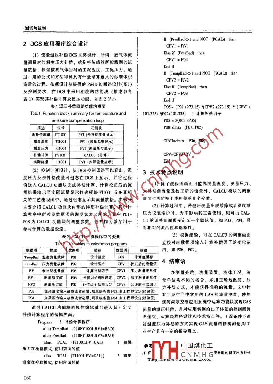 第23卷第2期機(jī)電產(chǎn)品開發(fā)與創(chuàng)新Vol 23, No. 22010年3月opment Innovation of Machinery Electrical ProductsMar 2010文章編號:1002-6673(2010)02-159-02GAs流量溫壓補(bǔ)償在DCS中的設(shè)計與應(yīng)用范金玲(蘇州工業(yè)職業(yè)技術(shù)學(xué)院,江蘇蘇州215104)要;GAS流量的溫度壓力補(bǔ)償是工業(yè)流量檢測中經(jīng)常遇到的冋題。本文著重闡述了GAS流量測量在橫河DCS系統(tǒng)中的應(yīng)用及其流量溫壓補(bǔ)償?shù)挠嬎阈Uc設(shè)計。關(guān)鍵詞:GAS;流量測量;DCS;溫壓補(bǔ)償中圖分類號:TP27文獻(xiàn)標(biāo)識碼:Ado:10.3969/jisn.1002-6673201002.067Design and Application on GAs Flow with Temperature and Pressure Compensation in DCSFAN Jin-Ling(Suzhou Institute of industrial Technology, Suzhou Jiangsu 215104Abstract: The gas flow measurement with temperature and pressure compensation is frequently encountered in industrial flow measuring.This paper focuses on application of gas flow measurement in the Yokogawa DCS system and design on flow correction and compensationKey words: GAS: flow Measurement; DCS; temperature and pressure compensation考慮到環(huán)境條件發(fā)生改變時,流量的測量受溫度和壓力的0引言變化影響較大時,應(yīng)考慮對測量信號進(jìn)行校正,計算中進(jìn)由于氣體的可壓縮性較強(qiáng),因此對于流量的測量,行一定的溫度和壓力補(bǔ)償,保證GAS流量的精確測量。氣體要比液體困難得多。若要求氣體計量達(dá)到相當(dāng)高的(1)P&ID( Piping& nstrument Diagram)中的回路設(shè)精度,則計量儀表的經(jīng)濟(jì)投入必然巨大。因此,合理選計見圖1、2擇測量方法及功能、特性、經(jīng)濟(jì)適用的流量計是非常必(2)計算公式:流量溫壓補(bǔ)償實際是根據(jù)理想氣體要的。對于規(guī)模生產(chǎn)及精準(zhǔn)測量,必然涉及設(shè)備儀表及!方程推導(dǎo)出來的,而GAS的性質(zhì)近似于理想氣體,可用相關(guān)控制系統(tǒng)。在丁業(yè)生產(chǎn)過程控制系統(tǒng)中,集散控制1同樣的的補(bǔ)償公式進(jìn)行計算:系統(tǒng)(DCS)是利用計算機(jī)技術(shù)對生產(chǎn)過程進(jìn)行集中監(jiān)Fo=Fi*SQRT((P+1.01325*100)/(Pb+1.01325*100)*視、操作、管理和分散控制的一種新型控制系統(tǒng),本文(Th+27315(+35)主要介紹GAS流量測量的溫度壓力補(bǔ)償在橫河DCS中參數(shù):Tb-設(shè)計溫度(C);P-設(shè)計壓力(KPa);的應(yīng)用與實現(xiàn)。P一實際測量壓力(KPa);T一實際測量溫度(°C);Fi一未這里所講的GAS是指氮氣(N)、氧氣(O)、壓縮|補(bǔ)償前流量(Keh);Fo一補(bǔ)償校正后的流量(Kgh)空氣(AR)等T業(yè)中常用的干燥氣體,壓力不高于1MPa溫度不低于0°C,不包括飽和蒸汽、過飽和蒸汽、天然氣和煤氣。天然氣、煤氣等屬于多組分氣體,牽涉到多組分等問題,其流量補(bǔ)償僅靠溫壓補(bǔ)償是不夠的。而飽和蒸汽和過飽和蒸汽亦有其不同的溫壓補(bǔ)償計算方法。1控制原理的設(shè)計與計算““手在實際的工業(yè)自動化生產(chǎn)中,GAS流量補(bǔ)償就是在圖1中國煤化工通壓補(bǔ)儒報制塊收稿日期:2010-02-09Fig-1二 ntrol module for for作者簡介:范金玲(1972-),女,江蘇蘇州人,講師。主要|nowHCNMH Gh temperature and從事機(jī)電一體化、自動控制方面的研究工作pressure compensationpressure compensation測試與控制If(Pres Bado>l and NOT(PCAL)then2DCS應(yīng)用程序綜合設(shè)計1=R(1)流量溫壓補(bǔ)償DCS回路設(shè)計。所謂一般氣體流Else if (Pres Bad) then量測量時的溫度壓力補(bǔ)償,就是將傳感器所檢測到的流CPV1 P04量數(shù)據(jù),根據(jù)被測氣體當(dāng)時的工況溫度、工況壓力,通End if過一定的公式和方法得到具有計量結(jié)算意義的標(biāo)準(zhǔn)體積If (Temp Bado>l and NOT (TCAL))thenCPV2=RV2流量的過程。依據(jù)設(shè)計院提供的P&ID的回路設(shè)計(圖1)Else if (Temp Bad) then及控制要求,在DCS中采用相應(yīng)的功能塊(描述參考CPV2= P03表1)實現(xiàn)其補(bǔ)償計算及顯示功能,如圖2所示表1溫壓補(bǔ)償回路功能塊概要05=(P1+273.15)CPV2+273.15)*(CPV+Tab 1 Function block summary for temperature and101325)/(P2+101,325)!計算補(bǔ)償因子pressure compensation loopPO5= SQRT (POS)描述位號功能塊P08=dmax (P07, POS)未補(bǔ)償流量FTo0PV(未補(bǔ)償流量顯示)L測量溫度」T10pPv(測量溫度顯示)CPV3=dmin(P06, PO8)測量壓力PI001PV(測量壓力顯示)補(bǔ)償計算FY01CALCU(計算)CPV=CPV3·Rv實際流量F00PⅥI(實際流量顯示)(2)控制計算設(shè)計。從DCS控制回路可以看出,溫3技術(shù)特點說明度壓力及未補(bǔ)償流量可組態(tài)在DCS上顯示,并將過程值送入 CALCU功能塊完成補(bǔ)償計算,計算校正后的流(1)除了流程圖畫面可監(jiān)視測量溫度、測量壓力量結(jié)果輸出至實際流量顯示儀表模塊H001或在其相未補(bǔ)償前流量及校正后的流量外, CALCU模塊的調(diào)整關(guān)的工藝流程圖中,通過組態(tài)顯示其流量數(shù)據(jù)。本部分畫面也可監(jiān)視上述相關(guān)的幾個變量主要介紹 CALCU功能塊內(nèi)部的詳細(xì)補(bǔ)償計算,其中計(2)計算過程中,若溫壓測量出現(xiàn)故障或者溫度或算程序中所涉及數(shù)據(jù)項的說明如表2所示,其中-壓力儀表維護(hù)時,為不影響其正常使用,則可由cP08為 CALCU功能塊的調(diào)整參數(shù),通常作為緩存用于:CU的調(diào)整畫面預(yù)先定義一個默認(rèn)值,如P03、PO4,具參與計算的數(shù)據(jù)設(shè)定。有相對的靈活性和選擇性。表2 CALCU計算