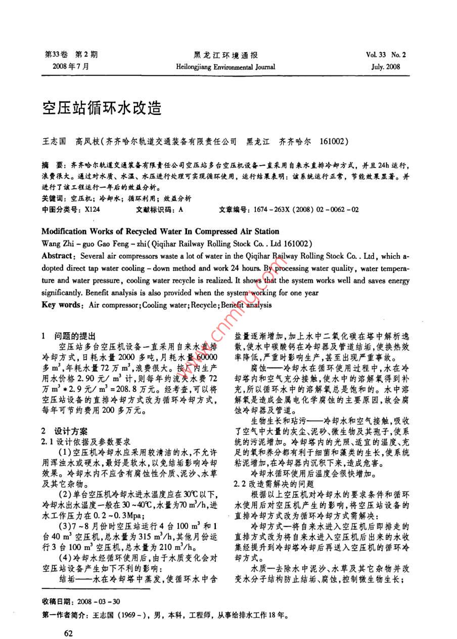 第33卷第2期黑龍江環(huán)境通報Vol 33 No. 22008年7月Heilongjiang Environmental JoumalJuy.2008空壓站循環(huán)水改造王志國高鳳枝(齊齊哈爾軌道交通裝備有限責(zé)任公司黑龍江齊齊哈爾161002)摘要:齊齊哈爾軌道交通裝備有限責(zé)任公司空壓站多臺空壓機(jī)設(shè)備一直采用自來水直排冷卻方式,并且24h運(yùn)行,浪費(fèi)很大。通過對水質(zhì)、水溫、水壓進(jìn)行處理可實現(xiàn)循環(huán)使用,運(yùn)行結(jié)果裹明:該系統(tǒng)運(yùn)行正常,節(jié)能效果顯著。并進(jìn)行了該工程運(yùn)行一年后的效益分析。關(guān)鍵詞:空壓機(jī);冷卻水;循環(huán)利用;效益分析中圖分類號:X124文獻(xiàn)標(biāo)識碼:A文章編號:1674-263X(2008)02-0062-02Modification Works of Recycled Water In Compressed Air StationWang Zhi-guo Gao Feng -zhi( Qiqihar Railway Rolling Stock Co.. Ltd 161002)Abstract Several air compressors waste a lot of water in the Qiqihar Railway Rolling Stock Co.. Ltd, which a-dopted direct tap water cooling-down method and work 24 hours. By processing water quality, water temperature and water pressure, cooling water recycle is realized. It shows that the system works well and saves energycaned when the system working for one yearKey words: Air compressor; Cooling water Recycle; Benefit analysis1問題的提出鹽量逐漸增加,加上水中二氧化碳在塔中解析逸空壓站多臺空壓機(jī)設(shè)備一直采用自來水直排散,使水中碳酸鈣在冷卻器及管道結(jié)垢,使換熱效冷卻方式,日耗水量2000多噸,月耗水量60000率降低,嚴(yán)重時影響生產(chǎn),甚至出現(xiàn)嚴(yán)重事故多m3,年耗水量72萬m3,浪費(fèi)很大。按廠內(nèi)生產(chǎn)腐蝕——冷卻水在循環(huán)使用過程中,水在冷用水價格2.90元/m3計,則每年約流失水費(fèi)72卻塔內(nèi)和空氣充分接觸,使水中的溶解氧得到補(bǔ)萬m3*2.9元/m3=208.8萬元。經(jīng)考查,可以將充,所以循環(huán)水中的溶解氧總是飽和的。水中溶空壓站設(shè)備的直排冷卻方式改為循環(huán)冷卻方式解氧是造成金屬電化學(xué)腐蝕的主要原因,故會腐每年可節(jié)約費(fèi)用200多萬元。蝕冷卻器及管道生物生長和玷污一—冷卻水和空氣接觸,吸收2設(shè)計方案了空氣中大量的灰塵、泥砂、微生物及其孢子,使系2.1設(shè)計依據(jù)及參數(shù)要求統(tǒng)的污泥增加。冷卻塔內(nèi)的光照、適宜的溫度、充1)空壓機(jī)冷卻水應(yīng)采用較清潔的水,不允許足的氧和養(yǎng)分都有利于細(xì)菌和藻類的生長,使系統(tǒng)用渾濁水或硬水,最好是軟水,以免結(jié)垢影響冷卻粘泥增加,在冷卻器內(nèi)沉積下來,造成危害。效果。冷卻水內(nèi)不應(yīng)含有腐蝕性介質(zhì)、泥沙、水草冷卻水循環(huán)使用后溫度會很快增加。及其它雜物。22改造需解決的問題(2)單臺空壓機(jī)冷卻水進(jìn)水溫度應(yīng)在30℃以下,根據(jù)以上空壓機(jī)對冷卻水的要求條件和循環(huán)冷卻水出水溫度一般在30~40℃,水量為70m3/h,進(jìn)水使用后對空壓機(jī)產(chǎn)生的影響,將空壓站設(shè)備的水工作壓力在0.2-0.3Mpa;直排冷卻方式改為循環(huán)冷卻方式需解決:(3)7-8月份時空壓站運(yùn)行4臺100m23和1冷卻方式一將自來水進(jìn)入空壓機(jī)后即排走的臺40m3空壓機(jī),總水量為315m3/h,其他月份運(yùn)直排方式改為將自來水進(jìn)入空壓機(jī)后出來的水收行3臺100m3空壓機(jī),總水量為210m3/h集經(jīng)提升到冷卻塔冷卻后再送入空壓機(jī)的循環(huán)冷4)冷卻水經(jīng)循環(huán)使用后,由于水質(zhì)變化會對卻方式。空壓站設(shè)備產(chǎn)生如下不利的影響:水質(zhì)一去除水中泥沙、水草及其它雜物并改結(jié)垢——水在冷卻塔中蒸發(fā),使循環(huán)水中含變水分子結(jié)構(gòu)防止結(jié)垢、腐蝕,控制微生物生長;收稿日期:2008-03-30第一作者簡介:王志國(1969-),男,本科,工程師,從事給排水工作18年。62治理技術(shù)水溫一改用循環(huán)水的方式運(yùn)行后,循環(huán)水溫23解決方案度會逐漸升高。循環(huán)水的溫度應(yīng)降到30℃以下。2.3.1冷卻方式自來水可直供(保障運(yùn)行)空壓機(jī)排水漏斗一一室內(nèi)排水管網(wǎng)熱水池}提升泵供水管水處理設(shè)備一提升泵H冷水池冷卻塔自來水補(bǔ)水圖1循環(huán)冷卻系統(tǒng)處理工藝流程空壓機(jī)冷卻后的水進(jìn)入排水管網(wǎng)回收到地下要參數(shù)如下:當(dāng)T=26℃時,冷卻水量如下:即40~熱水池,利用水泵提升進(jìn)入冷卻塔進(jìn)行冷卻降溫,30℃,△=10℃,Q=360m3/h;完全滿是冷卻水量的降溫后流到地下冷水池,再利用另一組水泵提升要求。D=47600mm、H=5745mmN=22xW)進(jìn)入水處理設(shè)備后通過供水管網(wǎng)直接供給空壓2.3.4水泵設(shè)置及運(yùn)行方式機(jī),完成一個循環(huán)過程。泵及水處理設(shè)備均設(shè)在現(xiàn)水泵間(55*5=保留原使用自來水直接供給空壓機(jī)的自來水27.5m3),供冷卻塔水泵運(yùn)行方式為兩級液位控制管路及閥門,儆備用系統(tǒng)。自動交替運(yùn)行,供空壓機(jī)水泵運(yùn)行方式為恒壓控在地下冷水池處設(shè)自來水補(bǔ)水管路,補(bǔ)充冷制變頻運(yùn)行,兩套系統(tǒng)均設(shè)置3臺200m3/h水卻塔的日消耗水量。泵,各為2用1備。在供空壓機(jī)水泵總出口管道2.3.2水質(zhì)上安裝溫度傳感器,根據(jù)傳感器的溫度控制冷卻采用全程處理器設(shè)備(一種水處理設(shè)備)解