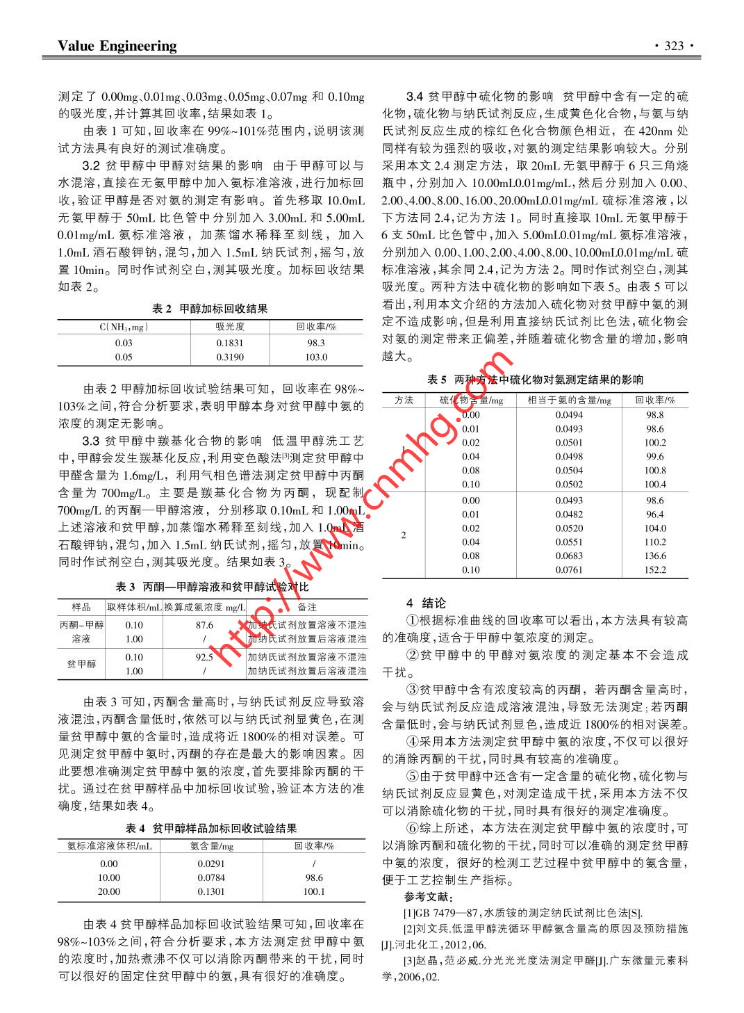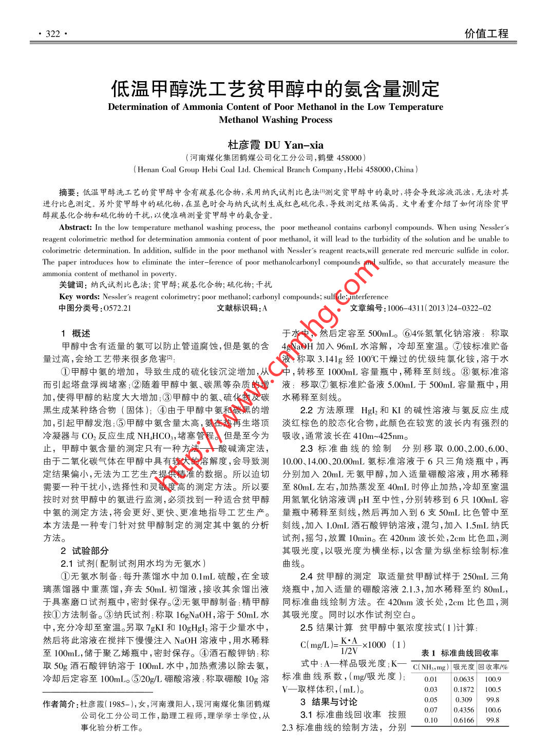 ●322●價值工程低溫甲醇洗工藝貧甲醇中的氨含量測定Determination of Ammonia Content of Poor Methanol in the Low TemperatureMethanol Washing Process杜彥霞DU Yan- -xia(河南煤化集團鶴煤公司化工分公司,鶴壁458000)( Henan Coal Group Hebi Coal Ltd. Chemical Branch Company , Hebi 458000, China )摘要:低溫甲醇洗工藝的貧甲醇中含有羰基化合物,采用納氏試劑比色法川測定貧甲醇中的氨時,將會導致溶液混濁,無法對其.進行比色測定。另外貧甲醇中的硫化物,在顯色時會與納氏試劑生成紅色硫化汞,導致測定結(jié)果偏高。文中著重介紹了如何消除貧甲醇羰基化合物和硫化物的干擾,以便準確測量貧甲醇中的氨含量。Abstract: In the low temperature methanol washing process, the poor metheanol contains carbonyl compounds. When using Nessler'scolorimetric determination. In addition, sulfide in the poor methanol with Nessler's reagent reacts,will generate red mercuric sulfide in color.The paper introduces how to eliminate the inter-ference of poor methanolcarbonyl compounds and sulfide, so that accurately measure theammonia content of methanol in poverty. .關(guān)鍵詞:納氏試劑比色法;貧甲醇;羰基化合物;硫化物;干擾Key words: Nessler's reagent colorimetry; poor methanol; carbonyl compounds; sulfide; interference中圖分類號:0572.21文獻標識碼:A文章編號: 1006-4311(2013 )24-0322-021概述于水中,然后定容至500mL。⑥4%氫氧化鈉溶液:稱取甲醇中含有適量的氨可以防止管道腐蝕,但是氨的含4gNaOH加入96mL水溶解,冷卻至室溫。⑦銨標準貯備量過高,會給工藝帶來很多危害吧:液:稱取3.141g經(jīng)100C干燥過的優(yōu)級純氯化銨,溶于水①甲醇中氨的增加,導致生成的硫化銨沉淀增加,從中,轉(zhuǎn)移至1000mL容量瓶中,稀釋至刻線。⑧氨標準溶而引起塔盤浮閥堵塞;②隨著甲醇中氨、碳黑等雜質(zhì)的增液: 移?、甙睒藴寿A備液5.00mL于500mL容量瓶中,用加,使得甲醇的粘度大大增加;③甲醇中的氨、硫化物及碳水稀釋 至刻線。黑生成某種絡合物(固體);④由于甲醇中氨和碳黑的增2.2方法原理Hgl和 KI的堿性溶液與氨反應生成加,引起甲醇發(fā)泡;⑤甲醇中氨含量太高,氨在熱再生塔項淡紅棕色的膠態(tài)化合物,此顏色在較寬的波長內(nèi)有強烈的冷凝器與CO2反應生成NHHCO3,堵塞管程。但是至今為吸收,通常波長在410m~425nm。止,甲醇中氨含量的測定只有一-種方法一酸堿滴定法,2.3標準曲線的繪制分 別移取0.002.00<6.00、由于二氧化碳氣體在甲醇中具有較大的溶解度,會導致測10.00、 14.00、20.00mL氨標準溶液于6只三角燒瓶中,再定結(jié)果偏小,無法為工藝生產(chǎn)提供精準的數(shù)據(jù)。所以迫切分別加入20mL無氨甲醇,加入適量硼酸溶液,用水稀釋需要一種干擾小,選擇性和靈敏度高的測定方法。所以要至 80mL左右,加熱蒸發(fā)至40mL時停止加熱,冷卻至室溫按時對貧甲醇中的氨進行監(jiān)測,必須找到一種適合貧甲醇用氫氧化鈉溶液調(diào)pH至中性,分別轉(zhuǎn)移到6只100mL容中氨的測定方法,將會更好、更快、更準地指導工藝生產(chǎn)。量瓶中稀釋至刻線, 然后再加入到6支50mL比色管中至本方法是一種專門針對貧甲醇制定的測定其中氨的分析刻線 ,加入1.0mL酒石酸鉀鈉溶液,混勻,加入1.5mL納氏方法。試劑,搖勻,放置10min。在420nm波長處,2cm比色M皿,測2試驗部分其吸光度,以吸光度為橫坐標,以含量為縱坐標繪制標準2.1試劑(配制試劑用水均為無氨水)曲線。①無氨水制備:每升蒸餾水中加0.1mL硫酸,在全玻2.4貧甲醇的測定取適量貧甲醇試樣于250mL三角璃蒸餾器中重蒸餾,棄去50mL初餾液,接收其余餾出液燒瓶中,加入適量的硼酸溶液2.1.3,加水稀釋至約80mL,于具塞磨口試劑瓶中,密封保存。②無氨甲醇制備:精甲醇同標準 曲線繪制方法。在420nm波長處,2em比色皿,測按①方法制備。③納氏試劑:稱取16gNaOH,溶于50mL水其吸光度。同時以水作試劑空白。中,充分冷卻至室溫。另取7gKI和10gHgI2 溶于少量水中,2.5結(jié)果計算貧甲醇中氨濃度按式(1)計算:然后將此溶液在攪拌下慢慢注入NaOH溶液中,用水稀釋C(mg/L)=I2V-x1000 (1)至100mL,儲于聚乙烯瓶中,密封保存。④酒石酸鉀鈉:稱表1標準曲線回收率取50g酒石酸鉀鈉溶于100mL水中,加熱煮沸以除去氨,.式中:A-樣品吸光度; K- C(NH,mg)|吸 光度回收率1%冷卻后定容至100mlLo⑤20/L硼酸溶液:稱取硼酸10g溶標準曲線系數(shù),(mg/吸光度);0.010.0635 100.9 .V-取樣體積,(mL)。0.03| 0.1872| 100.5作者簡介:杜彥霞( 1985-),女,河南濮陽人,現(xiàn)河南煤化集團鶴煤3結(jié)果與討論0.050.309| 99.80.07| 0.4356 | 100.6公司化工分公司工作,助理工程師,理學學士學位,從3.1標準曲線回收率按照0.100.6166 99.事化驗分析工作。2.3標準曲線的繪制方法,分別Value Engineering●323●測定了0.00mg<0.01mg<0.03mg.0.05mg.0.07mg和0.10mg3.4貧甲醇中硫化物的影響貧甲醇中含有一定的硫的吸光度,并計算其回收率,結(jié)果如表1?;?硫化物與納氏試劑反應,生成黃色化合物,與氨與納由表1可知,回收率在99%~101%范圍內(nèi),說明該測氏試劑反應生成的棕紅色化合物顏色相近,在420nm處試方法具有良好的測試準確度。同樣有較為強烈的吸收,對氨的測定結(jié)果影響較大。分別3.2貧甲醇中甲醇對結(jié)果的影響由于甲醇可以與采用本文2.4測定方法, 取20mL無氨甲醇于6只三角燒水混溶,直接在無氨甲醇中加入氨標準溶液,進行加標回瓶中 ,分別加入10.00mL0.01mg/mL, 然后分別加入0.00、收,驗證甲醇是否對氨的測定有影響。首先移取