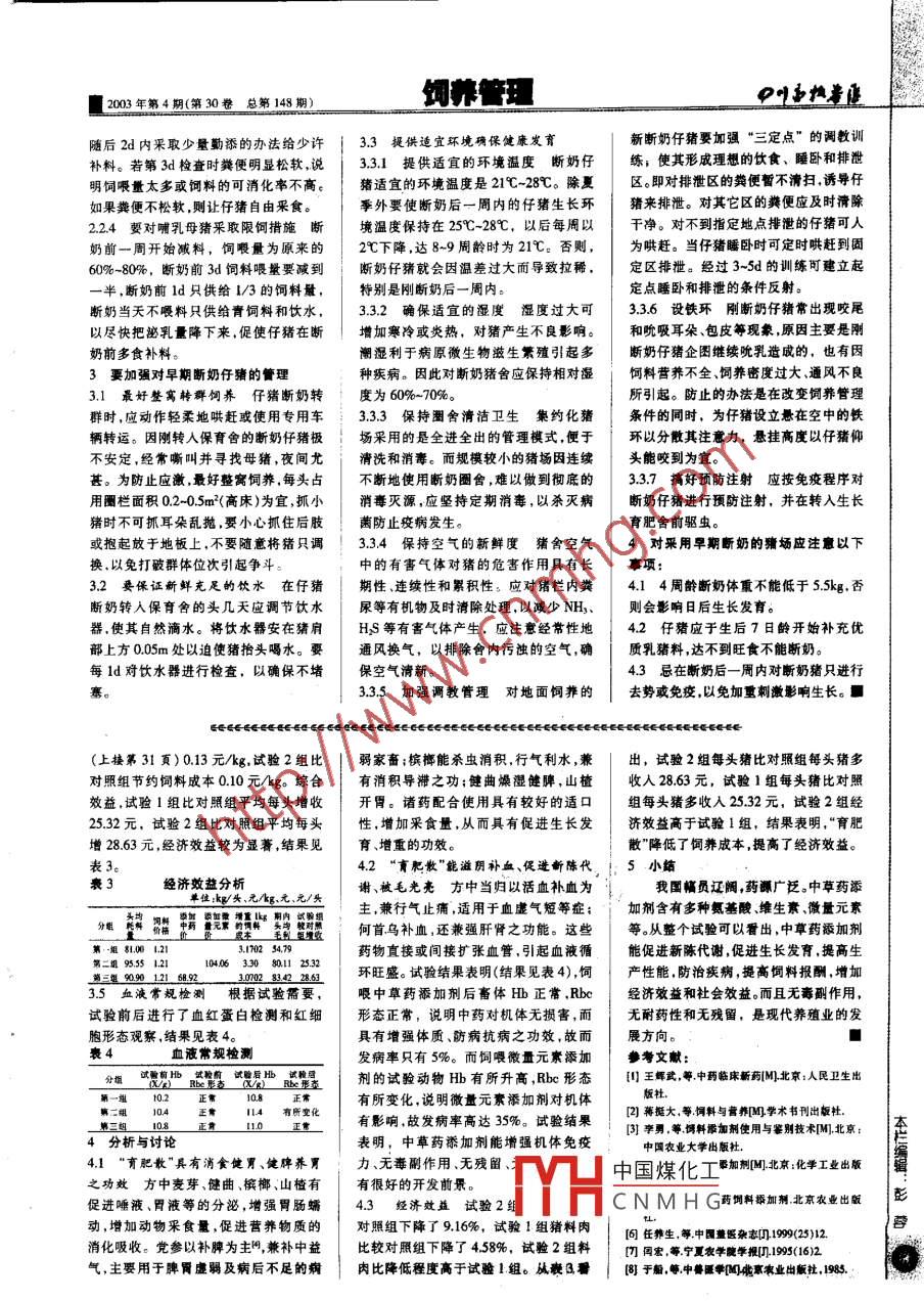 1 2003年第4期(第30卷 總第148期)動藥科技中草藥添加劑對肥育豬的影響鐘余中',賀永鍵2(1.四川省內江農業(yè)學校,四川內江641003;2.西南農業(yè)大學榮昌校區(qū),重慶榮昌402460)中圈分類號:816.75文獻標識碼:B文章編號:1001-8964(2003)04-0031-01摘要:中蘋藥添加劑對肥育豬的影響試驗,結果表明:試驗2組比試驗1組料肉比低,平均每頭豬多增收3.31元,經濟效益較為顯著(P<0.05)。中草藥添加劑不僅能增重、縮短肥育期、提高經濟效益、還能增強機體免疫力。試驗2組比試驗!組發(fā)病率低。中草藥添加劑無耐藥性、無殘留、無毒副作用。關鍵詞:中蕈藥;育肥豬The Effect of Chinese- -herb Additive on Growing Shine SwineZHONG Yo thoul, HE Yong-jian'(Apricelur Shol Nejiang Sichuan Sherg Sichua Neijiang 541003. Chinc2.South-ueast Agiculure Unitersity Ronghmng Chngin Rongehang 402460 ,China;)Abstract: Efeet of Chinese-herb additive on growing Swine was ollected.The result showed that rate of grawth/kitogram food aten was lower than contol group.Economic eficacy was significant (P <0.05),Chinesc -herb additivecould improve immunity of growing swine without tolerance,remains and side effect.Key words: Chinese -herb; Growing swine隨著畜牧業(yè)的發(fā)展,飼料起著至關FeSO,: 80g. ZnSO;: 60% MnS02:6g, KI:|增重 425.80g,試驗1組比對照提高了重要的作用。由于化學添加劑的廣泛使0.1g. NaSeO2: 0.2g. COCl;:0.1g,另以石36.33%(P<0.05),試驗2組比對照組提用,在畜產品(肉、蛋、奶)中的殘留,嚴粉為載體,共計300g。高了29.07%(P<0.05),結果見表1。重地影響人類身體健康。中草藥添加劑1.5“育肥散”組成 檳榔、麥芽、健曲、增重統(tǒng)計單位:頭、.元不僅有促進畜禽生長,提高生產性能及山植、黨參.當歸、土黃芪何酋烏等10增強機體免疫力等功效,還具有無耐藥昧中藥組成。混合粉碎,過80目篩后而一組20 21960 44508 22548 425.80性、無殘留.無公害、而成本低廉,使中成,共計100.0g.中草藥購于內江中成藥屬二組20 21800 56628.8 348288 80.48 3633草藥泰加劑的研究和應用受到了國內批發(fā)部。第二組。20. 21850 5482363297.6 54956 2907外的廣泛關注,是目前養(yǎng)殖業(yè)的發(fā)展方2試驗方法3.2 飼料報酬試驗 1組豬料肉比為向。2.1預試試驗豬均先進行 驅蟲、洗2.50.試驗2組豬料肉比為2.38,對照組根據中藥的作用,應用中普醫(yī)傳統(tǒng)胃、健胃、注射豬瘟疫功垢,臨床觀察和豬料肉比為2.62,試驗1組比對照組降理論和現代生物工程技術,再結合眾多測定三大生理指標,以基礎日糧飼喂低了4.58%,試驗2組比對照組降低了民間驗方.以多味中草藥配制成“育肥12d。 確定健康無病后,空腹稱重,根據9.16%,結果見表2。散”,經試驗后獲得了較明顯的效果,現重最基本相等分為3組。第一組為對照表2飼料消耗與料肉比單位:區(qū)將試驗結果報告如下。組,喂基礎日糧配方;第二組為試驗11試驗材料組,在基礎日糧中添0.3%的微量元素:第一組3200529 6183408 26211.1試驗時間2002年 10月8日至第三組為試驗2組,在基礎日糧中添加第二帽1911079.8 764431.9 2501 4.58%12月8日共60d為試驗期。0.2%的中藥“育肥散"。_ 銷三粗 1818040.5 7638826 。238.15號1.2 試驗動物 由四川省內江市東興2.2飼喂方法均在同等的飼養(yǎng)管理3.3臨床觀察試驗豬食欲旺盛,采食區(qū)種豬場提供.體重相近.去勢、健康的.條件下進行飼養(yǎng),每日飼曦3次,試驗量大,食后安靜,喜臥。試驗組豬比對照60日齡雜交仔豬(內x長)60頭。期均為60d。每次飼喂的量,以吃飽后各組生長、增重更快,且毛色光亮.皮肢紅1.3 基礎日糧配方(%) 玉米61.00,有少量余料為度,自由飲水。潤,精神正常,體重健壯,二便正常。在整麥麩3.0,膨化大豆5.0,豆粕20.0,魚粉2.3試驗動物測定 對試驗動物每 1d個試驗期,對照組有4頭豬發(fā)生下痢,發(fā)3.0,食鹽0.3.磷酸氫鈣0.6.碳酸鈣1.0,觀察采食、精神.二便情況,中國煤化工1組有7頭豬發(fā)生下賴氨酸0.1。后分別稱重、采血。每次采b;試驗2組僅1頭豬1.4微量元素組成 (g)OQsSO2: 75g,Hb ,Rhe形態(tài)觀察。fYHCNMHG為5%。收稿日期:2003-01-243試驗結果3.4經濟效益按當時飼料成本價和作者簡介:鐘余中(1965-),本科,善醫(yī)師,從3.1增重試驗1 組豬日增重580.48g.生豬銷售價(5.60元/Axg)計算,試驗1組?事獸醫(yī)臨床教學工作。試驗2組豬日增重549.56g,對照組豬日較對照組增加飼料威本(下糖策33頁)室2003年第4期(第30卷 總第 148期)飼養(yǎng)管理隨后2d內采取少量勤添的辦法給少許3.3提供適宜環(huán)境確保健康發(fā)育新斷奶仔豬要加強“三定點” 的調教訓補料。若第3d檢查時糞便明顯松軟,說3.3.1提供適宜的環(huán)境溫度 斷奶仔練,使其形成理想的飲食、睡臥和排泄明飼喂量太多或飼料的可消化率不高。豬適宜的環(huán)境溫度是21C-28C.除夏區(qū)。即對排泄區(qū)的糞便暫不清掃,誘導仔如果糞便不松軟,則讓仔豬自由采食。季外要使斷奶后一周內的仔豬生長環(huán)豬來排泄。對其它區(qū)的糞便應及時清除2.2.4嬰 對哺乳母豬采取限飼措施斷境溫度保持在250C-28C,以后每周以.干凈。對不到指定地點排泄的仔豬可人奶前一周開始臧料,飼喂量為原來的.2C下降,達8~9周齡時為21C。否則,為哄趕。當仔豬睡臥時可定時哄趕到固60%-80%,斷奶前3d飼料喂量要減到斷奶仔豬就會因溫差過大而導致拉稀,定區(qū)排泄。經過3~5d的訓練可建立起一半,斷奶前1d只供給1/3的飼料量,特別是剛斷奶后一周內。定點睡臥和排泄的條件反射。斷奶當天不喂料只供給青飼料和