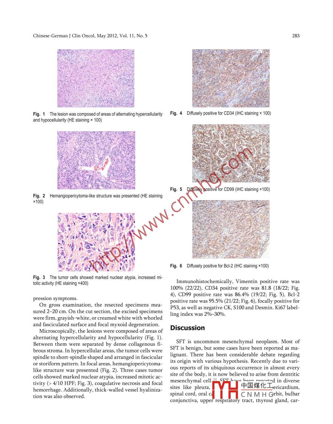 Chinese-German Journal of Clinical OncologyMay 2012, Vol. 11, No.5, P282- -P284DOI 10.1007/s10330-011-0919-zClinicopathological analysis of solitary fibrous tumorXiumei Zhang, Hai Wang, Shujing W ang, Jinfeng Miao, Zhengai Piao, Yingying DongDepartment of Pathology, The Third People's Hospital of Dalian, Dalian 116033, ChinaReceived: 27 October 2011 1 Revised: 20 February 2012 1 Accepted: 5Apil 2012⑥Huazhong University of Science and Technology and Springer-Verlag Berlin Heidelberg 2012Abstract Objective: The aim of this study was to investigate the clinicopathologic characteristics, diagnosis and diferentialdiagnosis, molecular genetics, treatment and prognosis of solitary fibrous tumor (SFT). Methods: The clinicopathologicalmanifestations were analyzed retrospectively in 22 patients with surgically confirmed SFT. Results: There were 12 malepatients and 10 female patients, with the age range 33- 67 (mean 48.62) years. The SFTs originated from dfferent from partsof the body, including 13 in the chest, 2 in the lungs, 3 in the abdomen, 1 in the lumbosacral area, 2 in the pelvis, and 1 in theleft shoulder. There were 19 benign and 3 malignant tumors. Major clinical presentations were local masses and compressionsymptoms. Microscopy: the tumor was composed of areas of alternating hyerellularity and hyoellularity. The tumor cellswere spindle to short-spindle shaped and arranged in fascicular or storiform pattern and hemangiopericytoma-ike structurewas presented. Immunohistochemically, Vimentin positive rate was 100% (22), BcI-2 positive rate was 95.5% (2/22),CD99 positive rate was 86.4% (19/22), CD34 positive rate was 81.8 (18/22), focally positive for P53, as well as negative CK,S100 and Desmin. Ki67 labelling index was 2%- 30%. Conclusion: SFT is a rare tumor which may be found in various partsof human body. SFT mostly is a benign tumor, but a few could be malignant. Its diagnosis mainly rely on its morphologicfeatures and immunohistochemical profiles. The major treatment is to completely resect it by operation and long-term clinicalfllow-up is necessary.Key words solitary fibrous tumor (SFT); ciniopathology; diagnosis; dfrential diagnosisSolitary fibrous tumor (SFT) is rare mesenchymal neo- hydrated with graded ethanol. After washing with dis-plasm that has been considered as fusiform cell character- tilled water, the section was placed in the supplied buffer.istic. SFT was originally documented in pleura, recently For antigen retrieval, the slides were heated at 95 C forthe ubiquitous nature has been recognized with reported 40 min and then cooled for at least 20 min at room tem-of involvement of numerous sites all over the body. The perature. The sections were treated with 30 mL/L H2O2vast majority of SFTs are benign, but some cases have methanol at room temperature for 10 min to block en-been reported as malignant. Here, we presented 22 cases dogenous peroxidase and then washed with PBS for 5review of SFT and investigated features of clinicopathol- min. Individual slides were then incubated with primaryogy.antibody for 30 min at room temperature and Elivisionreagent for 30 min at room temperature. After extensiveMaterials and methodswashing with PBS, the color reaction was developed inDAB liquid system, according to the manufacture's in-Samplesstructions. The sections were then counterstained withTwenty- two cases were obtained from the Third Peo- Meyer's hematxylin. The results were observed underple's Hospital of Dalian, China, from June 2000 to Febru- light microscope.ary 2012. All the specimens were fixed in formalin andembedded with wax.ResultsImmunohistochemistryThere were 12 male patients and 10 female patients,Immunohistochemical staining of Vimentin, CD34,with the age range 33- 67 (mean 48.62) years. The SFTsCD99, Bcl-2, P53, Ki67, S100, Desmin and CK were done originated from different from parts of the body, includ-according to the manufacture's instructions. All of sec- ing 13 in the chest, 2 in the lungs, 3 in the abdomen, 1tions (4 pμm thick) were deparaffinized in xylene and de- in the lumbosacra中國(guó)煤化工1 in the leftshoulder. There wc N M H Gant tumors.Correspondence to: Xiumei Zhang. Email: xmzhang1215@hotmail.comMajor clinical pres比Jui sw and com-Chinese- German J Clin Oncol, May 2012, Vol. 11, No.5283Fig. 1 The lesion was composed of areas of alternating hyerellularity Fig. 4 Difusely positive for CD34 (HC staining x 100)and hyoellularity (HE staining x 100)Fig. 5 Difusely positive for CD99 (IHC staining x100)Fig. 2 Hemangiopericytomalike structure was presented (HE stainingx100)Fig. 6 Difusely positive for Bcl-2 (IHC staining x100)Fig. 3 The tumor cells showed marked nuclear atypia, increased mi-Immunohistochemically, Vimentin positive rate wastotic activity (HE staining x400)100% (222), CD34 positive rate was 81.8 (18/22; Fig.4), CD99 positive rate was 86.4% (19/22; Fig. 5), Bcl-2pression symptoms.positive rate was 95.5% (21/22; Fig. 6), focally positive forsured 2-20 cm. On the cut section, the excised specimensP53, as well as negative CK, S100 and Desmin. Ki67 label-were firm, grayish-white, or creamed white with whorledling index was 2%- 30%.and fasciculated surface and focal myxoid degeneration.DiscussionMicroscopically, the lesions were composed of areas ofalternating hypercellularity and hypocellularity (Fig. 1).Between them were separated by dense collagenous fi-。SFT is uncommon mesenchymal neoplasm. Most ofbrous stroma. In hypercellular areas, the tumor cells wereSFT is benign, but some cases have been reported as ma-spindle to short -spindle shaped and arranged in fascicularlignant. There has been considerable debate regardingor storiform pattern. In focal areas, hemangiopericytoma-its origin with various hypothesis. Recently due to vari-like structure was presented (Fig. 2). Three cases tumorous reports of its ubiquitous occurrence in almost everycells showed marked nuclear atypia, increased mitotic ac-site of the body, it is now believ