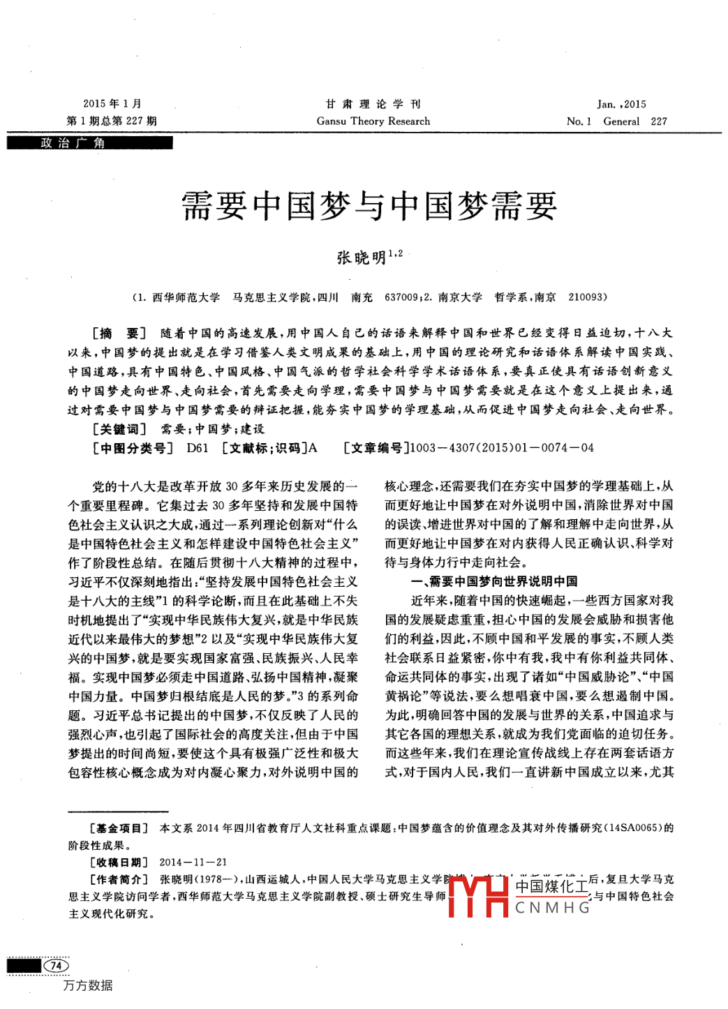 2015年1月甘肅理論學(xué)刊Jan.,2015第1期總第227期Gansu Theory ResearchNo. 1 General 227需要中國(guó)夢(mèng)與中國(guó)夢(mèng)需要張曉明12(1.西華師范大學(xué)馬克思主義學(xué)院四川南充637009;2.南京大學(xué)哲學(xué)系,南京210093)[摘要]隨著中國(guó)的高速發(fā)展,用中國(guó)人自己的話語(yǔ)來(lái)解釋中國(guó)和世界已經(jīng)變得日益迫切,十八大以來(lái),中國(guó)夢(mèng)的提出就是在學(xué)習(xí)借鑒人類文明成果的基礎(chǔ)上,用中國(guó)的理論研究和話語(yǔ)體系解讀中國(guó)實(shí)踐、中國(guó)道路,具有中國(guó)特色、中國(guó)風(fēng)格、中國(guó)氣派的哲學(xué)社會(huì)科學(xué)學(xué)術(shù)話語(yǔ)體系,要真正使具有話語(yǔ)創(chuàng)新意義的中國(guó)夢(mèng)走向世界、走向社會(huì),首先需要走向?qū)W理,需要中國(guó)夢(mèng)與中國(guó)夢(mèng)需要就是在這個(gè)意義上提出來(lái),通過(guò)對(duì)需要中國(guó)夢(mèng)與中國(guó)夢(mèng)需要的辯證把握,能夯實(shí)中國(guó)夢(mèng)的學(xué)理基礎(chǔ),從而促進(jìn)中國(guó)夢(mèng)走向社會(huì)、走向世界。[關(guān)鍵詞]需要;中國(guó)夢(mèng);建設(shè)[中圖分類號(hào)]D61[文獻(xiàn)標(biāo);識(shí)碼]A[文章編號(hào)]1003-4307(2015)01-0074-04黨的十八大是改革開(kāi)放30多年來(lái)歷史發(fā)展的核心理念,還需要我們?cè)诤粚?shí)中國(guó)夢(mèng)的學(xué)理基礎(chǔ)上,從個(gè)重要里程碑。它集過(guò)去30多年堅(jiān)持和發(fā)展中國(guó)特而更好地讓中國(guó)夢(mèng)在對(duì)外說(shuō)明中國(guó),消除世界對(duì)中國(guó)色社會(huì)主義認(rèn)識(shí)之大成通過(guò)一系列理論創(chuàng)新對(duì)“什么的誤讀、增進(jìn)世界對(duì)中國(guó)的了解和理解中走向世界,從是中國(guó)特色社會(huì)主義和怎樣建設(shè)中國(guó)特色社會(huì)主義”而更好地讓中國(guó)夢(mèng)在對(duì)內(nèi)獲得人民正確認(rèn)識(shí)科學(xué)對(duì)作了階段性總結(jié)。在隨后貫徹十八大精神的過(guò)程中,待與身體力行中走向社會(huì)習(xí)近平不僅深刻地指出“堅(jiān)持發(fā)展中國(guó)特色社會(huì)主義需要中國(guó)夢(mèng)向世界說(shuō)明中國(guó)是十八大的主線”1的科學(xué)論斷,而且在此基礎(chǔ)上不失近年來(lái),隨著中國(guó)的快速崛起,一些西方國(guó)家對(duì)我時(shí)機(jī)地提出了“實(shí)現(xiàn)中華民族偉大復(fù)興,就是中華民族國(guó)的發(fā)展疑慮重重,擔(dān)心中國(guó)的發(fā)展會(huì)威脅和損害他近代以來(lái)最偉大的夢(mèng)想”2以及“實(shí)現(xiàn)中華民族偉大復(fù)們的利益,因此,不顧中國(guó)和平發(fā)展的事實(shí),不顧人類興的中國(guó)夢(mèng)就是要實(shí)現(xiàn)國(guó)家富強(qiáng)、民族振興、人民幸社會(huì)聯(lián)系日益緊密,你中有我我中有你利益共同體、福。實(shí)現(xiàn)中國(guó)夢(mèng)必須走中國(guó)道路、弘揚(yáng)中國(guó)精神凝聚命運(yùn)共同體的事實(shí),出現(xiàn)了諸如“中國(guó)威脅論”、“中國(guó)中國(guó)力量。中國(guó)夢(mèng)歸根結(jié)底是人民的夢(mèng)。”3的系列命黃禍論”等說(shuō)法,要么想唱衰中國(guó),要么想遏制中國(guó)。題。習(xí)近平總書(shū)記提出的中國(guó)夢(mèng),不僅反映了人民的為此,明確回答中國(guó)的發(fā)展與世界的關(guān)系,中國(guó)追求與強(qiáng)烈心聲,也引起了國(guó)際社會(huì)的高度關(guān)注,但由于中國(guó)其它各國(guó)的理想關(guān)系,就成為我們黨面臨的迫切任務(wù)。夢(mèng)提出的時(shí)間尚短,要使這個(gè)具有極強(qiáng)廣泛性和極大而這些年來(lái),我們?cè)诶碚撔麄鲬?zhàn)線上存在兩套話語(yǔ)方包容性核心概念成為對(duì)內(nèi)凝心聚力,對(duì)外說(shuō)明中國(guó)的式,對(duì)于國(guó)內(nèi)人民,我們一直講新中國(guó)成立以來(lái),尤其[基金項(xiàng)目]本文系2014年四川省教育廳人文社科重點(diǎn)課題:中國(guó)夢(mèng)蘊(yùn)含的價(jià)值理念及其對(duì)外傳播研究(14SA0065)的階段性成果[收稿日期]2014-11-21[作者簡(jiǎn)介]張曉明(1978-),山西運(yùn)城人,中國(guó)人民大學(xué)馬克思主義學(xué)中國(guó)煤化工后,復(fù)旦大學(xué)馬克思主義學(xué)院訪問(wèn)學(xué)者,西華師范大學(xué)馬克思主義學(xué)院副教授、碩士研究生導(dǎo)師主義現(xiàn)代化研究YHCNMHG是改革開(kāi)放以來(lái),我們之所以取得如此重大的成績(jī),就轉(zhuǎn)化。從而讓中國(guó)特色社會(huì)主義以一個(gè)更加具體、更是因?yàn)槲覀冮_(kāi)辟了中國(guó)特色社會(huì)主義道路,形成了中加親和的形式呈現(xiàn)在世人面前,中國(guó)夢(mèng)通過(guò)一種大家國(guó)特色社會(huì)主義理論體系,確立了中國(guó)特色社會(huì)主義認(rèn)可的形式讓中國(guó)特色社會(huì)主義走向世界走向社會(huì)。制度。所以我們要用中國(guó)特色社會(huì)主義武裝全黨教因?yàn)槲覀冋f(shuō)實(shí)現(xiàn)中華民族偉大復(fù)興的中國(guó)夢(mèng),是我們育人民,要高舉這個(gè)旗幟、堅(jiān)持這個(gè)道路、堅(jiān)持這個(gè)理黨著眼于堅(jiān)持和發(fā)展中國(guó)特色社會(huì)主義提出的重要戰(zhàn)論體系,完善這個(gè)制度,這是我們對(duì)國(guó)人的宣傳體