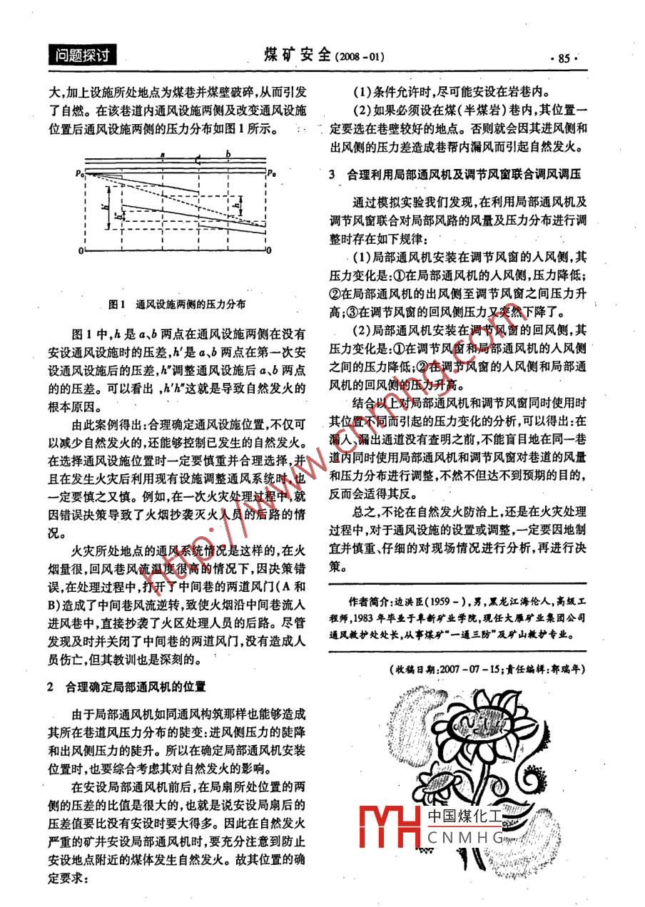 ●84●煤礦安全(Toul 398)問題探討通風(fēng)設(shè)施對煤炭自燃的影響邊洪臣,王岸泓(大雁礦業(yè)集團公司,內(nèi)蒙古呼倫貝爾021122)摘要:通過對通鳳設(shè)施的位置對礦井風(fēng)流壓力分布的影響的分析,闡述了通鳳設(shè)施在礦井發(fā)生自然發(fā)火的過程的作用,并通過實例說明了合理設(shè)置通風(fēng)設(shè)施位置在防止自然發(fā)火工作中的重要性。關(guān)鍵詞:通風(fēng)設(shè)施位置;自然發(fā)火;合理確定設(shè)施位置中圖分類號:TD75*2.2文獻標(biāo)識碼:B文章編號:1003 - 496X(2008 )01 -0084 -02煤炭自然發(fā)火是煤礦生產(chǎn)過程中的一大災(zāi)害,火災(zāi)能否發(fā)生 ,所以設(shè)施位置不能隨意確定,要以保它不僅威脅井下工作人員的生命安全、影響正常生證通風(fēng)系統(tǒng)合理穩(wěn)定運行為前提,以盡量降低設(shè)施產(chǎn),還會造成國家財產(chǎn)的大量損失。兩側(cè)的風(fēng)壓差為原則確定通風(fēng)設(shè)施的位置,并盡量礦井中通風(fēng)狀態(tài)和壓力分布的變化與煤炭自然設(shè)置在巖巷中,從而達到防止自然發(fā)火的目的。發(fā)火有著密切的關(guān)系,在生產(chǎn)中確定通風(fēng)設(shè)施位置如:某礦井-采區(qū)回風(fēng)上山,其調(diào)節(jié)風(fēng)窗設(shè)在了時,要緊緊抓住風(fēng)與火的關(guān)系,在保證通風(fēng)系統(tǒng)穩(wěn)定全煤巷內(nèi),并且巷壁破碎,致使在調(diào)節(jié)風(fēng)窗的入風(fēng)側(cè)運行的大前提下,還要充分考慮因通風(fēng)設(shè)施造成的的煤幫內(nèi)出現(xiàn)了 高溫,并伴有CO涌出。后將其位壓力分布的變化對煤炭自然發(fā)火的作用。置下移到了該巷的全巖處,使得高溫得以控制,CO的涌出量也逐漸減少,從而控制住了此次自然發(fā)火。.1合理確定通風(fēng)構(gòu)筑物位置事后通過對現(xiàn)場考察分析,確定引發(fā)原因為:通風(fēng)系統(tǒng)的管理對于防治煤炭自然發(fā)火來說是地點選擇不合理、盡管能夠保證通風(fēng)系統(tǒng)正常-個關(guān)鍵。設(shè)施位置關(guān)系到漏風(fēng)的增減和煤炭自然運行 ,但因其位置不合理,致使設(shè)施兩端風(fēng)壓差過風(fēng)量增長幅度不大,說明礦井現(xiàn)行風(fēng)量較大,應(yīng)加強道風(fēng)速偏小、風(fēng)流不穩(wěn)定,且該礦又為高瓦斯礦井,通風(fēng)管理。容易造成瓦斯積聚,對通風(fēng)生產(chǎn)沒有用處的巷道應(yīng)(3)礦井現(xiàn)行風(fēng)壓為1900Pa,當(dāng)+350 m水平及時封閉。采煤系統(tǒng)形成后,預(yù)測礦井風(fēng)壓為1 928.77 Pa,礦參考文獻:井阻力增幅也不大。因為+350 m水平形成后,雖然通風(fēng)線路增長,但由于多-一個并聯(lián)進風(fēng)平硐( +[1] 付永水.義馬礦區(qū)煤層自然發(fā)火防治技術(shù)[M].北京:350 m平硐) ,造成并聯(lián)風(fēng)路對礦井阻力的減少抵消煤炭工業(yè)出版社,2006.張慧忱計算機在礦井通風(fēng)中的應(yīng)用(M].徐州:中國了通風(fēng)線路對礦井阻力的增長。礦業(yè)大學(xué)出版社,1992.(4)對兩方案在3個方面的比較,得出方案二(3]張國樞通風(fēng)安全學(xué)[M].徐州:中國礦業(yè)大學(xué)出版更結(jié)合實際,應(yīng)優(yōu)先采用第二方案,即充分利用原有社2003.巷道和風(fēng)機,只要加強礦井通風(fēng)管理,現(xiàn)行風(fēng)機已能[4]尚書海. 峰峰煤礦瓦斯煤塵防治技術(shù)[M] ,北京:煤炭滿足屆時生產(chǎn)要求。工業(yè)出版社,2006.(5)用礦井通風(fēng)網(wǎng)絡(luò)解算方法預(yù)測礦井主扇與通風(fēng)網(wǎng)絡(luò)是否匹配仍存在缺憾,由于+350 m水平作老筍介張互校1981-)男.土家族,重慶黔江人, .系統(tǒng)尚未形成,無法現(xiàn)場測量礦井風(fēng)阻值,只能采取在讀碼中國煤化工瓦斯防治方面的研計算法推測礦井風(fēng)阻值,如果系數(shù)取值不當(dāng),則會造究。:TYHCNMHG成較大的誤差。(6)礦井通風(fēng)網(wǎng)路復(fù)雜,角聯(lián)風(fēng)路較多,某些巷(收稿日期:2007 -07 -25;責(zé)任編輯:郭瑞年)問題探討煤礦安全(2008 -01). 85.大,加上設(shè)施所處地點為煤巷并煤壁破碎,從而引發(fā)(1)條件允許時,盡可能安設(shè)在巖巷內(nèi)。了自燃。在該巷道內(nèi)通風(fēng)設(shè)施兩側(cè)及改變通風(fēng)設(shè)施(2)如果必須設(shè)在煤(半煤巖)巷內(nèi),其位置一位置后通風(fēng)設(shè)施兩側(cè)的壓力分布如圖1所示。定要選在巷壁較好的地點。否則就會因其進風(fēng)側(cè)和出風(fēng)側(cè)的壓力差造成巷幫內(nèi)漏風(fēng)而引起自然發(fā)火。Po=3合理利用局部通風(fēng)機及調(diào)節(jié)風(fēng)窗聯(lián)合調(diào)風(fēng)調(diào)壓通過模擬實驗我們發(fā)現(xiàn),在利用局部通風(fēng)機及調(diào)節(jié)風(fēng)窗聯(lián)合對局部風(fēng)路的風(fēng)量及壓力分布進行調(diào)整時存在如下規(guī)律:(1)局部通風(fēng)機安裝在調(diào)節(jié)風(fēng)窗的人風(fēng)側(cè),其壓力變化是:①在局部通風(fēng)機的人風(fēng)側(cè),壓力降低;②在局部通風(fēng)機的出風(fēng)側(cè)至調(diào)節(jié)風(fēng)窗之間壓力升圖1通風(fēng)設(shè)施兩側(cè)的壓 力分布高;③在調(diào)節(jié)風(fēng)窗的回風(fēng)側(cè)壓力又突然下降了。圖1中,h是a、b兩點在通風(fēng)設(shè)施兩側(cè)在沒有(2)局部通風(fēng)機安裝在調(diào)節(jié)風(fēng)窗的回風(fēng)側(cè),