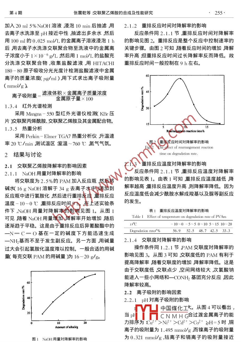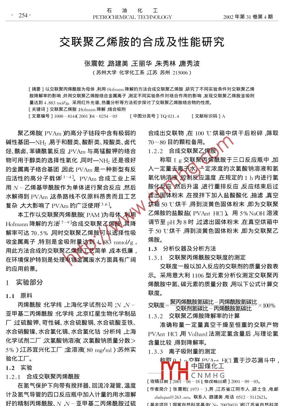 石油254●PETROCHEMICAL TECHNOLOGY2002年第31卷第4期交聯(lián)聚乙烯胺的合成及性能研究張震乾路建美王麗華朱秀林唐秀波(蘇州大學(xué)化學(xué)化工系江蘇蘇州215006)[摘要]以交聯(lián)聚丙烯酰胺為母體利用Hofmann降解的方法合成交聯(lián)聚乙烯胺研究了不同實(shí)驗(yàn)條件對(duì)交聯(lián)聚乙烯胺降解率的影響并用交聯(lián)聚乙烯胺絡(luò)合金屬離子測(cè)定不同實(shí)驗(yàn)條件對(duì)絡(luò)合作用的影響,發(fā)現(xiàn)交聯(lián)聚乙烯胺金吸附量達(dá)到4. 883 molgo采用紅外光譜、熱重分析等方法初步探討了交聯(lián)聚乙烯胺絡(luò)合物的性質(zhì)。[關(guān)鍵詞]交聯(lián)聚乙烯胺;Hofmann 降解絡(luò)合吸附[文章編號(hào)] 1000 - 8144 2001 )04 - 0254 -05[中圖分類號(hào)] TQ021.4[文獻(xiàn)標(biāo)識(shí)碼]A聚乙烯胺( PVAm )的高分子鏈段中含有極弱的合成出交聯(lián)物,在100 C烘箱中烘干后粉碎篩取堿性基團(tuán)一-NH2 易于和醛類、酸酐類、羧酸類、鹵代70~80目的顆粒備用。烴、酰鹵、苯磺酰氯反應(yīng),PVAm與高錳酸鉀的絡(luò)合1.2.2 合成交聯(lián)聚乙烯胺物可用于醇類的選擇性氧化,同時(shí)一-NH2還是很好稱取1 g交聯(lián)聚丙烯酰胺于三口反應(yīng)瓶中,加的金屬離子絡(luò)合基團(tuán),因此PVAm是-種新型有反入一定量去離子水、-定濃度的次氯酸鈉溶液和氫應(yīng)活性的高分子載體[1~4。PVAm合成工業(yè)上采氧化鈉溶液控制反應(yīng)溫度在規(guī)定的1 h內(nèi)進(jìn)行氯用N-乙烯基甲酰胺作為單體進(jìn)行聚合反應(yīng)然后胺化反應(yīng)然后升溫,進(jìn)行重排反應(yīng),反應(yīng)結(jié)束后過(guò)水解得到PVAm這條路線不僅原料昂貴而且工藝濾出固體粉末在攪拌下加入鹽酸酸化抽濾真空復(fù)雜,大大影響了PVAm的廣泛使用56。烘箱50C烘干得到淡黃色固體粉末,即為交聯(lián)聚本工作以交聯(lián)聚丙烯酰胺( PAM )為母體,利用乙烯胺的鹽i酸鹽( PVAm1 HCI)用5% NaOH溶液Hofmann降解的方法7~91合成交聯(lián)聚乙烯胺其降調(diào)節(jié)至pH為8時(shí)過(guò)濾出固體粉末在真空烘箱中解率可達(dá)70.5%同時(shí)交聯(lián)聚乙烯胺可以選擇性吸于50 C烘干得到淡黃色固體粉末,即為交聯(lián)聚乙收金屬離子,特別是金吸附量達(dá)到4. 883 mmol/g,烯胺。用此方法合成的交聯(lián)聚乙烯胺工藝簡(jiǎn)單成本低廉,1.3 分析儀器及分析方法在環(huán)境保護(hù)特別是處理電鍍金屬?gòu)U水方面具有廣闊1.3.1 交聯(lián)聚丙烯酰胺交聯(lián)度的測(cè)定交聯(lián)度--般以加入反應(yīng)的交聯(lián)劑的質(zhì)量分?jǐn)?shù)表的應(yīng)用前景。示。采用意大利1106型元素分析儀測(cè)定交聯(lián)聚丙1實(shí)驗(yàn)部分烯酰胺中氮、碳元素的質(zhì)量分?jǐn)?shù)用以下公式計(jì)算交.聯(lián)度。1.1原料聚丙烯酰胺氮碳比-丙烯酰胺氮碳比丙烯酰胺:化學(xué)純上?;瘜W(xué)試劑公司;N ,N-交聯(lián)度=年交聯(lián)劑氮碳比 二丙烯酰胺氮碳比x 100%亞甲基二丙烯酰胺:化學(xué)純北京紅星生物化學(xué)制品1.3.2交 聯(lián)聚乙烯胺降解率的計(jì)算廠過(guò)硫酸鉀、苛性堿、水合硫酸銅、水合硫酸亞鐵、準(zhǔn)確稱量-定量真空干燥至恒重的交聯(lián)產(chǎn)物水合硝酸鎳、水合氯化鎘、水合氯化鈷:分析純上海PVAm HCl ,用Volhard法測(cè)定氯含量后與理論氯化學(xué)試劑二廠;次氯酸 鈉溶液(次氯酸鈉質(zhì)量分?jǐn)?shù)>含量比較得到降解率。5% )江蘇宜興化工廠金溶液80 mg/ml ) :蘇州實(shí)1.3.3離子吸附量 的測(cè)定驗(yàn)化工廠。稱取n 1 η交聯(lián)PVAm1 HC1置于沙芯漏斗中1.2 實(shí)驗(yàn)中國(guó)煤化工1.2.1 合成交聯(lián)聚丙烯酰胺THCNMHG[收稿日期」2001-06- 181修改桐口期] 2001 - 09 - 05。在氮?dú)獗Wo(hù)下向帶有攪拌器、回流冷凝管、溫度[作者簡(jiǎn)介]張震乾( 1973- ),男,江蘇省江陰市人碩士生,電郵計(jì)及氮?dú)鈱?dǎo)管的四口反應(yīng)瓶中加入計(jì)量的用水溶解zhzhqian@263.neto 聯(lián)系人路建美電話0512 - 5112621。好的精制丙烯酰胺、N ,N -亞甲基二丙烯酰胺過(guò)硫[基金項(xiàng)目]國(guó)家自然科學(xué)基金(No.20076031)和江蘇省自然科學(xué)酸鉀溶液攬摔逐漸升溫至聚合溫度,保溫1 h ,即基金資助項(xiàng)目( No. BK99081》第4期張震乾等交聯(lián)聚乙烯胺的合成及性能研究255 .加入20ml5%NaOH溶液浸泡10min后抽濾,用2.1.2重排反應(yīng)時(shí)間對(duì)降解率的影響去離子水洗滌至pH接近中性抽濾出多余水然后反應(yīng)條件同2.1.1節(jié),重排反應(yīng)時(shí)間對(duì)降解率用100 ml的0.025 mol/L的金屬離子溶液浸泡1 h的影響見(jiàn)圖2。重排反應(yīng)是整個(gè)反應(yīng)中控制速率的后用去離子水洗滌交聯(lián)聚合物至洗液中的金屬離關(guān)鍵步驟。由圖2可知隨著反應(yīng)時(shí)間的增加降解子濃度小于1X 10 -6 g/L然后用1 mol/L的鹽酸充率升高;但重排反應(yīng)時(shí)間過(guò)長(zhǎng)降解率反而降低。故分洗滌交聯(lián)聚合物,收集鹽酸濾液,用HITACHI重排反應(yīng)時(shí)間一般控制在9 h左右。180-80原子吸收分光光度計(jì)檢測(cè)鹽酸濾液中金屬離子的質(zhì)量濃度(ug/ml),用下式求出離子吸附量( mmol/g)b .離子吸附量濾液體積x金屬離子質(zhì)量濃度金屬原子量x 1001.3.4 紅外光譜檢測(cè)30采用Mangna- 550型紅外光譜儀檢測(cè)( KBr壓片交聯(lián)聚丙烯酰胺、交聯(li