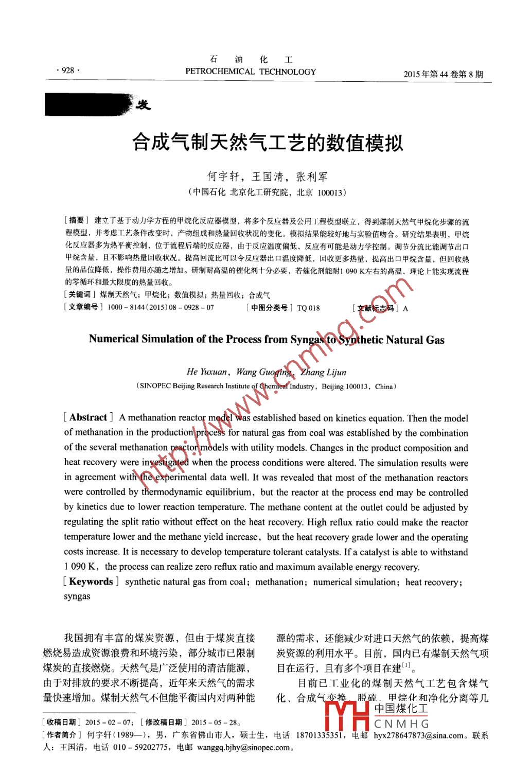 合成氣制天然氣工藝的數(shù)值模擬