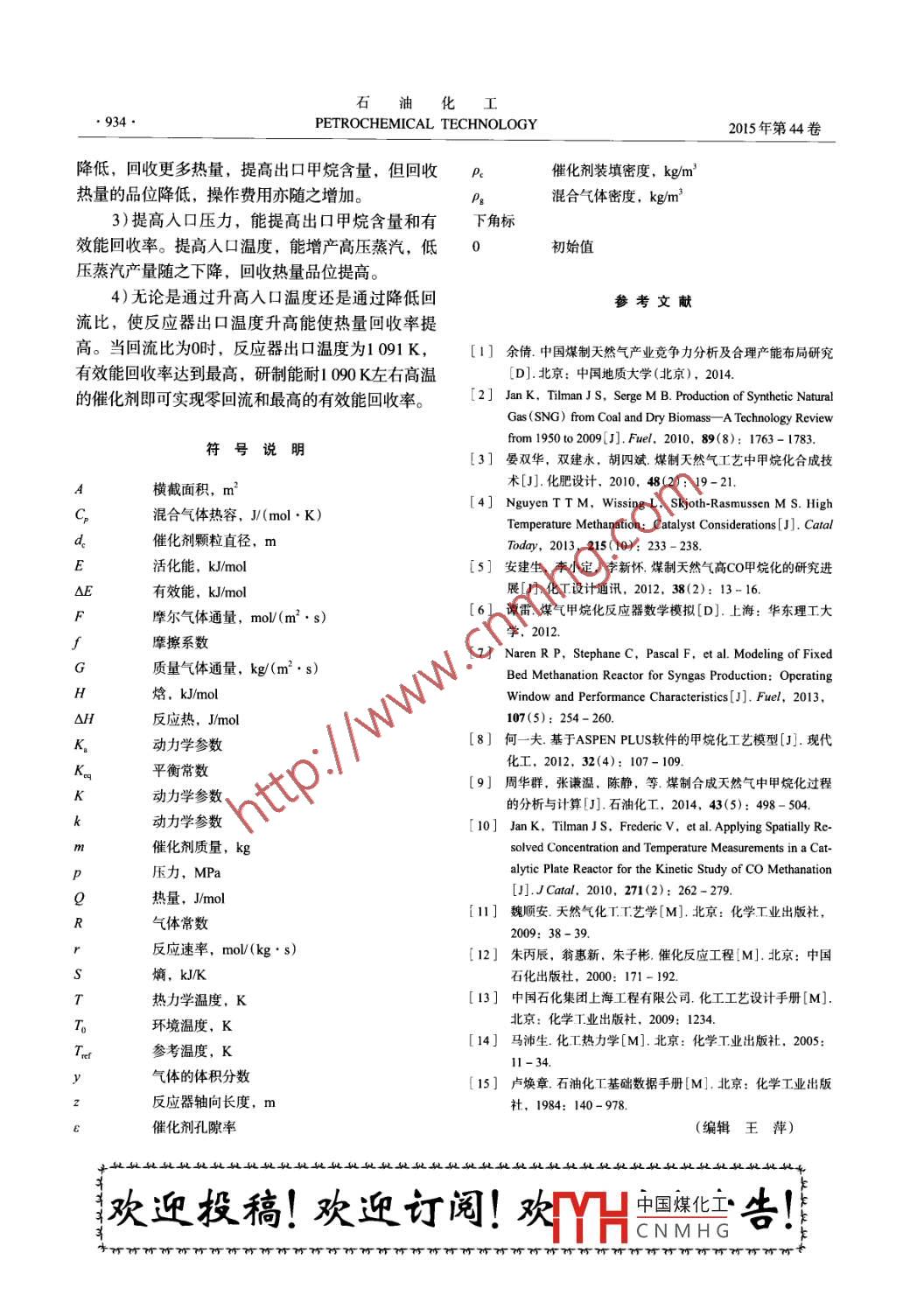 石油化工928PETROCHEMICAL TECHNOLOGY2015年第44卷第8期合成氣制天然氣工藝的數(shù)值模擬何宇軒,王國清,張利軍(中國石化北京化工研究院,北京100013)摘要]建立了基于動力學方程的甲烷化反應(yīng)器模型,將多個反應(yīng)器及公用工程模型聯(lián)立,得到煤制天然氣甲烷化步驟的流程模型,并考慮工藝條件改變時,產(chǎn)物組成和熱量回收狀況的變化。模擬結(jié)果能較好地與實驗值吻合。研究結(jié)果表明,甲烷化反應(yīng)器多為熱平衡控制,位于流程后端的反應(yīng)器,由于反應(yīng)溫度偏低,反應(yīng)有可能是動力學控制。調(diào)節(jié)分流比能調(diào)節(jié)出口甲烷含量,且不影響熱量回收狀況。提高回流比可以令反應(yīng)器岀口溫度降低,回收更多熱量,提高出口甲烷含量,但回收熱量的品位降低,操作費用亦隨之增加。研制耐高溫的催化劑十分必要,若催化劑能耐1090K左右的高溫,理論上能實現(xiàn)流程的零循環(huán)和最大限度的熱量回收。[關(guān)鍵詞]煤制天然氣;甲烷化;數(shù)值模擬;熱量回收;合成氣[文章編號]1000-8144(2015)08-0928-07中圖分類號]TQ018[文獻標志碼]ANumerical Simulation of the Process from Syngas to Synthetic Natural GasHe Yuxuan, Wang Guoqing, Zhang Lijun(SINOPEC Beijing Research Institute of Chemical Industry, Beijing 100013, China)Abstract] A methanation reactor model was established based on kinetics equation. Then the modelof methanation in the production process for natural gas from coal was established by the combinationof the several methanation reactor models with utility models. Changes in the product compositionheat recovery were investigated when the process conditions were altered. The simulation results wereagreement with the experimental data well. It was revealed that most of the methanation reactorswere controlled by thermodynamic equilibrium, but the reactor at the process end may be controlledby kinetics due to lower reaction temperature. The methane content at the outlet could be adjusted byregulating the split ratio without effect on the heat recovery. High reflux ratio could make the reactortemperature lower and the methane yield increase, but the heat recovery grade lower and the operatingcosts increase. It is necessary to develop temperature tolerant catalysts. If a catalyst is able to withstand1 090K, the process can realize zero reflux ratio and maximum available energy recoveryI Keywords synthetic natural gas from coal; methanation; numerical simulation; heat recovery我國擁有豐富的煤炭資源,但由于煤炭直接源的需求,還能減少對進口天然氣的依賴,提高煤燃燒易造成資源浪費和環(huán)境污染,部分城市已限制炭資源的利用水平。目前,國內(nèi)已有煤制天然氣項煤炭的直接燃燒。天然氣是廣泛使用的清潔能源,目在運行,且有多個項目在建由于對排放的要求不斷提高,近年來天然氣的需求目前已工業(yè)化的煤制天然氣工藝包含煤氣量快速增加。煤制天然氣不但能平衡國內(nèi)對兩種能化、合成′脫硫、甲烷化和凈化分離等幾中國煤化工「收稿日期]2015-02-07;[修改稿日期]2015-05-28CNMHG作者簡介]何宇軒(1989—),男,廣東省佛山市人,碩士生,電話187013333電郵hyx278647873@Ina.com。聯(lián)系人:王國清,電話010-5920275,電郵wang.bjhy@sinopec.com第8期何宇軒等合成氣制天然氣工藝的數(shù)值模擬個步驟2。因為除甲烷化步驟外的其他步驟已相生產(chǎn)中會接近或達到平衡,因此將該模型運用到反當成熟,故甲烷化步驟成為該工藝的核心,也是應(yīng)器的設(shè)計時需要對r的表達式作出修改,修改后研究的熱點。合成氣經(jīng)脫硫后,主要組分有CH得到式(3):CO,CO2,H2,HQ,還伴有少量的高級烴和惰性k, kepco(1+KCoH PooP, +KoH 5)(Keal Pco PH(3)氣體。合成氣進入甲烷化反應(yīng)器后,主要發(fā)生CO甲烷化反應(yīng)、CO變換反應(yīng)和CO2甲烷化反應(yīng)。動力學方程中的參數(shù)根據(jù)下式計算:甲烷化反應(yīng)為強放熱反應(yīng)3。對比合成氨和T乙烯裂解氣中微量CO的甲烷化,由于變換后的合k=exp(Ink, exp rt.(4)成氣中CO含量高達20%(q),因此煤制天然氣工藝△H-exp(Ink expL RT,(5)中甲烷化的難點在于如何將熱量快速移出并高效回收利用,以及低溫活性好、耐高溫催化劑的開1.2熱力學數(shù)據(jù)及物性參數(shù)發(fā)4。目前,工業(yè)化的甲烷化催化劑能承受700℃反應(yīng)熱由標準狀態(tài)下的反應(yīng)熱和指定溫度下的高溫。如何在控制反應(yīng)溫度的同時,設(shè)計反應(yīng)比熱容的變化計算得到。反應(yīng)平衡常數(shù)由式(6)和器和流程,盡可能地高品位回收反應(yīng)熱,是研究的式(7)計算得到。個方向。前人已對甲烷化反應(yīng)器和工藝流程模擬238294做了大量研究工作,所建立的模型基本能滿足設(shè)計7-33066nT-22103×10-37+或優(yōu)化的要求,所用反應(yīng)器模型為熱力學模型和動1.2881×1072-1.209910073-32538(6)4865.8力學模型參半,但少有工藝流程模型能同時考慮甲1.1187lnT+36574×107烷收率和熱量回收狀況1.2817×1072+28154×100T3+0.5886(7)本工作通過建立基于動力學方程的反應(yīng)器模合成氣中除反應(yīng)組分外,還帶有少量的惰性型,將多個反應(yīng)器模型、脫水塔模型和換熱器模型氣體N2和A。為方便計算,將所有惰性氣體當作聯(lián)立,得到煤制天然氣甲烷化步驟的流程模型,并N2處理。這些物質(zhì)的比熱容由帶溫度和壓力的方考慮工藝條件改變時產(chǎn)物組成和熱量回收狀況的變程式計算得到2,混合氣體的比熱容由各組分化,為反應(yīng)