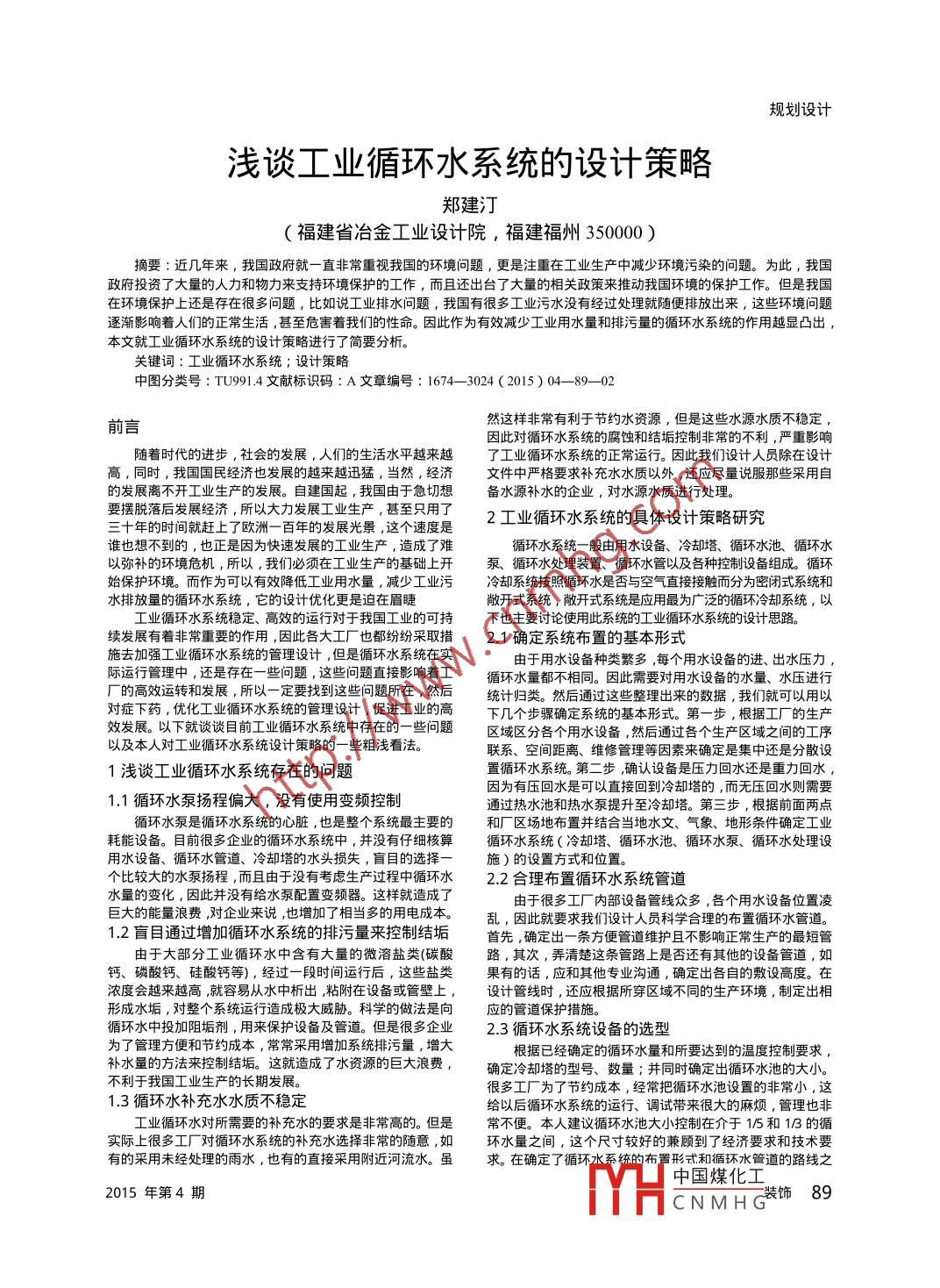 規(guī)劃設計淺談工業(yè)循環(huán)水系統的設計策略鄭建汀(福建省冶金工業(yè)設計院,福建福州350000 )摘要:近幾年來,我國政府就一直非常重視我國的環(huán)境問題,更是注重在工業(yè)生產中減少環(huán)境污染的問題。為此,我國政府投資了大量的人力和物力來支持環(huán)境保護的工作,而且還出臺了大量的相關政策來推動我國環(huán)境的保護工作。但是我國在環(huán)境保護上還是存在很多問題,比如說工業(yè)排水問題,我國有很多工業(yè)污水沒有經過處理就隨便排放出來,這些環(huán)境問題逐漸影響著人們的正常生活, 甚至危害著我們的性命。因此作為有效減少工業(yè)用水量和排污量的循環(huán)水系統的作用越顯凸出,本文就工業(yè)循環(huán)水系統的設計策略進行了簡要分析。關鍵詞:工業(yè)循環(huán)水系統;設計策略中圖分類號: TU991.4文獻標識碼: A文章編號: 1674- -3024 (2015)04- -89- -02 .然這樣非常有利于節(jié)約水資源,但是這些水源水質不穩(wěn)定前言因此對循環(huán)水系統的腐蝕和結垢控制非常的不利,嚴重影響隨著時代的進步, 社會的發(fā)展,人們的生活水平越來越了工業(yè)循環(huán)水系統的正常運行。因此我們設計人員除在設計高,同時,我國國民經濟也發(fā)展的越來越迅猛,當然,經濟文件中嚴格要求補充水水質以外, 還應盡量說服那些采用自的發(fā)展離不開工業(yè)生產的發(fā)展。自建國起,我國由于急切想備水源補水的企業(yè),對水源水質進行處理。要擺脫落后發(fā)展經濟,所以大力發(fā)展工業(yè)生產, 甚至只用了2工業(yè)循環(huán)水系統的具體設計策略研究三十年的時間就趕上了歐洲一百年的發(fā)展光景, 這個速度是誰也想不到的,也正是因為快速發(fā)展的工業(yè)生產, 造成了難循環(huán)水系統一般由用水設備、 冷卻塔、循環(huán)水池循環(huán)水以彌補的環(huán)境危機,所以,我們必須在工業(yè)生產的基礎上開泵、循環(huán)水處理裝置、循環(huán)水管以及各種控制設備組成。循環(huán)始保護環(huán)境。而作為可以有效降低工業(yè)用水量,減少工業(yè)污冷卻系統按照循環(huán)水是否與空氣直接接觸而分為密閉式系統和水排放量的循環(huán)水系統,它的設計優(yōu)化更是迫在眉睫敞開式系統,敞開式系統是應用最為廣泛的循環(huán)冷卻系統,以工業(yè)循環(huán)水系統穩(wěn)定、高效的運行對于我國工業(yè)的可持下也主要討論使用此系統的工業(yè)循環(huán)水系統的設計思路。續(xù)發(fā)展有著非常重要的作用, 因此各大工廠也都紛紛采取措2.1確定系統布置的基本形式.施去加強工業(yè)循環(huán)水系統的管理設計,但是循環(huán)水系統在實.由于用水設備種類繁多,每個用水設備的進、出水壓力,際運行管理中,還是存在一些問題,這些問題直接影響著工循環(huán)水量都不相同。因此需要對用水設備的水量、水壓進行廠的高效運轉和發(fā)展,所以一定要找到這些問題所在,然后統計歸類。然后通過這些整理出來的數據, 我們就可以用以對癥下藥,優(yōu)化工業(yè)循環(huán)水系統的管理設計,促進I業(yè)的高下幾個步驟確定系統的基本形式。第一步,根據工廠的生產效發(fā)展。以下就談談目前工業(yè)循環(huán)水系統中存在的一些問題區(qū)域區(qū)分各個用水設備, 然后通過各個生產區(qū)域之間的工序以及本人對工業(yè)循環(huán)水系統設計策略的一些粗淺看法。聯系、空間距離、維修管理等因素來確定是集中還是分散設1淺談工業(yè)循環(huán)水系統存在的問題置循環(huán)水系統。第二步,確認設備是壓力回水還是重力回水,因為有壓回水是可以直接回到冷卻塔的,而無壓回水則需要1.1循環(huán)水泵揚程偏大,沒有使用變頻控制通過熱水池和熱水泵提升至冷卻塔。第三步,根據前面兩點循環(huán)水泵是循環(huán)水系統的心臟,也是整個系統最主要的和廠區(qū)場地布置并結合當地水文、氣象、地形條件確定工業(yè)耗能設備。目前很多企業(yè)的循環(huán)水系統中, 并沒有仔細核算循環(huán)水系統(冷卻塔、循環(huán)水池、循環(huán)水泵、循環(huán)水處理設用水設備、循環(huán)水管道、冷卻塔的水頭損失,盲目的選擇一施)的設置方式和位置。個比較大的水泵揚程,而且由于沒有考慮生產過程中循環(huán)水2.2合理布置循環(huán)水系統管道水量的變化,因此并沒有給水泵配置變頻器。這樣就造成了由于很多工廠內部設備管線眾多, 各個用水設備位置凌巨大的能量浪費,對企業(yè)來說,也增加了相當多的用電成本。亂,因此就要求我們設計人員科學合理的布置循環(huán)水管道。1.2盲目通過增加循環(huán)水系統的排污量來控制結垢首先,確定出一條方便管道維護且不影響正常生產的最短管由于大部分工業(yè)循環(huán)水中含有大量的微溶鹽類(碳酸路,其次,弄清楚這條管路上是否還有其他的設備管道,如鈣、磷酸鈣、硅酸鈣等) ,經過一段時間運行后,這些鹽類果有的話,應和其他專業(yè)溝通,確定出各自的敷設高度。在濃度會越來越高,就容易從水中析出,粘附在設備或管壁上,設計管線時,還應根據所穿區(qū)域不同的生產環(huán)境,制定出相形成水垢,對整個系統運行造成極大威脅??茖W的做法是向應的管道保護措施。循環(huán)水中投加阻垢劑, 用來保護設備及管道。但