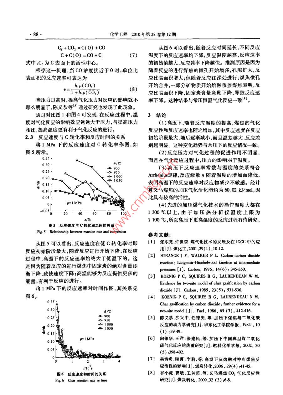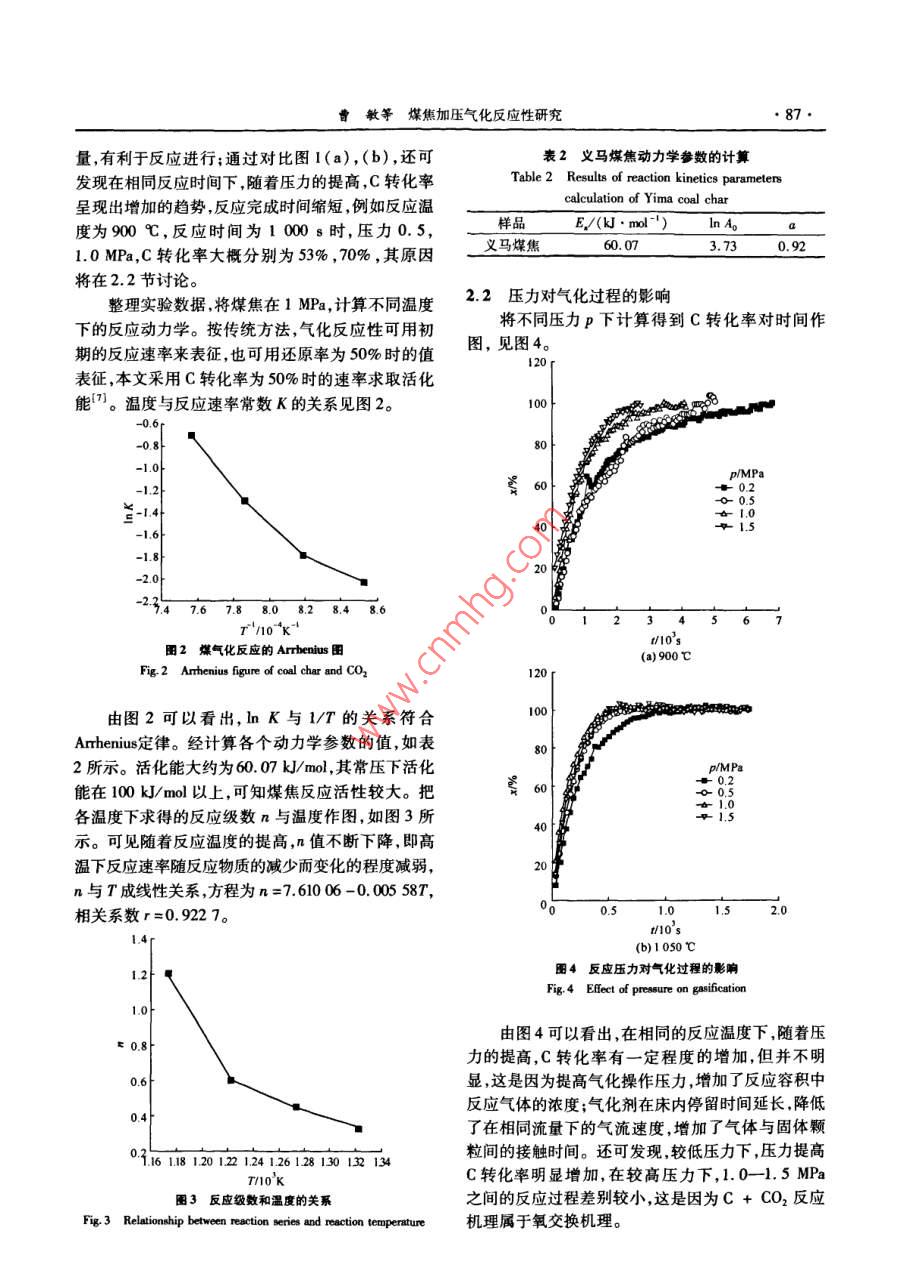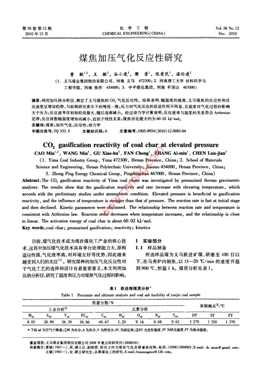 第38卷第12期化學(xué)工君Vol. 38 No. 122010年12月CHEMICAL ENGINEERING( CHINA)Dec. 2010煤焦加壓氣化反應(yīng)性研究曹敏'”,王敏’,谷小虎’,樊崇',張愛民',諶倫建“(1.義馬煤業(yè)集團(tuán)股份有限公司,河南義馬472300;2. 河南理工大學(xué)材料科學(xué)與工程學(xué)院,河南焦作454000; 3.中平能化集團(tuán),河南平頂山467000)摘要:利用加壓熱分析儀,測定了義馬煤焦的CO2氣化反應(yīng)性。結(jié)果表明:隨溫度的提高,義馬煤焦的反應(yīng)性和反應(yīng)速度呈增加趨勢,與前期研究常壓下的情況-致;壓力對氣化反應(yīng)的促進(jìn)作用不明顯,且溫度對氣化過程的影響大于壓力;反應(yīng)速率在初始階段最大,隨后逐漸減小。經(jīng)過動力學(xué)計(jì)算表明:反應(yīng)速率與溫度的關(guān)系符合Arhenius定律;反應(yīng)級數(shù)隨溫度增加而減小,近似于線性關(guān)系;煤焦活化能大約為60. 02 kJ/mol。關(guān)鍵詞:煤焦;加壓氣化;反應(yīng)性;動力學(xué)中圖分類號:TQ 533.5文獻(xiàn)標(biāo)識碼:A文章編號:1005-9954(2010) 12008504CO2 gasification reactivity of coal char at elevated pressureCAO Min'2, WANG Min', GU Xiao-hu', FAN Chong' , ZHANG Ai-min' , CHEN Lun-jian'(1. Yima Coal Industry Group, Yima 472300, Henan Province , China; 2. School of MaterialsScience and Engineering, Henan Polytechnic University, Jiaozuo 454000, Henan Province, China;3. Zhong Ping Energy Chemical Group, Pingdingshan 467000, Henan Province,China)Abstract:The CO2 gasification reactivity of Yima coal chars was investigated by pressurized thermo gravimetricanalyzer. The results show that the gasifcation reactivity and rate increase with elevating temperature, whichaccords with the preliminary studies under atmospheric condition. Elevated pressure is beneficial to gasificationreactivity, and the influence of temperature is stronger than that of pressure. The reaction rate is fast at initial stageand then declined. Kinetic parameters were discussed. The relationship between reaction rate and temperature isconsistent with Arrhenius law. Reaction order decreases when temperature increases,and the relationship is closeto linear. The activation energy of coal char is about 60. 02 kJ/mol.Key words: coal char; pressurized gasification; reactivity; kinetics目前,煤氣化技術(shù)成為現(xiàn)在煤化T產(chǎn)業(yè)的核心技1 實(shí)驗(yàn)部分術(shù),這其中加壓煤氣化技術(shù)具有單臺處理能力大,原料1.1樣品制備適應(yīng)性強(qiáng),氣化效率高,對環(huán)境友好等優(yōu)勢,因此越來所選樣品煤為義馬躍進(jìn)礦煤,研磨至100目以越受到人們的關(guān)注"。研究煤種的加壓氣化反應(yīng)性對下,在馬弗爐內(nèi)制焦,以15- -20 C/min的速度升溫于氣化工藝的選擇和設(shè)計(jì)有著重要意義,本文利用加到900 C ,恒溫1 h。煤質(zhì)分析見表1。.壓熱分析儀,研究了溫度和壓力對煤焦氣化過程的影響。表1躍進(jìn)煤煤質(zhì)分析'Table 1 Proximate and ultimate analysis and coal ash fusility of yuejin coal sample質(zhì)量分?jǐn)?shù)/%灰熔融點(diǎn)*/C工業(yè)分析中元素分析MAuVaFC.CNDTSTFT8.0528.90 26.39 36.66 49. 679.160.680.621 270I 320370*下標(biāo)ad為空氣+燥基;①M(fèi)為水分,A為灰分,V為揮發(fā)分.FC為固定炭;②DI為變形溫度,5T為軟化溫度,FT為流動溫度?;痦?xiàng)目:義馬煤業(yè)集團(tuán)股份有限公司2008年重點(diǎn)科研項(xiàng)月(2008018)作者簡介:曹敏(1967-).男,博士后.副教授.研究方向?yàn)槊禾繗饣懊夯坎牧?電話: (0398 )5898903. E-mil: dr. mceo@ gmail. com;王敏(1983--) ,女.碩士研究生.從事煤化工的研究. E-mail:hnjzwangmin@ 126. com?!?6.化學(xué)工程2010年第38卷第12期1.2實(shí)驗(yàn)方法In元=lnK+nln(1-x)(5)實(shí)驗(yàn)采用美國Thermo Cahn公司TherMax 500” du加壓熱分析儀,保護(hù)氣為N2 ,升溫階段反應(yīng)氣為N2,把ln和ln(1 -x)作圖得直線,截距為ln K,氣化時(shí)反應(yīng)氣為CO2。將義馬煤焦(40 mg左右)裝斜率為n。將式(4)兩邊取對數(shù)可得人坩堝中,以25C/min升至設(shè)定的反應(yīng)溫度,恒溫p(CO2)E,3 min待溫度穩(wěn)定后,迅速將反應(yīng)氣N2切換成CO2,lnK=lm[AoI+apCO,)] -RT(6)進(jìn)行氣化反應(yīng)。恒定氣化反應(yīng)溫度分別為900,把InK和1/T作圖得直線,截距為950,1 000,1 050 C ,反應(yīng)壓力分別為0.2,0.5,1.0,E.1.5 MPa。In[orapco,],斜率為-R°1.3 計(jì)算碳轉(zhuǎn)化率根據(jù)實(shí)驗(yàn)數(shù)據(jù)按式(1)計(jì)算氣化反應(yīng)C轉(zhuǎn)化率:2結(jié)果與討論mo-m,x= m[1 -w(H,0) -切、-wv](1)2.1溫度對氣化過程的影響將不同溫度θ下計(jì)算得到C轉(zhuǎn)化率對時(shí)間作式中:mo為氣化反應(yīng)初始質(zhì)量;m,為氣化反應(yīng)l時(shí)圖,見圖1??痰馁|(zhì)量;m為樣品初始質(zhì)量;w(H20)為樣品水分質(zhì)量分?jǐn)?shù),% ;w\為樣品灰分質(zhì)量分?jǐn)?shù), % ;wv為樣100品揮發(fā)分質(zhì)量分?jǐn)?shù),%。將x對相應(yīng)的反應(yīng)時(shí)間求一階微分,得到氣化80-θrC反應(yīng)速率等。瓷60-9001.4 計(jì)算反應(yīng)動力學(xué)參數(shù)4(古1000平1050反應(yīng)動力學(xué)方面,研究者(25)認(rèn)為C與CO2的反應(yīng)速率可用式(2)來表述。b,p(CO2)56"=1+b2p(CO) +bsp(CO2)(2)1/10s(a)0.5 MPa式中:為單位比表面積的反應(yīng)速率;p(CO2)和120rp(C0)為CO2和CO的分壓;b1,b2和b3分別為表面氧化物的分解生成CO并逸人氣相及CO的解吸等過程的個(gè)別階段的常數(shù)。但在反應(yīng)過程中反應(yīng)的8(比表面積是- -直變化的。e/C60本文采用向銀華等[6]研究提出模擬方程式,如"-900o 95