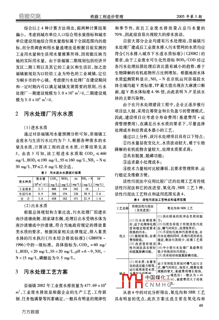 2005年第3期鐵路工程造價管理經(jīng)驗交流污水處理工藝選擇張雪濤(鐵道第三勘察設(shè)計院機械環(huán)工處,天津300251)商要:對適用于小城鎮(zhèn)污水處理工程的氧化溝和SBR工藝進行了詳細的技術(shù)經(jīng)濟比較,確定了崇福鎮(zhèn)污水處理廠的處理工藝方案。關(guān)鍵詞:污水處理;工藝選擇;氧化溝;SBR中圖分類號:TU992.25文獻標識碼:B文章 編號:1007 - 9890(2005 )03 -0048 -030概述比流量法、分類調(diào)查法和用水量遞增法4種方法進行計算。省略計算過程、列出計算結(jié)果見表1.表2。浙江省桐鄉(xiāng)市崇福鎮(zhèn)位于浙江北部杭嘉湖平原表1人口綜合法和面積比流法計算結(jié)果中部,東臨嘉興市秀洲區(qū),南接海寧市,西界德清縣、項目人口綜合法面 積比流量法單位近期「中期近期中期余杭區(qū),西北與湖州市毗連,北與江蘇省吳江市接壤。(2005 (2010(200年)(2010年)人口規(guī)模近期為3.5~4萬人(2000 ~2005年),預(yù)測人口萬人4.0 5.5中期為5~5.5萬人(2006 ~2010年)、遠期為7~8萬皇綜合用水量no0m2/面積km2_|.4.16I5.64.人(2011 ~ 2020年)。崇福鎮(zhèn)水網(wǎng)密集,水域面積達來0.75| 0.8水指標(萬人.d)9.56% ,平均過境流量為23. 3 m'/s。森綜合用水量1o'm2/0.75 0.90隨著崇福鎮(zhèn)工業(yè)的加速發(fā)展和城市化水平的不指標(km2 :d)給水量10*m2/d 3.0 4.4 3.12 I 5.0斷提高,工業(yè)廢水和生活污水量也在同步增加,導(dǎo)致自備水源給水量 10m2/d 0.76 T 0.97 0.76 0.97水環(huán)境質(zhì)量的不斷惡化。目前存在的主要問題是,產(chǎn)污率%90)090 9周邊地區(qū)水環(huán)境不斷惡化;鄉(xiāng)鎮(zhèn)工業(yè)的迅速發(fā)展,造載污率808530 8總變化系數(shù)1.30 1.25 I 1.301.25成污水排放量增加;污水治理設(shè)施遠滯后于經(jīng)濟發(fā)污水量10*m'/dl 2.08 3.29 2.15 3.70展與城市化的進程速度。根據(jù)崇福鎮(zhèn)城鎮(zhèn)總體規(guī)劃表2分類調(diào)查法和用水遞增法計算結(jié)果和環(huán)境保護規(guī)劃,以可持續(xù)發(fā)展為核心,環(huán)境綜合治理為手段,實現(xiàn)生態(tài)保護與經(jīng)濟發(fā)展相協(xié)調(diào)的戰(zhàn)略方法單位近期中期| (2005年) (2010年)目標,把崇福鎮(zhèn)建設(shè)成經(jīng)濟繁榮、生態(tài)環(huán)境優(yōu)美、空排污量10*m'/d2.183. 20氣清新、水質(zhì)潔凈的城鎮(zhèn)。按照總體規(guī)劃,2005年截污率水「10*m2/d2.002. 88以前,工業(yè)廢水處理率要達到100% ,處理達標率為4.05.595%;市政污水集中處理率要達到60%;地面水質(zhì)用水定額L(人 .d)200280達標率為60%。在此背景下,我們承擔了崇福鎮(zhèn)污查污9)0_層水水綜合治理工程的可行性研究工作。10*m/d0.581.18綜_ 工業(yè)污水量2.881污水處理廠污水量的計算拿生活污水量10*m3/d0.58 .綜合污水量2.584.068該污水處理廠污水量可采用人口綜合法、面積中國煤化工1.381.36MYHCNMHG_3.486.04收稿日期:2004-12 -7作者簡介:張雪濤(1971- -) ,男,天津人,工程師,1994年畢業(yè)于蘭州法鐵道學(xué)院,現(xiàn)從事給排水設(shè)計工作。2.504.6248經(jīng)驗交流鐵路工程造價管理2005年第3期綜合以上4種計算方法得出,前兩種計算結(jié)果和季 節(jié)性,而且工業(yè)廢水排放量占總污水量的偏小??紤]到城市單位人口綜合用水量指標和城市70% ,因此很容易出現(xiàn)較大的排水波動。單位建設(shè)用地綜合用水量指標屬于全國范圍內(nèi)的指目前大部分企業(yè)均建有污水處理站,崇福鎮(zhèn)污標,而分類調(diào)查和用水量遞增法是根據(jù)目前實測的水處理廠建成后工業(yè)廢水排人污水管網(wǎng)的水質(zhì)均應(yīng)工業(yè)用水量和生活用水量推算所得,因而能反映當符合《污水排入城市下水道水質(zhì)標準》( CJ3082 )的地的實際用水量。由于崇福鎮(zhèn)二期規(guī)劃包括經(jīng)濟開要求,由于工業(yè)廢水可生化性指標BOD,/COD經(jīng)過發(fā)區(qū)二期工程以及其它的工業(yè)區(qū)和生活區(qū),加之崇各污水處理站預(yù)處理后該比值有減小的趨勢,難于福鎮(zhèn)被規(guī)劃為以輕紡工業(yè)為特色的工業(yè)城鎮(zhèn),定位生物降解的有機底物所占比例增加。根據(jù)地面水體為桐鄉(xiāng)市的中心鎮(zhèn)??紤]使污水處理廠在建設(shè)期間水質(zhì)監(jiān)測資料顯示,NH - N在京杭運河崇福段水和一定時期內(nèi)可以滿足城鎮(zhèn)發(fā)展需要的原則,污水體全域均超V類標準,TP最大值出現(xiàn)在大麻渡口斷處理廠-期建設(shè)規(guī)模為3.0x 10* m'/d,二期建設(shè)規(guī)面,超V類水體標準4.96倍,由此表明N、P是該水模為5.0x10* m'/d。體的主要污染物。.由于在污水處理建設(shè)工程中,企業(yè)正逐步推行項目法人制,采用自籌資金和自負盈虧的管理模式。2污水 處理廠污水水質(zhì)因此,建設(shè)項目應(yīng)考慮全壽命費用(基建費用+運營管理費用) ,在滿足出水水質(zhì)的要求下,盡量選擇(1)進水水質(zhì)通過對崇福鎮(zhèn)用水量預(yù)測分析可知,崇福鎮(zhèn)工處理成本和經(jīng)營成本最小的工藝。通過以上分析,該污水處理項目具有以下特點:業(yè)廢水與生活污水比約為7:3,根據(jù)各種廢水的水①污水量晝夜變化大,水質(zhì)波動較大,難于生物量及水質(zhì),計算該工程的進水水質(zhì),計算結(jié)果見表降解的有機底物含量較大,處理水質(zhì)要求高;3。由表3可知,該工程進水水質(zhì)取COD?!?60②具有脫氮脫磷功能;mg/L、BOD,≤190 m