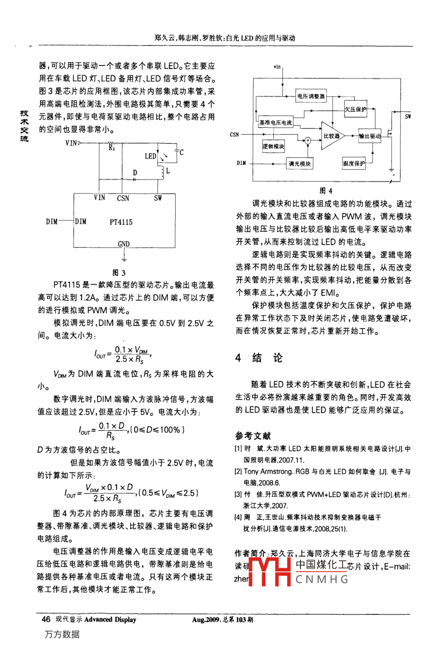 鄭久云韓志剛,羅勝欽:白光LED的應(yīng)用與驅(qū)動(dòng)文章編號(hào):1006-6268(200908-0043-04白光LED的應(yīng)用與驅(qū)動(dòng)技術(shù)交鄭久云,韓志剛,羅勝欽上海同濟(jì)大學(xué)電子與信息學(xué)院,上海201800)摘要:隨著地球能源的不斷消耗和人們對(duì)綠色產(chǎn)品的追求,高效無(wú)污染的白光LED越來(lái)越受到人們的青睞。文中討論了白光LED的幾種主要驅(qū)動(dòng)方式,并以PT4115驅(qū)動(dòng)芯片為例闡逑開(kāi)關(guān)電源驅(qū)動(dòng)電路的原理與應(yīng)用關(guān)鍵詞:白光LED;開(kāi)關(guān)電源;PWM調(diào)光中圖分類(lèi)號(hào):TN431文獻(xiàn)標(biāo)識(shí)碼:AThe Application and Driver of White-light LEDZHENG Jiu- Yun, HAN Zhi-gang, LUO Sheng-qinCollege of Electronics and information Engineering, Tongji University,Shanghai 201800, China)Abstract: With the constant consumption of energy and the people' s pursuit of the greenproduct, LED becomes more and more popular In this article we will describe severalmethods of driving white LEDs and theory of driver used in switching power with PT4115Keywords: white-light LED; switching power; PWM dimming1LED的應(yīng)用性,使LED可以直接嵌入到產(chǎn)品之中,而無(wú)須考慮更換。因?yàn)樵谶@個(gè)時(shí)間內(nèi),很多東西都已經(jīng)要報(bào)廢處理,LED照明被稱(chēng)為第4代照明技術(shù),正以飛快的所以可以大大簡(jiǎn)化一些產(chǎn)品的設(shè)計(jì);另外,無(wú)污染,無(wú)速度向前發(fā)展。LED如此受到人們的青睞,是由于它輻射。白光LED中不含汞等有害重金屬,可以回收利所具備的各項(xiàng)優(yōu)點(diǎn)正符合了現(xiàn)在人們的追求。第一用,而且無(wú)輻射是真正的綠色光源LED具有很高的效率。由于能源的不斷消耗,人們對(duì)由于這些優(yōu)點(diǎn),LED正不斷地應(yīng)用到社會(huì)的各高效的產(chǎn)品顯然更感興趣。在傳統(tǒng)照明中普遍應(yīng)用白個(gè)領(lǐng)域之中。熾燈而白熾燈的熱損耗高達(dá)95%,大部分的電能轉(zhuǎn)LED指示燈市場(chǎng)。這是LED最常規(guī)最普遍變成了熱能而耗散掉。在后來(lái)應(yīng)用的熒光燈中功率的應(yīng)用之一,這個(gè)市場(chǎng)的需求量大,但是對(duì)LED的損耗仍高達(dá)80%。而隨著LED不斷地發(fā)展,現(xiàn)在它質(zhì)量要求一般不是很高價(jià)格比較便宜;的效率已經(jīng)可以達(dá)到80%以上,極大提高了能源的顯示屏市場(chǎng)。這個(gè)市場(chǎng)是LED的主要應(yīng)用利用率;第二,超長(zhǎng)的壽命。LED在適當(dāng)?shù)碾娏骱碗娛袌?chǎng)中國(guó)煤化工站廣場(chǎng)等各個(gè)地壓下工作,使用壽命可以長(zhǎng)達(dá)10萬(wàn)小時(shí)。這也是常規(guī)方比較好,因此價(jià)格照明用燈所無(wú)法比擬的一個(gè)優(yōu)勢(shì)。這樣的長(zhǎng)壽命特會(huì)CNMH、,在也很活躍,整體市場(chǎng)超過(guò)指示燈市場(chǎng)。憑借著獨(dú)特優(yōu)勢(shì),LED全彩顯收稿日期:2009-06-09g20,0第103期現(xiàn)代顯示 Advanced Display43鄭久云韓志剛羅勝欽:白光LED的應(yīng)用與驅(qū)動(dòng)示屏廣泛應(yīng)用在體育場(chǎng)館、市政廣場(chǎng)、演唱會(huì)、車(chē)站、這個(gè)市場(chǎng)之中?,F(xiàn)在,在一些諸如酒店、商務(wù)會(huì)館、高機(jī)場(chǎng)等場(chǎng)所檔商用寫(xiě)字樓等商用場(chǎng)所已有所應(yīng)用。三、背光源市場(chǎng)。中大尺寸將成為新關(guān)注點(diǎn)。LED早已應(yīng)用在以手機(jī)為主的小尺寸液晶面板背光市場(chǎng)2LED的驅(qū)動(dòng)與調(diào)光技中,手機(jī)產(chǎn)量的持續(xù)增長(zhǎng)帶動(dòng)了背光源市場(chǎng)的發(fā)展交彩屏手機(jī)的出現(xiàn)更是推動(dòng)了白光LED市場(chǎng)的快速發(fā)目前,作為光源使用的主要有 RGB LED和白光展。但隨著手機(jī)產(chǎn)量進(jìn)入平穩(wěn)增長(zhǎng)階段以及技術(shù)提升LED。基于不同的原理,它們的驅(qū)動(dòng)方案有所不同,導(dǎo)致用于手機(jī)液晶面板背光源的LED數(shù)量減少,使因此在應(yīng)用設(shè)計(jì)時(shí),必須考慮采用哪種LED。前者相得LED在手機(jī)背光源中用量增速放緩,加上平均價(jià)比后者,有更廣的色譜,因此在顯示屏上能夠更好地格的不斷下降,最終導(dǎo)致小尺寸背光源市場(chǎng)增長(zhǎng)乏還原圖像的原貌,但同時(shí)也使得驅(qū)動(dòng)方案更復(fù)雜和力?,F(xiàn)在LED已經(jīng)應(yīng)用于筆記本電腦的背光源和大代價(jià)龐大。在價(jià)格敏感的產(chǎn)品中,采用白光LED其屏幕彩色電視的背光源,中大尺寸背光源市場(chǎng)雖為廠實(shí)也是可以接受的方案。事實(shí)上,目前市場(chǎng)上的產(chǎn)品商新寵,但是目前規(guī)模還不是很大,需要在技術(shù)繼續(xù)也是以白光LED為主。下面我們主要探討白光LED突破、價(jià)格繼續(xù)下降后,規(guī)模將逐漸擴(kuò)大;的驅(qū)動(dòng)四、汽車(chē)市場(chǎng)。目前LED在汽車(chē)上的應(yīng)用最主要的還是在汽車(chē)內(nèi)部,比如內(nèi)部指示燈、儀表盤(pán)、閱21恒流驅(qū)動(dòng)和恒壓驅(qū)動(dòng)讀燈等。但是如果能把LED應(yīng)用到汽車(chē)的尾燈和前白光LED本質(zhì)上是一個(gè)二極管結(jié)構(gòu),流過(guò)的電壓燈上,市場(chǎng)將是巨大的。但是從目前來(lái)看,尾燈和前和電流之間有著典型的指數(shù)關(guān)系。在器件導(dǎo)通后,端電燈的應(