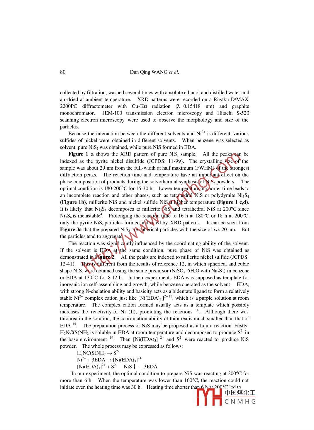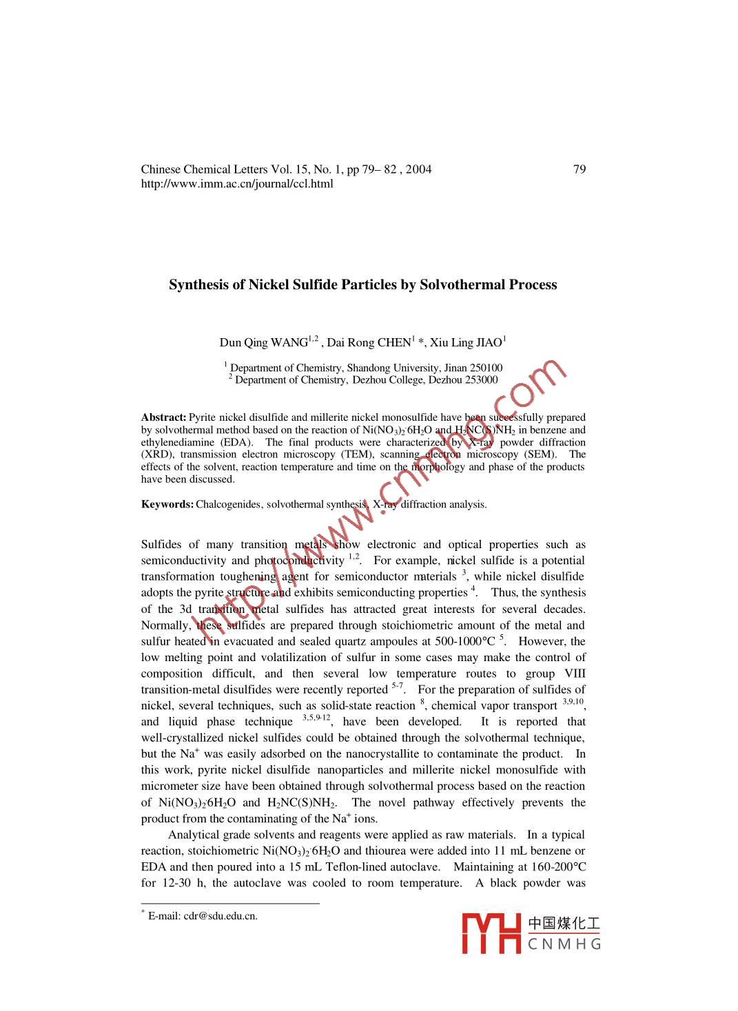 Chinese Chemical Letters Vol. 15, No. 1, pp 79- 82 , 200479htp://ww.imm.ac. cn/journal/ccl.htmlSynthesis of Nickel Sulfide Particles by Solvothermal ProcessDun Qing WANG.2 , Dai Rong CHEN' *, Xiu Ling JIAO'Department of Chemistry, Shandong University, Jinan 250100Department of Chemistry, Dezhou College, Dezhou 253000A bstract: Pyrite nickel disulfide and millerite nickel monosulfide have been successfully preparedby solvothermal method based on the reaction of Ni(NO3)26H2O and H2NC(S)NH2 in benzene andethylenediamine (EDA). The final products were characterized by X-ray powder diffraction(XRD), transmission electron microscopy (TEM), scanning electron microscopy (SEM). Theeffects of the solvent, reaction temperature and time on the morphology and phase of the productshave been discussed.Keywords: Chalcogenides, solvothermnal synthesis, X-ray diffaction analysis.Sulfides of many transition metals show electronic and optical properties such assemiconductivity and photoconductivity 12 For example, nickel sulfide is a potentialtransformation toughening agent for semiconductor materials 3, while nickel disulfideadopts the pyrite structure and exhibits semiconducting properties . Thus, the synthesisof the 3d transition metal sulfides has attracted great interests for several decades.Normally, these sulfides are prepared through stoichiometric amount of the metal andsulfur heated in evacuated and sealed quartz ampoules at 500-1000°C 5. However, thelow melting point and volatilization of sulfur in some cases may make the control ofcomposition difficult, and then several low temperature routes to group VIIItransition-metal disulfides were recently reportedFor the preparation of sulfides ofnickel, several techniques, such as solid-state reaction 8, chemical vapor transport 39.10,and liquid phase technique 35,9-12, have been developed.t is reported thatwell-crystallized nickel sulfides could be obtained through the solvothermal technique,but the Na+ was easily adsorbed on the nanocrystallite to contaminate the product. Inthis work, pyrite nickel disulfide nanoparticles and millerite nickel monosulfide withmicrometer size have been obtained through solvothermal process based on the reactionof Ni(NO3)26H2O and H2NC(S)NH2. The novel pathway effectively prevents thproduct from the contaminating of the Nat ions.Analytical grade solvents and reagents were applied as raw materials. In a typicalreaction, stoichiometric Ni(NO3)2 6H2O and thiourea were added into 11 mL benzene orEDA and then poured into a 15 mL Teflon- lined autoclave. Maintaining at 160-200°Cfor 12-30 h, the autoclave was cooled to room temperature. A black powder wasE-mail: cdr@ sdu.edu.cn.中國(guó)煤化工MHCNMH G.80Dun Qing WANG et al.collected by filtration, washed several times with absolute ethanol and distilled water andair-dried at ambient temperature.XRD patterns were recorded on a Rigaku D/MAX2200PC diffractometer with Cu-Ka radiation (n=0.15418 nm) and graphitemonochromator. JEM- 100 transmission electron microscopy and Hitachi S-520scanning electron microscopy were used to observe the morphology and size of theparticles.Because the interaction between the different solvents and N4 + is different, varioussulfides of nickel were obtained in different solvents. When benzene was selected assolvent, pure NiS2 was obtained, while pure NiS formed in EDA.Figure 1 a shows the XRD pattern of pure NS2 sample. All the peaks can beindexed as the pyrite nickel disulfide (JCPDS: 11-99). The crystalline size of thesample was about 29 nm from the full-width at half maximum (FWHM) of the strongestdiffraction peaks. The reaction time and temperature have an important effect on thephase composition of products during the solvothermal synthesis of NiS2 powders. Theoptimal condition is 180-200°C for 16-30 h. Lower temperature or shorter time leads toan incomplete reaction and other phases, such as tetrahedral Nis or polydymite NisS4(Figure 1b), millerite Nis and nickel sulfide NiS at higher temperature (Figure 1 c,d).It is likely that NisS4 decomposes to millerite NiS and tetrahedral Nis at 200°C sinceNisS4 is metastable'. Prolonging the reaction time to 16h at 180°C or 18 h at 200°C,only the pyrite NiS2 particles formed indicated by XRD patterns. It can be seen fromFigure 3a that the prepared NiS2 are spherical particles with the size of ca. 20 nm. Butthe particles tend to aggregate.The reaction was significantly influenced by the coordinating ability of the solvent.If the solvent is EDA at the same condition, pure phase of NiS was obtained asdemonstrated in Figure 2. All the peaks are indexed to millerite nickel sulfide (JCPDS:12-41). This is different from the results of reference 12, in which spherical and cubicshape NiS2 were obtained using the same precursor (NiSO4 6H2O with Na2S3) in benzeneor EDA at 130°C for 8-12 h. In their experiments EDA was supposed as template forinorganic ion self-assembling and growth, while benzene operated as the solvent. EDA,with strong N-chelation ability and basicity acts as a bidentate ligand to form a relativelystable Ni2+ complex cation just like [Ni(EDA);]2+13, which is a purple solution at roomtemperature. The complex cation formed usually acts as a template which possiblyincreases the reactivity of Ni (I), promoting the reactions 14. Although there wasthiourea in the solution, the coordination ability of thiourea is much smaller than that ofEDA 15. The preparation process of NiS may be proposed as a liquid reaction: Firstly,H2NC(S)NH2 is soluble in EDA at room temperature and decomposed to produce S- inthe base environment 16. Then [Ni(EDA)3] 2+ and S- were reacted to produce NiSpowder.The whole process may be expressed as follows:H2NC(S)NH2→s2Ni2+ + 3EDA→[Ni(EDA)3]2+[Ni(EDA)3]2++S2-NiS↓+ 3EDAIn our experiment, the optimal condition to prepare NiS was reacting at 200°C formore than 6 h. When the temperature was lower than 160°C, the reaction could notinitiate even the heating time was 30 