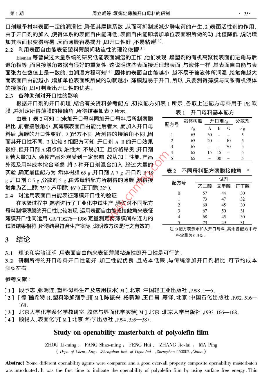 第17卷第1期鄭州輕工業(yè)學(xué)院學(xué)報(bào)(自然科學(xué)版)Vol.17 No.12002年3月JOURNAL OF ZHENGZHOU INSTTTUTE OF LICHT INDUSTRY( Natural Science )Mar. 2002文章編號(hào):1004- 1478( 2002 )1 - 0034- 02聚烯烴薄膜開(kāi)口母料的研制周立明,方少明,馮輝,張結(jié)來(lái),麻平(鄭州輕工業(yè)學(xué)院化學(xué)工程系河南鄭州450002 )摘要通過(guò)對(duì)不同開(kāi)口劑的試驗(yàn)比較研制開(kāi)發(fā)出-種開(kāi)口性能好、價(jià)格低廉、加工性能優(yōu)良的復(fù)合開(kāi)口母料.首次探索性地采用表面自由能的概念來(lái)表征塑料薄膜間的粘連性在理論及實(shí)際生產(chǎn)中都得到了驗(yàn)證.關(guān)鍵詞聚烯烴薄膜開(kāi)口母料表面自由能中圖分類(lèi)號(hào):TQ314.24*5.9文獻(xiàn)標(biāo)識(shí)碼:A0引言塑料母料是塑料助劑的濃縮物是80年代發(fā)展起來(lái)的一種新的配方材料.使用母料是將傳統(tǒng)的助劑直接加入方式改為間接加入,即將加入樹(shù)脂中的塑料助劑先加入到特定的載體樹(shù)脂中制成含高濃度助劑的粒料然后將該粒料加入到各種加工樹(shù)脂中制得產(chǎn)品.與傳統(tǒng)的助劑加入方式相比使用母料有利于助劑在樹(shù)脂中均勻分散簡(jiǎn)化助劑加入樹(shù)脂中的混合工序改善勞動(dòng)環(huán)境并且可節(jié)省貴重助劑的用量[ 1].開(kāi)口母料亦稱(chēng)抗粘母料常用于生產(chǎn)薄膜制品防止薄膜間相互粘連.如聚烯烴類(lèi)樹(shù)脂分子極性小吸水率低,在成膜時(shí)膜與膜間易形成密合狀態(tài)不易打開(kāi)在工業(yè)化生產(chǎn)中會(huì)嚴(yán)重影響自動(dòng)包裝效率加入開(kāi)口母料即可解決上述問(wèn)題.筆者擬通過(guò)對(duì)不同開(kāi)口劑的比較研制一種綜合性能優(yōu)良的開(kāi)口母料并探討一種新的表征薄膜間粘連性的方法.1試驗(yàn)1.1原料LDPE齊魯石油化工股份有限公司塑料廠產(chǎn);開(kāi)口劑A ,市售;開(kāi)口劑B市售;開(kāi)口劑C市售;H-st 工業(yè)級(jí)市售正丁醇分析純;乙二醇分析純苯甲醇分析純.1.2試驗(yàn)設(shè)備GH- -10高速混合機(jī)北京塑料機(jī)械廠產(chǎn)SK- -1608 雙輥混煉機(jī)r上海橡膠機(jī)械廠產(chǎn)SSJ- 25 x 25擠出機(jī),上海輕機(jī)模具廠產(chǎn);JY- -82 接觸角測(cè)定儀承德試驗(yàn)機(jī)廠產(chǎn),TE- -35 雙螺桿擠出機(jī)南京科亞塑料機(jī)械廠產(chǎn).1.3薄膜開(kāi)口性表征定性表征用觀察法;定量表征用薄膜表面自由能.2結(jié)果 與討論2.1開(kāi)口劑的開(kāi)口機(jī)理LDPE膜表面間粘閉性強(qiáng)在生產(chǎn)和貯存過(guò)程中會(huì)因受壓而粘連在-起使薄膜不易離開(kāi)給自動(dòng)高速包裝帶來(lái)困難.發(fā)生粘連的原因目前尚不清楚有人認(rèn)為是樹(shù)脂中所含的低分子物質(zhì)擴(kuò)散、滲出到薄膜表面受熱受壓后造成粘連也有人認(rèn)為粘連是由于靜電或過(guò)于光滑的薄膜表面之間形成真空所致2].開(kāi)口劑在薄膜中所起的作用主要包括以下幾個(gè)方面: )-定的抗靜電作用.由于開(kāi)口劑本身具有活性,且與樹(shù)脂間相容性較差,因而主要富集于塑料薄膜表面在表面形成-層膜,從而可防止靜電蓄積.同時(shí)開(kāi)收稿日期2002 - 01-20作者簡(jiǎn)介周立明1972- ) 男山東省萊陽(yáng)市人鄭州輕工業(yè)學(xué)院講師主要從事功能高分子材料研究;萬(wàn)方張結(jié)來(lái)麻平系鄭州輕工業(yè)學(xué)院化學(xué)工程系高分子材料專(zhuān)業(yè)2001屆畢業(yè)生.第1期周立明等聚烯烴薄膜開(kāi)口母料的研制口劑賦予材料表面-定的潤(rùn)滑性降低其摩擦系數(shù),從而可抑制或減少靜電荷的產(chǎn)生.2表面活性劑的作用.由于開(kāi)口劑的加入使得體系的表面自由能降低.表面自由能即增加單位表面積所做的功此值降低說(shuō)明增加其表面積變得容易,因而薄膜容易揭開(kāi)即開(kāi)口性好不易粘連2].2.2利用表面自由能表征塑料薄膜間粘連性的理論依據(jù)3]Eisman等曾做過(guò)大量系統(tǒng)的研究低能表面潤(rùn)濕的工作他們發(fā)現(xiàn)增塑劑的有機(jī)高聚物表面前進(jìn)角與后退角相等,而且接觸角數(shù)據(jù)有很好的重復(fù)性.這說(shuō)明這些表面接近理想表面與液體-樣其表面自由能與表面張力在數(shù)值.上是一致的.由潤(rùn)濕方程可知4]固體的表面自由能越小越不易于被液體所潤(rùn)濕接觸角越大而表面自由能越小增加單位表面積所做的功就越小薄膜越易于開(kāi)口.所以,只要測(cè)得薄膜與同系有機(jī)液體的接觸角,即可判斷出開(kāi)口性的優(yōu)劣.2.3各種助劑對(duì)開(kāi)口性的影響根據(jù)開(kāi)口劑的開(kāi)口機(jī)理結(jié)合有關(guān)資料參考配方初擬配方如表1所示.各取上述配方母料用于PE吹膜并測(cè)定所得薄膜的接觸角所得結(jié)果如表2所示.表1 開(kāi)口母料基本配方由表1表2可知:未加開(kāi)口母料同加開(kāi)口母料后所制薄膜載體樹(shù)脂開(kāi)口劑/g分 散劑相比前者接觸角小其薄膜表面自由能比后者大,而加入開(kāi)口母配方號(hào)/\BC料后薄膜的開(kāi)口性變好.2 )配方不同所測(cè)得的接觸角不同,因6:30而其開(kāi)口性不同.3比較5組配方可知開(kāi)口劑A B的開(kāi)口效果22065很好.但開(kāi)口劑A熔點(diǎn)低油性大不易加工,且價(jià)格昂貴開(kāi)口劑15 15B若大量加入會(huì)使產(chǎn)品外觀受
