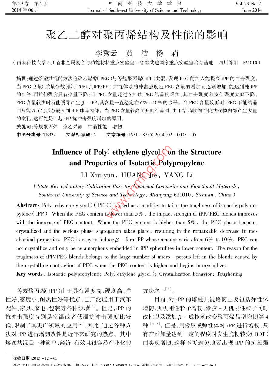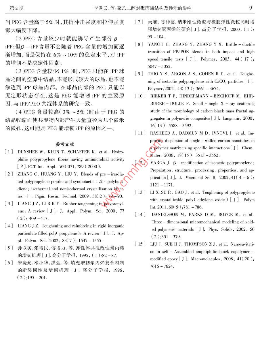 第29卷第2期西南科技大學學Vol 29 No. 22014年06月Journal of Southwest University of Science and TechnologyJune 2014聚♂二醇對聚丙烯結(jié)構(gòu)及性能的影響李秀云黃潔楊莉西南科技大學四川省非金屬復合與功能材料重點實驗室-省部共建國家重點實驗室培育基地四川綿陽621010)摘要:通過熔融共混的方法將聚乙烯醇(PEG)與等規(guī)聚丙烯(iP)共混,發(fā)現(xiàn)PEG的加入能提高iP的沖擊強度,當PEG含量(質(zhì)量分數(shù))低于5%時, PP/PEG共混體系的沖擊強度隨PEG含量的增加而逐漸增加,能達到純iPP的2倍,而拉伸強度只有少量下降;當PEG含量超過5%時,PEG結(jié)晶度增加,其沖擊強度和拉伸強度大幅下降。PEG含量較少時就能誘導產(chǎn)生B-iP,其含量一直穩(wěn)定在6%~10%的水平。當PEG含量較低時,PEG不能結(jié)晶而只能以無定形態(tài)嵌入到iPP球晶內(nèi)部。當PEG含量較高而開始結(jié)晶時,由于結(jié)晶收縮而使共混物內(nèi)部產(chǎn)生大量的微孔,這可能是引起iPP抗沖擊強度增加的原因。關(guān)鍵詞:等規(guī)聚丙烯聚乙烯醇結(jié)晶性能增韌中圖分類號:TB332文獻標志碼:A文章編號:1671-8755(2014)02-0005-05Influence of Poly( ethylene glycol )on the Structureand Properties of Isotactic PolypropyleneHUANG Jie, YANG LiState Key laboratory Cultivation Base for Nonmetal Composite and Functional MaterialsSouthwest University of Science and Technology, Mianyang 621010, Sichuan, ChinaAbstract:Poly( ethylene glycol ) PEG )is used as a modifier to tailor the toughness of isotactic polypro-pylene( iPP ) When the PEG content is lower than 5%, the impact strength of iPP/PEG blends improveswith the increase of PEG content. When the Peg content is higher than 5%, the PEG phase becomescrystallized and the serious phase segregation takes place, resulting in the remarkable decrease in me-chanical properties. PEG is easy to induce B-form PP whose amount varies from 6% to 10%. PEG cannot crystallize and only be as amorphous embedded in iPP spherulites in lower content. The reason for thethe crystalline contraction of PEG when the PEG content is higher and begins to crystallize..toughness of iPP/PEG blends belongs to the large number of micro-porous left in the blends caused byKey words: Isotactic polypropylene; Poly( ethylene glycol ) Crystallization behavior; Toughenin等規(guī)聚丙烯(iPP)由于具有強度高、硬度高、彈方法之一31。性好、密度小、耐熱性好等優(yōu)點,已廣泛應用于汽車目前,對iP的熔融共混增韌主要包括彈性體配件、家具、家電、包裝等各種領(lǐng)域。但是,iP的增韌、無機剛性粒子增韌、橡膠-無機剛性粒子同時抗沖擊強度特別是室溫或者低溫抗沖擊強度比較改性以及添加β-成核劑改變聚丙烯晶型增韌等4低,限制了其更廣領(lǐng)域的應用2,因此,通過各種方種4-。但是,用橡膠或彈性體對P進行增韌,只法對iPP進行增韌改性是近年來研究的熱點。其中有在添加量達到一定的程度時發(fā)生脆韌轉(zhuǎn)變(BDT)熔融共混是一種簡單、經(jīng)濟、有效且很容易產(chǎn)業(yè)化的而實現(xiàn)增韌,這樣不可避免地要岀現(xiàn)iP的抗拉強收稿日期:2013-126西南科技大學學報度和剛性大幅度降低8。無機剛性粒子可以同時對力學性能和結(jié)晶性能的影響及相互作用,并且與對iPP增強和增韌,但是無機剛性粒子粒徑太大容iPP/PEO體系進行對比,分析不同分子量的PEO對易成為聚合物基體中的缺陷,粒徑太小容易團聚,都iP力學性能及結(jié)晶性能的影響。達不到改性目的,并且無機粒子與iPP相容性較差而添加量有限,對P的改性效果不明顯-NB-1實驗部分成核劑的加入可使iP由a晶型轉(zhuǎn)變?yōu)棣?晶型,B1.1主要原料晶型們PP結(jié)構(gòu)疏松,在β-晶的多孔結(jié)晶區(qū)域存等規(guī)聚丙烯(iP),粉料,中國石油寧夏石化有在大量的連續(xù)分子鏈聯(lián)接形成的擴展型鏈段網(wǎng)絡(luò),限公司,熔融指數(shù)8.5g/10min(230℃,2.16kg);在基體受到應力作用時能進行有效的應力傳遞而消聚乙二醇(PEG),上海聯(lián)盛化工有限公司,分子量除內(nèi)應力,同時β-晶向剛性的a-晶的轉(zhuǎn)變過程中20000g/mol,熔點58.2℃。也能吸收較多的能量,因此,B-晶型的iP具有比1.2樣品的制備a晶型的評PP更高的抗沖擊強度。但是,正是由于βiPP和PEG再加上其它加工助劑,按比例混合晶型的iPP結(jié)構(gòu)疏松,使其抗拉強度和剛性也大后在雙螺桿擠出機(TSJ-25/32,成都晨光化工幅度降低1。采用橡膠與無機粒子同時改性iPP院)上擠出,擠出機溫度分別設(shè)定為110,160,195可以使其抗拉強度和抗沖擊強度都增加,但是受到195,195,195和190℃,螺桿轉(zhuǎn)速為120φpm。擠出無機粒子的表面狀態(tài)以及詡P、橡膠與無機粒子之的條狀物經(jīng)過水冷卻后被牽引到切粒機切粒,粒料間的相容性的影響也非常大,因而加工也相對復雜。于真空烘箱中60℃下干燥6h。然后將擠出的粒料可以看岀,上述各種增韌方法都有其各自的不足,有在注塑機(S40E5ASE,日精樹脂工業(yè)株式會社)上必要選用能改善抗沖擊強度而其它性能不受影響且注塑成供性能測試的標準樣條,注塑溫度分別設(shè)置加工相對簡單的增韌改性添加劑為195℃,200℃和195℃,注塑速率取最大注塑速本課題組在以前的工作中,將iPP與分子量為率的15%,注塑壓力取最大注塑壓力的30%。60000g/mol的結(jié)晶性的高分子化合物聚氧化乙1.3測試及表征烯(ⅣEO)共混,當添加量較少時,PEO能很好地分1.3.1力學性能測試散在iPP相中不能結(jié)晶,而是以無定形態(tài)嵌入到