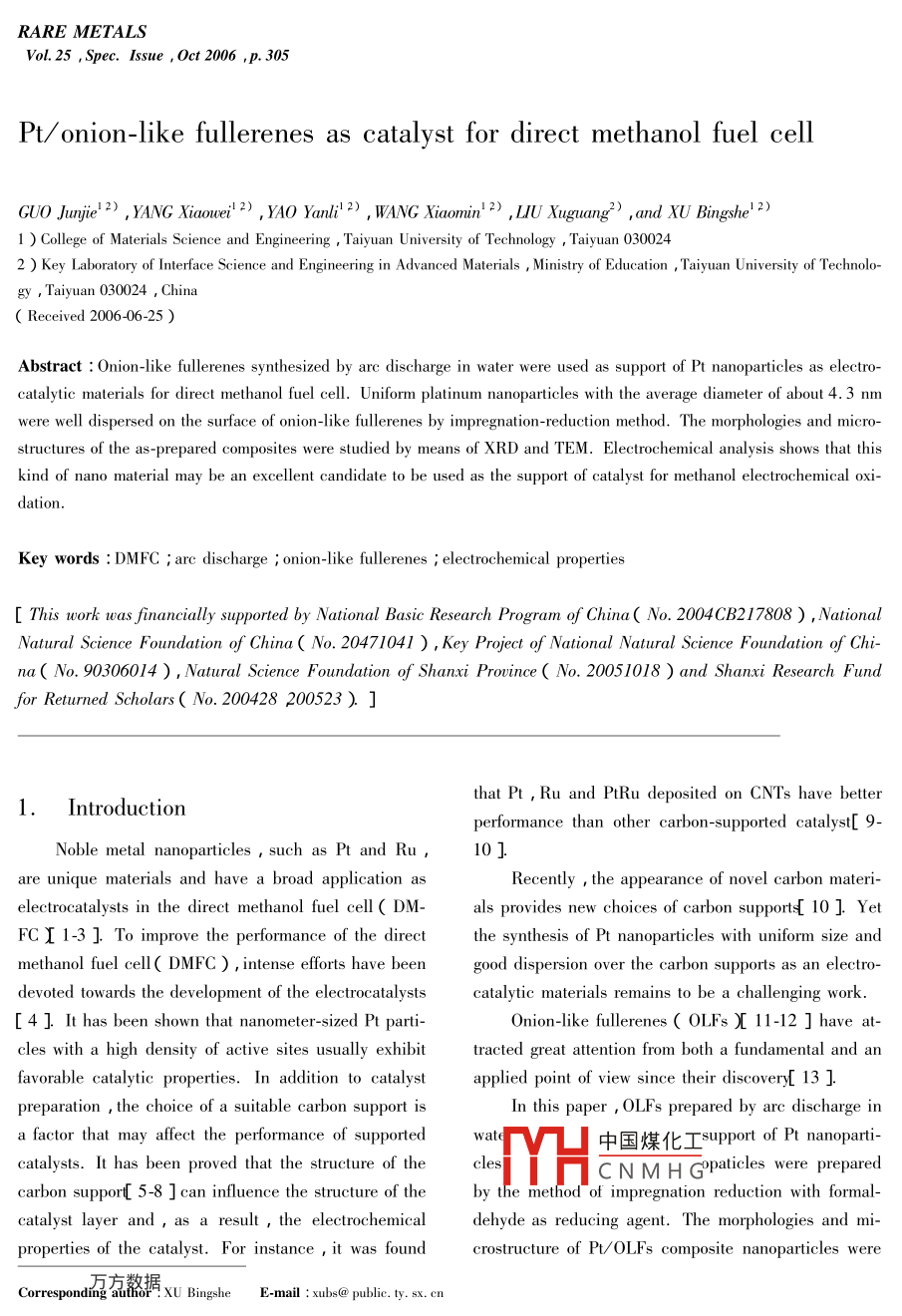 RARE METALS .Vol. 25 ,Spec. Issue , Oct 2006 ,p. 305Pt/ onion-like fullerenes as catalyst for direct methanol fuel cellGUO Jumjie2) ,YANG Xiaowei'2) , YAO Yanlit 2) ,WANG Xiaomin' 2) ,LIU Xuguang) ,and XU Bingshe' 2)1 ) College of Materials Science and Engineering , Taiyuan University of Technology ,Taiyuan 0300242 ) Key Laboratory of Interface Science and Engineering in Advanced Materials , Ministry of Education ,Taiyuan University of Technolo-gy ,Taiyuan 030024 , China( Received 2006-06-25 )Abstract : Onion-like fullerenes synthesized by are discharge in water were used as support of Pt nanoparticles as electro-catalytic materials for direct methanol fuel cell. Uniform platinum nanoparticles with the average diameter of about 4.3 nmwere well dispersed on the surface of onion-like fullerenes by impregnation-reduction method. The morphologies and micro-structures of the as-prepared composites were studied by means of XRD and TEM. Electrochemical analysis shows that thiskind of nano material may be an excellent candidate to be used as the support of catalyst for methanol electrochemical oxi-dation.Key words : DMFC iarc discharge ; onion-like fullerenes ; electrochemical properties[ This work was financially supported by National Basic Research Program of China ( No. 2004CB217808 ) ,National .Natural Science Foundation of China ( No. 20471041 ) , Key Project of National Natural Science Foundation of Chi-na( No. 90306014 ) , Natural Science Foundation of Shanxi Province ( No. 20051018 ) and Shanxi Research Fundfor Returned Scholars ( No. 200428 200523 ). ]that Pt , Ru and PtRu deposited on CNTs have better1. Introductionperformance than other carbon-supported catalyst[ 9-Noble metal nanoparticles , such as Pt and Ru,10 ]are unique materials and have a broad application asRecently , the appearance of novel carbon materi-electrocatalysts in the direct methanol fuel cell ( DM-als provides new choices of carbon supports[ 10 ]. YetFC [ 1-3 ] To improve the performance of the directthe synthesis of Pt nanoparticles with uniform size andmethanol fuel cell( DMFC ) , intense efforts have beengood dispersion over the carbon supports as an electro-devoted towards the development of the electrocatalystscatalytic materials remains to be a challenging work.[4 ] It has been shown that nanometer-sized Pt parti-Onion-like fullerenes( OLFs )[ 11-12 ] have atcles with a high density of active sites usually exhibittracted great attention from both a fundamental and anfavorable catalytic properties. In addition to catalystapplied point of view since their discovery[ 13 ]preparation , the choice of a suitable carbon support isIn this paper , OLFs prepared by arc discharge ina factor that may affect the performance of supportedwate中國(guó)煤化Isupport of Pt nanoparti-catalysts. It has been proved that the structure of thecl:IYHCN M H Gpaticles were preparedcarbon support[ 5-8 ] can influence the structure of theby the method of impregnation reduction with formal-catalyst layer and , as a result , the electrochemical .dehyde as reducing agent. The morphologies and mi-properties of the catalyst. For instance , it was found .crostructure of Pt/ OLFs composite nanoparticles wereCorresponding aJ BingsheE-mail : xubs@ public. ty. sx. cn306RARE METALS , Vol. 25 ,Spec. Issue , Oct 2006observed on a high-resolution transmission electron mi-High-resolution transmission electron microscopycroscope( HRTEM ) and X-ray diffraction( XRD ).( HRTEM ) images were obtained on a JEOL JEM-The object of the present work was to study the proba-2010. X-ray diffraction ( XRD ) measurements werebility of PvVOLFs as the catalyst of DMFC.carried out on a D/ max-3C X-ray diffractometer usinga Cu Ka source operating at 30 kV and 200 mA to2. Experimentalcharacterize the structure of the Pt/OLFs.2.1. Synthesis and characterization of Pt/OLFs .2.2. Preparation and characterization of elec-catalyststrodesHigh-quality OLFs were synthesized by arc dis-Electrochemical experiments of the as-preparedcharge in water. Our apparatus consisted of two graph-20wt. % Pv/C catalysts were carried out on an electro-ite electrodes submerged to a depth of 8 cm below wa-chemical interface ( Autolab PGSTAT302 ). A stand-ter surface in a glass container. The arc current andard three-electrode cell was used with saturated calo-voltage could be altered between 50 A and 22-28 V ,respectively. The synthesis details of OLFs may bemel electrode ( SCE ) as the reference electrode andplatinum foil as the counter electrode. Working elec-found elsewhere[ 14 ] For the better anchoring of thetrode was made of a paste on a glassy carbon platePt nanoparticles , as-produced OLFs were oxidized inwith a diameter of4 mm , which was mixed with a so-concentrated HNO, for4 h.lution of perfluorosulfonic acid( 5wt. % , Nafion , DuA typical impregnation-reduction method was em-Pont )( Acros Inc. ) and electrocatalyst. The Pt load-ployed to prepare OLFs- supported Pt catalyst withing on the electrodes was ca. 0.12 mg° cm-All theformaldehyde as reducing agent. For synthesizing Pv/OLFs with the Pt loading of 20wt. % ,a 0. 060 g ofpotentials in this study are reported with respect tcSCE. The electrolyte solution was 2. 0 mol. IOLFs were uniformly dispersed in 2.1 ml of an aque-CH20H/1.0 mol. L-1 H2SO4 , which was preparedous solution of H2PtCl。( 7.4 g° L-' ) by ultrasound.from high-purity sulfuric , methanol and distilled wa-Then 20 ml of the formaldehyde was dropped slowlyter.into the H2PtCl。solution at 333 K and0.8 ml of H2O2( 30v/o ) was added to stabilize the Pt particles undercontinuous stirring for 5 h. The solid product was3. Results and discussionrinsed with deionized water repeatedly and filtered.3.1. Morphology and structure of PV/OLFs cata-Finally , the product was dried at 343 K for 12 h in alystsvacum oven. The final P/OLFs catalyst with a metalFig.1 shows TEM images of synthesizedloading of 20wt. % was obtained.Pt / OLFs catalysts ,It can be found that the(田),(b中