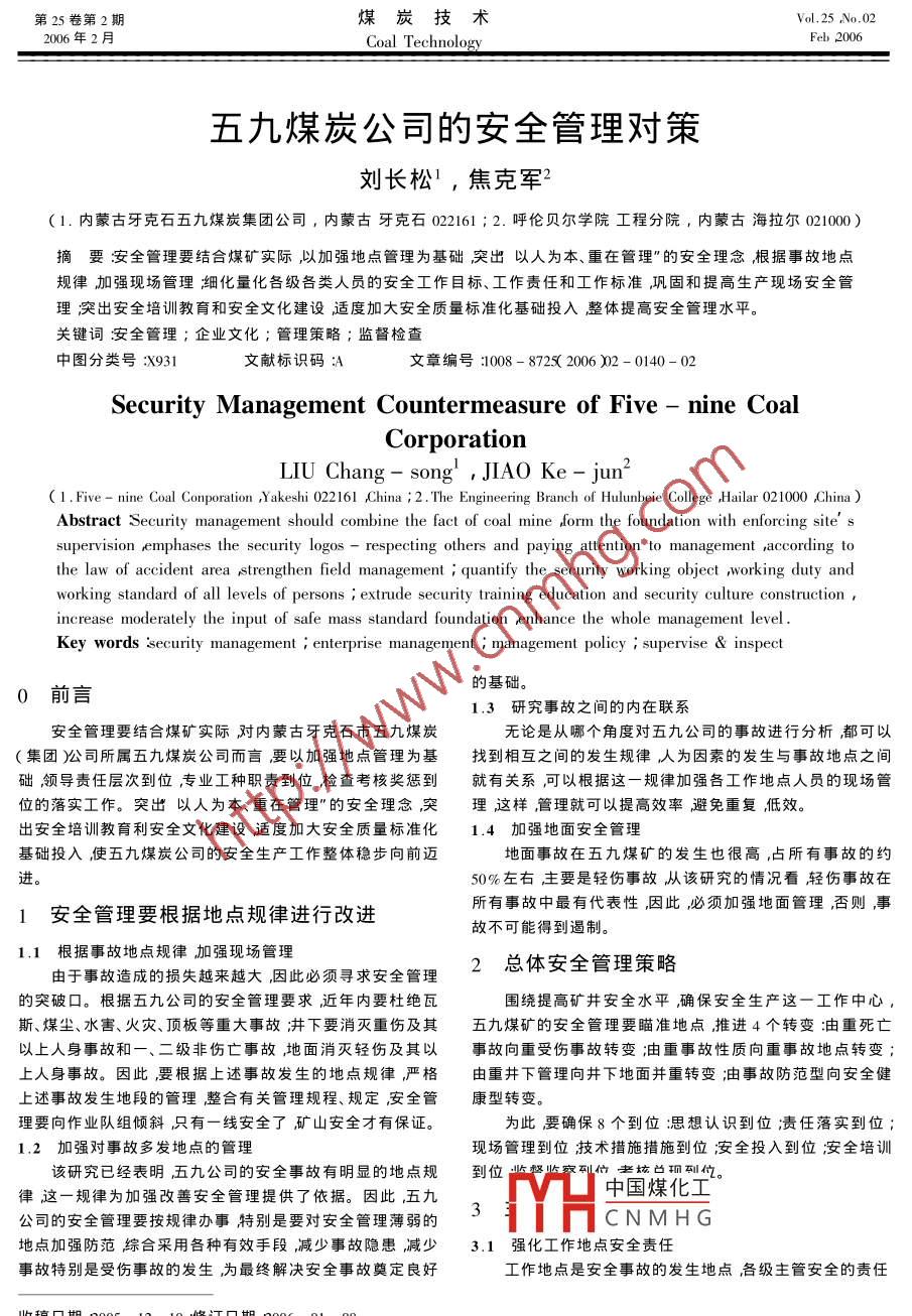 第25卷第2期煤炭技術(shù)Vol.25 ,No.02 .2006年2月Coal TechnologyFeb 2006五九煤炭公司的安全管理對(duì)策劉長(zhǎng)松',焦克軍2(1.內(nèi)蒙古牙克石五九煤炭集團(tuán)公司,內(nèi)蒙古牙克石022161 ;2.呼倫貝爾學(xué)院工程分院,內(nèi)蒙古海拉爾021000 )摘要安全管理要結(jié)合煤礦實(shí)際,以加強(qiáng)地點(diǎn)管理為基礎(chǔ)突出以人為本、重在管理”的安全理念,根據(jù)事故地點(diǎn)規(guī)律加強(qiáng)現(xiàn)場(chǎng)管理細(xì)化量化各級(jí)各類人員的安全工作目標(biāo)、工作責(zé)任和工作標(biāo)準(zhǔn),鞏固和提高生產(chǎn)現(xiàn)場(chǎng)安全管理突出安全培訓(xùn)教育和安全文化建設(shè)適度加大安全質(zhì)量標(biāo)準(zhǔn)化基礎(chǔ)投入整體提高安全管理水平。關(guān)鍵詞:安全管理;企業(yè)文化;管理策略;監(jiān)督檢查中圖分類號(hào):X931文獻(xiàn)標(biāo)識(shí)碼:A .文章編號(hào):1008 - 8725( 2006 )2 - 0140-02.Security Management Countermeasure of Five - nine CoalCorporationLIU Chang- song' ,JIAO Ke- jun2( 1. Five - nine Coal Conporation ,Yakeshi 022161 ,China ; 2.The Engineering Branch of Hulunbeie College ,Hailar 021000 ,China )Abstract Security management should combine the fact of coal mine form the foundation with enforcing site' ssupervision emphases the security logos - respecting others and paying attention to management ,according tothe law of accident area strengthen field management ; quantify the security working object ,working duty andworking standard of all levels of persons ; extrude security training education and security culture construction ,increase moderately the input of safe mass standard foundation enhance the whole management level .Key words 'security management ; enterprise management ; management policy ; supervise & inspect的基礎(chǔ)。0前言1.3研究事故之間的內(nèi)在聯(lián)系安全管理要結(jié)合煤礦實(shí)際對(duì)內(nèi)蒙古牙克石市五九煤炭無論是從哪個(gè)角度對(duì)五九公司的事故進(jìn)行分析都可以(集團(tuán))公司所屬五九煤炭公司而言要以加強(qiáng)地點(diǎn)管理為基找到相互之間的發(fā)生規(guī)律人為因素的發(fā)生與事故地點(diǎn)之間礎(chǔ)領(lǐng)導(dǎo)責(zé)任層次到位,專 業(yè)工種職責(zé)到位檢查考核獎(jiǎng)懲到就有關(guān)系,可以根據(jù)這一規(guī)律加強(qiáng)各工作地點(diǎn)人員的現(xiàn)場(chǎng)管位的落實(shí)工作。突出以人為本、重在管理"的安全理念突理這樣管理就可以提高效率避免重復(fù),低效。.出安全培訓(xùn)教育利安全文化建設(shè)適度加大安全質(zhì)量標(biāo)準(zhǔn)化1.4 加強(qiáng)地面安全管理基礎(chǔ)投入,使五九煤炭公司的安全生產(chǎn)工作整體穩(wěn)步向前邁地面事故在五九煤礦的發(fā)生也很高占所有事故的約進(jìn)。50%左右,主要是輕傷事故從該研究的情況看輕傷事故在1安全管理要根據(jù)地點(diǎn)規(guī)律進(jìn)行改進(jìn)所有事故中最有代表性,因此,必須加強(qiáng)地面管理,否則事故不可能得到遏制。1.1根據(jù)事故地點(diǎn)規(guī)律加強(qiáng)現(xiàn)場(chǎng)管理由于事故造成的損失越來越大,因此必須尋求安全管理2總體安全管理策略的突破口。根據(jù)五九公司的安全管理要求近年內(nèi)要杜絕瓦圍繞提高礦井安全水平,確保安全生產(chǎn)這一工作中心,斯、煤塵、水害、火災(zāi)、頂板等重大事故;井下要消滅重傷及其五九煤礦的安全管理要瞄準(zhǔn)地點(diǎn),推進(jìn)4個(gè)轉(zhuǎn)變:由重死亡以上人身事故和一、二級(jí)非傷亡事故,地面消滅輕傷及其以事故向重受傷事故轉(zhuǎn)變;油重事故性質(zhì)向重事故地點(diǎn)轉(zhuǎn)變;上人身事故。因此,要根據(jù)上述事故發(fā)生的地點(diǎn)規(guī)律,嚴(yán)格.由重井下管理向井下地面并重轉(zhuǎn)變;油事故防范型向安全健上述事故發(fā)生地段的管理整合有關(guān)管理規(guī)程、規(guī)定,安全管康型轉(zhuǎn)變。理要向作業(yè)隊(duì)組傾斜只有-線安全了礦山安全才有保證。為此要確保8個(gè)到位:思想認(rèn)識(shí)到位;責(zé)任落實(shí)到位;1.2 加強(qiáng)對(duì)事故多發(fā)地點(diǎn)的管理現(xiàn)場(chǎng)管理到位技術(shù)措施措施到位;安全投入到位安全培訓(xùn)該研究已經(jīng)表明五九公司的安全事故有明顯的地點(diǎn)規(guī)律這一規(guī)律為加強(qiáng)改善安全管理提供了依據(jù)。因此五九中國(guó)煤化工公司的安全管理要按規(guī)律辦事特別是要對(duì)安全管理薄弱的3YHCNMHG地點(diǎn)加強(qiáng)防范綜合采用各種有效手段,減少事故隱患減少.3.1 強(qiáng)化工作地 點(diǎn)安全責(zé)任事故特別是受傷事故的發(fā)生為最終解決安全事故奠定良好工作地點(diǎn)是安全事故的發(fā)生地點(diǎn)各級(jí)主管安全的責(zé)任收稿日期2005-12- 10;修訂日期2006-01-08作者簡(jiǎn)介:劉長(zhǎng)松( 1966- )男2003年畢業(yè)于黑龍江科技學(xué)院現(xiàn)任五九煤炭公司總工程師。第2期劉長(zhǎng)松等:五九煤炭公司的安全管理對(duì)策人要對(duì)工作地點(diǎn)的安全管理工作負(fù)責(zé)?!比龁T兩長(zhǎng)”對(duì)生產(chǎn)3.4強(qiáng)化安全投入 全力提高礦井綜合抗災(zāi)能力現(xiàn)場(chǎng)安全管理負(fù)責(zé)職工對(duì)所在崗位安全負(fù)責(zé)。在強(qiáng)化工作. ( 1 )安全生產(chǎn)投入是改善安全生產(chǎn)條件和保持生