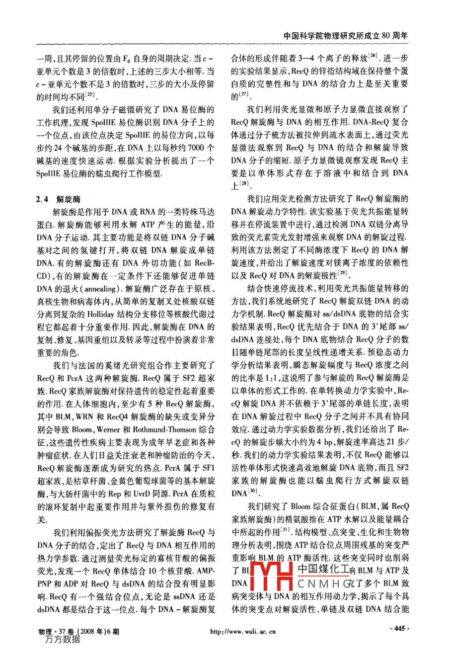 中國(guó)科學(xué)院物理研究所成立80周年生物軟物質(zhì)研究的新進(jìn)展王鵬業(yè)↑李明翁羽翔(中國(guó)科學(xué)院物理研究所軟物質(zhì)物理實(shí)驗(yàn)室北京100190)摘要文章對(duì)近年來(lái)中科院物理研究所軟物質(zhì)物理實(shí)驗(yàn)室生物軟物質(zhì)研究的部分新進(jìn)展做一簡(jiǎn)略介紹,包括DNA單分子研究,DNA與組蛋白的相互作用動(dòng)力學(xué)研究,生物分子馬達(dá)的運(yùn)動(dòng)機(jī)制研究,解旋酶與DNA的結(jié)合以及解旋DNA的動(dòng)力學(xué)研究,朊病毒片段聚集的分子動(dòng)力學(xué)研究,蛋白質(zhì)折疊動(dòng)力學(xué)的脈沖升溫-時(shí)間分辨光譜研究,光合細(xì)菌外周捕光天線膜蛋白的拓?fù)浣Y(jié)構(gòu)研究等關(guān)鍵詞生物軟物質(zhì),DNA,蛋白質(zhì),動(dòng)力學(xué),軟物質(zhì)物理Recent progress in biological soft matter researchWANG Peng-YeLI Ming WENG Yu-XiangLaboratory of Soft Matter Physics, Institute of Physic, Chinese Academy of Sciences, Beiing 100190, China)Abstract On the occasion of the 80th anniversary of the Institute of Physics we present a brief introduction tothe recent progress in our research on biological soft matters in the Laboratory of Soft Matter Physics, includingsingle-molecule studies of DNA, the interaction dynamics between DNA and histones, the mechanism of biologicalmolecular motors, the dNa binding and unwinding kinetics of helicases, molecular dynamics investigations on theaggregation of prion fragments, T-jump/ time-resolved spectroscopy of protein folding dynamics, and studies on thepological shape of integral membrane protein light-harvesting complexes from photosynthetic bacteriaKeywords biological soft matter, DNA, protein, dynamics, soft matter physics與普通固體、液體和氣體大不相同.流體熱漲落和固1引言態(tài)的約束共同導(dǎo)致了軟物質(zhì)的新行為,體現(xiàn)了軟物質(zhì)組成、結(jié)構(gòu)和相互作用的復(fù)雜性及其特殊性軟物軟物質(zhì)這一概念由法國(guó)物理學(xué)家德熱納(P.質(zhì)在介觀尺度(大約從1mm到1m)范圍內(nèi),通過(guò)相G. de gennes)首先提出,他在1991年諾貝爾獎(jiǎng)授互作用,可形成從簡(jiǎn)單的時(shí)空有序到復(fù)雜生命體獎(jiǎng)會(huì)上以“軟物質(zhì)( Soft matter)”為演講題目,引系列的結(jié)構(gòu)體和動(dòng)力學(xué)系統(tǒng)軟物質(zhì)的豐富物理內(nèi)起廣泛關(guān)注軟物質(zhì)的特征就體現(xiàn)在“軟”上,比如涵和廣泛應(yīng)用背景引起越來(lái)越多物理學(xué)家的興趣輕輕施力即可使其產(chǎn)生較大形變,但它又不像普通是具挑戰(zhàn)性和迫切性的重要研究方向,已成為凝聚流體(如水、空氣)那樣具有良好的流動(dòng)性軟物質(zhì)態(tài)物理研究的重要前沿領(lǐng)域具有短距離的規(guī)則性,但缺乏長(zhǎng)距離周期性,其形態(tài)軟物質(zhì)與生命活動(dòng)緊密相關(guān),生物體基本上均與熵有很大關(guān)系只有這樣它才能夠構(gòu)造出千變?nèi)f由軟物質(zhì)構(gòu)成,如細(xì)胞及組成它的主要成分(脂膜化極其復(fù)雜的系統(tǒng),并可攜帶大量的信息,生命就是蛋白質(zhì)、DNA、RNA等).軟物質(zhì)與一般硬物質(zhì)的運(yùn)個(gè)例子因此軟物質(zhì)是指處于固體和理想流體之動(dòng)變中國(guó)煤化工對(duì)這一研究領(lǐng)域間的復(fù)雜態(tài)物質(zhì).一般由大分子或基團(tuán)組成,在自然的開(kāi)界中廣泛存在.軟物質(zhì)的基本特性是對(duì)外界微小作CNMHG任重而道遠(yuǎn)軟物用的敏感性、非線性響應(yīng)、自組織行為等這類物質(zhì)2008-05-24收到↑通訊聯(lián)系人.Emal: poyang@aphy.iphy.ac物;毅數(shù)2008年)6期http://www.wuliaccr中國(guó)科學(xué)院物理研究所成立80周年質(zhì)的概念是從物理學(xué)視點(diǎn)上研究生物大分子的主要個(gè)簡(jiǎn)略的綜述出發(fā)點(diǎn)之一,是連接物理學(xué)與生命科學(xué)的一條重要紐帶應(yīng)用現(xiàn)代物理學(xué)手段,理論與實(shí)驗(yàn)相結(jié)合對(duì)2研究進(jìn)展些重要的生物大分子及其相互作用的研究,有助于在分子水平上揭示生物大分子結(jié)構(gòu)、運(yùn)動(dòng)與功能2.1單分子DNA的關(guān)系.這是物理學(xué)與生命科學(xué)交叉的前沿領(lǐng)域,有DNA(脫氧核糖核酸)是生命的核心物質(zhì),是遺許多問(wèn)題有待深入研究,是學(xué)術(shù)界面臨的長(zhǎng)期研究傳信息的攜帶者.生命的藍(lán)圖—基因即存在于這方向大分子中從結(jié)構(gòu)上看它是一個(gè)較簡(jiǎn)單的長(zhǎng)絲狀從物理學(xué)的視點(diǎn)上研究生命系統(tǒng)已經(jīng)有了很長(zhǎng)分子,由兩條螺旋狀的脫氧核糖核苷酸長(zhǎng)鏈組成,即的歷史著名的物理學(xué)家薛定諤于1943年寫的《生眾所周知的雙螺旋雙螺旋外側(cè)是帶有負(fù)電的戊糖命是什么?》2為分子生物學(xué)這一極其重要的研究磷酸骨架,雙螺旋內(nèi)部共有四種堿基(分別用A領(lǐng)域的誕生提供了概念上的奠基.該小冊(cè)子已影響T,C,C表示),這四種堿基以氫鍵相互作用組成堿了幾代人,包括DNA結(jié)構(gòu)的發(fā)現(xiàn)者之一克里克(F.基對(duì)(A和T配對(duì),2個(gè)氫鍵;G和C配對(duì),3個(gè)氫H.C.Cick).其中提出的“生命以負(fù)嫡為生”、“基鍵)組成互補(bǔ)鏈在生命活動(dòng)中,DNA的復(fù)制和轉(zhuǎn)因是非周期固體”等極具洞察力的觀點(diǎn)至今仍具有錄等過(guò)