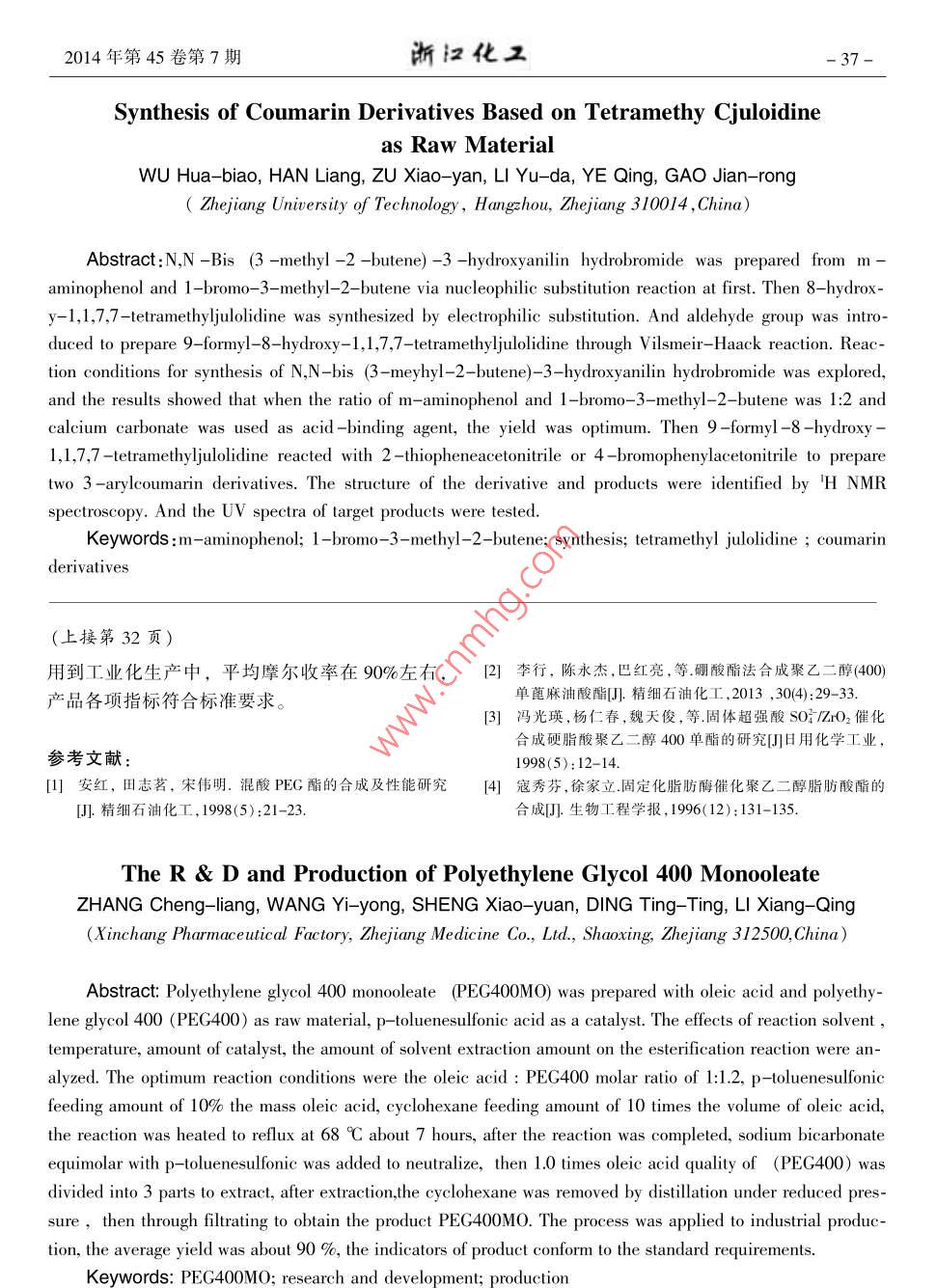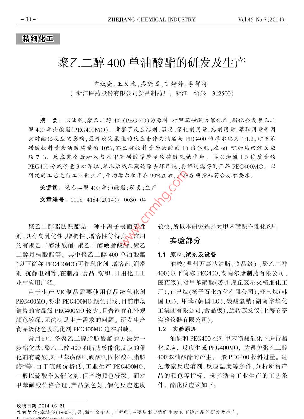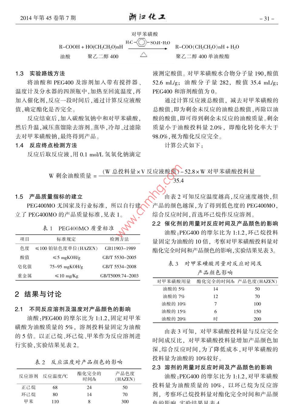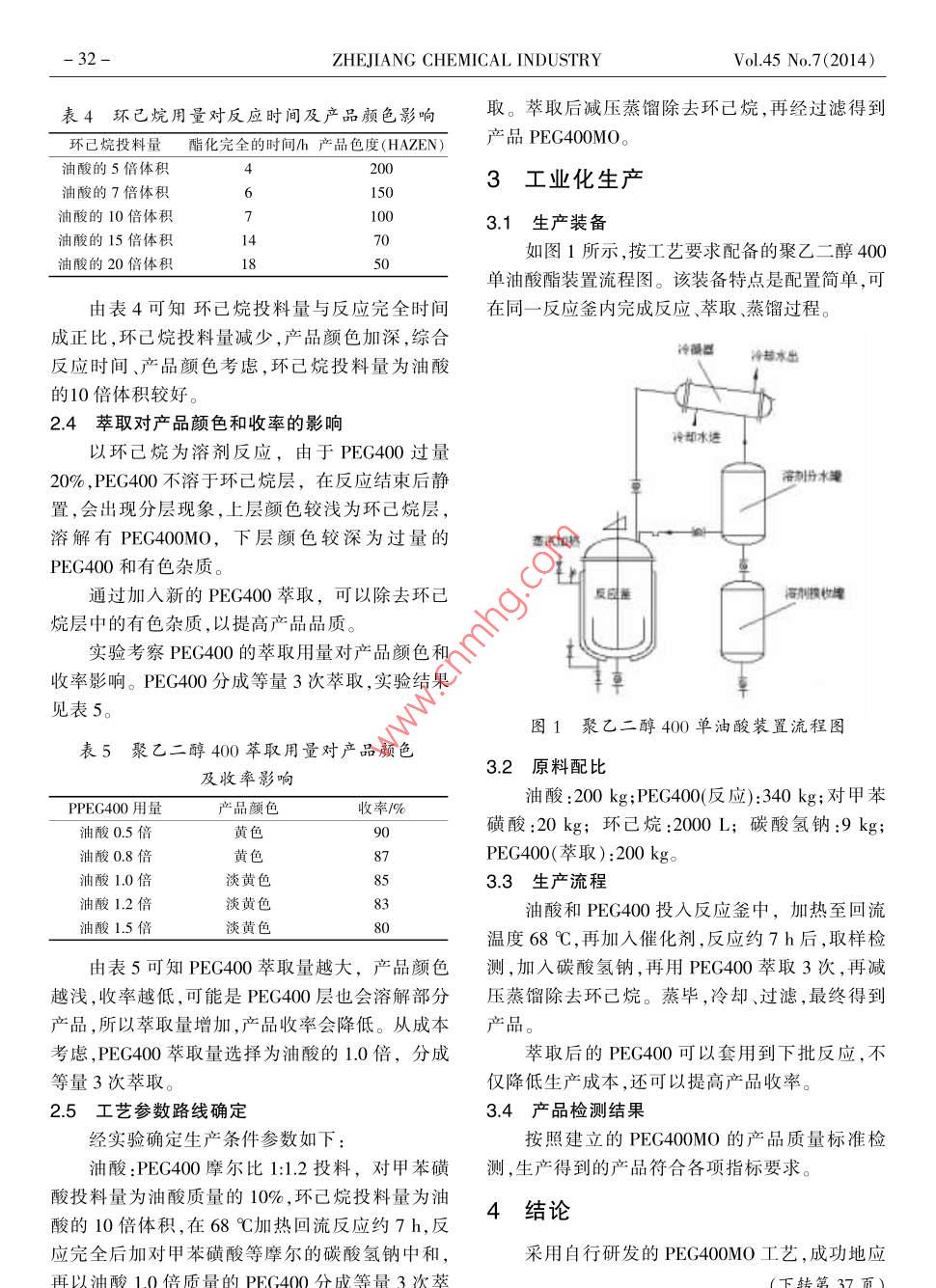 30ZHEJIANG CHEMICAL INDUSTRYVol45No.7(2014)精細化工聚乙二醇400單油酸酯的研發(fā)及生產(chǎn)章城亮,王義永,盛曉園,丁婷婷,李祥清(浙江醫(yī)藥股份有限公司新昌制藥廠,浙江紹興312500摘要:以油酸、聚乙二醇400(PEG400)為原料,對甲苯磺酸為催化劑,酯化合成聚乙二醇400單油酸酯(PEG400M○)。考察了反應(yīng)溶劑、溫度、催化劑用量、溶劑用量、萃取用量等因素對酯化反應(yīng)的影響,最終確定最佳的反應(yīng)條件為油酸與PEG400的摩爾比為1:1.2,對甲苯磺酸投料量為油酸質(zhì)量的10%,環(huán)己烷投料量為油酸的10倍體積,在68℃加熱回流反應(yīng)約7h,反應(yīng)完全后加入與對甲苯磺酸等摩爾的碳酸氫鈉中和,再以油酸1.0倍質(zhì)量的PEG400分成等量3次萃取,萃取后減壓蒸餾除去環(huán)己烷,再經(jīng)過濾得到產(chǎn)品PEG400MO。以研發(fā)的工藝進行工業(yè)化生產(chǎn),平均摩爾收率在90%左右,產(chǎn)品各項指標符合標準要求。關(guān)鍵詞:聚乙二醇400單油酸酯;研發(fā);生產(chǎn)文章編號:1006-4184(2014)7-0030-04聚乙二醇脂肪酸酯是一種非離子表面活性較快,所以本研究選擇對甲苯磺酸作催化劑叫。劑,具有高乳化性、增稠性、增溶性等特點。常用的有聚乙二醇油酸酯、聚乙二醇硬脂酸酯、聚乙1實驗部分醇月桂酸酯等。其中聚乙二醇400單油酸酯1.1原料、試劑及設(shè)備(以下簡稱PEG400MO)可作乳化劑、增溶劑、潤滑油酸(溫州萬事達油脂,食品級),聚乙二醇劑、抗靜電劑等,在制藥、食品、紡織、日用化工工400(以下簡稱PEG400,湖南爾康制藥有限公司業(yè)中應(yīng)用廣泛。醫(yī)藥級),對甲苯磺酸(蘇州虎丘區(qū)星火精細化工由于生產(chǎn)VE制品需要使用食品級乳化劑廠),正已烷(揚子石化煉化有限公司),環(huán)已烷(韓PEGA00MO,要求PEG400MO顏色要淺,目前市場國IG),甲苯(韓國IG),碳酸氫鈉(湖南裕華化銷售的食品級PEGA400MO較少,且普遍存在外觀工集團有限公司,食品級),旋轉(zhuǎn)蒸發(fā)儀(上海安亭顏色較深,無法滿足生產(chǎn)需求的問題。研發(fā)生產(chǎn)實驗儀器有限公司)。食品級低色度乳化劑PEG400MO迫在眉睫。12實驗原理常用的制備聚乙二醇脂肪酸酯的方法為油酸和PEG400在對甲苯磺酸催化下進行酯步酯化法,聚乙二醇400和脂肪酸酯化反應(yīng)的催化反應(yīng),反應(yīng)生成PEG400MO,為避免聚乙二醇化劑有硫酸、對甲苯磺酸叫、硼酸吲、固體酸、脂肪400雙油酸酯的產(chǎn)生,一般PEG400投料過量。通酶等,由于硫酸價格低,工業(yè)生產(chǎn)PEG400MO,過考察反應(yīng)溶劑、反應(yīng)溫度等條件,分析所得產(chǎn)般以硫酸作為催化劑,但產(chǎn)物顏色較深。而對品的顏色等指標,選擇適合工業(yè)生產(chǎn)的工藝條甲苯磺酸價格合理,產(chǎn)品顏色好,催化反應(yīng)速度件。酯化反應(yīng)式如下收稿日期:2014-03-21作者簡介:章城亮(1980-),男,浙江金華人,工程師,主要從事天然維生素E下游產(chǎn)品的研發(fā)及生產(chǎn)。2014年第45卷第7期浙化衛(wèi)對甲苯磺酸H£CSO·HOR-COOH HO(CHCH,O)nHR-COO(CHCH,O)nH +H,O油酸聚乙二醇400聚乙二醇400單油酸酯13實驗路線方法液測定酸值。對甲苯磺酸水合物分子量190,酸值將油酸和PEG400及溶劑加入帶有攪拌器、52.6ml/g;油酸分子量282,酸值35,4mI溫度計及分水器的四頸瓶中,加熱至回流溫度,再PEG400和溶劑酸值為0加入催化劑,反應(yīng)一段時間后,通過計算反應(yīng)液酸通過計算反應(yīng)液總酸值,減去對甲苯磺酸的值,確定酯化是否完全。總酸值,即為剩余未反應(yīng)的油酸總酸值,再除以油反應(yīng)結(jié)束后,加人碳酸氫鈉中和對甲苯磺酸,酸的酸值,即可得到剩余未反應(yīng)的油酸質(zhì)量。剩余然后升溫,減壓蒸餾除去溶劑。蒸畢,冷卻、過濾除質(zhì)量小于油酸投料量2.0%,即酯化轉(zhuǎn)化率大于去對甲苯磺酸鈉,最終得到產(chǎn)品。98.0%,視為酯化反應(yīng)完全。14反應(yīng)終點檢測方法計算公式如下反應(yīng)后取反應(yīng)液,用0.1molL氫氧化鈉滴定W剩余油酸質(zhì)量=(W總投料量xV反應(yīng)液酸值)-528×W對甲苯磺酸投料量35.41.5產(chǎn)品質(zhì)量指標的建立由表2可知反應(yīng)溫度越高,反應(yīng)速度越快,但PEG400MO無國家及行業(yè)標準,所以自行建產(chǎn)品的顏色越深,為了得到低色度的PEG400MO立了PEG400MO的產(chǎn)品質(zhì)量標準,見表1。綜合反應(yīng)時間,首選環(huán)已烷作反應(yīng)溶劑表1PEG400MO質(zhì)量標準22催化劑的用量對反應(yīng)時間及產(chǎn)品顏色的影響油酸:PEG400的摩爾比為1:1.2,環(huán)已烷投料項目標準規(guī)定檢測方法量固定為油酸的10倍,考察對甲苯磺酸投料量對色度≤100鉑鉆色度單位( HAZEN)GB11903-1989酯化完全時間和產(chǎn)品顏色的影響,實驗結(jié)果見表3。酸值≤5 mekongGB/T5530-2005皂化值75-95 mgKOH/gB/T5534-2008表3對甲苯磺酸用量對反應(yīng)時間及重金屬≤10mg/kgGB/T5009.74-2003產(chǎn)品顏色影響對甲苯磺酸用量酯化完全的時間h產(chǎn)品色度( HAZEN)油酸的5%2結(jié)果與討論油酸的7%油酸的10%2.1不同反應(yīng)溶劑及溫度對產(chǎn)品顏色的影響4276油酸的15%150油酸:PEG400的摩爾比為1:1.2,固定對甲苯油酸的20%磺酸為油酸質(zhì)量的5%,溶劑投料量固定為油酸的5倍。以正己烷、環(huán)已烷、甲苯作為反應(yīng)溶劑進由表3可知,對甲苯磺酸投料量與反應(yīng)完全行實驗,實驗結(jié)果見表2時間成反比,對甲苯磺酸投料量增加產(c