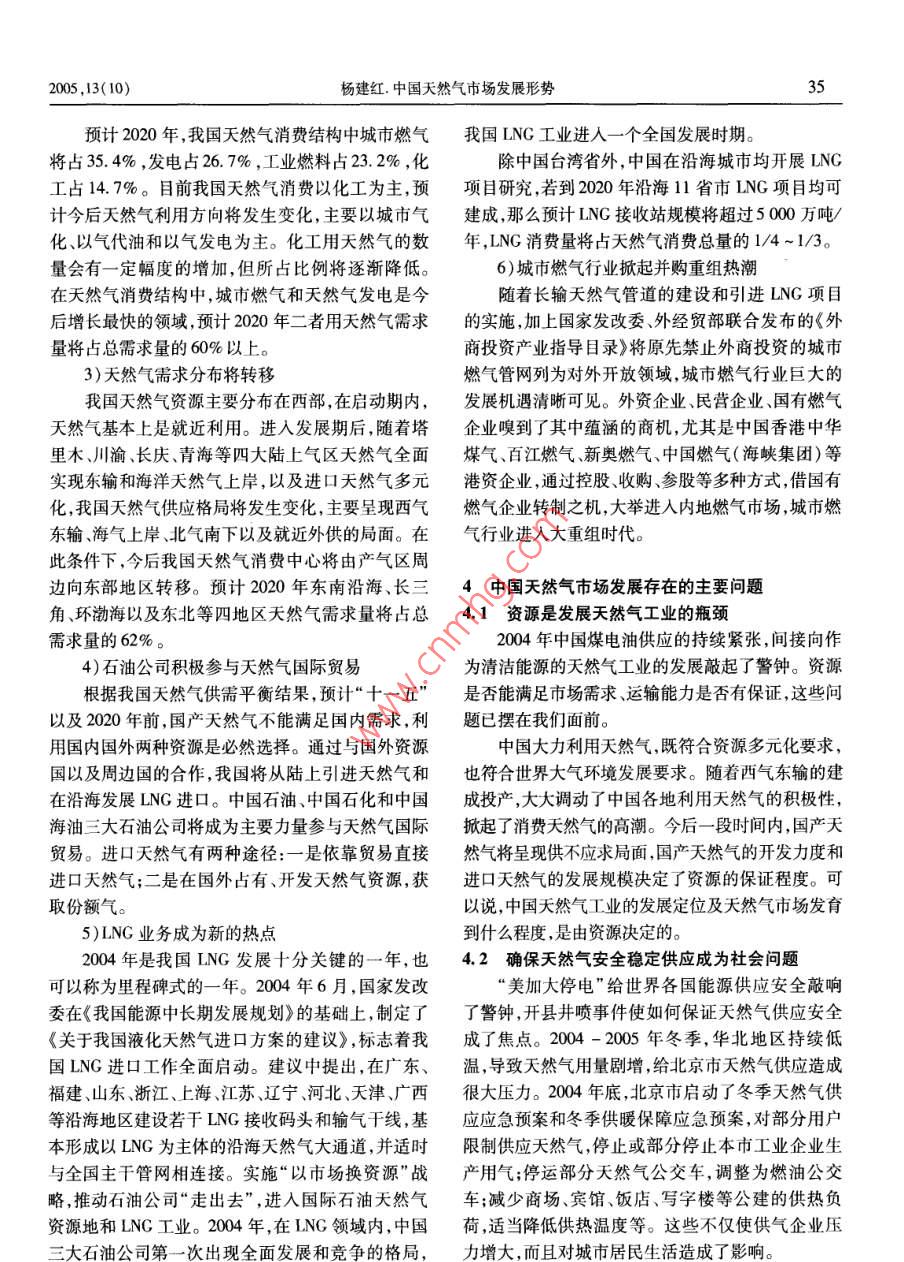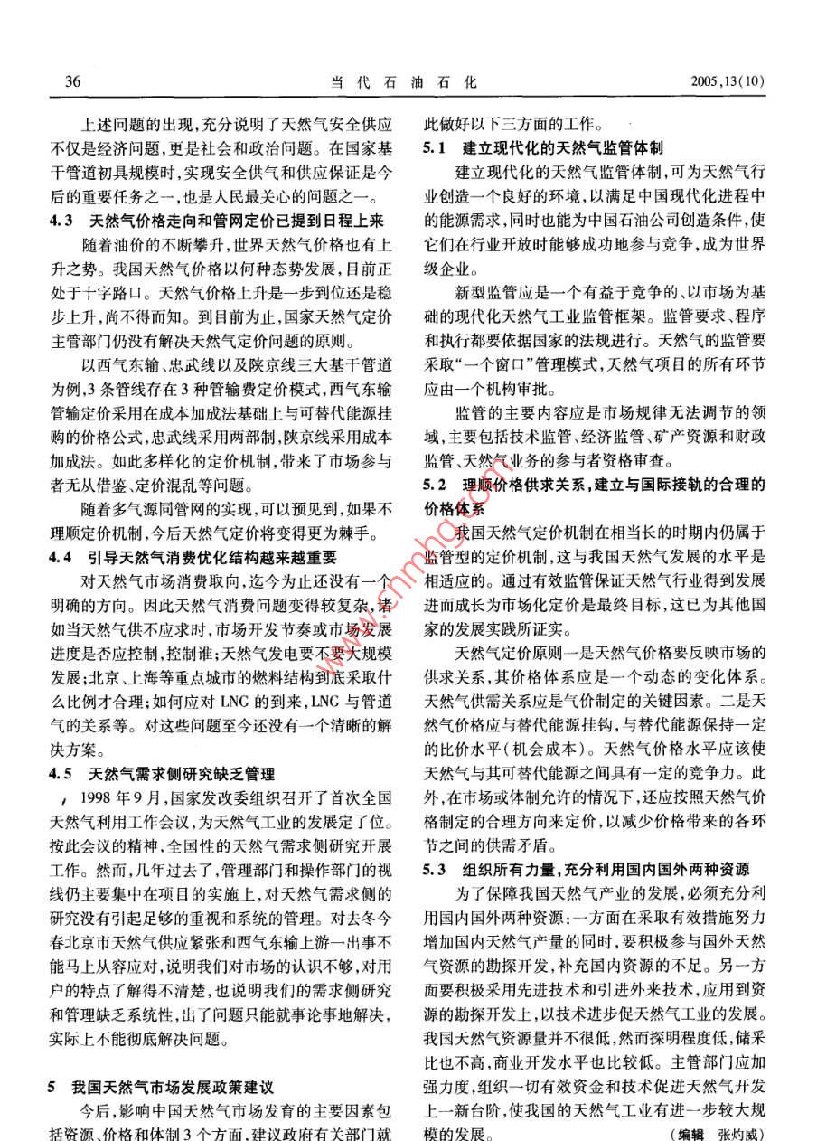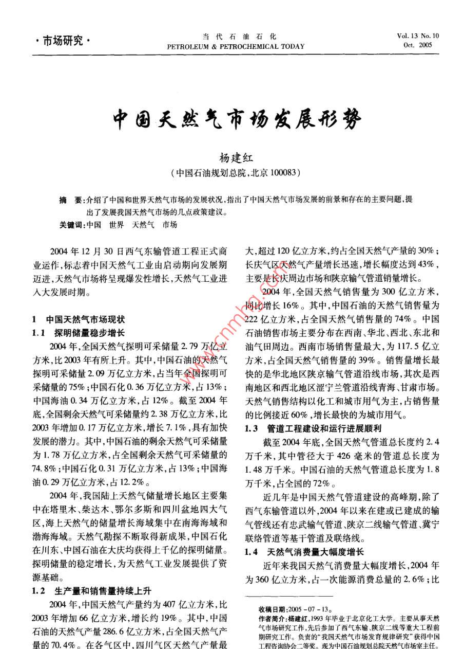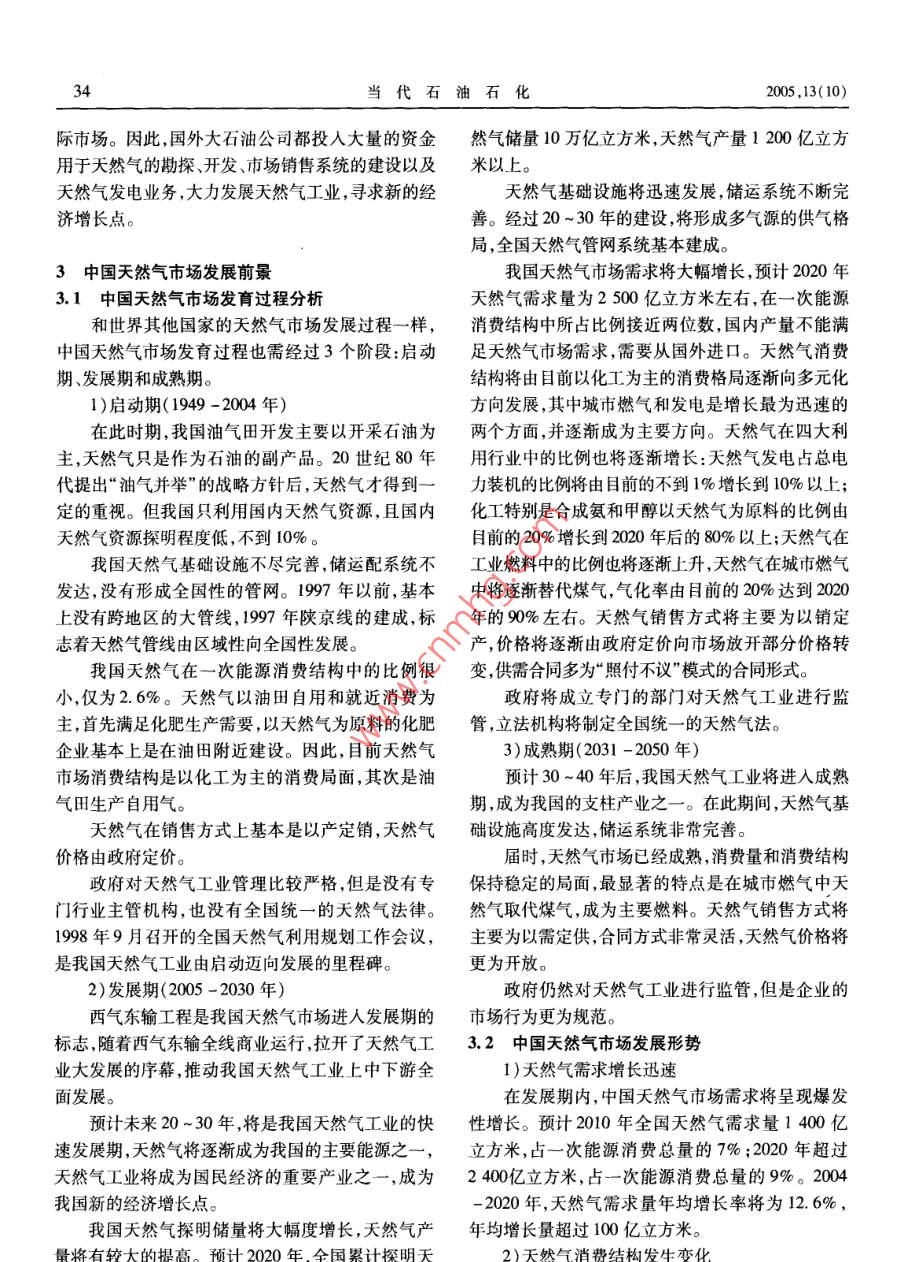 ·市場研究當(dāng)代石油石化Vol. 13 No. 10PETROLEUM PEtROCHEMICAL TODAYoct.2005中國天然氣市場發(fā)展形勢楊建紅(中國石油規(guī)劃總院,北京100083)摘要:介紹了中國和世界天然氣市場的發(fā)展?fàn)顩r指出了中國天然氣市場發(fā)展的前景和存在的主要問題提出了發(fā)展我國天然氣市場的幾點(diǎn)政策建議。關(guān)鍵詞:中國世界天然氣市場2004年12月30日西氣東輸管道工程正式商大超過120億立方米,約占全國天然氣產(chǎn)量的30%;業(yè)運(yùn)作,標(biāo)志著中國天然氣工業(yè)由啟動期向發(fā)展期長慶氣區(qū)天然氣產(chǎn)量增長迅速,增長幅度達(dá)到43%,邁進(jìn),天然氣市場將呈現(xiàn)爆發(fā)性增長,天然氣工業(yè)進(jìn)主要是長慶周邊市場和陜京輸氣管道銷量增長。入大發(fā)展時(shí)期。2004年,全國天然氣銷售量為300億立方米同比增長16%。其中,中國石油的天然氣銷售量為1中國天然氣市場現(xiàn)狀222億立方米,占全國天然氣銷售量的74%。中國1.1探明儲量穩(wěn)步增長石油銷售市場主要分布在西南、華北、西北、東北和004年,全國天然氣探明可采儲量2.79萬億立油氣田周邊。西南市場銷售量最大,為117.5億立方米,比2003年有所上升。其中,中國石油的天然氣方米,占全國天然氣銷售量的39%。銷售量增長最探明可采儲量209萬億立方米,占當(dāng)年全國探明可快的是華北地區(qū)陜京輸氣管道沿線市場,其次是西采儲量的75%;中國石化0.36萬億立方米,占13%;南地區(qū)和西北地區(qū)澀寧蘭管道沿線青海、甘肅市場。中國海油034萬億立方米,占12%。截至2004年天然氣銷售結(jié)構(gòu)以化工和城市用氣為主,占銷售量底全國剩余天然氣可采儲量約2.38萬億立方米,比的比例接近60%,增長最快的為城市用氣。2003年增加0.17萬億立方米,增長71%,具有加快1.3管道工程建設(shè)和運(yùn)行進(jìn)展順利發(fā)展的潛力。其中,中國石油的剩余天然氣可采儲量截至2004年底,全國天然氣管道總長度約24為1.78萬億立方米,占全國剩余天然氣可采儲量的萬千米,其中管徑大于426毫米的管道總長度為74.8%;中國石化0.31萬億立方米,占13%;中國海1.48萬千米。中國石油的天然氣管道總長度為18油0.209萬億立方米,占12.2%萬千米,占全國的72%2004年,我國陸上天然氣儲量增長地區(qū)主要集近幾年是中國天然氣管道建設(shè)的高峰期,除了中在塔里木柴達(dá)木鄂爾多斯和四川盆地四大氣西氣東輸管道以外,2004年以來在建或已建成的輸區(qū)海上天然氣的儲量增長海域集中在南海海域和氣管線還有忠武輸氣管道陜京二線輸氣管道、冀寧渤海海域。天然氣勘探不斷取得新成果,中國石化聯(lián)絡(luò)管道等基干管道及聯(lián)絡(luò)線。在川東、中國石油在大慶均獲得上千億的探明儲量。1.4天然氣消費(fèi)量大幅度增長探明儲量的穩(wěn)定增長,為天然氣工業(yè)發(fā)展提供了資近年來我國天然氣消費(fèi)量大幅度增長,2004年源基礎(chǔ)。為360億立方米,占一次能源消費(fèi)總量的2.6%;比1.2生產(chǎn)量和銷售量持續(xù)上升2004年,中國天然氣產(chǎn)量約為407億立方米,比收稿日期:2005-07-13。2003年增加66億立方米,增長約19%。其中,中國作者簡介:楊建紅,1993年畢業(yè)于北京化工大學(xué)。主要從事天然石油的天然氣產(chǎn)量286.6億立方米,占全國天然氣產(chǎn)氣市場研究工作,先后參加了西氣東輸陜京二線等重大工程前期研究工作。負(fù)責(zé)的“我國天然氣市場發(fā)育規(guī)律研究”獲得中國量的70.4%。在各氣區(qū)中氣區(qū)天然氣產(chǎn)量最2005,13(10)楊建紅中國天然氣市場發(fā)展形勢1996年的185億立方米將近翻了一番,年均增長率發(fā)電技術(shù)的發(fā)展上,與其他能源相比也有較大的優(yōu)達(dá)到8.6%。2000年后增速加快,2000-2004年年勢。因此,許多國家天然氣用于發(fā)電的比例較大,各均增長率接近于10%。國情況略有差異。天然氣消費(fèi)以化工為主,集中在距氣田較近的地4)天然氣市場貿(mào)易國際化,尤其是LNG貿(mào)易國區(qū)。2004年我國天然氣消費(fèi)結(jié)構(gòu)為:化工占3%、城際化是近年來發(fā)展的趨勢之市燃?xì)庹?9%、工業(yè)燃料占26%、發(fā)電占12%。在滿足產(chǎn)地附近消費(fèi)的情況下,將天然氣從生產(chǎn)基地銷售到較遠(yuǎn)的地區(qū)已成為發(fā)展趨勢。2004世界天然氣工業(yè)發(fā)展趨勢年,世界天然氣貿(mào)易總量6799億立方米,比2003世界天然氣工業(yè)起步于20世紀(jì)初,對改善環(huán)年增加了562億立方米,增長7.3%。1970年,天然境、促進(jìn)經(jīng)濟(jì)發(fā)展產(chǎn)生了積極的作用,具有良好的社氣僅有449億立方米進(jìn)入國際市場,占當(dāng)年產(chǎn)量的會效益和經(jīng)濟(jì)效益。目前世界約有90多個(gè)國家發(fā)4.4%;到2004年,有6799億立方米天然氣進(jìn)入國現(xiàn)了石油和天然氣,經(jīng)過幾十年的發(fā)展,已形成美際市場,約占當(dāng)年產(chǎn)量的25%。顯然,通過國際貿(mào)洲、歐洲和亞洲三大天然氣市場。截至2004年底,易利用天然氣將在世界范圍內(nèi)進(jìn)一步擴(kuò)大。世界天然氣累計(jì)探明儲量179萬億立方米,其中俄2004年LNG貿(mào)易量1799億立方米,占世界天羅斯占268%。2004年,世界天然氣產(chǎn)量為26916然氣貿(mào)易總量的26.4%,比2003年增加111億方億立方米,其中俄羅斯為5891億立方米。米,增長6.5%。可見,LNG貿(mào)