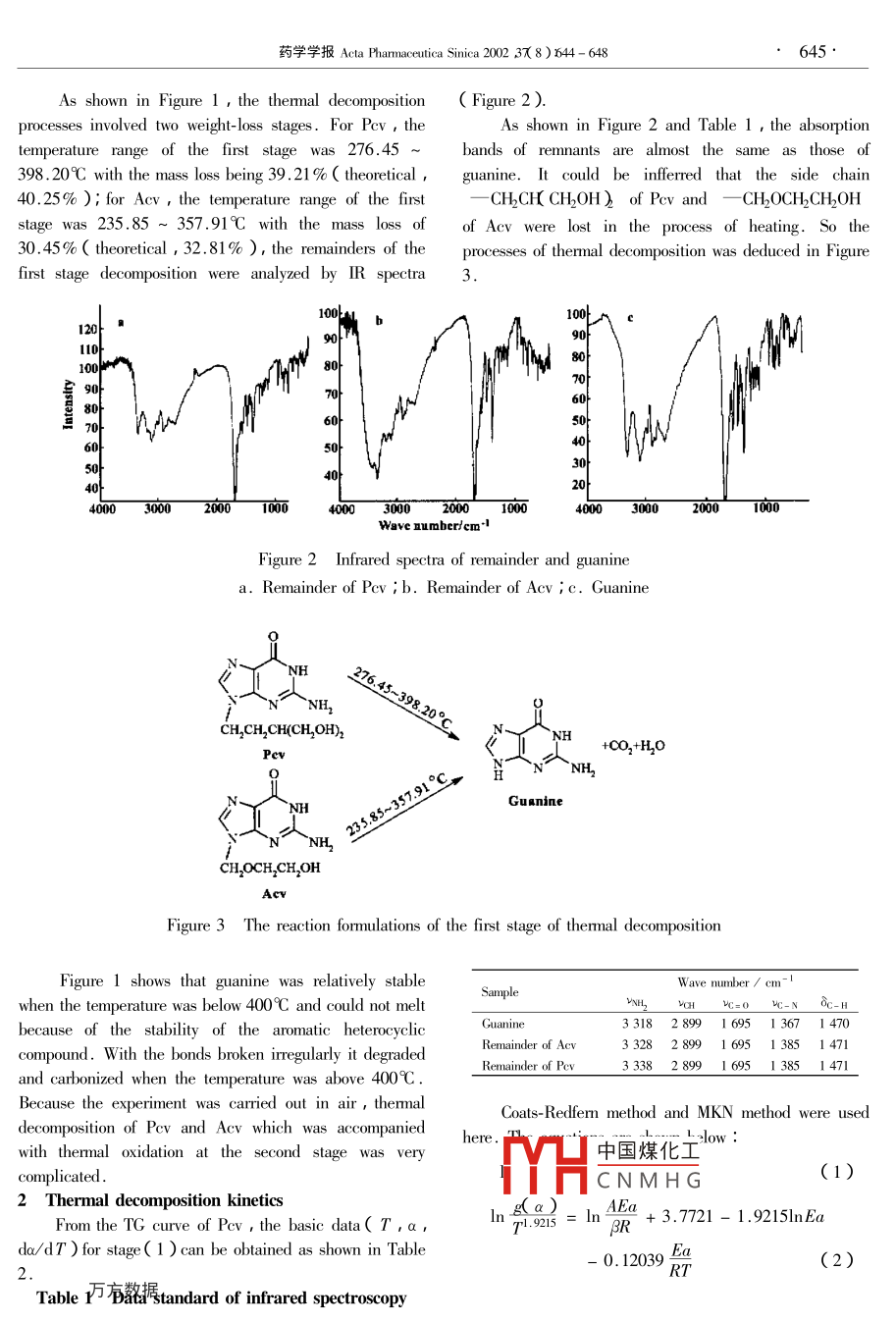 藥學(xué)學(xué)報(bào) Acta Pharmaceutica Sinica20023X8)44-648STUDIES ON THE THERMAL DECOMPOSITION PROCESSAND KINETICS OF PURINE DRUGSZHANG Jian, SHENG Rui-long MAI Wen-pengCollege of Chemistry and Life Sciences South-central Uniersity for Nationalities, Wuhan 430074, ChinaABSTRACT: AIM To study the thermal stability decomposition process and kinetics of such purine pharmaceuticals asaciclovir( Acv ), penciclovir( Pcv ) and their parent substance, guanine. METHoDs Using infrared technique, acceleratingtest method and thermogravimetry to investigate the thermal decomposition processes and using Coast-Redfern method, MKN methodnd Ozawa method to deal with the data to get kinetic functions. RESULTS The decomposition process and the formed productswere derived the kinetic model function was suggested by comparison of the kinetic parameters. CoNclusion Pcv and Acvsdegrading product for the first step is guanine. The sequences of their thermal stabilities is: Pcv> Acv. The two drugs kineticequation of thermal decomposition is expressed as: da/dt= Ae" aRX 1-a)KEY WORDS: aciclovir penciclovir guanine i accelerating test; thermal stability thermogravimetry non-isothermalCLC number: R912Document code: AArticle ID:0513-48702002)8-0644-05Purine drugs are a kind of low toxiciElmer Co., USA ) used under the following conditionsffective antivirus pharmaceuticals. It has inhibition effect sample mass: 3. 00 mg ; atmosphere static air heatingon the duplication of DNA in virus such as HIV-1, HIV2, VZVI21. Acyclovir( Acv )and penciclovir( Pcv )are range: 30-630C. Infrared spectrograph FT-IR Nexustwo important members in the family of purine drugs. 470( America Nicolet ) All the thermogravimetric dataSome related research work has been reported. The were analysed on a PT-Ill computercapsule of penciclovir was prepared and theMaterials Pcy and Acy were obtained from hubeibioequivalence was studied using HPLC with fluorescence Pharmaceutical Industry Institute( Wuhan ), guanine wasmethod33. Acyclovir inhibition of induced hepes simplex purchased from Sigma Co. Purity of all raw drugs wasvirus type 1 was investigated 4I by temporal analysis better than 99.4%method.Sreis 5I studied the effect of particle sizedistribution and excipients on the dissolution of acyclovirRESULTS AND DISCUSSIONSfrom gelatin capsules tablets and powdersThermal stabilities and thermal decomposition 1 Thermal decomposition processes of Pey and Acvkinetics of purine drugs are the interesting problem in sampleslustral applications they are important in evaluatingThermogravimetric(TG)curves of Pev and Acv areand periods of validity and for controlling the qushown in figure 1the process of manufacture. In this paper, the thermalmaterials of purindloandguanine were investigated by infrared spectrometry60B=5K·min1accelerating test and thermogravimetryMATERIALS AND METHODS中國煤化工CNMHGInstruments TGS-2 model thermobalance( Perkin100200300400500600Received date: 2002-01-0402787435879, Fax: (027 37532752, Figure 1 Thermogravimetric( tG )curves of penciclovirPev ) and aciclovir( Acv藥學(xué)學(xué)報(bào) Acta Pharmaceutica Sinica20023X8)44-648645As shown in Figure 1, the thermal decomposition Figure 2)nvolved two weight-loss stages. For Pev then in Figure 2 and Table 1temperature range of the first stage was 276. 45bands of remnants are almost the same as those of39820C with the mass loss being 39. 21 %( theoretical, guanine. It could be inferred that the side chain40.25 %) for Acv, the temperature range of the firstCH,CHCH,OH of Pcv and-CHOCH,CH,OHstage was 235 85-357 91C with the mass loss of of Acy were lost in the process of heating30.45%( theoretical, 32. 81%), the remainders of the processes of thermal decomposition was deduced in Figurefirst stage decomposition were analyzed by IR spectra 34040004000300040003000Figure 2 Infrared spectra of remainder and guaninea, remainder of pcy b, remainder of acy c guanineCH2 CH(CH OH)2+CO+H OGugniNHFigure 3 The reaction formulations of the first stage of thermal decompositionwasSampleWave number/ cmwhen the temperature was below 400 C and could not meltbecause of the stability of the aromatic heterocyclic33182899169513671470compound. With the bonds broken irregularly it degradeRemainder of acy33282899169513851471Remainder of pev3338289916951385147and carbonized when the temperature was above 400Ccause the experiment was carried out in air, thermaloats-Redferm method and mKn method were useddecomposition of Pev and Acv which was accompaniedwith thermal oxidation at the second stage was very中國煤化工CNMHG(1)2 Thermal decomposition kineticsaeaFrom the TG curve of pcv, the basic data(t, a的+3.7721-1.9215lmEada/dT)for stage(1)can be obtained as shown in Tableea0.12039Table r bat Standard of infrared spectroscopy藥學(xué)學(xué)報(bào) Acta Pharmaceutica Sinica20023X8)44-648Table 2 Basic data at the first stage of Pev(Bmethod compared favorably with the data of Ea from N5℃min-1)19, No 20, No 21 and No 22 obtained by Coast-RedfemData a W/%o T/k da/dT Data a W/%o T/k da/dTmethod and MKn method, and kinetic model function10.10395.94582.600.0100100.54779.86608.260.0188No 20 whose Ea is 150.83 kI mol-I by Coast-Redfem20.14594,42586.260.0122110.59977.98611.010.0177method, while a value of 148.82 k mol- obtained by30.19892.52589.930.0146 12 0.651 76.10 613.760.0164 MKN method is also fairly close. It is concluded that th40.25890.34593.600.0170130.70174.28617,430.014050.30788.54596.350.0184140.74972.55621.100.0117kinetic equation of the thermal decomposition of Pcv for60.34687,15598,180.0190150.80170.66626,600.0091the first stage is da/dt= Ae- EarTx1-a)2. It showed80.45683. 15 603, 680.0197 17 0.898 67, 17 640. 35 0.0065 by simple 1. 5th order reaction mechanis/ is controlled70.40485.04600.930.0197160.85268.83633.010.007that the first stage of decomposition for Pc90.49481.79605.510.0196Table 3 The common forms of f a) and g( a)Ozawa method was also used hereltβ]=laeaR]-lng(a)
