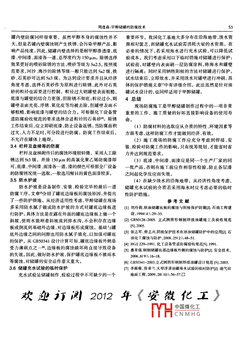 52第37卷,第6期安徽化工Vol 37. No62011年12ANHUI CHEMICAL INDUSTRYDec 2011化工設(shè)備與自動化·甲醇儲罐的防腐技術(shù)周逢森(東華T程科技股份有限公司設(shè)備室,安徽合肥230024)摘要:根據(jù)甲醇儲罐的特點(diǎn),介紹了其防腐材料的選擇及施工要求。結(jié)合施T現(xiàn)場提出儲罐在充水試驗(yàn)過程中應(yīng)采取的臨時(shí)性保護(hù)措關(guān)鍵詞:甲醇;大型儲罐;防腐;選材;施工doi:103969/jisn.1008-553X201106.018中圖分類號:TQ223121文獻(xiàn)標(biāo)識碼:B文章編號:1008-553(201060052-021引言修費(fèi)用,延長設(shè)備的使用壽命。本文根據(jù)甲醇儲罐的特近年來,隨著煤化工產(chǎn)業(yè)的發(fā)展,煤制甲醇項(xiàng)目的點(diǎn),以某甲醇項(xiàng)目中1萬m3的甲醇儲罐為例,介紹其在產(chǎn)能不斷擴(kuò)大,對甲醇儲罐的性能要求也越來越高。在現(xiàn)場制作過程中的防腐技術(shù)。實(shí)際生產(chǎn)中儲罐的損壞失效大多由腐蝕而引起對儲2甲醇儲罐的特點(diǎn)罐進(jìn)行有效地防腐,可提高設(shè)備的安全可靠性,減少維甲醇儲罐的參數(shù)見表1。表1甲醇儲罐參數(shù)介質(zhì)直徑(m)公稱容積(m3)操作溫度(℃)操作壓力(MPa)結(jié)構(gòu)甲醇儲罐甲醇0000常溫錐底、內(nèi)浮盤由表1可以看出,甲醇儲罐直徑大、耗材多,其儲存接熱量不僅會破壞焊道周邊的瀝青漆,同時(shí)可能引起瀝的介質(zhì)甲醇毒性為中度,并且易揮發(fā)。因此,甲醇儲罐的青漆著火,反而導(dǎo)致底板下表面更多區(qū)域未能進(jìn)行有效防腐工作不僅可以減少鋼材使用,帶來經(jīng)濟(jì)效益,而且地防腐。在條件苛刻一些的地方,則可以增加陰極保護(hù)對于設(shè)備長周期安全運(yùn)轉(zhuǎn)及操作人員人身安全也極具防腐的措施對焊道周邊進(jìn)行防腐,具體做法已有報(bào)道意義。鬥。漆膜厚度等其干了以后用測厚儀測量即可,在漆未完3防腐材料的選擇及施工全干透時(shí)測量漆膜厚度一般數(shù)值都會偏小一些。根據(jù)防腐的日的不同,甲醇儲罐的防腐主要分為罐32罐體外壁防腐底板下表面防腐、罐體外表面防腐、罐體內(nèi)表面防腐、盤儲罐外壁的防腐施τ在儲罐制作過程中即可進(jìn)行梯等附件的防腐等。需注意的是,罐體焊道附近不要刷漆,這是為了方便在充3.1罐底板下表面防腐水試驗(yàn)過程中檢查儲罐焊縫的嚴(yán)密性。因罐體外壁受大罐底板與基礎(chǔ)接觸,為了減少基礎(chǔ)不均勻沉降對罐·氣腐蝕,采用人工除銹達(dá)St3級即可,選用的漆為屏蔽隔底的破壞,一般基礎(chǔ)采用承臺表面鋪瀝青砂的結(jié)構(gòu)或者熱漆,底漆兩道,中間漆兩道,面漆一道,總厚度約為環(huán)墻結(jié)構(gòu)。由于底板做成向上錐底的型式底板不易接250μm。面漆為白色,其余為紅色。屏蔽隔熱漆的作用一觸到雨水等腐蝕性物質(zhì),且基礎(chǔ)上的瀝青砂也不具有腐是防止大氣等對罐體的腐蝕,二是避免太陽照射造成罐蝕性。底板下表面的腐蝕環(huán)境較輕微,釆用人工除銹達(dá)體溫度過高,甲醇大量揮發(fā),也就是既減少了甲醇揮發(fā)造到s3級,并涂300μm厚漿型的瀝青漆。在罐底板下好成的經(jīng)濟(jì)損失,又減小了因甲醇揮發(fā)帶來的危險(xiǎn)性。在充料后即可對罐底邊緣板及中幅板的下表面進(jìn)行除銹、刷水試驗(yàn)合格后,即可對焊道附近的罐體進(jìn)行防腐。漆。要注意的是,在底板對接及搭接的焊縫周圍需留3.3罐體內(nèi)壁防腐50mm左右的寬度不刷漆,這是防止在焊接過程中,焊儲罐的內(nèi)壁防腐是在設(shè)備充水試驗(yàn)合格后進(jìn)行的。中國煤化工CNMHG收稿日期:2011-05-30作者簡介:周逢森(1982-),男,碩士研究生,主要從事化T設(shè)備的設(shè)計(jì)工作,1515519863,0551-3696847, houfengsan @chinaecec com周逢森:甲醇儲罐的防廣技術(shù)罐內(nèi)壁防腐同樣很重要,雖然甲醇本身的腐蝕性并不重要環(huán)節(jié)。我國化工基地大多分布在沿海地帶,淡水資大,但是若罐內(nèi)壁腐蝕則產(chǎn)生鐵銹,會污染甲醇產(chǎn)品,影源相對匱乏,而儲罐充水試驗(yàn)需消耗大量的水資源。在響產(chǎn)品純度。因此,儲罐內(nèi)壁選擇的是耐甲醇滲透漆,底必要的情況下,若采用海水進(jìn)行充水試驗(yàn),可以降低試漆、中間漆、面漆各一道,總厚度約為150μm。除銹選擇驗(yàn)成本。我們考慮釆用以下臨時(shí)揹施對儲罐進(jìn)行保護(hù):效果更好的噴砂除銹的方法,噴砂等級為Sa2.5。按照規(guī)試驗(yàn)前,對罐壁內(nèi)表面刷一層防腐涂料,將海水和罐壁范要求,河沙、海沙的除銹等級一般只能達(dá)到Sa2級,鐵進(jìn)行隔離;同時(shí)采用犧牲陽極的方法對儲罐進(jìn)行保護(hù)。砂、石英砂可達(dá)到Sa3級。為達(dá)到設(shè)計(jì)要求并且從經(jīng)濟(jì)試水結(jié)束后,立即放水,并采用淡水對罐壁進(jìn)行沖刷。具角度考慮,選擇石英砂作為原料進(jìn)行除銹,此外對石英體的保護(hù)措施文章中有詳細(xì)介紹。此法雖然是針對油砂的粒徑也需要進(jìn)行控制,粒徑過大則罐壁表面粗糙,罐試水設(shè)計(jì)的,也同樣適用于甲醇儲罐。底漆與罐壁的結(jié)合力更強(qiáng),但除銹不徹底;粒徑過小,則4總結(jié)罐壁表面光亮,浮銹、氧化皮等均被去除,但罐壁表面不現(xiàn)場防腐施工是甲醇儲罐制作過程中的一項(xiàng)非常夠粗糙影響底漆與罐壁的結(jié)合力??筛