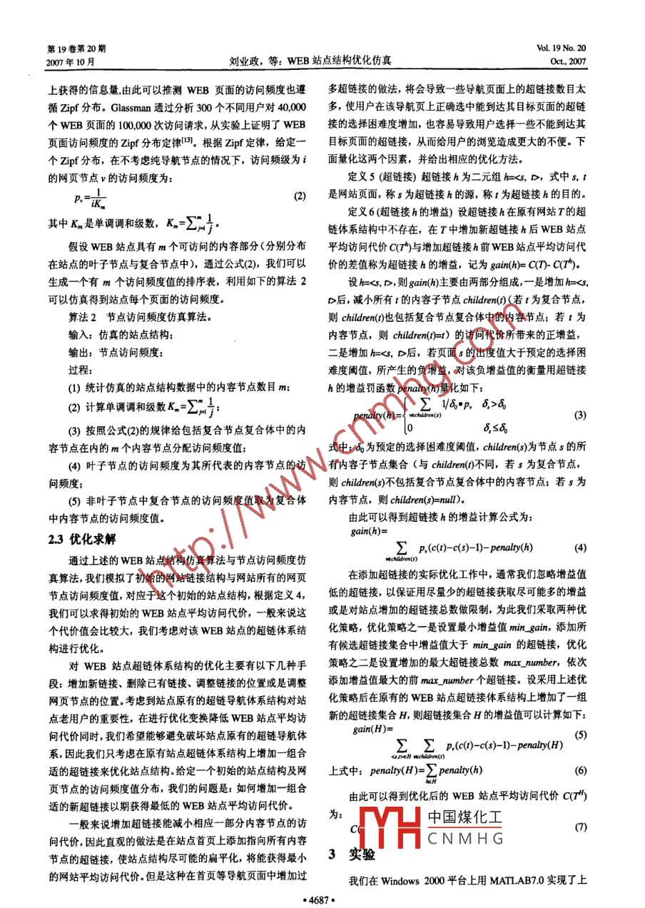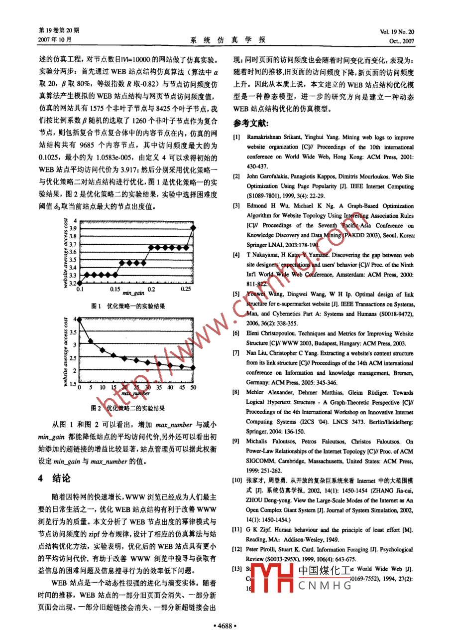 第19卷第20期系統(tǒng)仿真學(xué)報@Vol. 19 No.202007年10月Journal of System SimulationOct, 2007WEB站點結(jié)構(gòu)優(yōu)化仿真劉業(yè)政,林文龍,焦寧,姜元春(合肥工業(yè)大學(xué)管理學(xué)院電子商務(wù)研究所合肥23000)摘要: WEB站點結(jié)構(gòu)優(yōu)化技術(shù)是解決wwW瀏覽中搜尋與獲取有益信息的困難問題及信息搜尋行為的效率低下問題的有效方法?;赪EB站點的超鏈體系鮚構(gòu)特征與網(wǎng)頁節(jié)點的訪問頻度值特征,建立了一種站點結(jié)構(gòu)優(yōu)化的數(shù)學(xué)模型,其目標(biāo)是使整個站點具有較小的平均訪向代價。分析了站點超鏈體系結(jié)構(gòu)特征與節(jié)點訪問頻度特征,采用仿真算法分別模擬了WEB站點的超鏈體系結(jié)構(gòu)與頁面節(jié)點的訪問頻度值,并通過量化新增超鏈接的影響因素設(shè)計了相應(yīng)的站點結(jié)構(gòu)優(yōu)化方法. .實驗結(jié)果表明:優(yōu)化后的站點結(jié)構(gòu)具有較小的平均訪問代價。關(guān)鍵詞: WEB站點結(jié)構(gòu)優(yōu)化;超鏈體系結(jié)構(gòu);節(jié)點訪問頻度; WEB站點平均訪問代價中圖分類號: TP393文獻(xiàn)標(biāo)識碼: A文章編號: 1004-731X (2007) 20 4685-04Website Structure Optimization Based on SimulationLIU Ye-zheng, LIN Wen-long, JIAO Ning, JIANG Yuan-chun(nstitute of E Business, School of Management, Hefei University of Technology, Hefei 2000, China)Abstract: An efficient method for solving the problem of difficulties in searching for and acquiring useful information andthe problem of low efciency of information foraging behavior is website structure optimization. A mathematics optimizationmodel of website structure based on website hyperlink structure and web page popularity was proposed. The optimizationgoal is to minimize the website average access cost. The feathers of wcbsite hyperlink structure and the feathers of web pagepopularity were analyzed, and a website was generated based on simulation, and the corresponding website structureoptimization method by quantizing the impact of new added hyperlink was proposed. Experiment results show that afteroptimization, the website archives a much smaller average access cost.Key words: website structure optimization; hyperlink structure; page popularity; website average access cost為用戶往往需要通過一條花費更多訪問代價的路徑才到達(dá)引言其興趣目標(biāo)頁面.站點結(jié)構(gòu)優(yōu)化技術(shù)就是通過考慮優(yōu)化網(wǎng)站wWW瀏覽中的兩個常見問題是:搜尋與獲取有益信息信息組織的超鏈體系結(jié)構(gòu)來使所有的用戶都可以以更小的的困難問題及信息搜尋行為的效率低下問題。有益信息搜尋訪問代價瀏覽WEB站點更有效地獲取所需的信息。-個結(jié)與獲取的困難主要根源在于以超鏈接形式組織的WEB信息構(gòu)優(yōu)化的站點,可以減少用戶的“無謂”點擊行為,從而減體系結(jié)構(gòu)的零亂,這種零亂性使用戶不知道當(dāng)前所處網(wǎng)頁節(jié)少WEB服務(wù)器的請求事務(wù)次數(shù),減輕服務(wù)器負(fù)擔(dān),可以使.點的具體位置;不知道怎樣才能到達(dá)其想要去的興趣目標(biāo)頁用戶更有效地到達(dá)其訪問的目標(biāo)頁面,節(jié)省用戶訪問時間,面,即www“迷航"。通常迷航的用戶在面對眾多的超鏈提高用戶對站點的滿意度。接選擇時會產(chǎn)生--些無益于到達(dá)其興趣目標(biāo)頁面的“無謂”本文采用仿真的方法研究降低WEB站點平均訪問代價點擊行為,這種“無謂”的點擊行為- -方面增加了WEB服的站點結(jié)構(gòu)優(yōu)化問題:將WEB站點抽象成樹結(jié)構(gòu)模型(對站務(wù)器負(fù)擔(dān),另-方面也增加了網(wǎng)絡(luò)的數(shù)據(jù)流量,容易造成網(wǎng)點結(jié)構(gòu)的描述建模問題,通常有樹(67、 圖吲、超圖凹等幾種絡(luò)阻塞,導(dǎo)致網(wǎng)絡(luò)訪問速度的下降,從而進(jìn)一步影響了信息描述方式。由于我們考慮的站點結(jié)構(gòu)優(yōu)化模型主要刻畫的是搜尋行為的效率。對這兩個問題很難有-一個完美的解決方案,群體用戶從主頁出發(fā),以一種自頂向下點擊超鏈接的形式來目前對這些問題的解決采取的方法可以分為三類:搜索引擎搜索到達(dá)各自訪問目標(biāo)頁面的行為,因此相比較而言,能刻技術(shù):基于WUM(Web Usage Mining)技術(shù)開發(fā)各種瀏覽導(dǎo)畫站點層次化語義結(jié)構(gòu)的樹描述方式更適于對這種用戶帶航工具; WEB站點結(jié)構(gòu)優(yōu)化技術(shù)1161。有訪問目標(biāo)的站點結(jié)構(gòu)優(yōu)化問題進(jìn)行建模),通過分析模型一般來說,用戶與站點的設(shè)計開發(fā)人員對WEB站點信中網(wǎng)頁節(jié)點的出度特征與訪問頻度特征,采用仿真的方法分息組織的超鏈體系結(jié)構(gòu)存在不同的觀點,這種差異通常表現(xiàn)別模擬了WEB站點超鏈體系結(jié)構(gòu)以及WEB頁面的訪問頻度,并中國煤化工設(shè)計了相應(yīng)的站點結(jié)收稿日期: 20608-14修回日期: 2006-10-24構(gòu)優(yōu)CNMHG基金項目:國家自然科學(xué)基金資助(70672097)作者簡介:劉業(yè)政(1965-), 男,安徽和縣人,教授,博導(dǎo),研究方向為1問題建模數(shù)據(jù)挖掘與GDSS:林文龍(1979-), 男,福建龍巖人,博士,研究方向為WEB挖掘:焦寧(1981-), 男,安徽太和人,碩士,研究方向為數(shù)據(jù)定義1 (WEB站點樹結(jié)構(gòu)模型) WEB站點可以表示為一挖捆;姜元春(1980-),男,山東萊西人,博士,研究方向為數(shù)