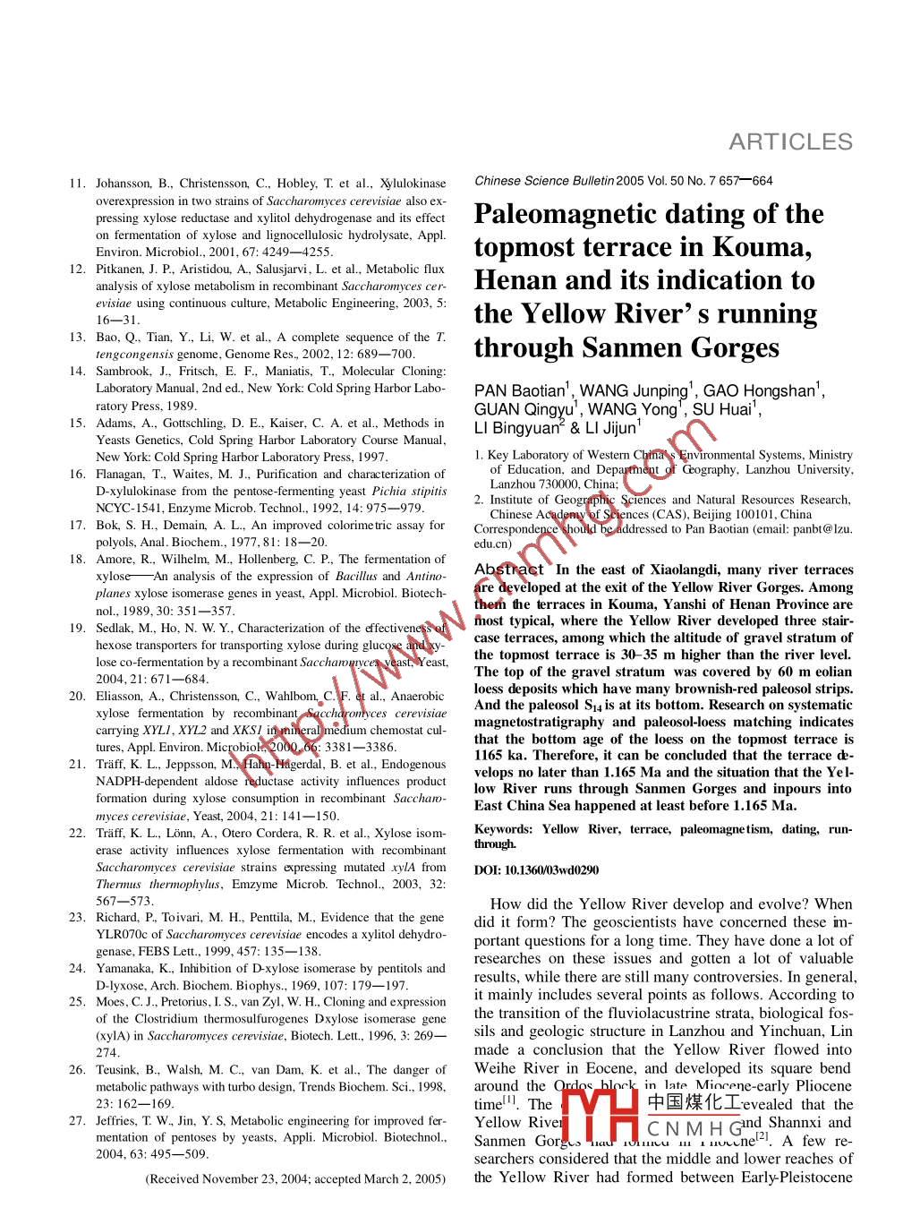 ARTICLESchinese Science Bulletin 2005 Vol. 50 No. 7 652-657allowing xylose to be converted to ethanol. 3. A majorFermentation of xylose todrawback with these recombinant strains is that the Km ofXR for NADPH is an order of magnitude lower than thatproduce ethanol by recombi-for NADH. This leads to accumulation of xylitol andNADH in the pathway, especially under anaerobic condi-nant Saccharomyces cerevisiae tions, In order to solve this problem, anvil not requiringstrain containing XYLA anderal bacteria, such as Actinoplanes missouriensis, Bacillussubtilis, Clostridium thermosulfurogenes, Escherichia coliXKSIand Lactobacillus pentosus had been cloned in S.cerevisiae. but the resulting recombinant strains could notLIU Xiaolin, JIANG Ning, HE Peng, LU Dajgrow on xylose as a sole carbon source 5.6)SHEN AnXylulokinase(XK), encoded by XKSI, is the third enInstitute of Microbiology, Chinese Academy of Sciences, Beijing 100080,zyme in the xylose metabolic pathway. It catalyses theconversion of xylulose to xylulose-5-phosphate. SignifiCorrespondence should be addressed to Jiang Ning(email: jang@ cant amount of xylulose observed in xylose fermentationbroth of XYLA harboring S. cerevisiae indicated thatproduce ethanol using lignocellulosic biomass would make activity in S. cerevisiae although xylose Co el of XKAbstract Fermentation of the pentose sugar xylose to xylose assimilation was limited by the native levbioethanol production economically more competitive. Sac- verted to xylulose. Owing to the low activity of encharomyce cerevisise, an efficient ethanol producer, cannot dogenous xylulokinase in the yeast 9, it is essential to in-utilize xylose because it lacks the ability to convert xylose to troduce an endogenous or a heterologous XKSl to increaseits isomer xylulose. In this study, XYLA gene encoding xylose xK activity to an optimal level for xylose uptake rate andisomerase (Xi from Thermoa naerobacter tengcongensisMB4T and XKSI gene encoding xylulokinase (XK)from subsequent ethanol fermentation 10-12)Pichia stipitis were cloned and functionally coexpressedThis study tries to elucidate the effect from co-expresSaccharomyces cerevisiae EF-326 to construct a recombinant sion of xylose isomerase gene from T. tengcongensixylose-utilizing strain. The resulting strain S. cerevisiae EF MB4T and xylulokinase gene from P. stipitis in S.cere1014 not only grew on xylose as sole carbon source, but also visite on the fermentation of xylose to produce ethanolproduced ethanol under anaerobic conditions. Fermentations End-product concentrations and activities of the recombitemperatures demonstrated that the highest ethanol produc- identify vmes under various conditions were analyzed toperformed with different xylose concentrations at different nant ettivity was 0.11 g/g xylose when xylose concentration was propossible strategy for the further improvement ofvided at 50 g/L. Under this condition, 28. 4% of xylose wasthe strainconsumed and 1.54 gL xylitolformed. An increasing 1 Materials and methodsfermentation temperature from 30C to 37 did not im- 1.1 Strains and plasmidsprove ethanol yieldKeywords: xylose isomerase, xylulokinase, co-expression, xylose,E. coli dh5a and s cerevisiae ef 326 were used asimyces cerevisiaehosts for plasmid constructions and yeast transformation,DOI:10.1360982004668espectively. T. tengcongensis MB4T, a thermophile iso-lated from a hot spring in western China, was chosen asXylose utilization is of commercial interest for efficient the source of XYLA. Its complete genome sequence isonversion of abundant plant material to produce ethanol. available in Genbank(Accession No. AE008691)3].TheIn xylose-fermenting yeasts, xylose is first reduced to natural xylose-utilzing yeast P. stipllts was used as thexylitol by xylose reductase(XR) and then oxidized to xy- source of XKSI. Plasmids pURL129 and pVgb-EX2 wereulose by xylitol dehydrogenase (XDh). In bacteria,available in the labxylose is directly isomerized to xylulose by xylose isom- 1.2 Media and culture conditionserase (Xi) before entering pentose phosphate pathwaySaccharomyces cerevisiae is the most important ethanE. coli was grown at 37C in LB medium suppleproducer so far for its high alcohol tolerance, productivity mented with 100 ug/mL ampicillin when necessary. Yeastand rapid fermentation rate using glucose. But it is unable strains were中國煤化士t2% glucose1 %o yeast exto utilize xylose due to the absence of XR and XDH, the tract, 2%first two enzymes of xylose metabolism.(YEPD). YeCNMH Gected on YEPDo Previous attempts to introduce P stipitis NAD(P)H-de- containing 0.6 mmol/L formaldehyde. For growth ex-dent XR, and NAD-dependent XDH into S cerevisiae periment, yeasts were cultivated on YP medium contain-have yielded a new metabolic pathway allowing xylose to ing 2% xylose For enzymes assays, YP medium suppleChinese Science Bulletin Vol 50 No. 7 April 2005ARTICLESmented with 0.5%o glucose and 2%0 xylose was usedtions of each primer, 0. 1 ug of template, and 2.5 U of Pfirpolymerase enzyme in a final volume of 50 uL. The ther-ycler(Eppendorf 5530, German) was used undeNucleic acid manipulations were performed by stan- following conditions: 94C for 10 min; 30 cycles of 94Cdard techniques". Plasmids were prepared by the Ding- for 40s. 50C for 40 s. and 72C for 80s: 10 min at 72Cguo mini plasmid purification kit(Dingguo BiotechnologyBeijing, China). Restriction enzymes and other modifyThen the mixture was chilled to 4C. For the amplificationenzymes were purchased from Takara (Takara, Dalian, of XKS1, denaturalization temperature was 55C. and ex-China). Transformation of S. cerevisiae was performed tension time was 120 saccording to the procedure described by Adams et al. 51The PCR products of XYLA and XKS/ were insertedand the calcium chloride method was used in the plasmid into plasmid pRULI29 sequentially to obtain plasmidtranformation of E. coli[141pRUX2. To replace the selectable marker URA3 withThe genomic DNA of T. tengconge