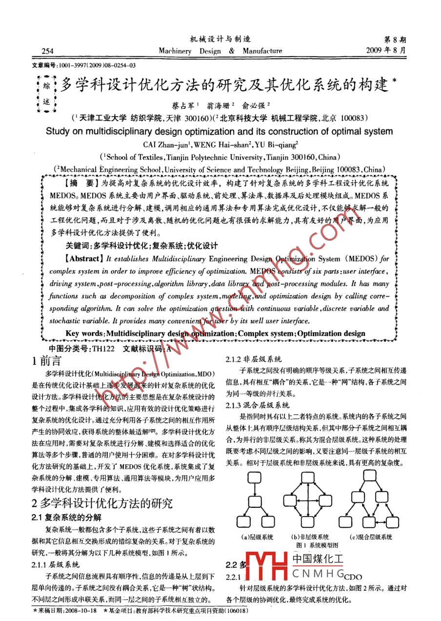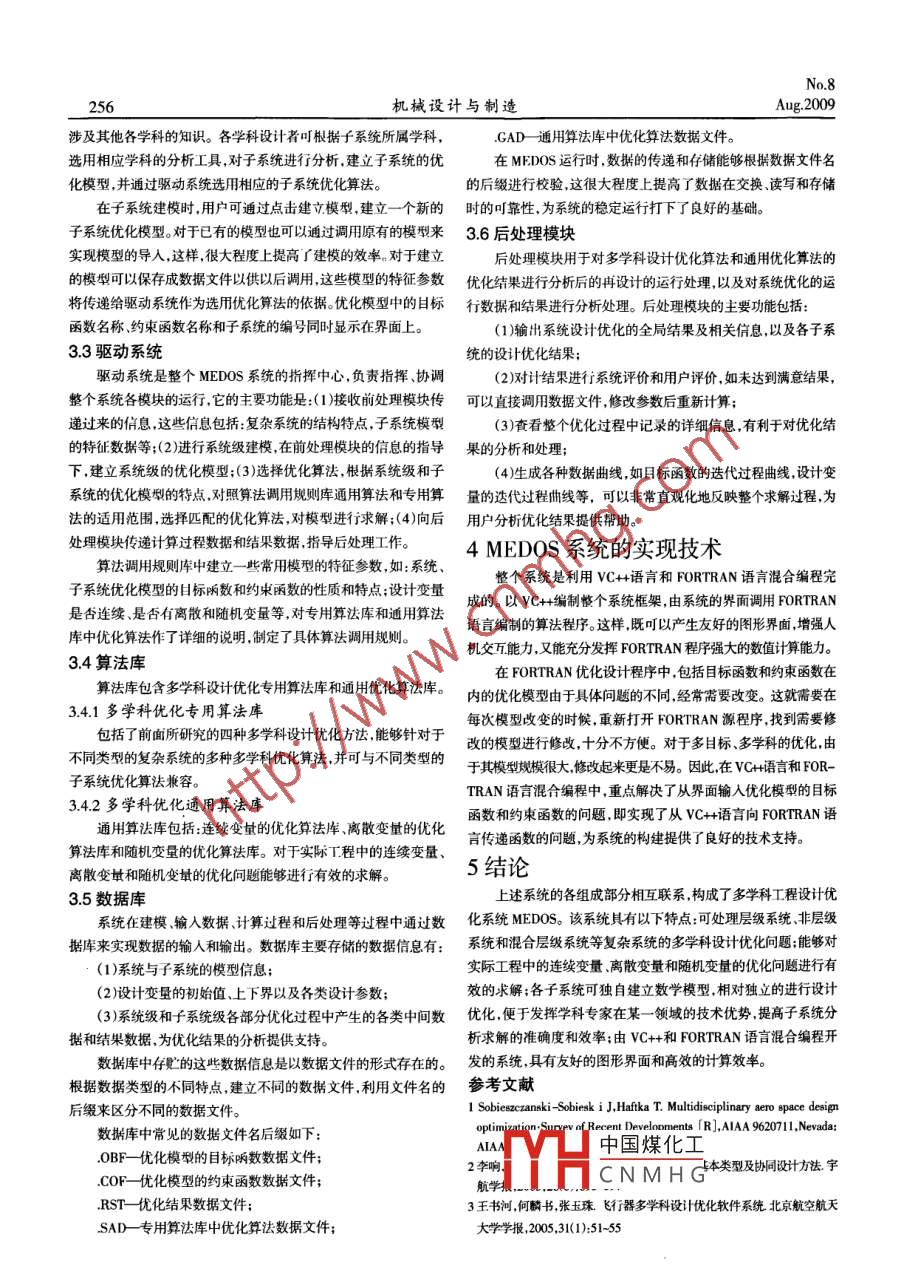 機(jī)械設(shè)計(jì)與制造第8期254Machinery Design & Manufacture2009年8月文章編號: 1001-39972009 )08-0254 03綜多學(xué)科設(shè)計(jì)優(yōu)化方法的研究及其優(yōu)化系統(tǒng)的構(gòu)建*蔡占軍'翁海珊2俞必強(qiáng)2('天津工業(yè)大學(xué)紡織學(xué)院,天津300160)(2 北京科技大學(xué)機(jī)械工程學(xué)院,北京100083)Study on multidisciplinary design optimization and its construction of optimal systemCAI Zhan-jun' , WENG Hai -shan2 ,YU Bi-qiang2('School of Textiles ,Tianjin Polytechnic University ,Tianjin 300160,China)('Mechanical Engnering School, University of Seience and Technology Beijing, Beijing 100083 ,China)[摘要]為提高對復(fù)雜系統(tǒng)的優(yōu)化設(shè)計(jì)效率,構(gòu)建了針對復(fù)雜系統(tǒng)的多學(xué)科工程設(shè)計(jì)優(yōu)化系統(tǒng)MEDOS。MEDOS系統(tǒng)主要由用戶界面、驅(qū)動系統(tǒng)、前處理、算法庫、數(shù)據(jù)庫及后處理模塊組成。MEDOS系統(tǒng)能夠?qū)?fù)雜系統(tǒng)進(jìn)行分解、建模,調(diào)用相應(yīng)的通用算法和專用算法完成優(yōu)化設(shè)計(jì),不僅能夠求解- -般的工程優(yōu)化問題,而且對于涉及離散隨機(jī)的優(yōu)化問題也有很強(qiáng)的求解能力,具有友好的用戶界面,為應(yīng)用多學(xué)科設(shè)計(jì)優(yōu)化方法提供了便利。關(guān)鍵詞:多學(xué)科設(shè)計(jì)優(yōu)化;復(fù)雜系統(tǒng);優(yōu)化設(shè)計(jì)[Abstract] It establishes Mulidisciplinary Engineering Design Optimization System (MEDOS) forcomplex system in order to improve eficiency of optimization. MEDOS consists of six parts :user interface,driving sgystem ,post -processing,algorithm library ,data library and post -processing modules. It has manyfunctions such as decomposition of complex system ,modeling,and optimization design by calling corre-sponding algorithm. It can solve the optimizalion question with continuous pariable ,discrete variable andstochastic variable. It prouides many convenient for user by its nwell user interface.Key words:Multidisciplinary design optimization;Complex system;Optimization design中圖分類號:TH122文獻(xiàn)標(biāo)識碼:A1前言2.1.2非層級系統(tǒng)子系統(tǒng)之間沒有明確的順序等級關(guān)系,子系統(tǒng)之間相互傳遞多學(xué)科設(shè)計(jì)優(yōu)化( Multidisciplinary Design Optimization,MDO)是在傳統(tǒng)優(yōu)化設(shè)計(jì)基礎(chǔ)H逐步發(fā)展起來的針對復(fù)雜系統(tǒng)的優(yōu)化信息,具有相互“耦合”的關(guān)系,它是-種“網(wǎng)”結(jié)構(gòu),各子系統(tǒng)之間設(shè)計(jì)方法。多學(xué)科設(shè)計(jì)優(yōu)化方法的主要思想是在復(fù)雜系統(tǒng)設(shè)計(jì)的為同一等級的并行關(guān)系。整個過程中.集成各學(xué)科的知識,應(yīng)用有效的設(shè)計(jì)優(yōu)化策略進(jìn)行2.1.3混合層級系統(tǒng)復(fù)雜系統(tǒng)的優(yōu)化設(shè)計(jì)。通過充分利用各子系統(tǒng)之間的相互作用所是指同時具有以上二者特點(diǎn)的系統(tǒng)。系統(tǒng)內(nèi)的各子系統(tǒng)之間產(chǎn)生的協(xié)同效應(yīng),獲得系統(tǒng)的整體最適解叨。多學(xué)科設(shè)計(jì)優(yōu)化方從整體:具有順序?qū)蛹壗Y(jié)構(gòu)關(guān)系,但其中部分子系統(tǒng)之間相互耦法在應(yīng)用時,需要對復(fù)雜系統(tǒng)進(jìn)行分解、建模和選擇適合的優(yōu)化合,為并行的非層級關(guān)系。稱其為混合層級系統(tǒng)。這種系統(tǒng)的處理算法等多個步驟,普通的用戶使用十分困難。在對多學(xué)科設(shè)計(jì)優(yōu)既要考慮不同層級之間的影響,又要注意同- -層級子系統(tǒng)的相互化方法研究的基礎(chǔ)上,開發(fā)了MEDOS優(yōu)化系統(tǒng),系統(tǒng)集成了復(fù)關(guān)系。相對于層級系統(tǒng)和非層級系統(tǒng)來說,具有更高的復(fù)雜度。雜系統(tǒng)的分解.建模.專用算法通用算法等模塊,為用戶應(yīng)用多學(xué)科設(shè)計(jì)優(yōu)化方法提供I便利。2多學(xué)科設(shè)計(jì)優(yōu)化方法的研究2.1復(fù)雜系統(tǒng)的分解復(fù)雜系統(tǒng)- -般都包含多個子系統(tǒng),這些子系統(tǒng)之間有著以數(shù)據(jù)和其它信息相互交換形成的錯綜復(fù)雜的關(guān)系。對于復(fù)雜系統(tǒng)的(a)層級系統(tǒng)(b)非層級系統(tǒng)(c)混合層級系統(tǒng)圖1系統(tǒng)模型圖研究,一般將其分解為以下幾種系統(tǒng)模型,如圖1所示。中國煤化工2.1.1層級系統(tǒng)2.2多子系統(tǒng)之間信息流程具有順序性,信息的傳遞是從上層到下2.2.1YHCNMHGcpo層單向傳遞的。子系統(tǒng)之間沒有耦合關(guān)系,它是一-種“樹“狀結(jié)構(gòu)。針對層級系統(tǒng)的多學(xué)科設(shè)計(jì)優(yōu)化方法,如圖2所示。通過對不同層之間形成串聯(lián)關(guān)系,而同一層之間的子系統(tǒng)相互獨(dú)立的。各個層級的協(xié)調(diào)優(yōu)化,最終完成系統(tǒng)的優(yōu)化。*來稿日期:2008-10-18 * 基金項(xiàng)日:教育部科學(xué)技術(shù)研究重點(diǎn)項(xiàng)月資助( 106018)第8期蔡占軍等:多學(xué)科設(shè)計(jì)優(yōu)化方法的研究及其優(yōu)化系統(tǒng)的構(gòu)建2552.2.2多學(xué)科目標(biāo)協(xié)調(diào)優(yōu)化方法MOCDO科的分析工具對子系統(tǒng)進(jìn)i分析建模,并通過驅(qū)動系統(tǒng),調(diào)用算針對非層級系統(tǒng)的多學(xué)科設(shè)計(jì)優(yōu)化方法.如圖3所示。適用法庫中 相應(y