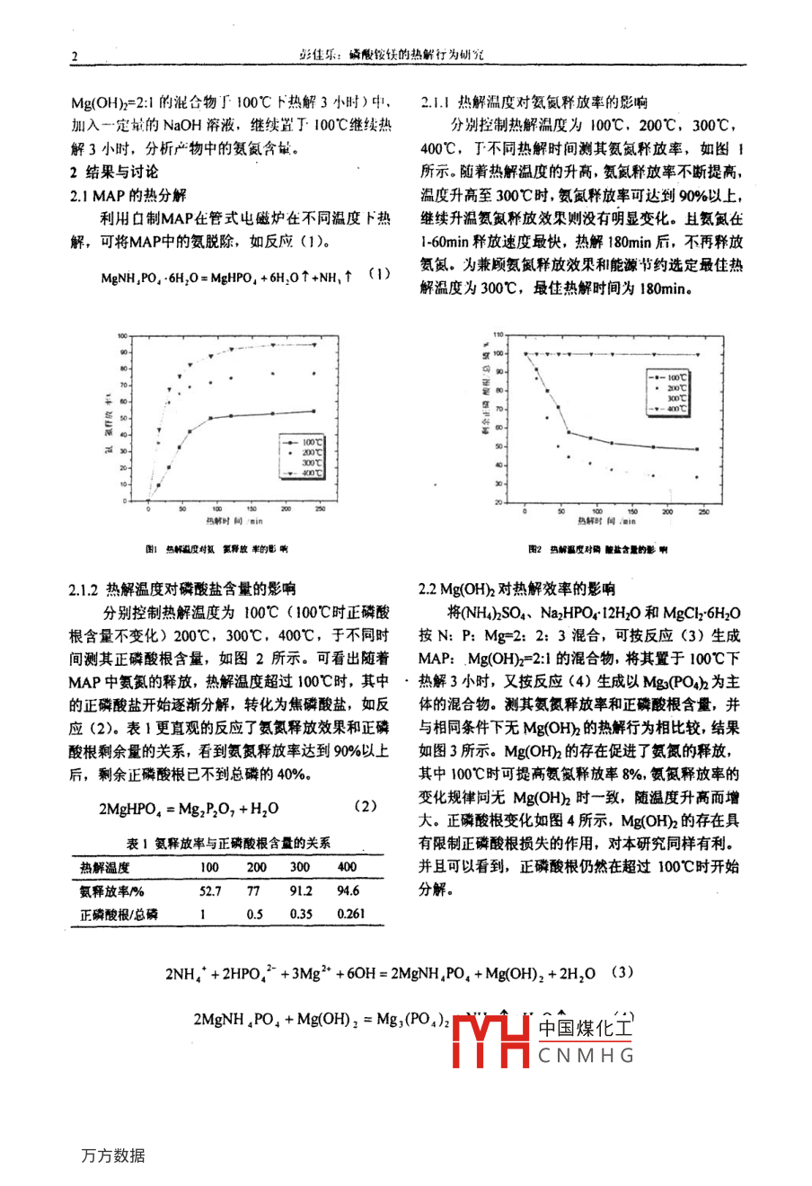 209第7沏化學(xué)積與裝各Chemical Engi neering Equipent磷酸銨鎂的熱解行為研究彭佳樂,周康根,姜科(湖南長沙中南大學(xué)冶金院,湖南長沙410083)要:為了明磷酸銨鎂的熱解性能,考察了100℃、200℃、300℃、400℃下磷酸銨鎂熱解過程中的氨氮釋放率和正磷酸根含量隨時間的變化規(guī)律;考察了氫氧化鎂與氫氧化鈉對磷酸銨鎂熱解行為的影響,發(fā)現(xiàn)氫氧化鎂能促進(jìn)的釋放并抑制正磷酸根向焦磷酸根轉(zhuǎn)化;投加氫氧化鈉可在正磷酸根不損失的前提下,使MAP中的氨氮釋放率達(dá)到99%以上關(guān)鍵詞:磷酸銨鎂:熱解;氫氧化鎂:氫氧化鈉前言11主要試劑與材料氮是生物活動必需的營養(yǎng)元紊之一,但是如果試劑:Na2HPO12H2O,MgCl26H2O水體中氮的含量太高又會造成環(huán)境污染。在我國水(NH)SO4,NaOH,以上均為分析純。納氏試體污染因素中氨氮是非常重要的污染物2目前對劑、鉬酸銨、釩酸銨。模擬氨氮廢水:用銨鹽這類廢水主要是通過生物法則、化學(xué)沉淀法、吹脫加去離子水配制法、折點氯法進(jìn)行處理各種方法均存在一定優(yōu)12主要儀器缺點。磷酸銨鎂(MAP)化學(xué)沉淀法處理高濃度氨用-3定時恒溫磁力攪拌器,420酸度計,氮廢,具有簡單、快速、高效等優(yōu)點,然而該ⅥS7220可見光分光光度計,管式電磁爐。法消耗大量磷鹽和鎂鹽,造成反應(yīng)成本高,以及磷13實驗方法酸銨鎂容易造成二次污染,一直以來都是限制該方13MAP的制備及熱解法實際應(yīng)用的最重要因素。因此如何降低藥劑消配制7200mgL的(NH)SO4溶液,按N:P:耗,開發(fā)磷酸銨鎂的回用和綜合利用技術(shù),對于磷Mg=1:1:1,順次將 NaHPO.12H2O和MgCh26H2O酸銨鎂沉淀法在實際工程中的應(yīng)用具有重要意義。加入L該溶液中(待前一藥劑全部溶解后再加入后磷酸銨鎂在不同溫度下發(fā)生熱分解反應(yīng),其分藥劑),用5 mol/L NaoH穩(wěn)定廢水pH值為解產(chǎn)物可循環(huán)用于氨氮的吸附,是降低藥劑消耗的20℃下磁力攪拌20分鐘后過濾,將得到的固相沉淀可能途徑。根據(jù)分解溫度的不同,磷酸銨鎂可分解物洗滌后,在干燥箱中于40℃下干燥48小時,產(chǎn)物成不同的產(chǎn)物,包括Mg(POh2、 MgHPO4和充分研磨后密封保存,即得到MAP。將制得的MAPMgP2O7。Mg(POh、 MgHPO4和MgP2O對廢水置于管式電磁爐中,在特定熱解溫度下熱解3小時,中氨氮的吸附能力不同, Shigeru Sugiyama等研究取其熱解產(chǎn)物,分析產(chǎn)物中的氨氮含量和正磷酸根表明以上這三種物質(zhì)去除氨氮能力為:含量。gHP0>3(PQ2>Mg2PO·因此,如何提高132M(OH2對熱解效率的影響利用Na2 HPOx 12H2O和MgCl26H2O按N:P:熱解時磷酸氨鎂中氨的釋放率,而又不影響其熱解Mg=2:2:3制備成MAP:MgOH)2=2:1的混合產(chǎn)物對氨氮的吸附效果是解決磷酸氨鎂化學(xué)沉淀物,制備步驟同前。將此混合物置于管式電磁爐中,法的關(guān)鍵內(nèi)容。本文針對此難題,對磷酸銨鎂的熱在特定熱解溫度下熱解3小時,取其熱解產(chǎn)物,分解行為展開研究,以求通過實現(xiàn)磷酸銨鎂熱解放氨析產(chǎn)中國煤化工含量。后,可作為氨氮吸附劑實現(xiàn)循環(huán)利用1.3CNMHG1實驗部分在以Mg(PO4)2為主體的熱解產(chǎn)物(MAP歸佳樂:酸銨鎂的熱解行為研究Mg(OH)2=21的混合物廠100℃下熱解3小時)中,2.熱解溫度對氨氮釋放率的影響加入一定量的NaOH溶液,繼續(xù)置丁100℃繼續(xù)熱分別控制熱解溫度為100℃,200℃,300℃解3小時,分析廣物中的氨氮含400℃,J不同熱解時間測其氨氮釋放率,如圖12結(jié)果與討論所示。隨著熱解溫度的升高,氨氮釋放率不斷提高,2MAP的熱分解溫度升高至300℃時,氨氮釋放率可達(dá)到90%以上,利用自制MAP在管式電磁爐在不同溫度下熱繼續(xù)升溫氮氮釋放效果則沒有明顯變化。且氨氮在解,可將MAP中的氨脫除,如反應(yīng)(1)1-60min釋放速度最快,熱解180min后,不再釋放MgNH, PO46H2O= MgHPO4+6H2O↑+NH,↑(1)氨氮。為兼顧氨氮釋放效果和能源節(jié)約選定最佳熱解溫度為300℃,最住熱解時間為180min戰(zhàn)時向min圖1熱N度耐氨氮釋放率的影響圖2熱解溫度對酸鹽含量能影啊2.12熱解溫度對磷酸鹽含量的影響Mg(OHh對熱解效率的影響分別控制熱解溫度為100℃(100℃時正磷酸將NH4SO4、Na2HPO2H和MgCl26H2O根含量不變化)200℃,300℃,400℃,于不同時按N:P;Mg=2:2:3混合,可按反應(yīng)(3)生成間測其正磷酸根含量,如圖2所示??煽闯鲭S著MAP:Mg(OH2=21的混合物,將其置于100℃下MAP中氨氮的釋放,熱解溫度超過100℃時,其中·熱解3小時,又按反應(yīng)(4)生成以MgPO4h為主的正磷酸鹽開始逐漸分解,轉(zhuǎn)化為焦磷酸鹽,如反體的混合物。測其氨氮釋放率和正磷酸根含量,并應(yīng)(2)。表1更直觀的反應(yīng)了氨氮釋放效果和正磷與相同條件下無Mg(OHh的熱解行為相比較,結(jié)果酸根剩余量的關(guān)系,看到氨氮釋放率達(dá)到90%以上如圖3所示。 Mg(oh)2的存在促進(jìn)了氨氮的釋放后,剩余正磷酸根已不到總磷的40%其中100℃時可提高氨氮釋放率8%,氨氮釋放率的2MgHPO, =Mg, P2O,+H,O(2)變化規(guī)律無Mg(OHh2時一致,隨溫度升高而增大。正磷酸根變化如圖4所示,Mg(OH2的存在具表1氨釋放率與正磷酸根含量的關(guān)系有限制正磷酸根損失的作用,對本研究同樣有利熱解溫度300400并且可以看到,正磷酸根仍然在超過100℃時開始氨釋放率%5277791296分解。正磷酸根/總磷10.503502612NH,*+ 2HPO.+3Mg+60H=2MgNH, PO +Mg(OH),+2H, 0 (3)2MgNH PO4 +Mg(OH),=Mg,(PO4)2中國