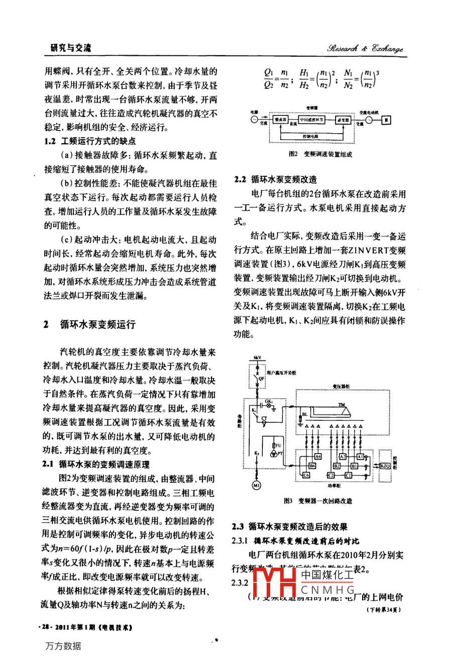 Research & Eaxchange研究與交流變頻調(diào)速技術(shù)在火電廠循環(huán)水泵的應(yīng)用黃奇鋒廣東粵嘉電力有限公司(514032)Application of Frequency-control Technology to Rebuildthe Circulating Pump in the 135MW Power PlantHuang QifengGuangdong Yuejia Electric Power Co.,Ltd摘要: 以電廠135M W機(jī)組循環(huán)水泵系統(tǒng)的變頻改1 循環(huán)水泵工頻運(yùn)行造為例,通過變頻調(diào)速與工頻運(yùn)行方式相比較.前者不但有顯著的節(jié)能經(jīng)濟(jì)效益,還可以改善設(shè)備起動(dòng)性能、1.1 電廠循環(huán)水泵運(yùn)行概況延長(zhǎng)使用壽命且降低維護(hù)費(fèi)用。因此,變頻調(diào)速技術(shù)在某電廠的單臺(tái)機(jī)組容量135M W,每臺(tái)機(jī)組配電力行業(yè)中有的發(fā)展應(yīng)用潛力。關(guān)鍵詞:工頻變頻調(diào)速技術(shù) 循環(huán)水泵節(jié)能置循環(huán)水泵2臺(tái)(見表1),每?jī)蓚€(gè)機(jī)組母管相連通,循環(huán)水系統(tǒng)采取閉式循環(huán)運(yùn)行,如圖I所示。中圍分類號(hào): TM306文獻(xiàn)標(biāo)識(shí)碼: ADOI編碼: 10.3969/j.issn.1006 2807.2011.01.009凝汽器出口的熱水進(jìn)冷卻水塔,將循環(huán)水的熱量Abstract: Taking the rebuilding of the circulating傳遞給大氣,冷卻后的水提升壓力后再進(jìn)入凝汽pump in the 135MW power plant by the frequency-control器冷卻低壓缸排汽,反復(fù)循環(huán)。由于系統(tǒng)水位基technology as an example, different ways between variation本穩(wěn)定,故循環(huán)水泵的揚(yáng)程也基本穩(wěn)定,其容量frequency and power frequency were compared, the result按計(jì)算水量來確定。was that the former possessed the advantages of remarkableeconomic beneft due to energy-saving, prolonged service表1循環(huán)水聚 電機(jī)參敷life of the equipment and lower payment for the mainte-水泵型號(hào)流敏揚(yáng)程轉(zhuǎn)速效字nance. That's why the frequency-control technology hadm3/hm| r/min %參敷great potential to be developed in the electric industry.高效G56SH 2517485Keywords: Power frequency Frequency-control電機(jī)功串電壓電流內(nèi)數(shù)kwVAspeed-regulation technology Circulating water pump En-參數(shù)YD1400-121400600071087ergy-saving在我國(guó)電源結(jié)構(gòu)中,火電裝機(jī)容量占74%。隨著煤價(jià)的攀升,火電企業(yè)的利潤(rùn)空間越來越少,如何實(shí)現(xiàn)節(jié)能減耗已成為突出的問題。目前,∞←管電廠每臺(tái)機(jī)組輔機(jī)的正常運(yùn)行耗電量- -般占機(jī)(浦環(huán)餐組發(fā)電量的6%左右,因此降低機(jī)組輔機(jī)的耗電中國(guó)煤化工量可降低發(fā)電成本。變頻調(diào)速技術(shù)適應(yīng)了這一-趨勢(shì)需要。本文介紹某火電廠135M W機(jī)組循環(huán)水MYHCNMHG泵采用變頻調(diào)速技術(shù)收到了很好的效果。循環(huán)水泵以工頻長(zhǎng)期連續(xù)運(yùn)行,其出口門采《電機(jī)技術(shù)) 2011年第1期.27.研究與交流Rlesearch & Exharnge用蝶閥,只有全開、全關(guān)兩個(gè)位置。冷卻水量的n調(diào)節(jié)采用開循環(huán)水泵臺(tái)數(shù)來控制,由于季節(jié)及晝2' h的=(;); M=()夜溫差,時(shí)常出現(xiàn)一臺(tái)循環(huán)水泵流量不夠,開兩臺(tái)則流量過大,往往造成汽輪機(jī)凝汽器的真空不日斌回。出間回回交魏電動(dòng)機(jī)。穩(wěn)定,影響機(jī)組的安全、經(jīng)濟(jì)運(yùn)行??刂齐娐?。1.2工頻運(yùn)行方式的缺點(diǎn)(a)接觸器故障多:循環(huán)水泵頻繁起動(dòng),直圖2變頻調(diào)速裴 置組成接縮短了接觸器的使用壽命。(b)控制性能差:不能使凝汽器機(jī)組在最佳2.2循環(huán)水泵變頻改造真空狀態(tài)下運(yùn)行。每次起動(dòng)都需要運(yùn)行人員檢電廠每臺(tái)機(jī)組的2臺(tái)循環(huán)水泵在改造前采用查,增加運(yùn)行人員的工作量及循環(huán)水泵發(fā)生故障一工-備運(yùn)行方式。水泵電機(jī)采用直接起動(dòng)方式。的可能性。(c)起動(dòng)沖擊大:電機(jī)起動(dòng)電流大,且起動(dòng)結(jié)合電廠實(shí)際,變頻改造后采用一變一備運(yùn)時(shí)間長(zhǎng),經(jīng)常起動(dòng)會(huì)縮短電機(jī)壽命。此外,每次行方式。在原主回路上增加一套ZINVERT變頻起動(dòng)時(shí)循環(huán)水量會(huì)突然增加,系統(tǒng)壓力也突然增調(diào)速裝置(圖3), 6kV電源經(jīng)刀閘K;到高壓變頻加,對(duì)循環(huán)水系統(tǒng)形成壓力沖擊會(huì)造成系統(tǒng)管道裝置,變頻裝置輸出經(jīng)刀閘Kz可切換到電動(dòng)機(jī)。變頻調(diào)速裝置出現(xiàn)故障可馬上斷開輸入側(cè)6kV開法蘭或煤口開裂而發(fā)生泄漏。關(guān)及Ki,將變頻調(diào)速裝置隔離,切換Kz在工頻電源下起動(dòng)電機(jī), Ki、K間應(yīng)具有閉鎖和防誤操作2循環(huán)水泵 變頻運(yùn)行功能。汽輪機(jī)的真空度主要依靠調(diào)節(jié)冷卻水量來控制。汽輪機(jī)凝汽器壓力主要取決于蒸汽負(fù)荷、用戶高壓開關(guān)柜冷卻水入口溫度和冷卻水量。冷卻水溫-一般取決變樂路柜于自然條件。在蒸汽負(fù)荷一定情況下只有靠增加冷卻水量來提高凝汽器的真空度。因此,采用變頻調(diào)速裝置根據(jù)工況調(diào)節(jié)循環(huán)水泵流量是有效g的,既可調(diào)節(jié)水泵的出水量,又可降低電動(dòng)機(jī)的功耗,并達(dá)到最有利的真空度。|心|面m2.1循環(huán)水泵的變頻調(diào)速原理國(guó)圖2為變