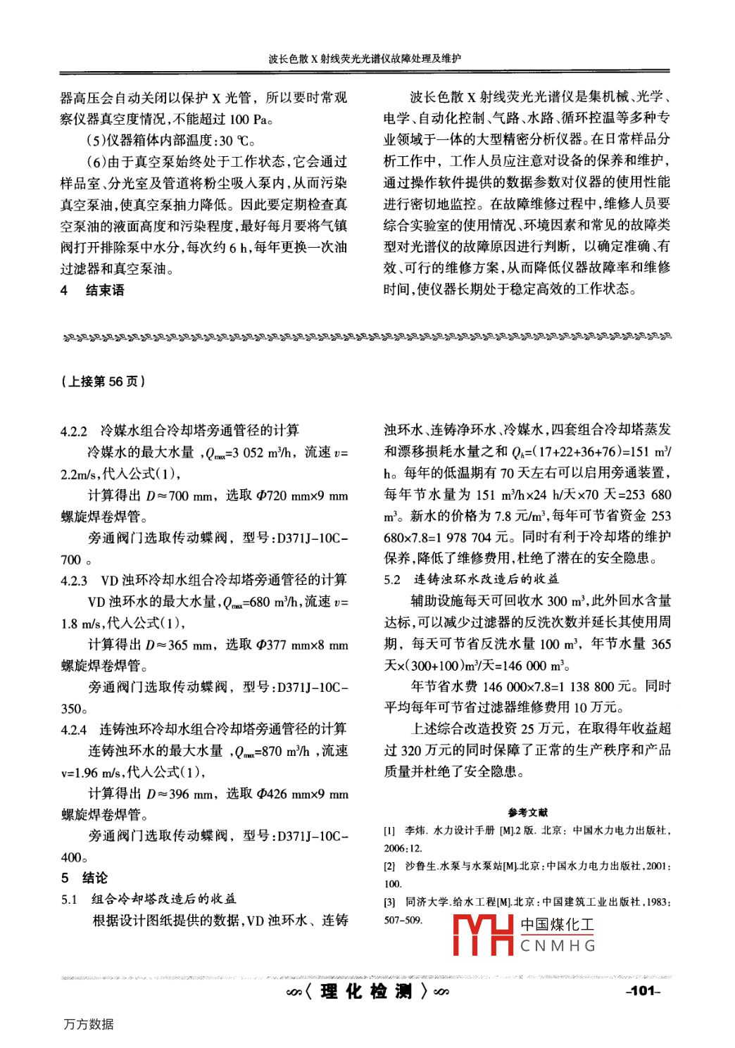天漳*雪循環(huán)水系統(tǒng)技術(shù)改造黃淑琴(天津鋼鐵集團有限公司煉鋼廠,天津300301)[摘要]對煉鋼循環(huán)水系統(tǒng)的VD濁環(huán)冷卻水、連鑄濁環(huán)冷卻水、連鑄設(shè)備間接冷卻水、冷媒水的四組冷卻塔以及連鑄濁環(huán)水系統(tǒng)進行了技術(shù)改造提升了生產(chǎn)供水的可靠性降低了設(shè)備停機率和維修費用,杜絕了水資源浪費。科學(xué)合理地使用設(shè)備,對水系統(tǒng)的各個環(huán)節(jié)定期診斷和效能評估并及時進行調(diào)整,提高循環(huán)水的復(fù)用率,根據(jù)季節(jié)變化調(diào)整冷卻塔運行方式以減少因蒸發(fā)和漂移造成的水量損失,在滿足了生產(chǎn)需要的同時取得了節(jié)能、減排和降耗的效果。[關(guān)鍵詞]循環(huán);水系統(tǒng);冷卻塔;旁通;水量;改造Technical Modification on Water Circulating SystemHUANG Shu-qin(Steel-making Plant, Tianjin Iron and Steel Group Company Limited, Tianjin 300301, China)Abstract Technical modification was carried out on the vd turbid cooling water of steel-making watercirculating system, CCM turbid cooling water, indirect cooling water for casting equipment, four sets ofcooling tower for chilled water and CCM turbid water system. The reliability of water supply for productionwas improved and equipment stoppage rate and maintenance cost were lowered. Waste on water resource wasprevented as well. The production requirement was fulfilled and the effect of energy conservation andemission and consumption reduction achieved, through scientifically and reasonably using equipment,conducting periodical diagnose, effect assessment and timely adjustment on all links of water systemimproving the repetition rate of circulating water and regulating the running model of cooling tower accordingto season variation in order to reduce water loss due to evaporation and driftingKey words circulation; water system; coolingbypass; water nlow rate; modification1引言還可能影響正常生產(chǎn)。此外,還要求循環(huán)水系統(tǒng)出隨著鋼鐵企業(yè)生產(chǎn)工藝的變革,生產(chǎn)技術(shù)的不現(xiàn)突發(fā)故障時要能提供安全、快速、流量和壓力均斷進步,要求循環(huán)水系統(tǒng)具有穩(wěn)定性、可靠性、獨立符合工藝要求的事故應(yīng)急水。性、安全性和經(jīng)濟性等功效。水系統(tǒng)所提供的循環(huán)2基本概況水要具有穩(wěn)定的物理參數(shù),可靠的化學(xué)指標(biāo)。各循21系統(tǒng)概況環(huán)子系統(tǒng)盡量保持相對獨立,例如連鑄機的結(jié)晶器循環(huán)泵站共配置18個泵組48臺泵,自清洗軟環(huán)水和設(shè)備間接冷卻凈環(huán)水是閉路循環(huán)水系統(tǒng),管道過濾器14臺,CLS型快速過濾器9臺,二次噴淋冷卻水、設(shè)備直接冷卻水是濁環(huán)開路循環(huán)BR150MHV型板式換熱器3臺,ZHFM-035-400型水系統(tǒng)。一旦閉路循環(huán)水系統(tǒng)發(fā)生泄漏,大量的水化學(xué)除油器3臺,8個儲水池, GDFNDP-600組合就會集中進入濁環(huán)開路水系統(tǒng),致使?jié)岘h(huán)系統(tǒng)的處逆流型清水冷卻塔兩組共8臺,10NBGW組合型逆理水量驟增。當(dāng)超過其水處理能力時一部分水就會流污水冷卻塔兩組共5臺。分別用于煉鋼、LF爐、向系統(tǒng)外流失,濁環(huán)水的供水品質(zhì)下降,同時閉路VD爐、連鑄凈環(huán)、連鑄軟環(huán)、VD濁環(huán)和連鑄濁環(huán)系統(tǒng)需要大量補充生產(chǎn)新水,不僅造成水資源浪費供水及回水處理。系統(tǒng)龐雜且耗水量大,需要生產(chǎn)用新水將近收稿日期:2013-05-03修回日期:2013-06-06中國煤化工作者簡介:黃淑琴(1963-),女,河北人,主要從事設(shè)備運行管理工22主要問CNMHG221組合的同和認忠∞〈研究與應(yīng)用〉o循環(huán)水系統(tǒng)技術(shù)改造循環(huán)泵站四套組合冷卻塔原設(shè)計生產(chǎn)回水均水處理設(shè)備的負荷。一旦超過其水處理能力,一方是經(jīng)冷卻塔后進入供水儲水池,未設(shè)置直接進入儲面生產(chǎn)回水在各個環(huán)節(jié)上得不到全面有效的處理水池旁通管路,這在實際運行中存在很大的隱患。致使供水品質(zhì)達不到生產(chǎn)工藝的要求影響產(chǎn)品質(zhì)首先,若生產(chǎn)過程中有一臺或幾臺冷卻塔出現(xiàn)突發(fā)量,另一方面有一部分水可能會溢流出系統(tǒng)造成水故障,因為沒有旁通設(shè)施,大量的生產(chǎn)回水就不能資源浪費。在生產(chǎn)過程中機械系統(tǒng)的漏油一部分會及時回到供水儲水池中,致使循環(huán)中斷進而影響生進入濁環(huán)冷卻水系統(tǒng)這會使?jié)岘h(huán)回水的含油量嚴產(chǎn),尤其在濁環(huán)開路系統(tǒng)熱水集水井因生產(chǎn)回水不重超標(biāo)。當(dāng)含油量超過化學(xué)除油器的處理能力時能及時輸出而導(dǎo)致大量外溢,會危及其周邊的設(shè)(其要求進水含油量:30-50mg/L),未處理掉的油施。其次,在冬季低溫期不利于冷卻塔的運行與維就會進入快速過濾器中(其要求進水含油量≤10護。在冬季因環(huán)境溫度較低,生產(chǎn)回水中含有的熱mg/L),其中一部分油沉積在慮料中,另一部分流經(jīng)量不多,故與冷空氣一接觸就容易結(jié)冰。冷卻塔結(jié)冷卻塔最終至供水吸水井。隨著過濾器中油沉積量冰的部位通常是在塔的進風(fēng)口上緣淋水裝置邊緣增大,濾料逐漸趨于板結(jié),其通水量和水處理能力和底部、百葉窗及立柱、橫撐等處。冰凍對冷卻塔的逐漸降低,最
