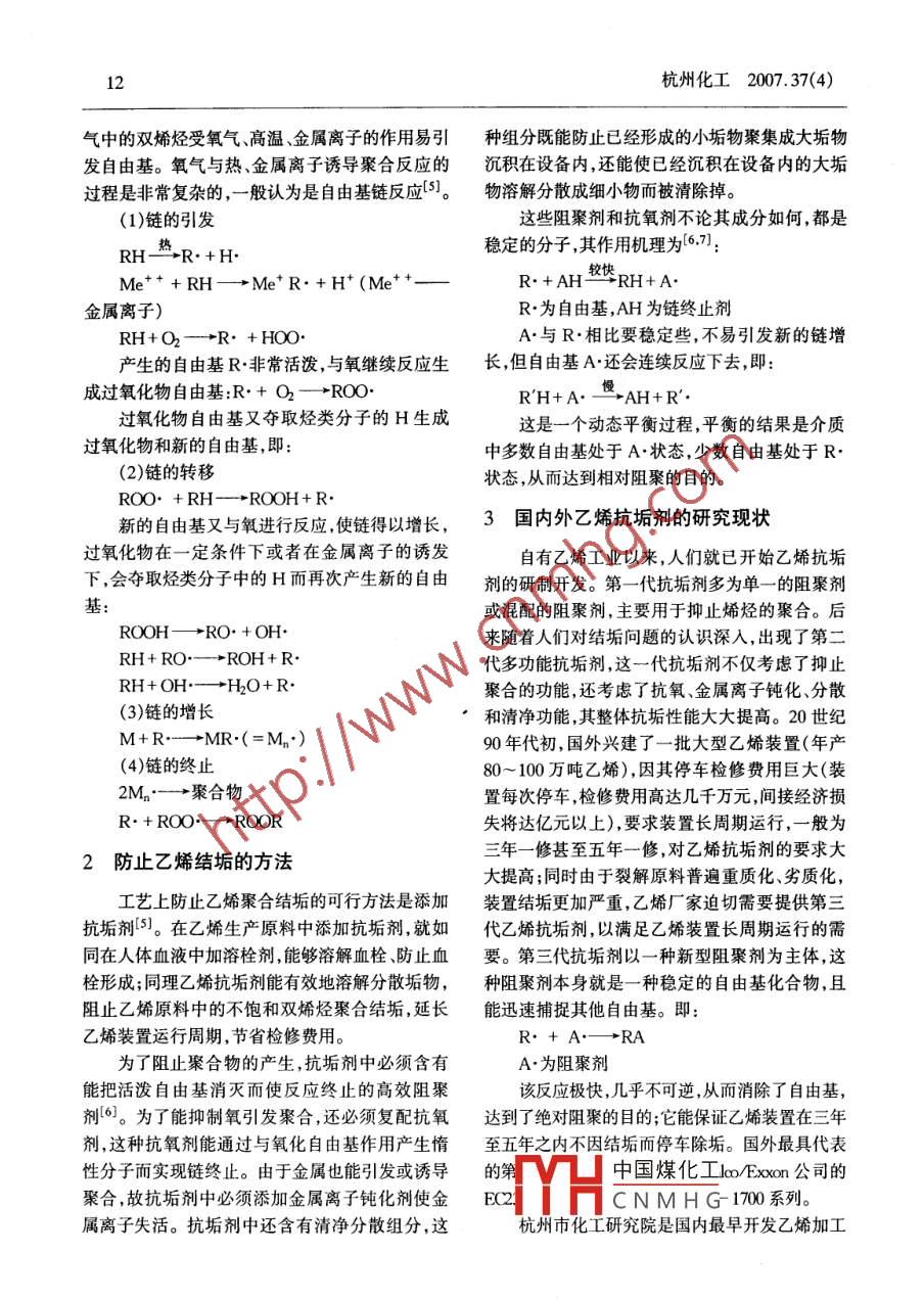 杭州化工2007.37(4)1乙烯抗垢劑的研究進(jìn)展林向陽(杭州市化工研究院有限公司,杭州310014)摘要:簡述了我國乙烯工業(yè)發(fā)展概況,生產(chǎn)能力,乙烯結(jié)垢機(jī)理和抗垢方法,抗垢劑的生產(chǎn)狀況和發(fā)展前景。關(guān)鍵詞:石油化工;乙烯;結(jié)垢;抗垢劑石油化工是我國國民經(jīng)濟(jì)發(fā)展的主要支柱。2005年年底序號(hào)企業(yè)名稱乙烯是石油化工的基本化工原料,它的產(chǎn)量標(biāo)志生產(chǎn)能力(萬t/a)著一個(gè)國家石油化學(xué)工業(yè)的水平,乙烯工業(yè)是國16 北京東方化工廠16.0家重點(diǎn)發(fā)展的重化工產(chǎn)業(yè)。進(jìn)入20世紀(jì)90年17 新疆獨(dú)山子石油化工公司乙烯廠20.0代后,我國乙烯工業(yè)的發(fā)展速度明顯加快,據(jù)統(tǒng)18 中原石油化工有限公司19 上海賽科乙烯有限公司90.0計(jì),我國乙烯生產(chǎn)能力在1989~ 1999的十年間,20南京揚(yáng)巴乙烯有限公司60.0以年均15.6%的速度增加。2003 年底我國乙烯生產(chǎn)能力已達(dá)555萬t/a。到2005年,隨著上海2009年隨著寧波鎮(zhèn)海煉化100萬噸乙烯投石化/BP 90萬噸乙烯揚(yáng)子石化/巴斯夫60萬噸產(chǎn),將結(jié)束我省無乙烯工業(yè)的局面。乙烯、南海/殼牌80萬噸乙烯、茂名100萬噸乙烯在乙烯生產(chǎn)過程中,裂解原料經(jīng)高溫裂解所等大乙烯工程的建成,乙烯生產(chǎn)能力達(dá)到850萬得的裂解氣經(jīng)急冷、洗滌、壓縮和精餾分離得到乙t/a以上(2.3]。具體見表1。烯和丙烯等烯烴產(chǎn)品,乙烯裝置中急冷油塔、壓縮表1 2005 年年底我國乙烯生產(chǎn)企業(yè)生產(chǎn)能力統(tǒng)計(jì)機(jī)、脫丙烷塔、脫丁烷塔、脫戊烷塔和凝液汽提塔(單位:萬噸)等設(shè)備在生產(chǎn)過程中都會(huì)因雙烯烴的聚合而形成有機(jī)垢物,這些垢物會(huì)造成能耗增加塔堵塞,嚴(yán)重時(shí)導(dǎo)致裝置停車直接影響裝置的正常生產(chǎn)和長1燕山石油化工公司化工一廠80.0周期運(yùn)轉(zhuǎn)[4]。2大慶石油化工總廠 化工一廠隨著國際化的到來,國內(nèi)乙烯生產(chǎn)廠家面臨3齊魯石油化工公 司烯烴廠著激烈的市場競爭。為了提高競爭力,各乙烯裝4揚(yáng)子石油化工公 司烯烴廠70.0置普遍采用廉價(jià)的重油為裂解原料,通過節(jié)能降5上海2#乙烯耗來增加經(jīng)濟(jì)效益。據(jù)統(tǒng)計(jì),2003年柴油用量仍6上海1#乙烯占21. 7%左右,石腦油約占59.5%,而乙烷和7遼陽石油化纖公 司化工-廠12.0LPG等輕質(zhì)原料只占5.7%。裂解原料的重質(zhì)8蘭州化學(xué)工業(yè)公司石 化廠24.0化、劣質(zhì)化導(dǎo)致乙烯裝置結(jié)垢更加嚴(yán)重,生產(chǎn)運(yùn)行9盤錦天然氣化工廠10 撫順乙烯公司更加困難,只能頻繁停車檢修,造成很大的經(jīng)濟(jì)損11天津聯(lián)合 化學(xué)有限公司失。12 茂名乙烯工業(yè)公司100.013廣州乙烯工業(yè)公司中國煤化工14吉林化學(xué)工業(yè)公司聚乙烯廠YHCNMHG后,最主要的原因15吉林化學(xué)工業(yè)公司有機(jī)合成廠15.0是裂解氣中的不飽和化合物的聚合反應(yīng)[41。裂解2杭州化工2007.37(4)氣中的雙烯烴受氧氣高溫、金屬離子的作用易引種組分既能防止已經(jīng)形成的小垢物聚集成大垢物發(fā)自由基。氧氣與熱、金屬離子誘導(dǎo)聚合反應(yīng)的沉積在設(shè)備內(nèi),還能使已經(jīng)沉積在設(shè)備內(nèi)的大垢過程是非常復(fù)雜的, -般認(rèn)為是自由基鏈反應(yīng)[5]。物溶解分散成細(xì)小物而被清除掉。(1)鏈的引發(fā)這些阻聚劑和抗氧劑不論其成分如何,都是熱R.+H穩(wěn)定的分子,其作用機(jī)理為[6.7]:Me++ + RH一→Me*R. + H+ (Me+ +-R.+AHRH+A.金屬離子)R.為自由基,AH為鏈終止劑RH+O2-→R. + HOO.A.與R●相比要穩(wěn)定些,不易引發(fā)新的鏈增產(chǎn)生的自由基R.非?;顫?與氧繼續(xù)反應(yīng)生長,但自由基A.還會(huì)連續(xù)反應(yīng)下去,即:成過氧化物自由基:R.+ 02- +ROO.R'H+A. +AH+R'.過氧化物自由基又奪取烴類分子的H生成這是一個(gè)動(dòng)態(tài)平衡過程,平衡的結(jié)果是介質(zhì)過氧化物和新的自由基,即:中多數(shù)自由基處于A.狀態(tài),少數(shù)自由基處于R.(2)鏈的轉(zhuǎn)移狀態(tài),從而達(dá)到相對(duì)阻聚的目的。ROO. + RH- +ROOH+ R. .新的自由基又與氧進(jìn)行反應(yīng),使鏈得以增長,3國內(nèi)外乙烯抗垢劑的研究現(xiàn)狀過氧化物在一-定條件下或者在金屬離子的誘發(fā)自有乙烯工業(yè)以來,人們就已開始乙烯抗垢下,會(huì)奪取烴類分子中的H而再次產(chǎn)生新的自由劑的研制開發(fā)。第- -代抗垢劑多為單一的阻聚劑基:或混配的阻聚劑,主要用于抑止烯烴的聚合。后ROOH一→RO. + OH.來隨著人們對(duì)結(jié)垢問題的認(rèn)識(shí)深入,出現(xiàn)了第二RH+ RO-→ROH+ R.代多功能抗垢劑,這一代抗垢劑不僅考慮了抑止RH+OH.-- +H2O+ R.聚合的功能,還考慮了抗氧、金屬離子鈍化、分散(3)鏈的增長和清凈功能,其整體抗垢性能大大提高。20世紀(jì)M+ R.--→MR*(= M。.)90年代初,國外興建了一批大型乙烯裝置(年產(chǎn)(4)鏈的終止80~ 100萬噸乙烯),因其停車檢修費(fèi)用巨大(裝2M.--聚合物置每次停車,檢修費(fèi)用高達(dá)幾千萬元,間接經(jīng)濟(jì)損R. + ROO- +ROOR失將達(dá)億元以上),要求裝置長周期運(yùn)行,一般為三年一修甚至五年一修,對(duì)乙烯抗垢劑的要求大2防止乙烯結(jié)